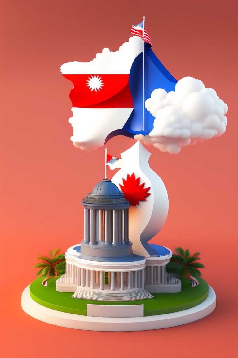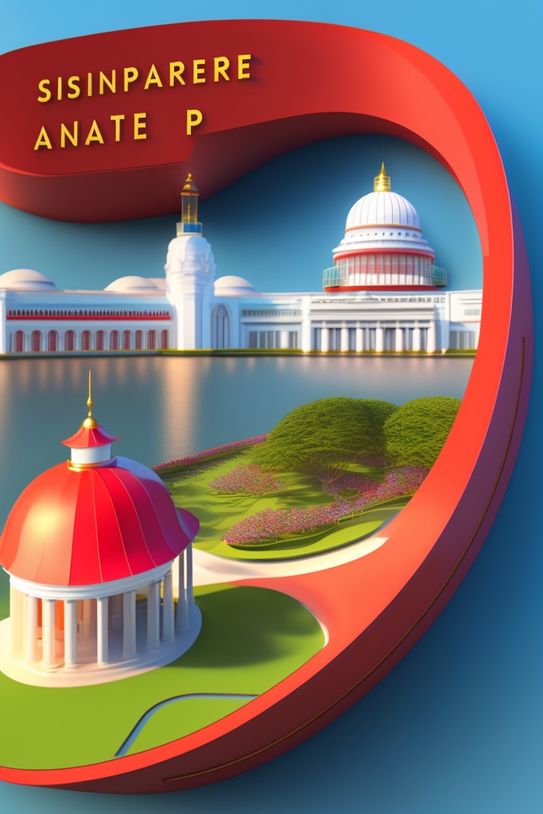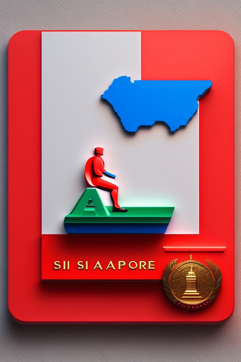 A 3d rendering of the map of the singapore, colored with the singapore flag with statue of raffles in the background