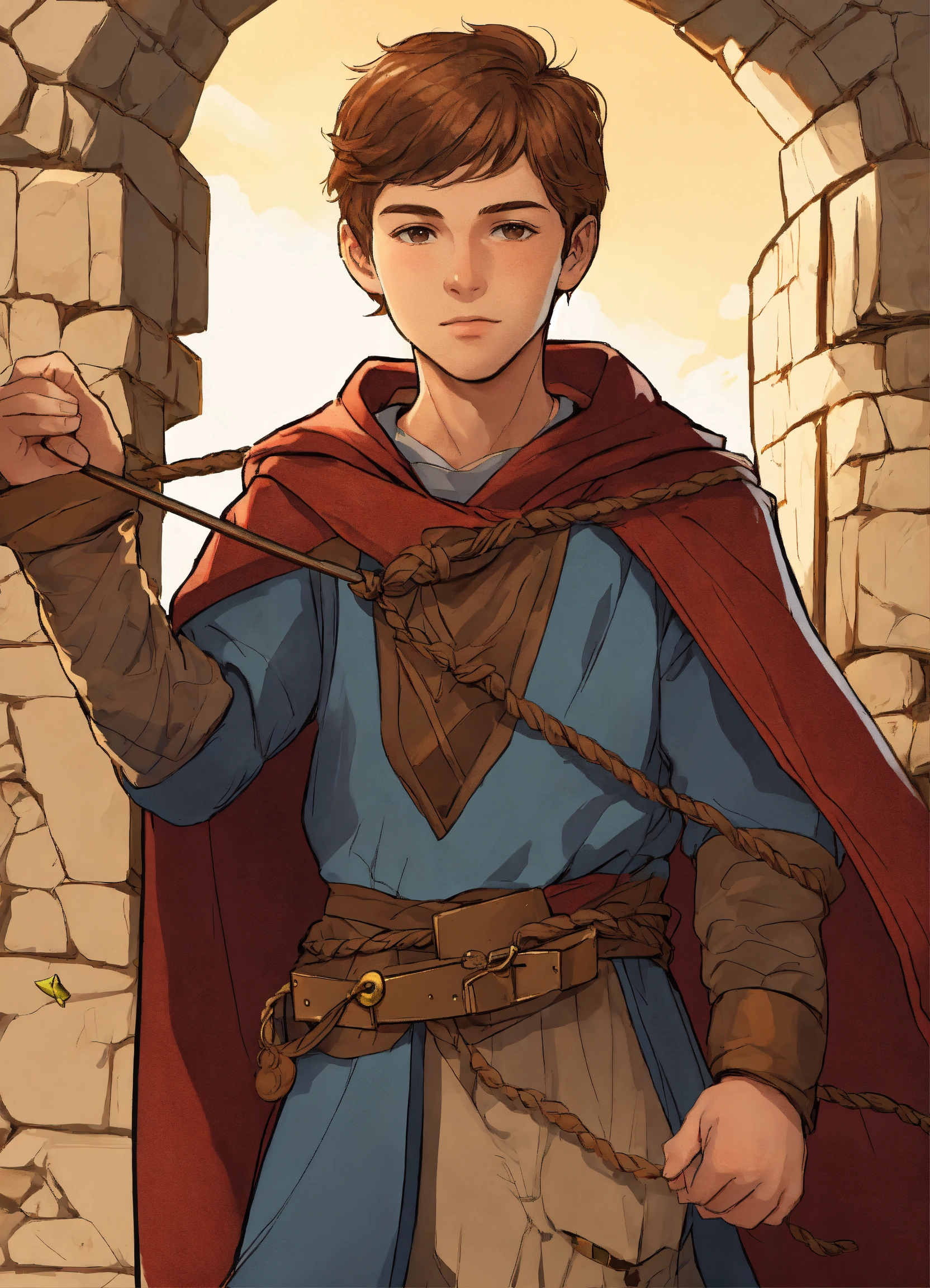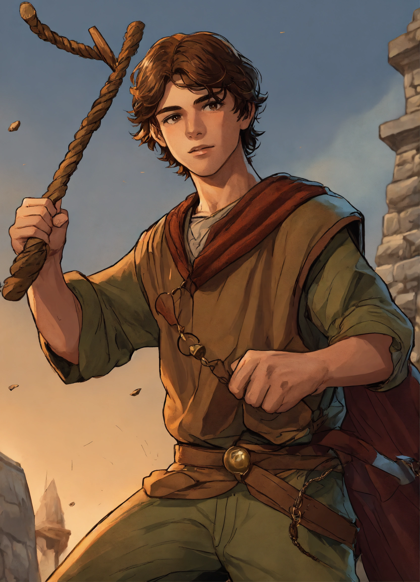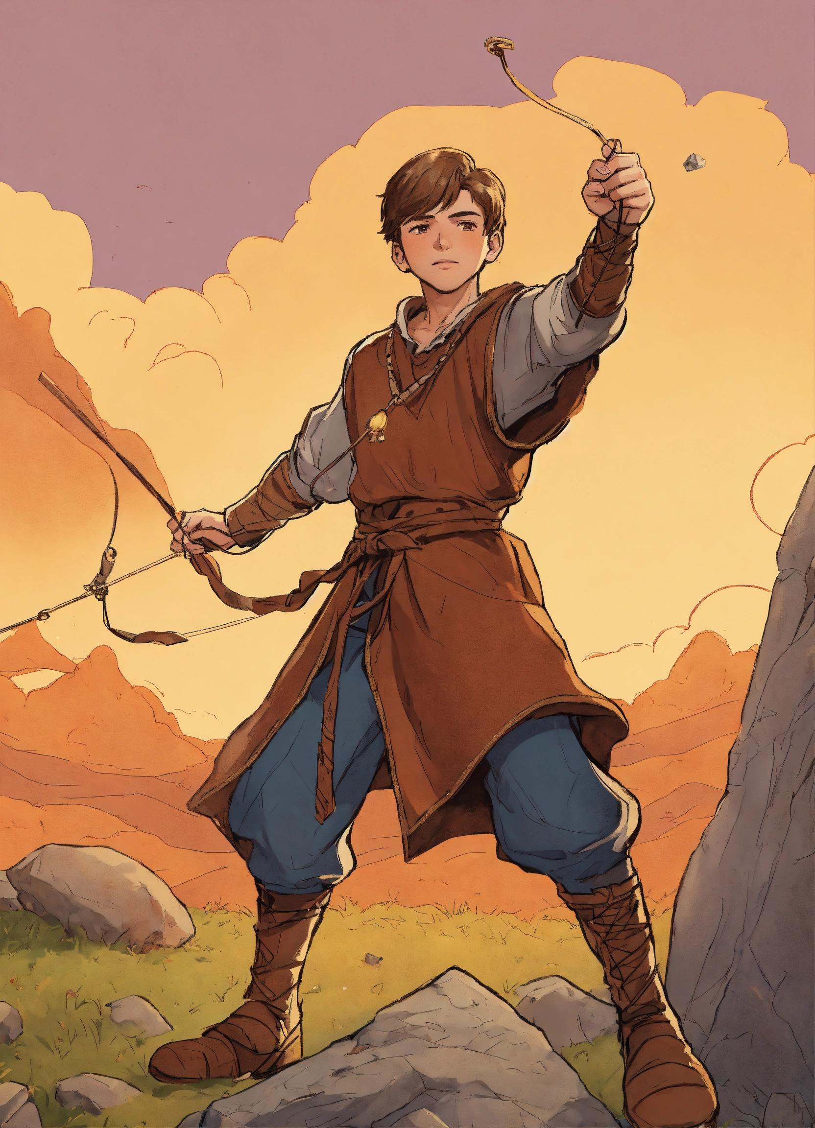 Illustration of a young 14 year old boy throwing a stone with a slingshot at the camera. young boy uses medieval clothes, no beard, brown hair. marvel comics style. no background. high detail, sharp focus.