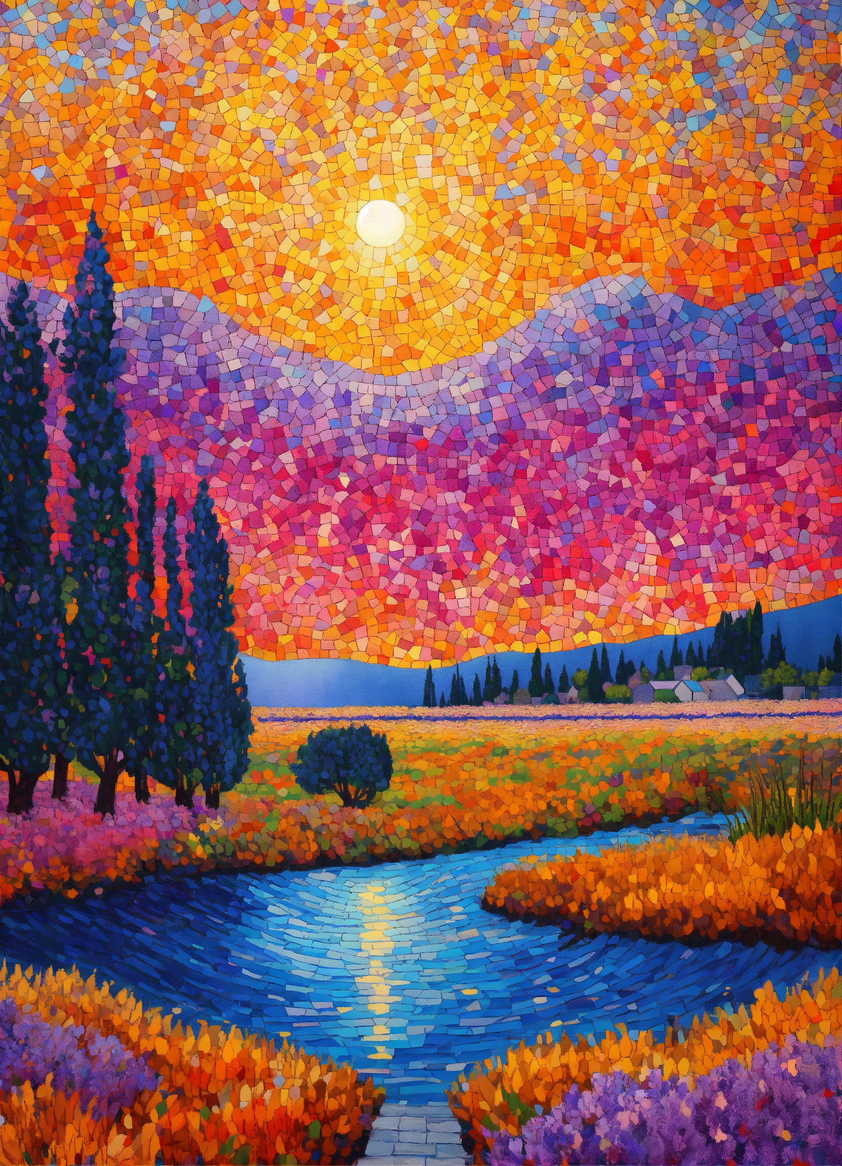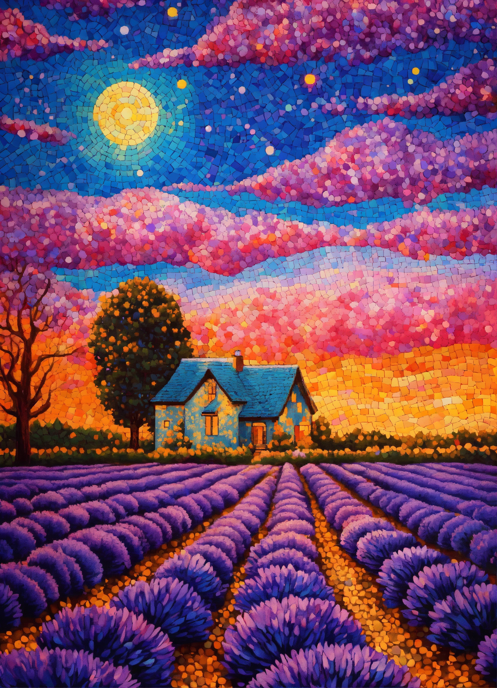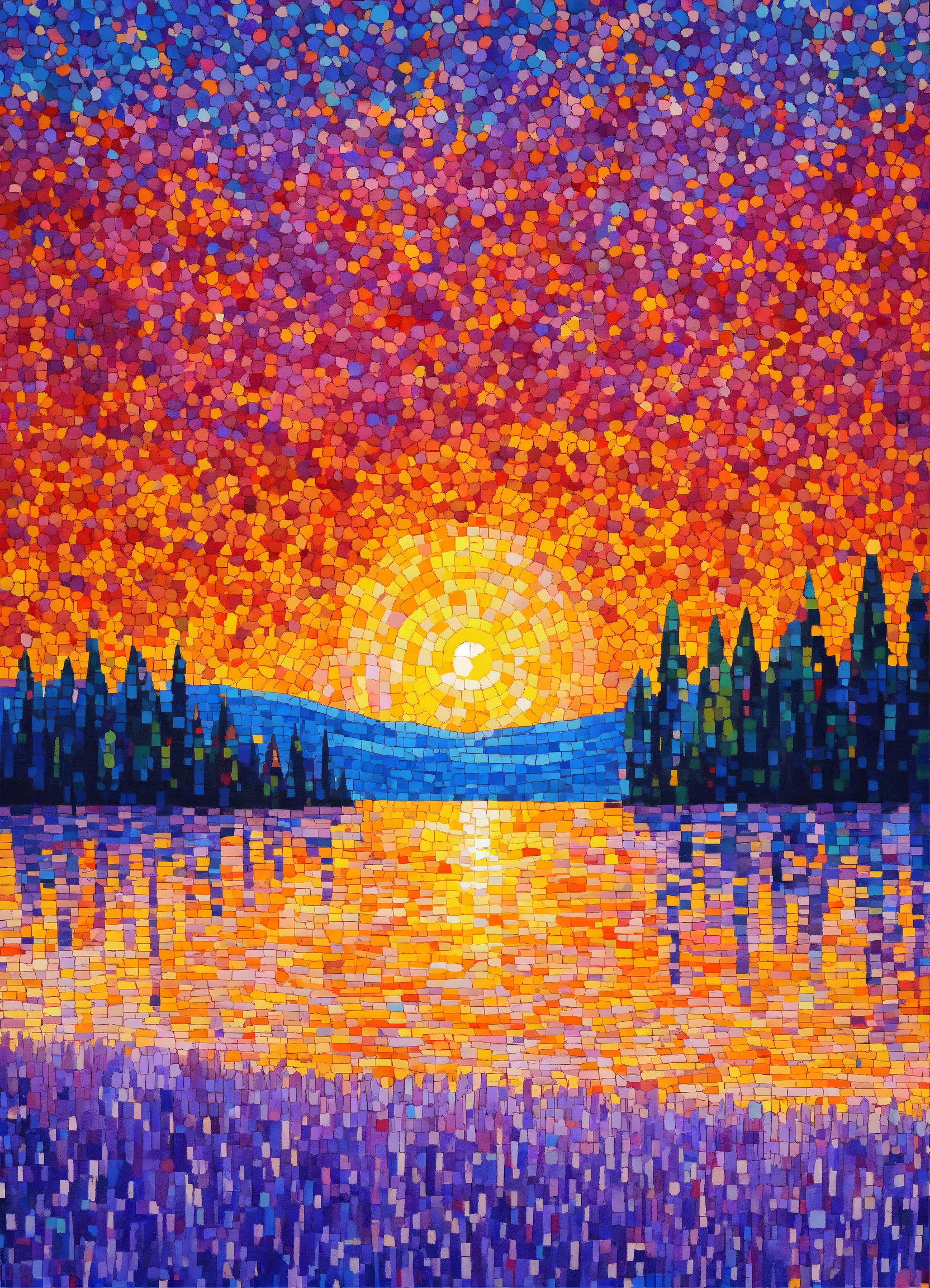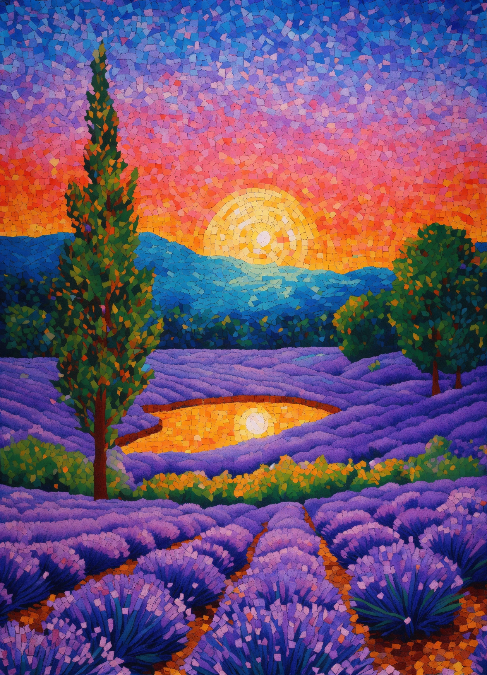Pointillism field of lavender coloring book mosaic, vibrant colors, ultra sharp detail, trees, ultra blue lake, glitter, stars, stardust, hyper realistic, well rendered, detailed, electric pink, orange and yellow sunrise sky in style of vincent van gogh