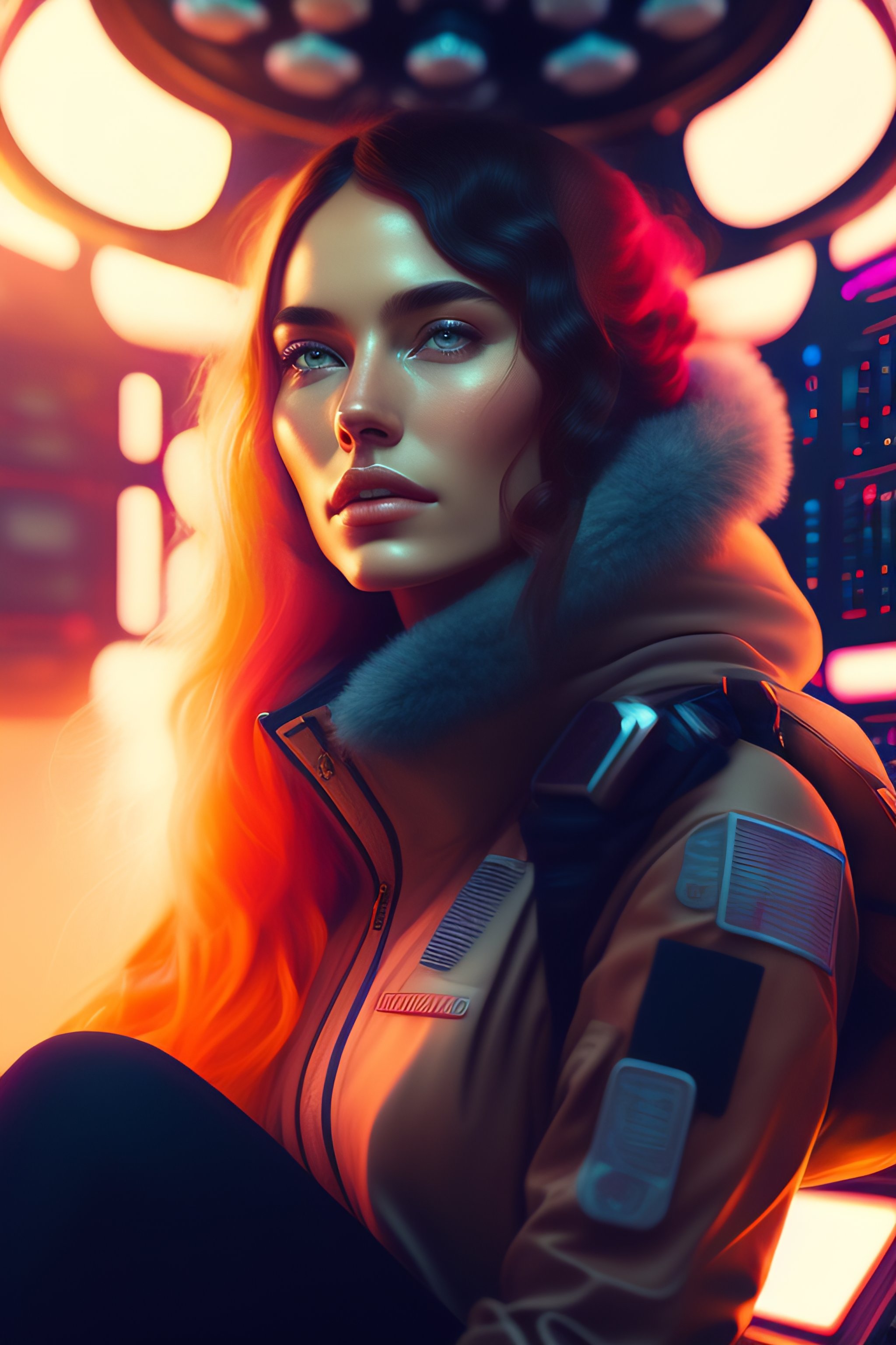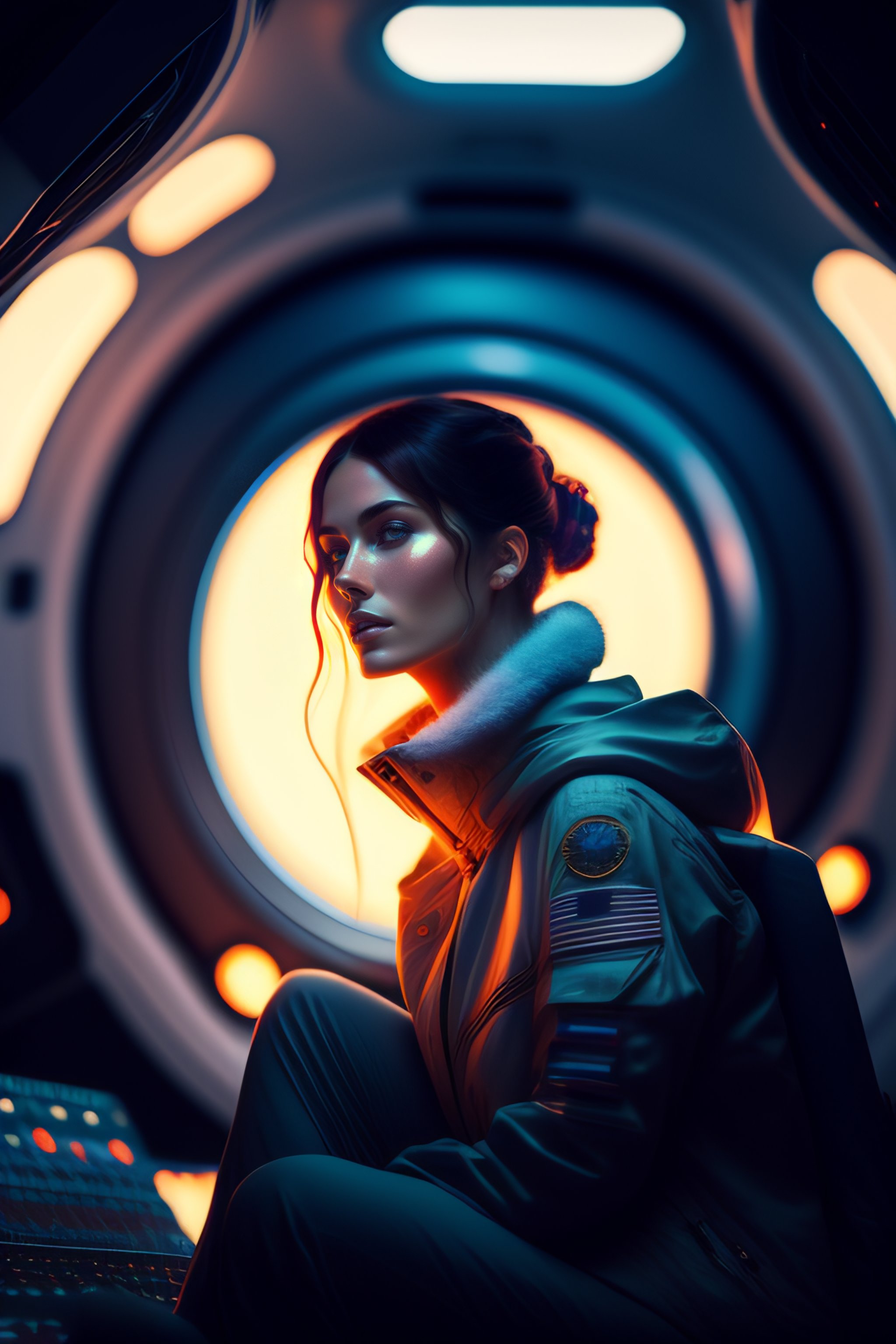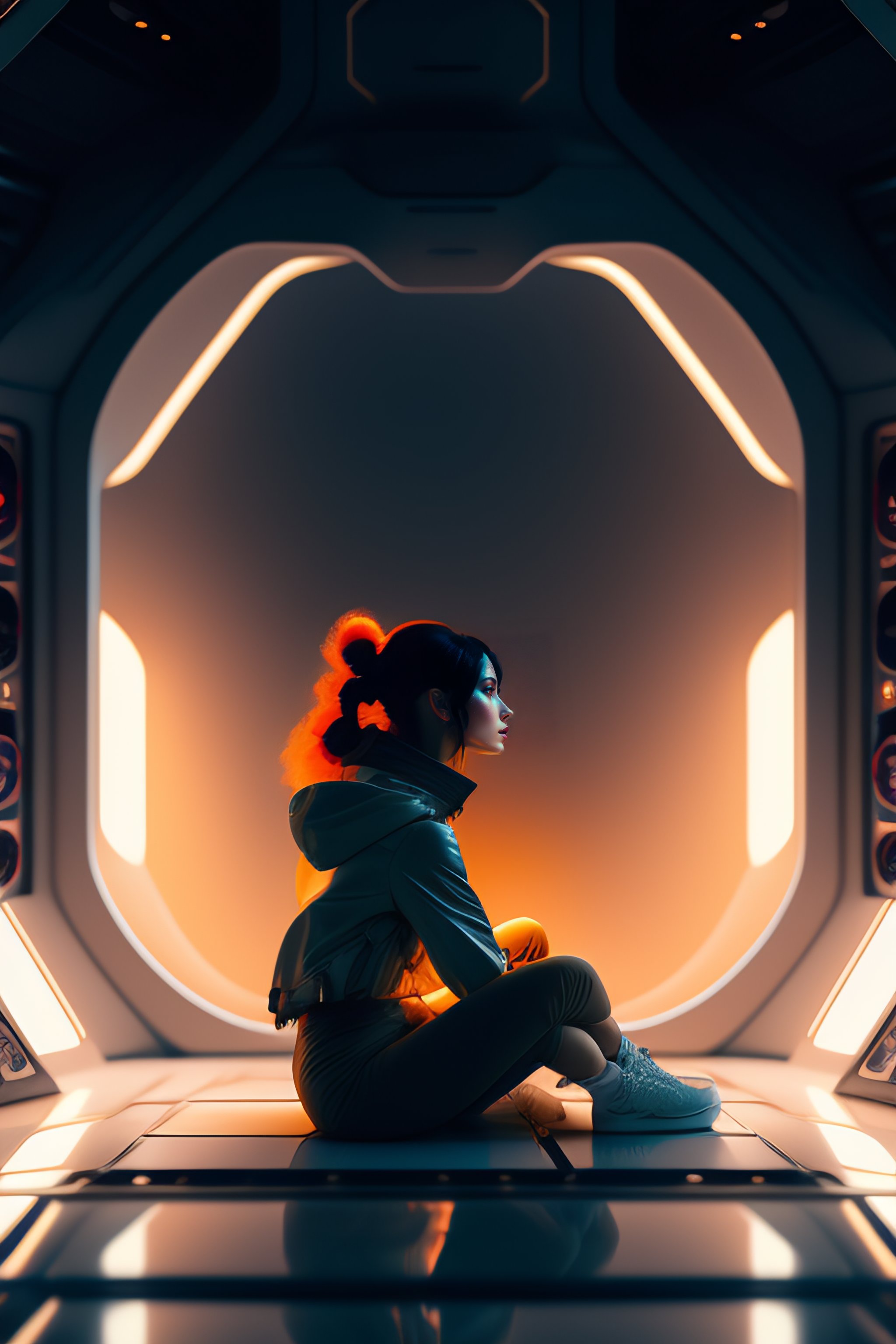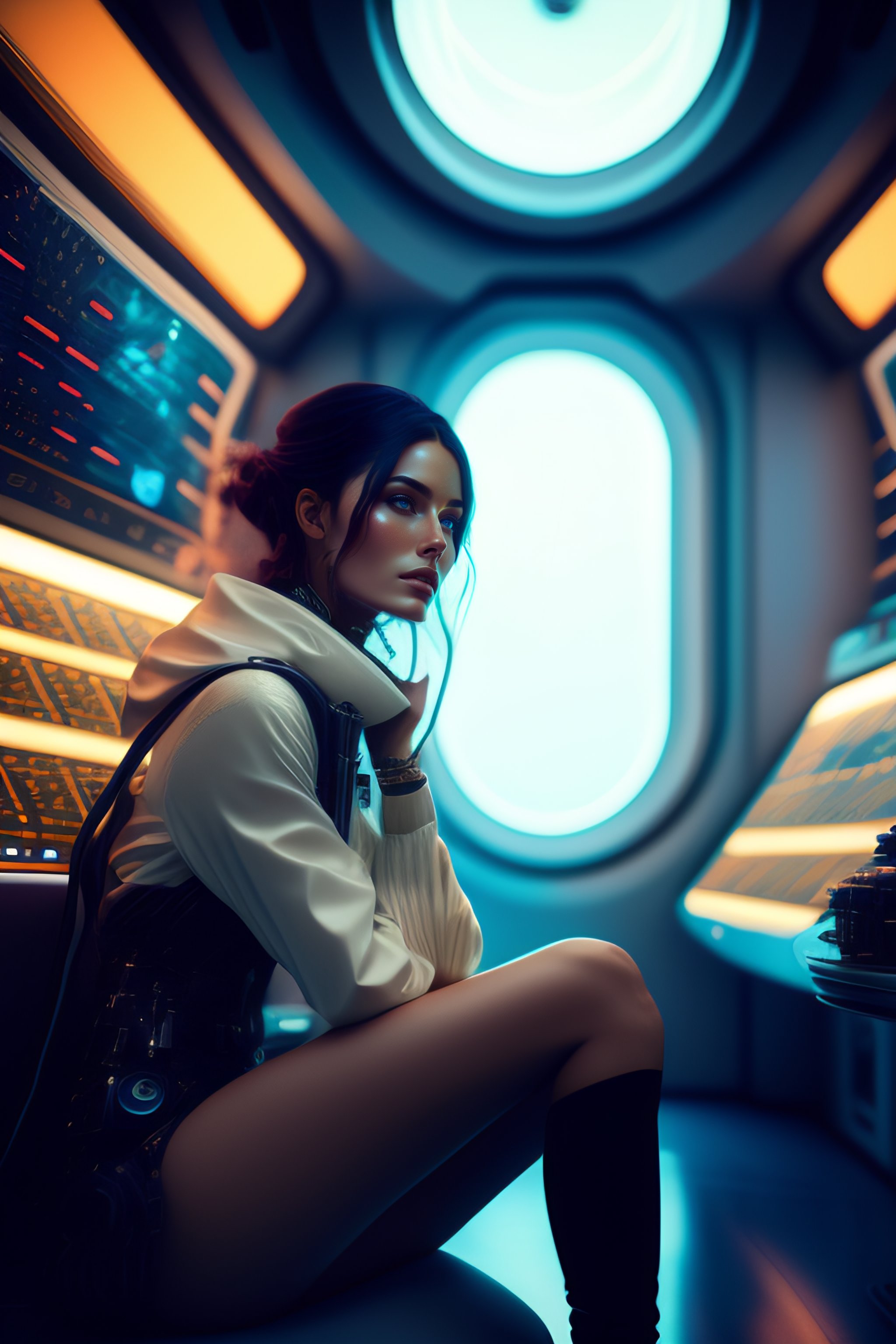 Woman sitting on the floor in spaceship control room, aesthetic, award winning, mucha, volumetric lighting, octane, detailed, intricate, epic composition, cinematic lighting, masterpiece, stunning, smooth, award - winning photoart, by conrad roset, by greg rutkowski, concept art, beautiful face, 4 k, david yates