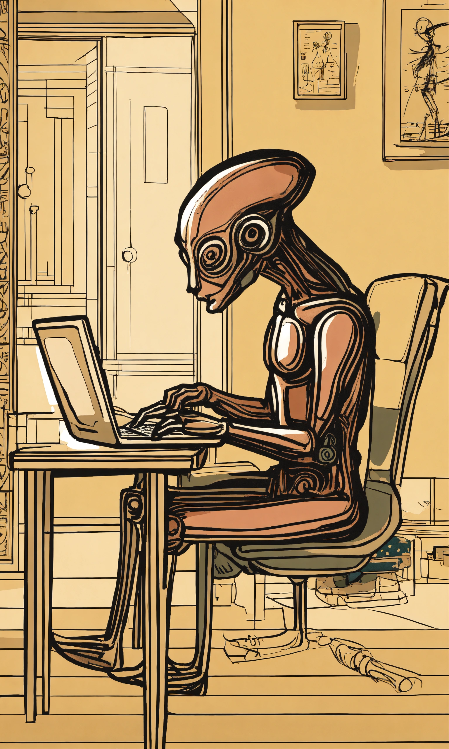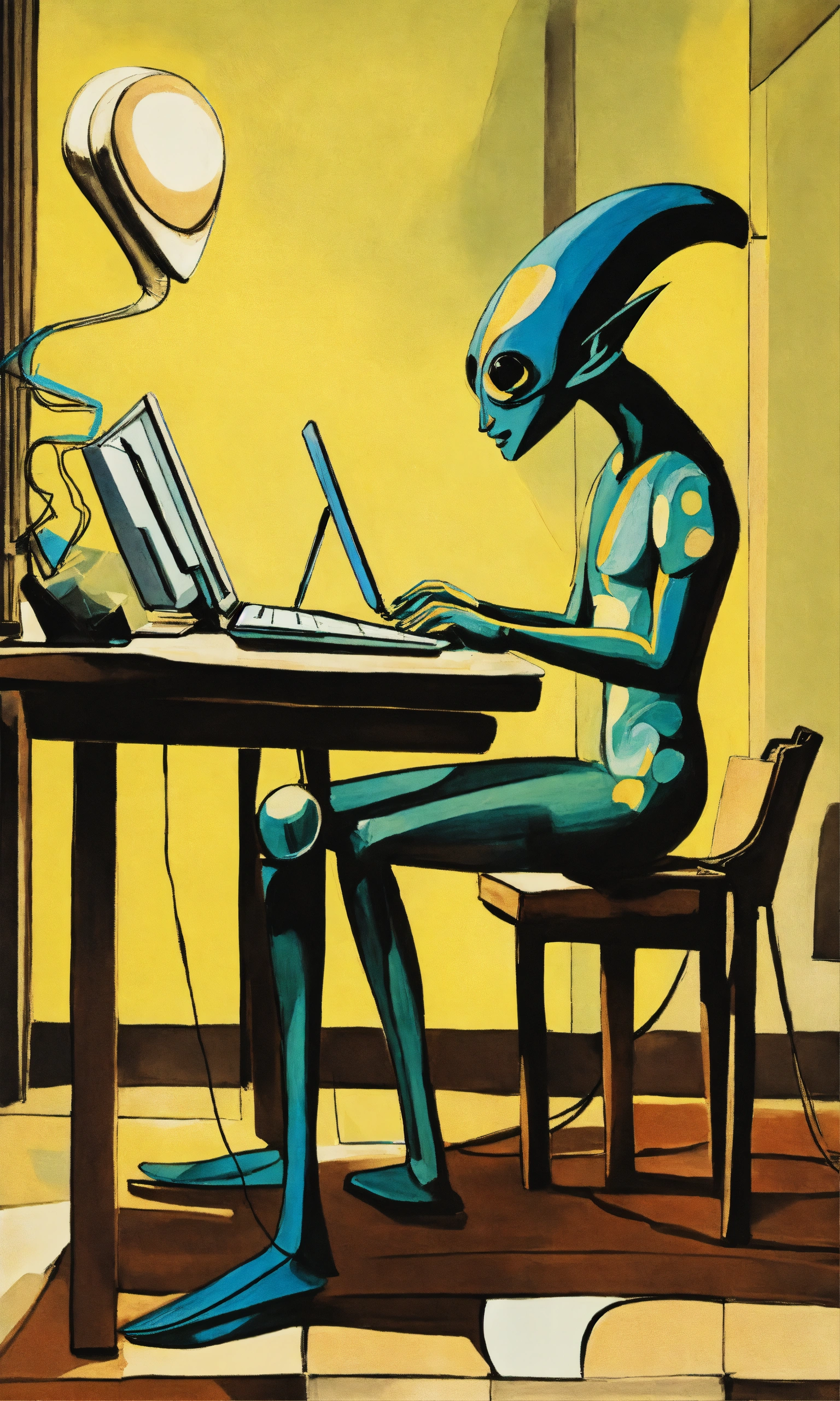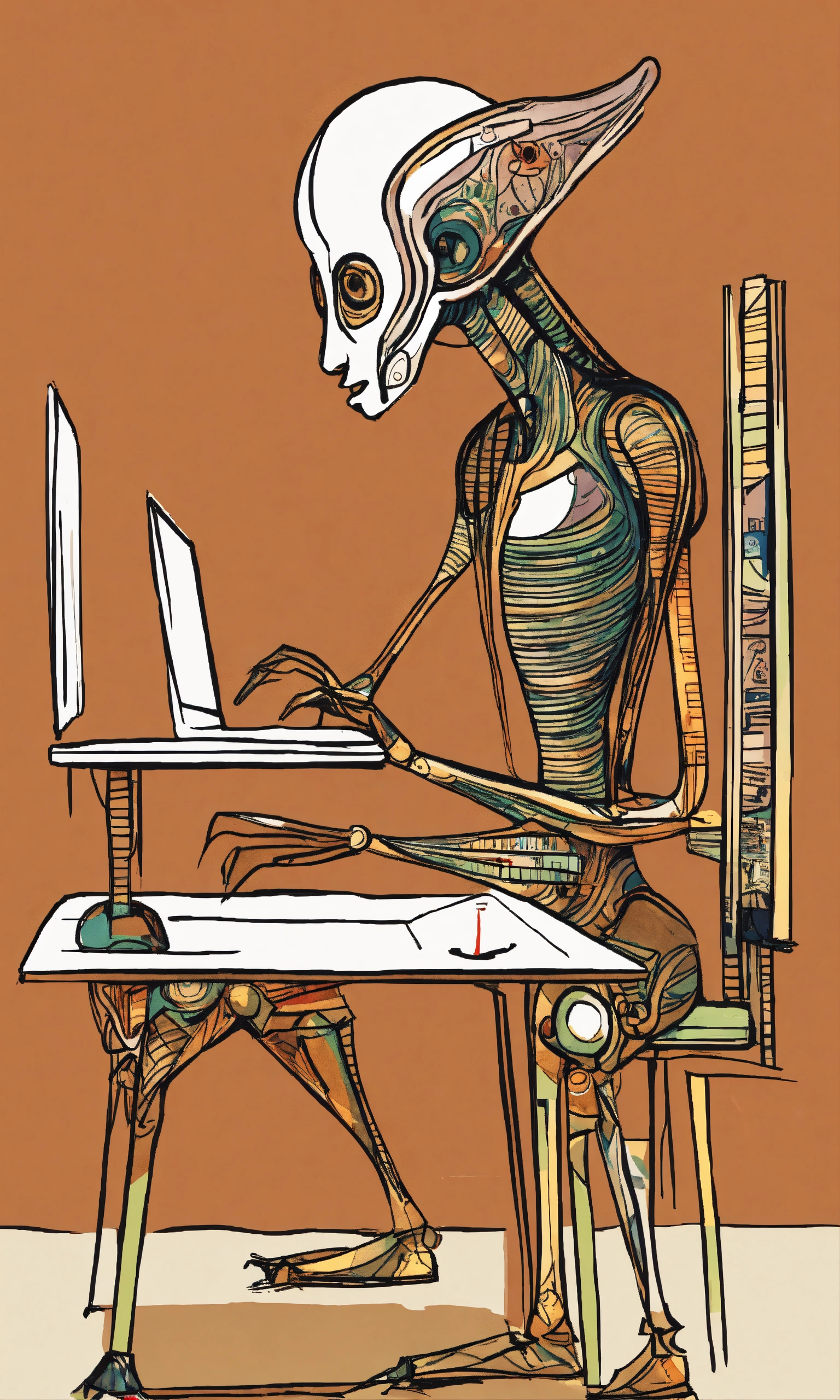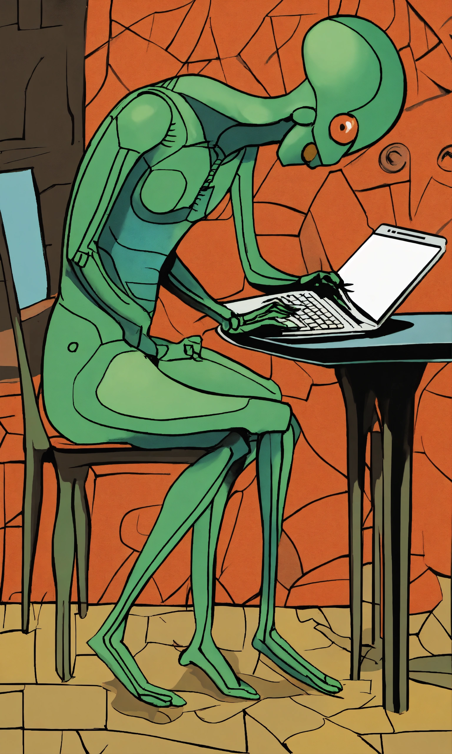 An ink painting by pablo picasso depicting an alien sitting at a table, studying with a laptop. the alien is slender in shape, with antennae on its head and a streamlined body. it is focusedly staring at the computer screen, its fingers skillfully tapping on the keyboard. the brushstrokes are smooth, and the ink rendering is delicate, giving a mysterious and extraordinary feeling. high-resolution digital artwork of an extraterrestrial creature studying with a laptop, created by pablo picasso, featuring intricate details and sharp focus.