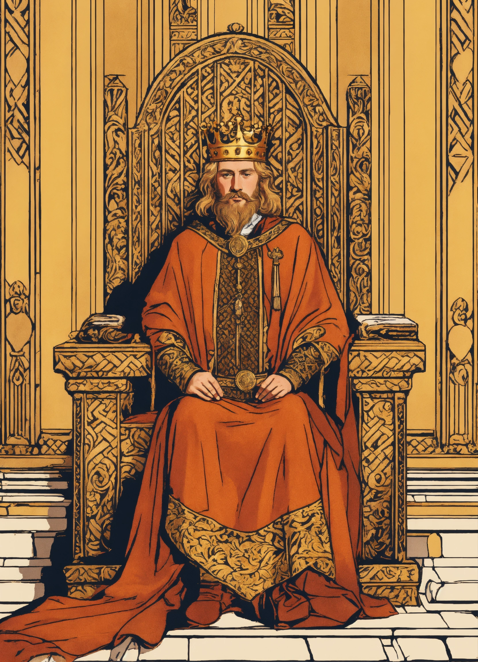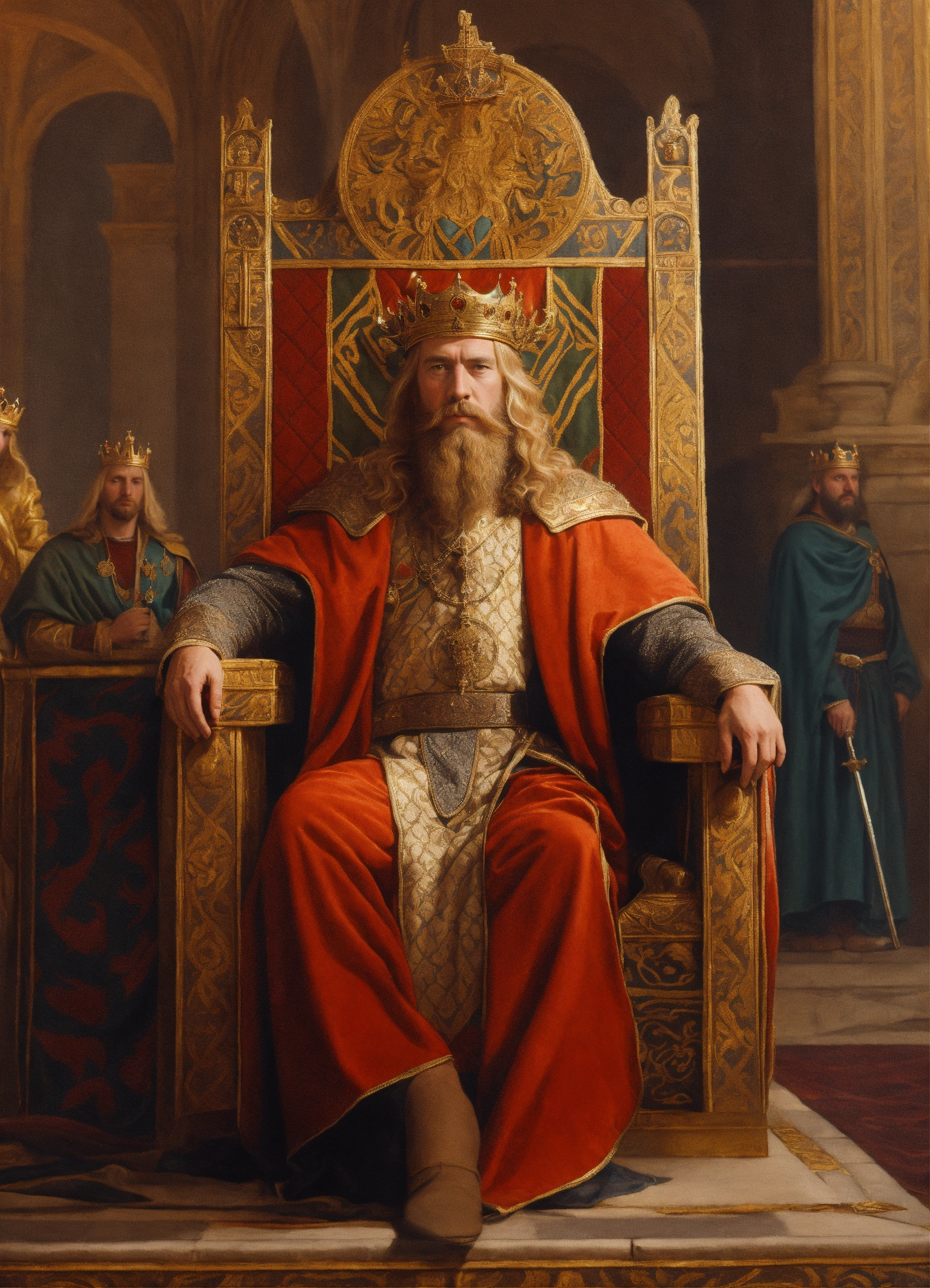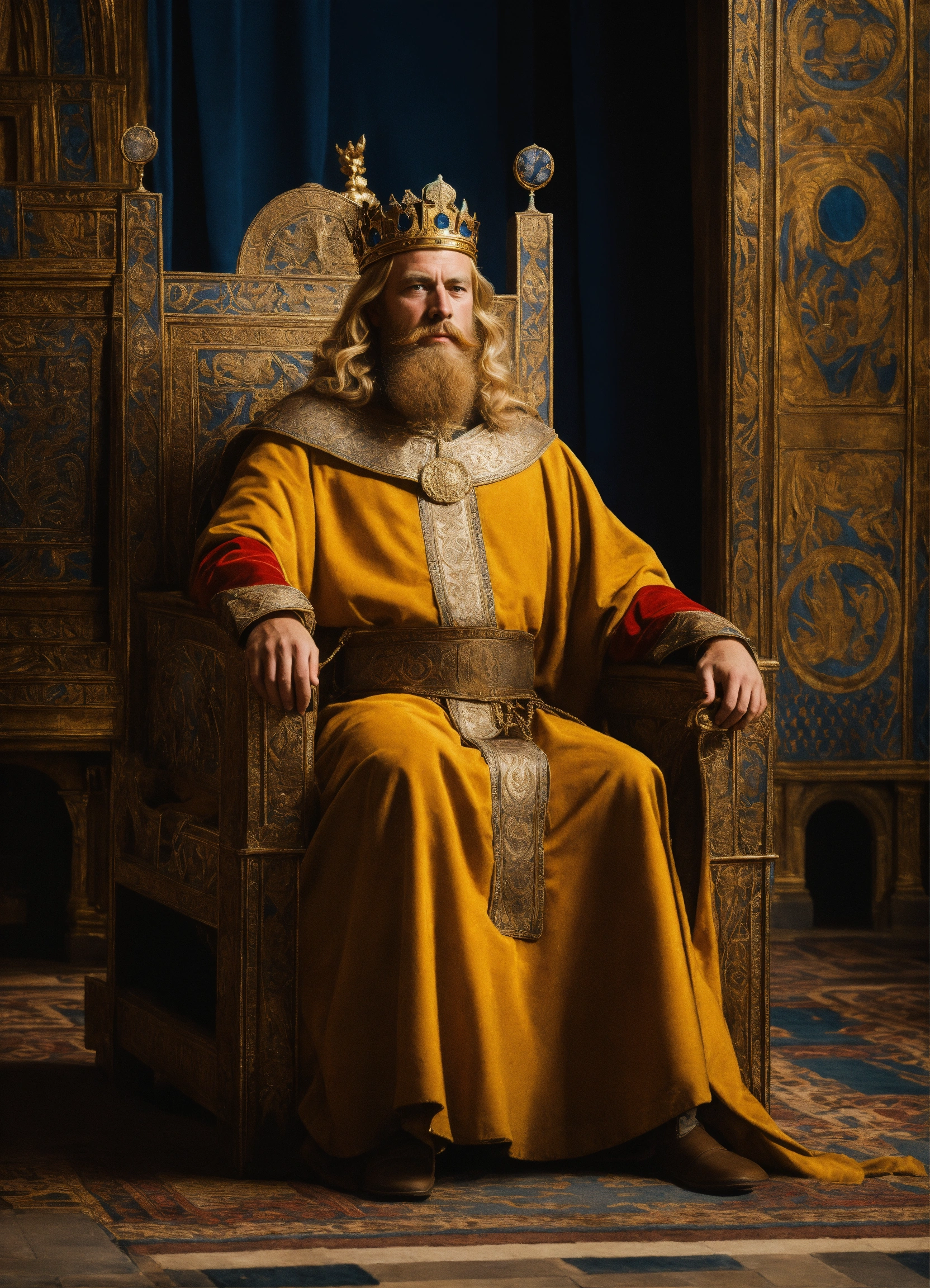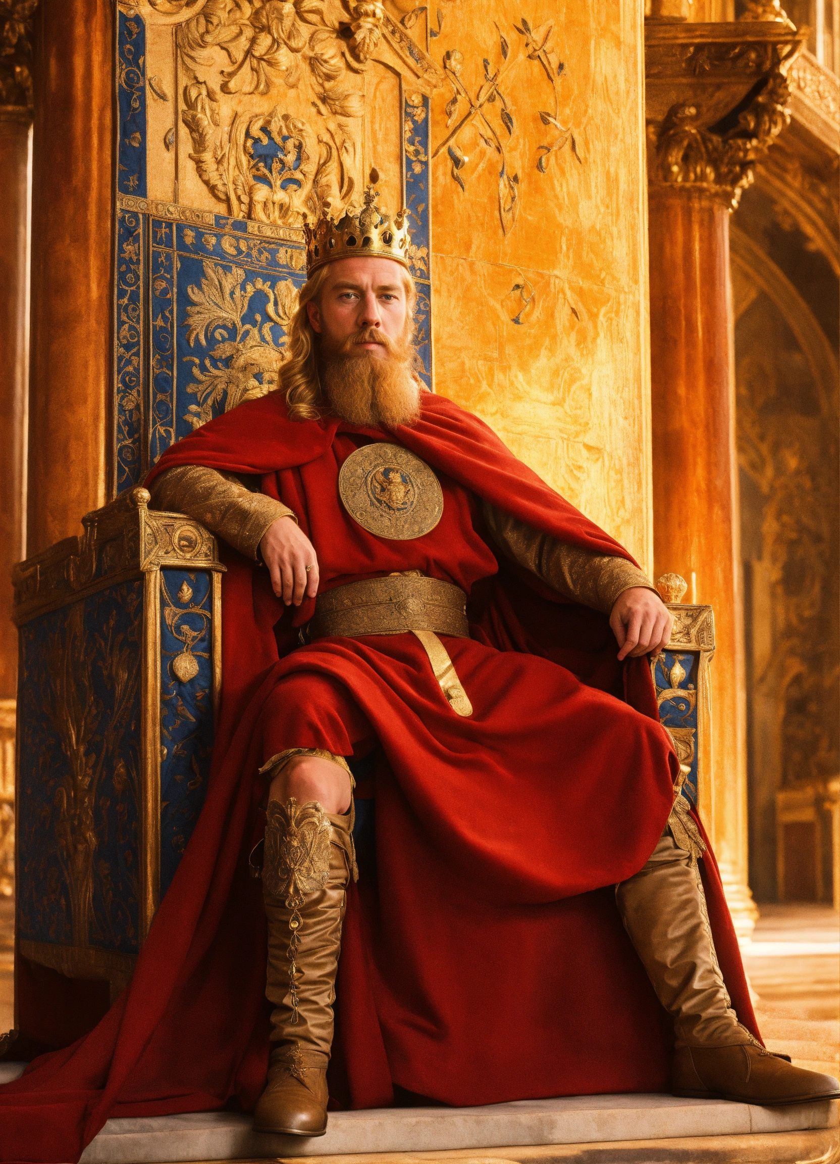 Anglo saxon blonde king with a beard on throne in a palace