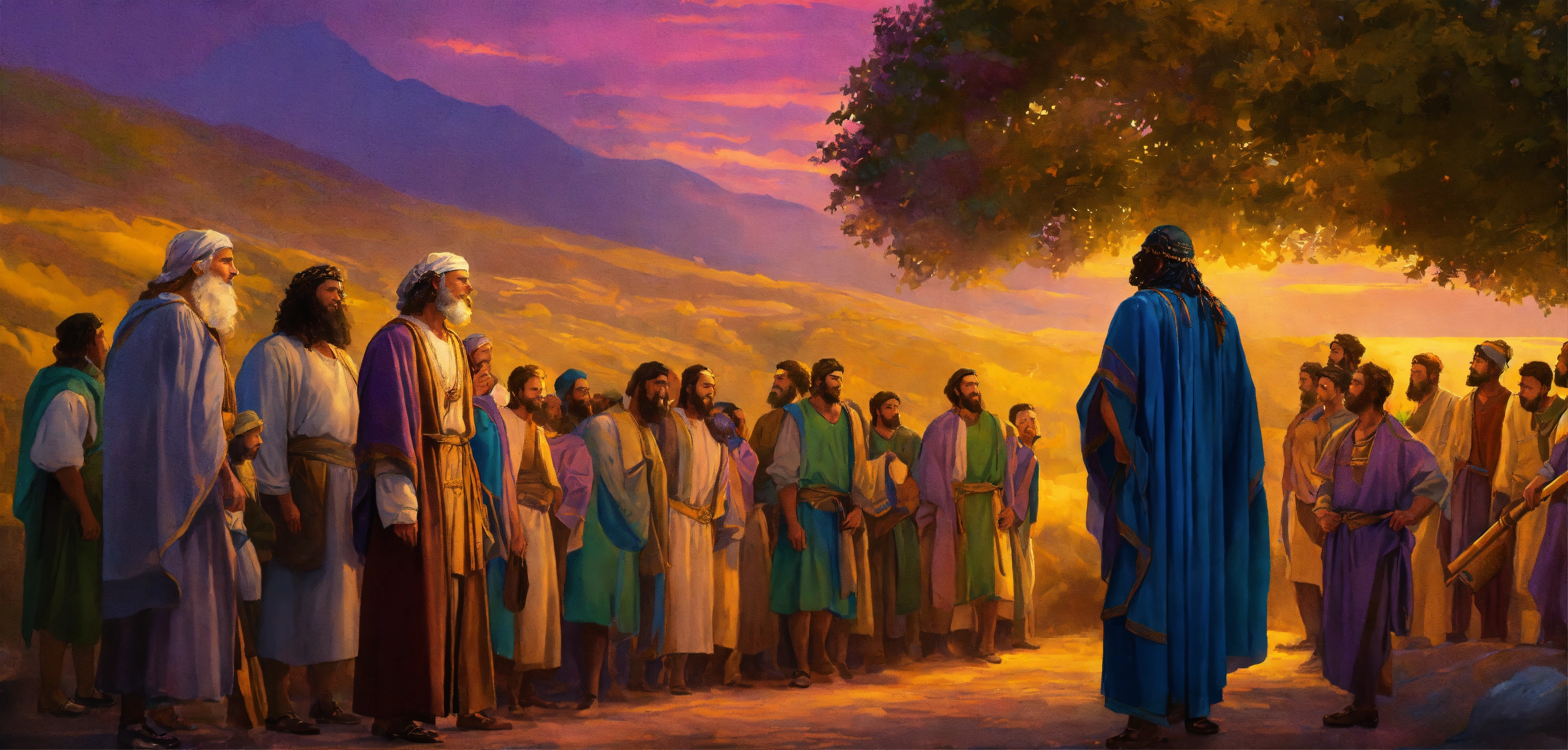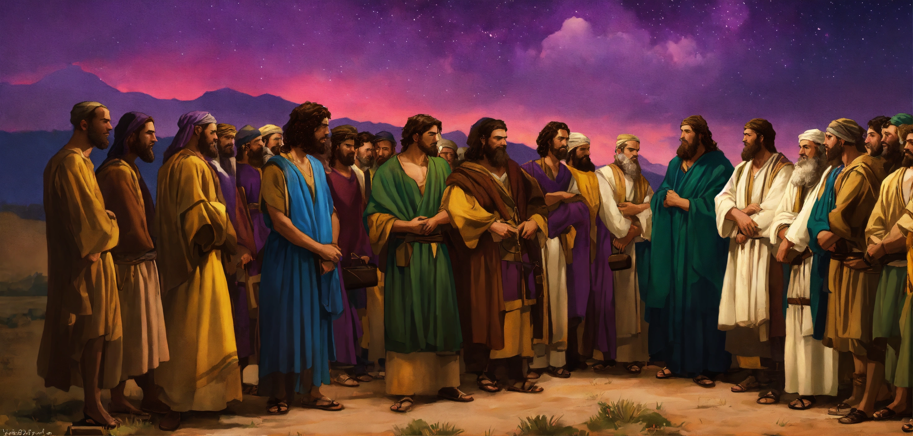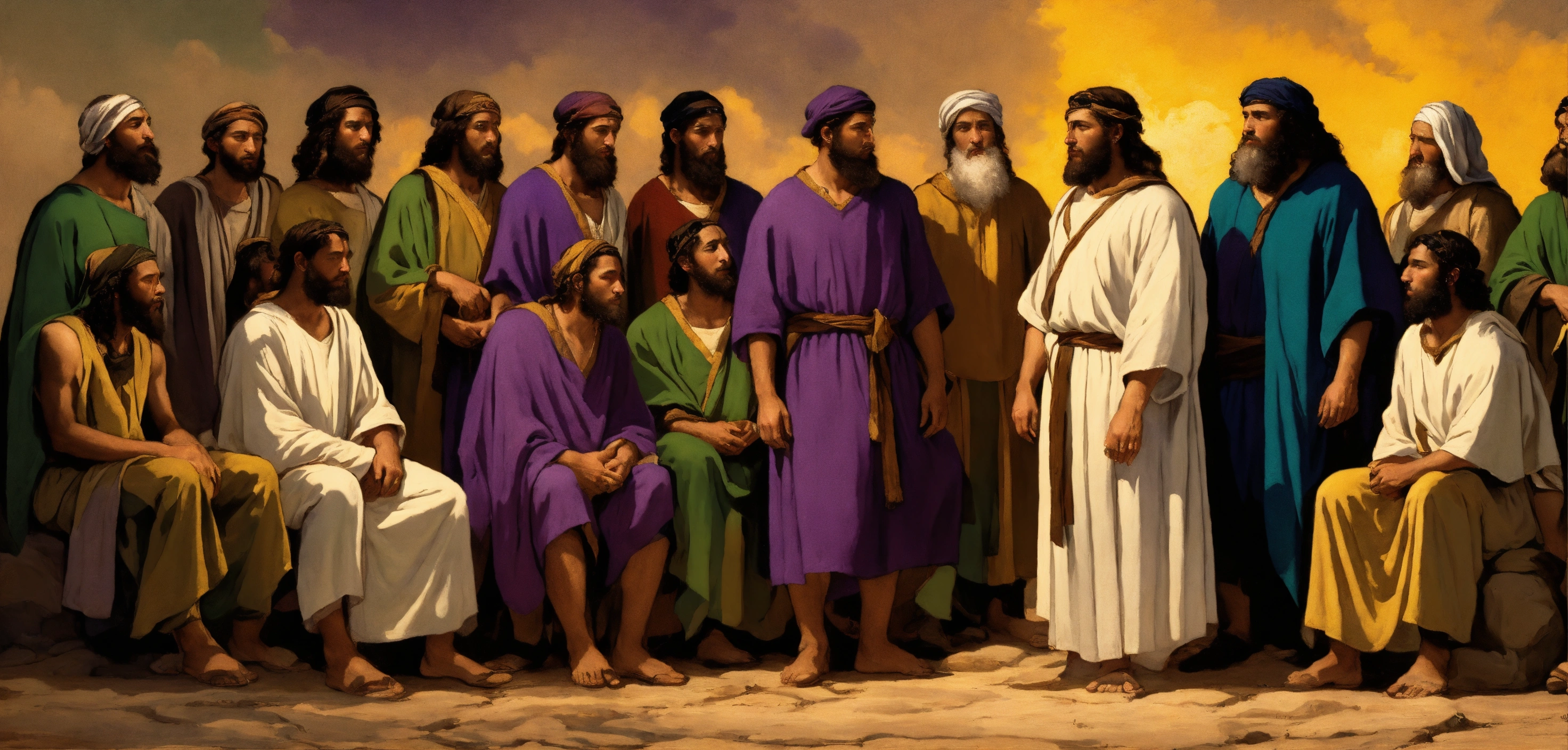 Jacob and his 12 sons of the bible 16k resolution; blues, purples, dark greens, whites, yellows, brilliant art.