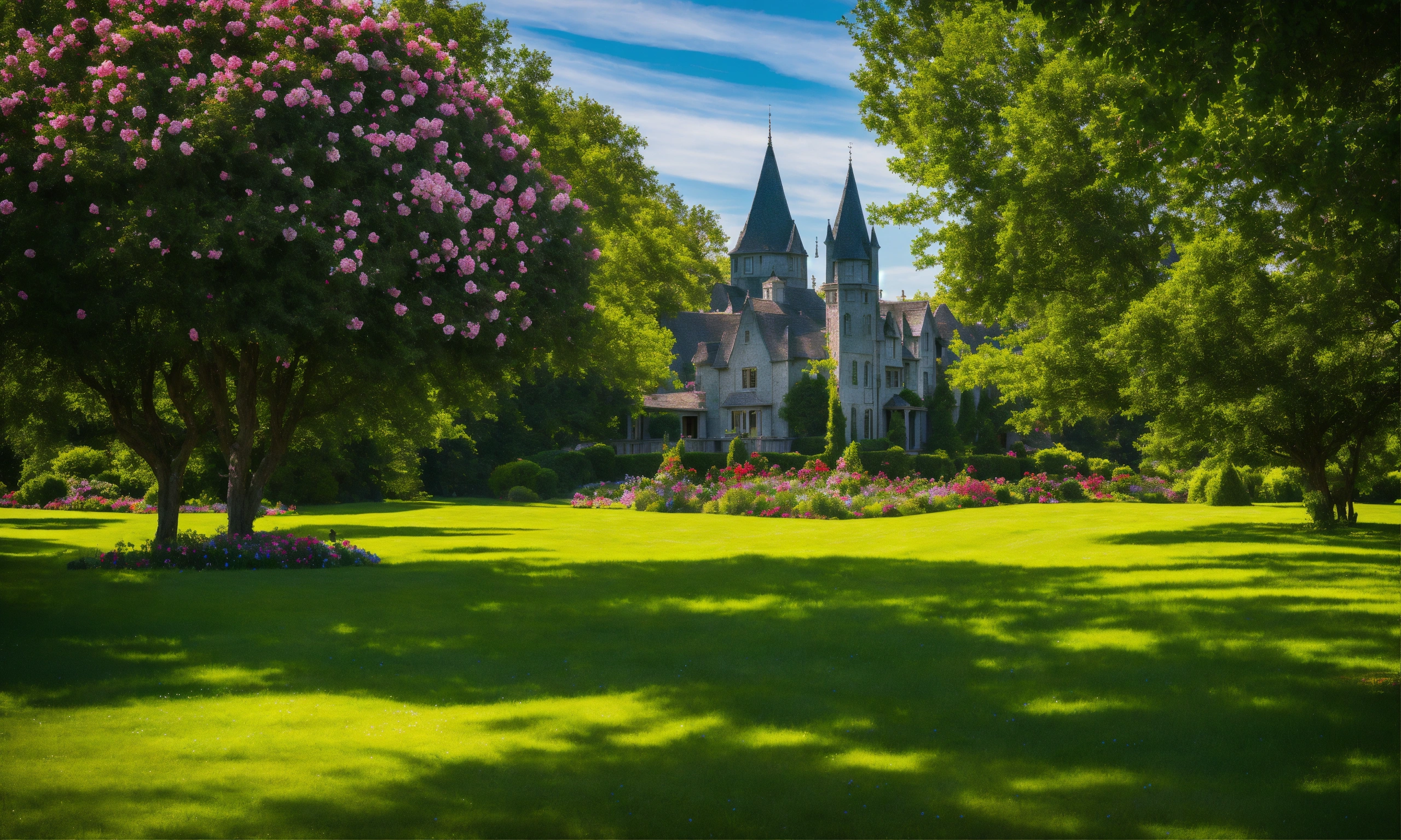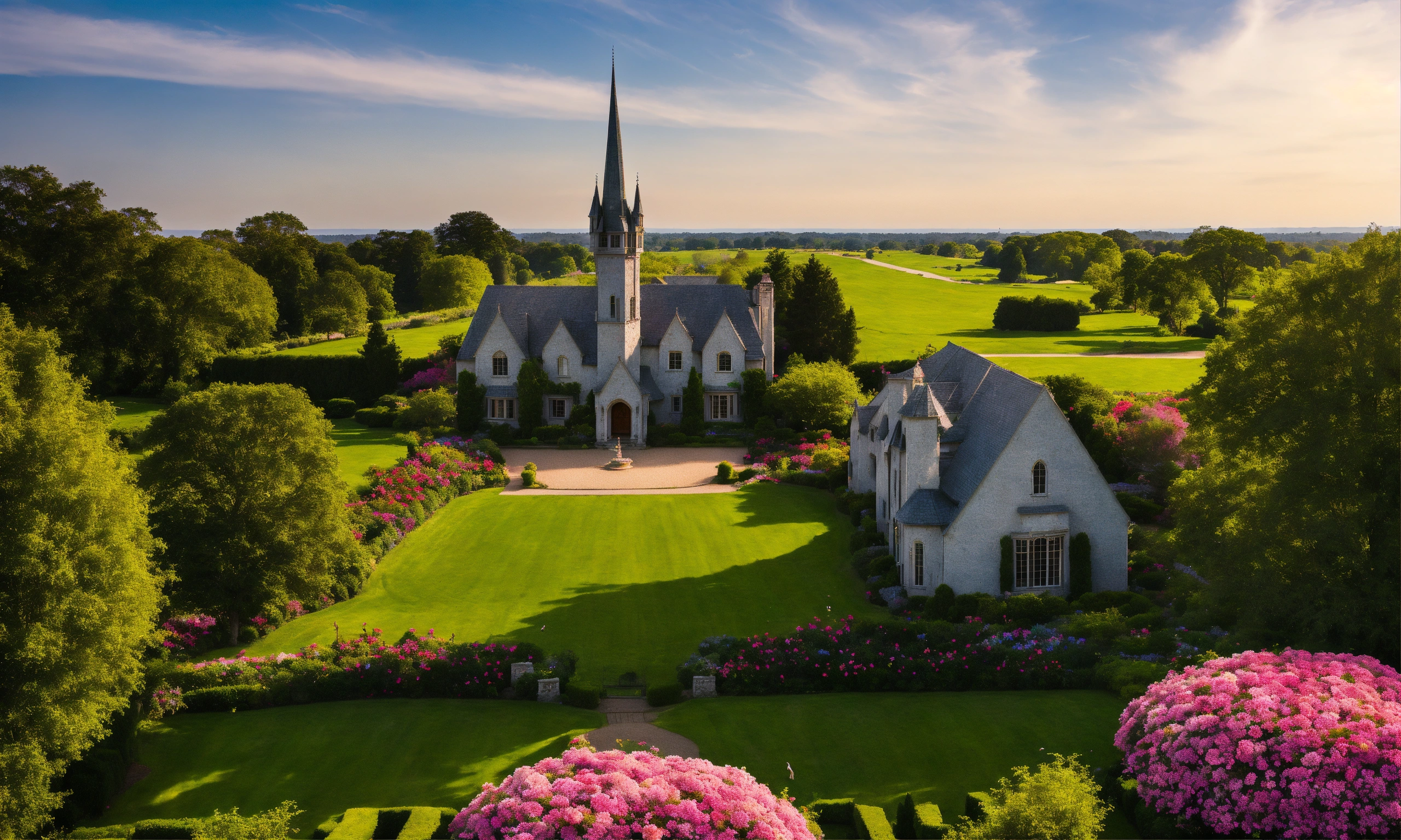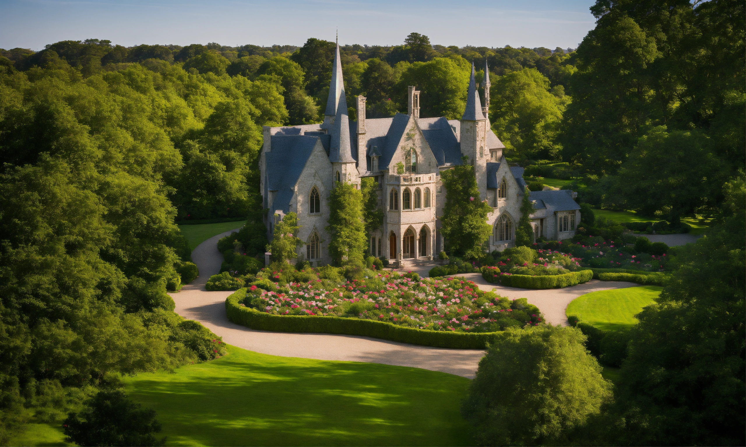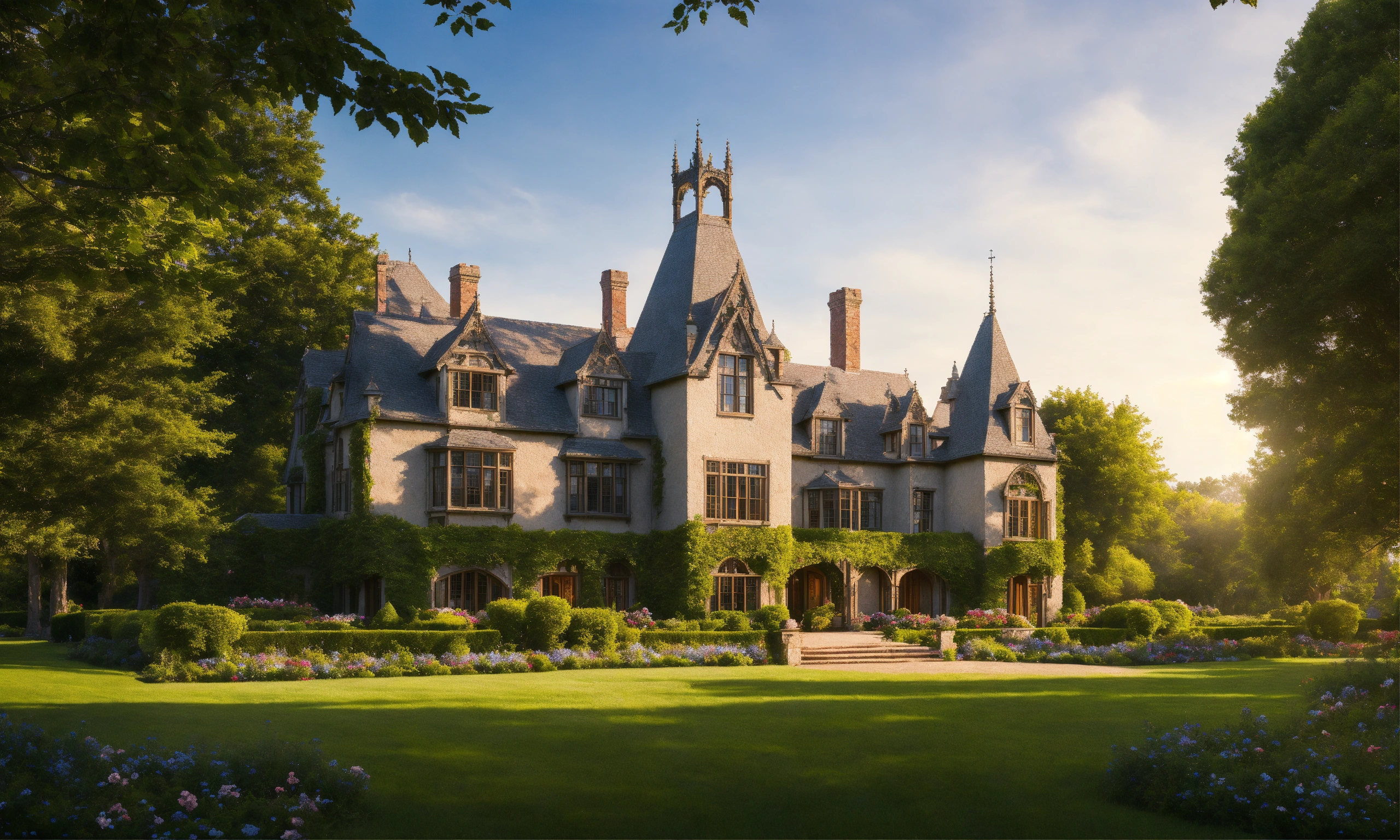 "nestled amidst a lush meadow, the expansive westbrook estate stands majestically. gothic spires pierce a clear blue sky while birds cast delicate, moving shadows upon manicured hedges and roses in full bloom."