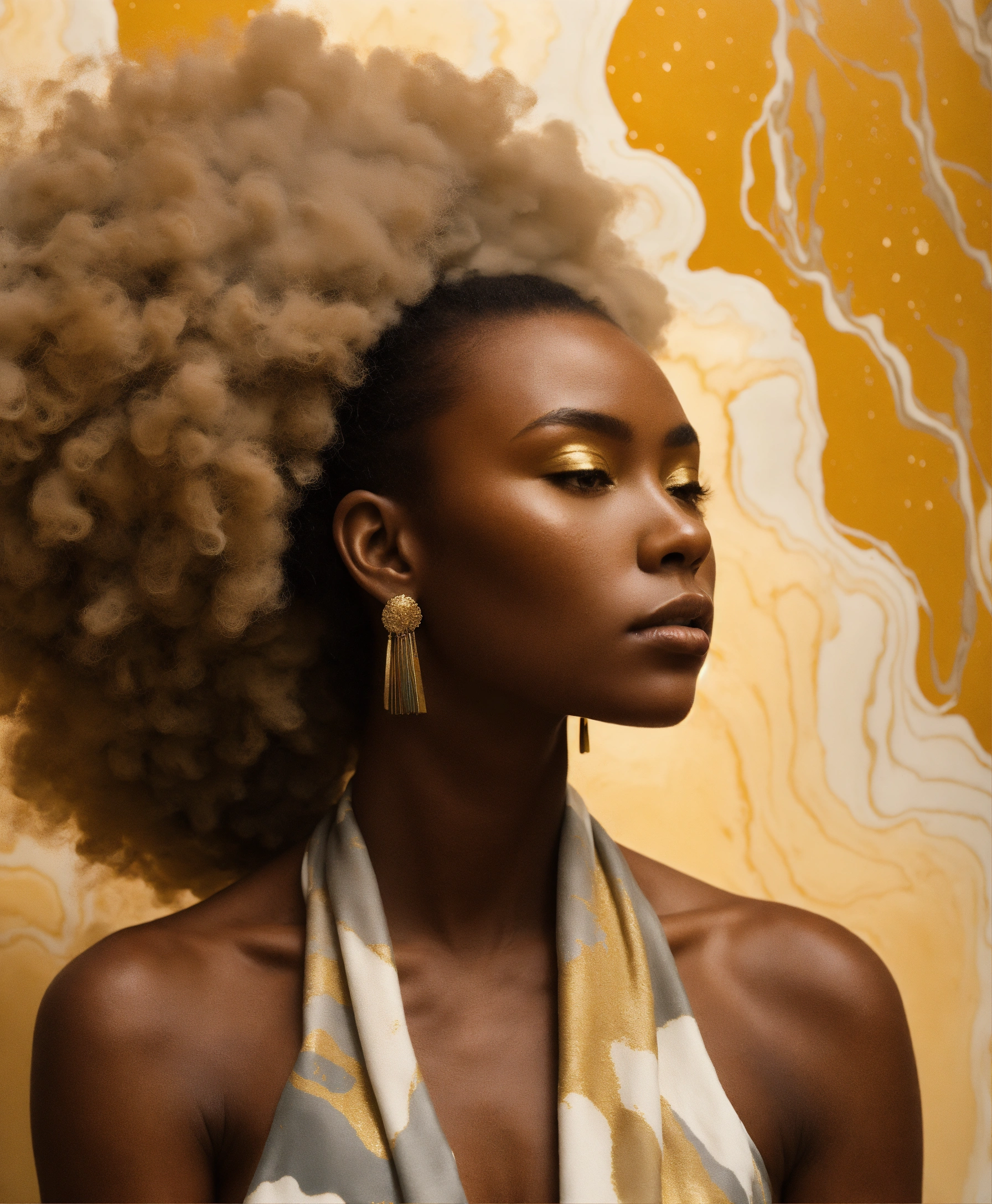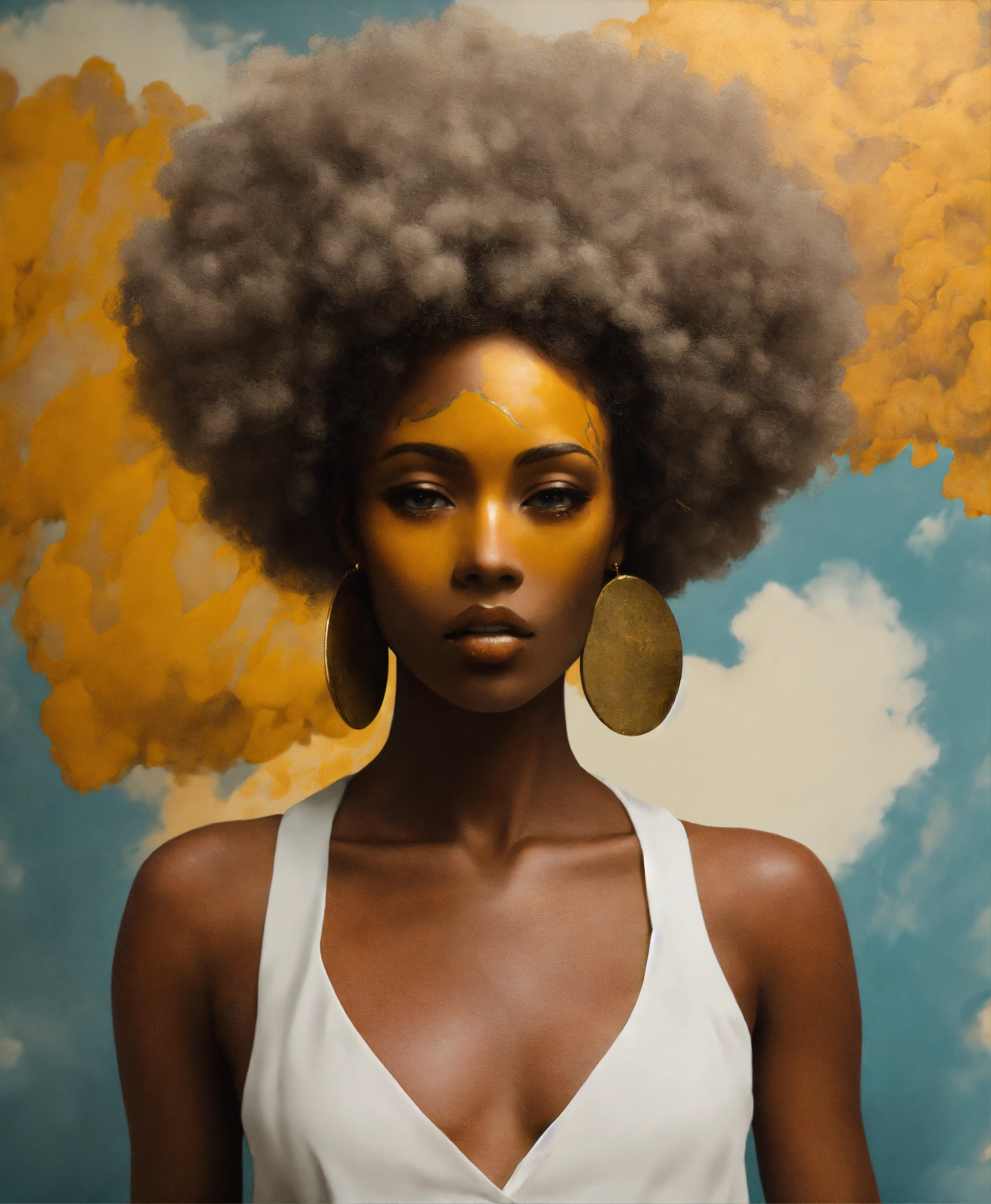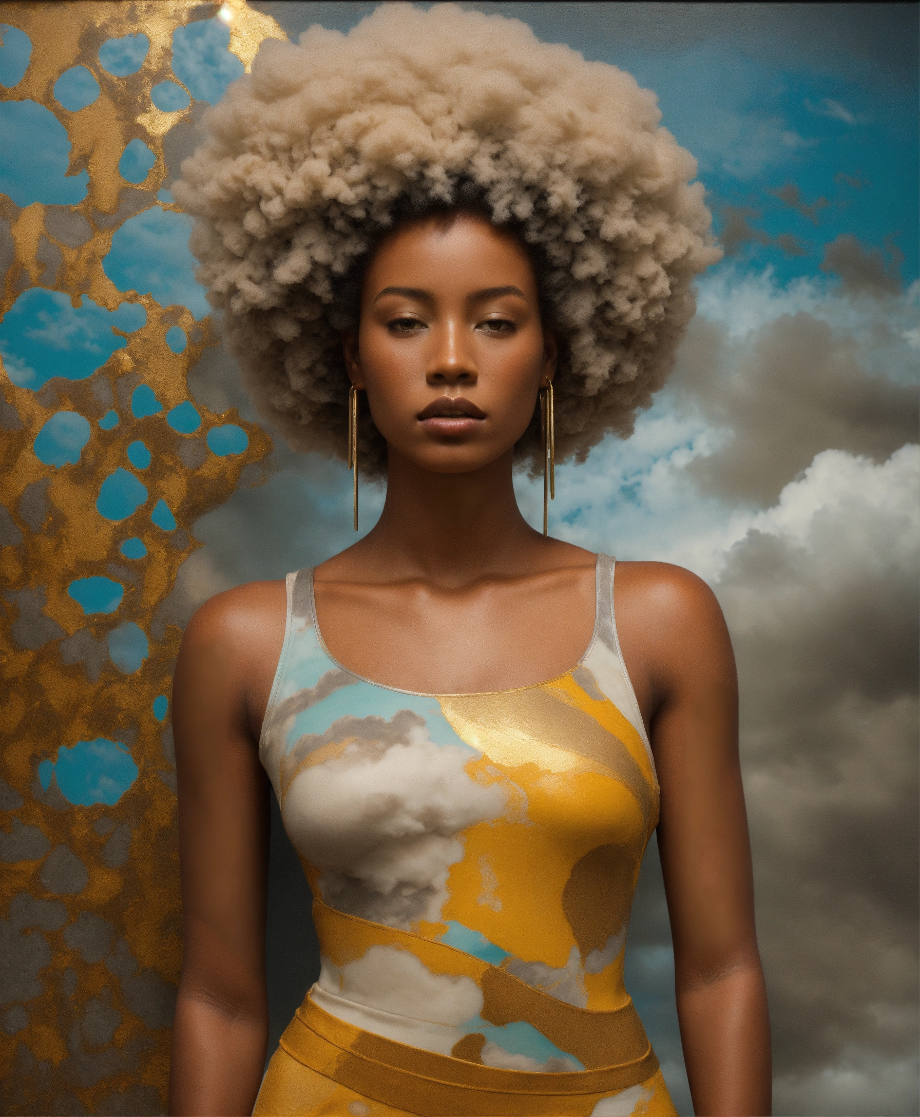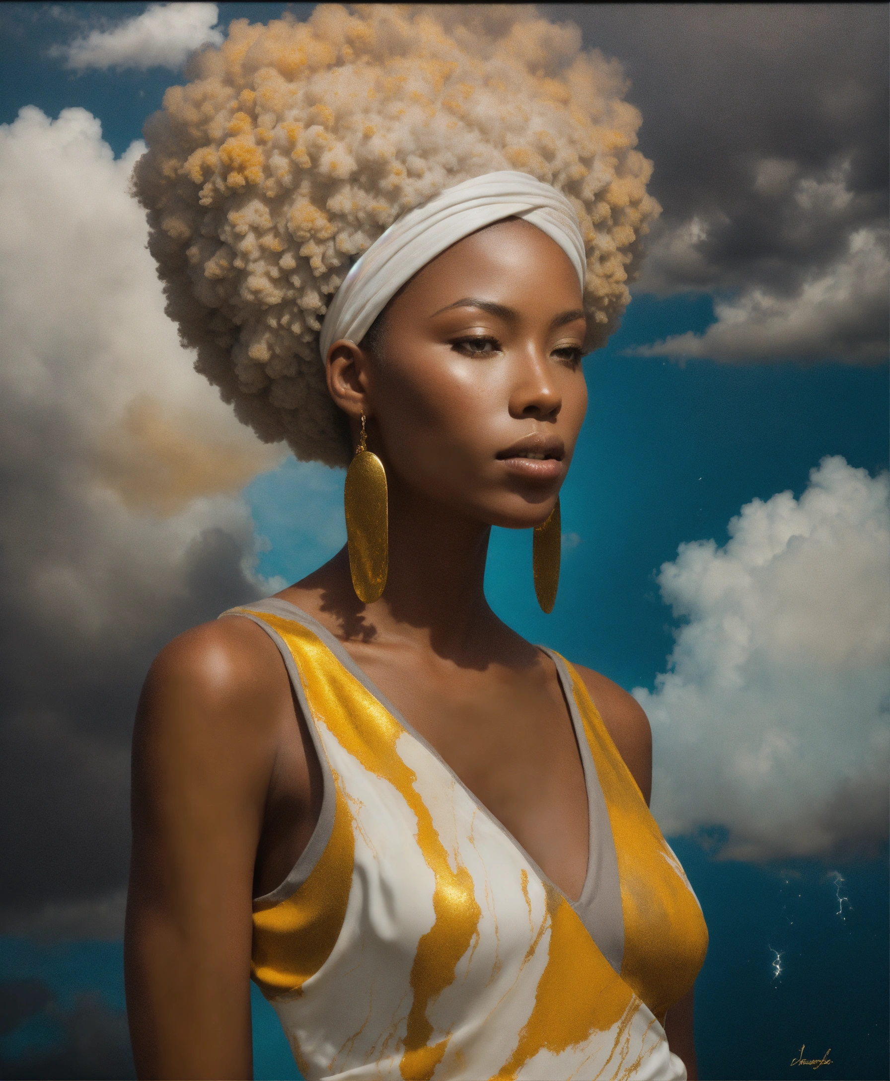 A hd woman sculpted of white taupe grey with gold veined marble painted skin, afro hair is made of mustard terracotta and turquiose cumulus clouds streaked with silver lightning strikes throughout, cream drapy raw silk like tank rule of thirds