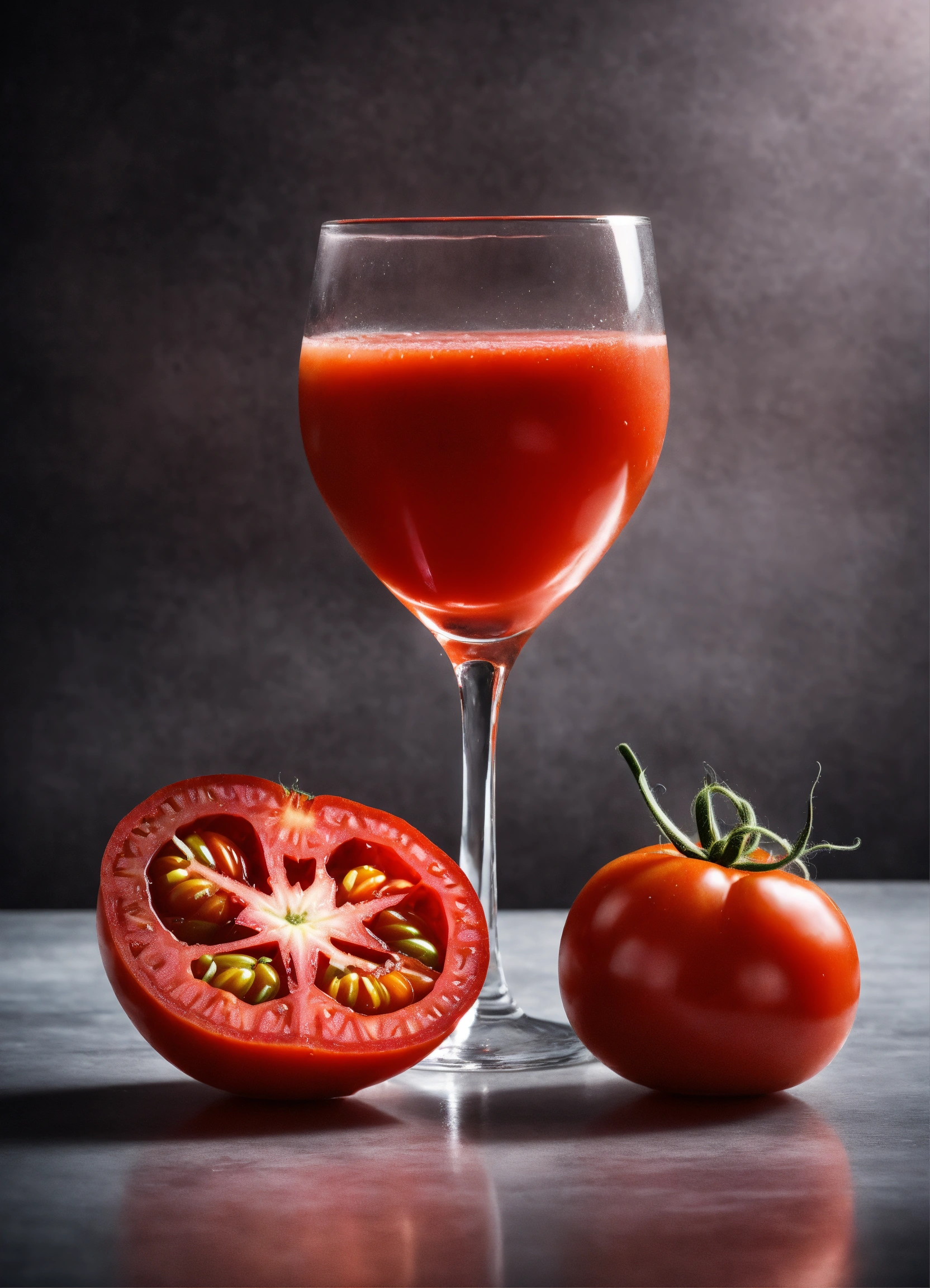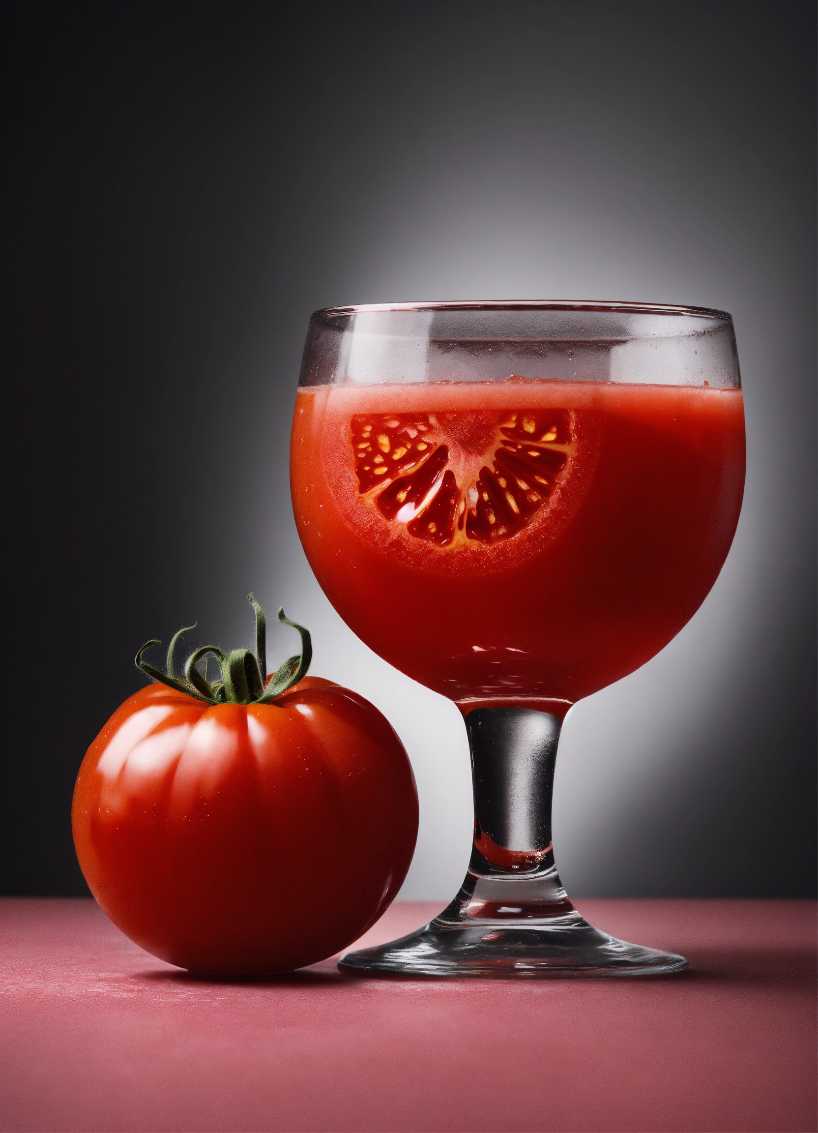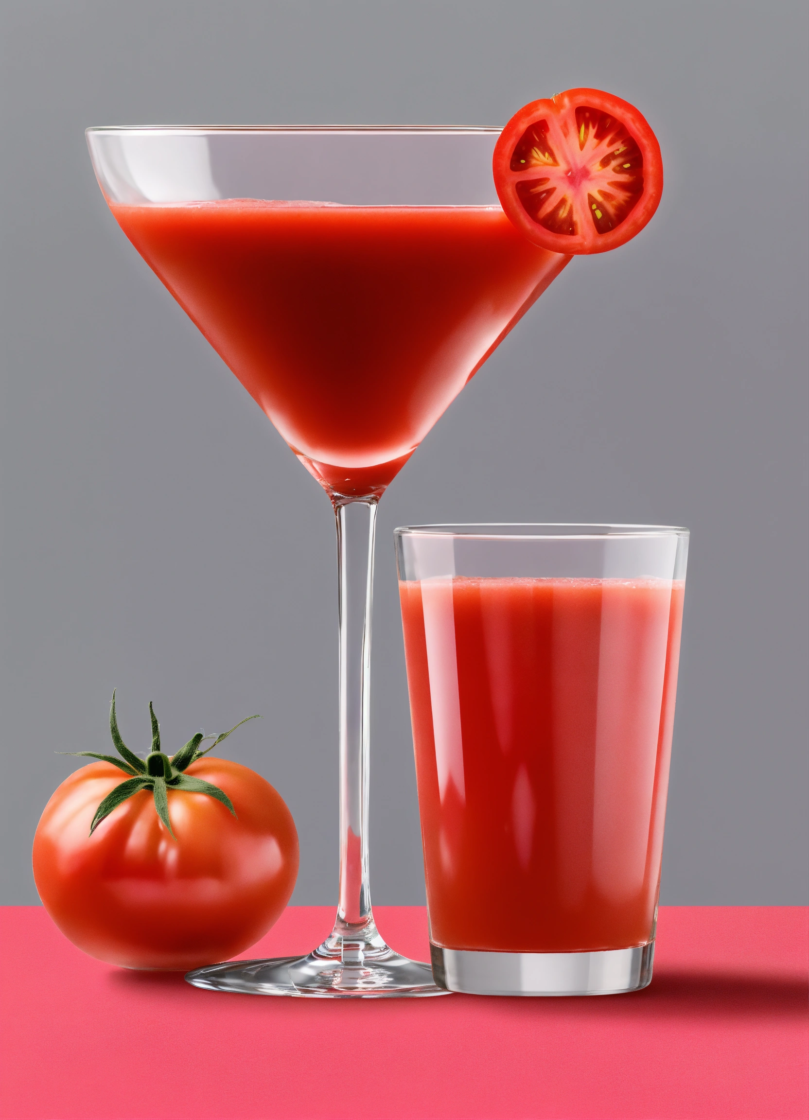 Graphic arts. a bright design advertisement for a large red juicy tomato, cut into two halves, next to a glass of tomato juice. background is delicate gray-pink.