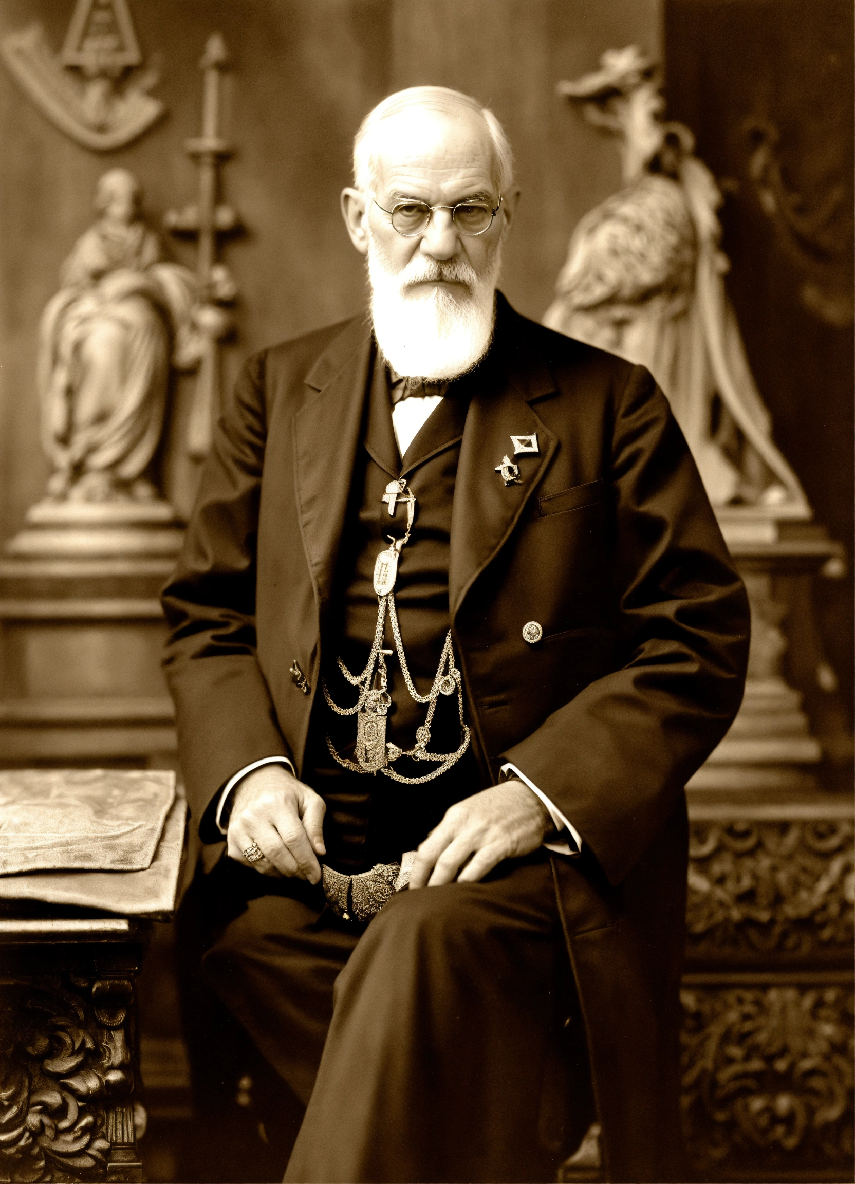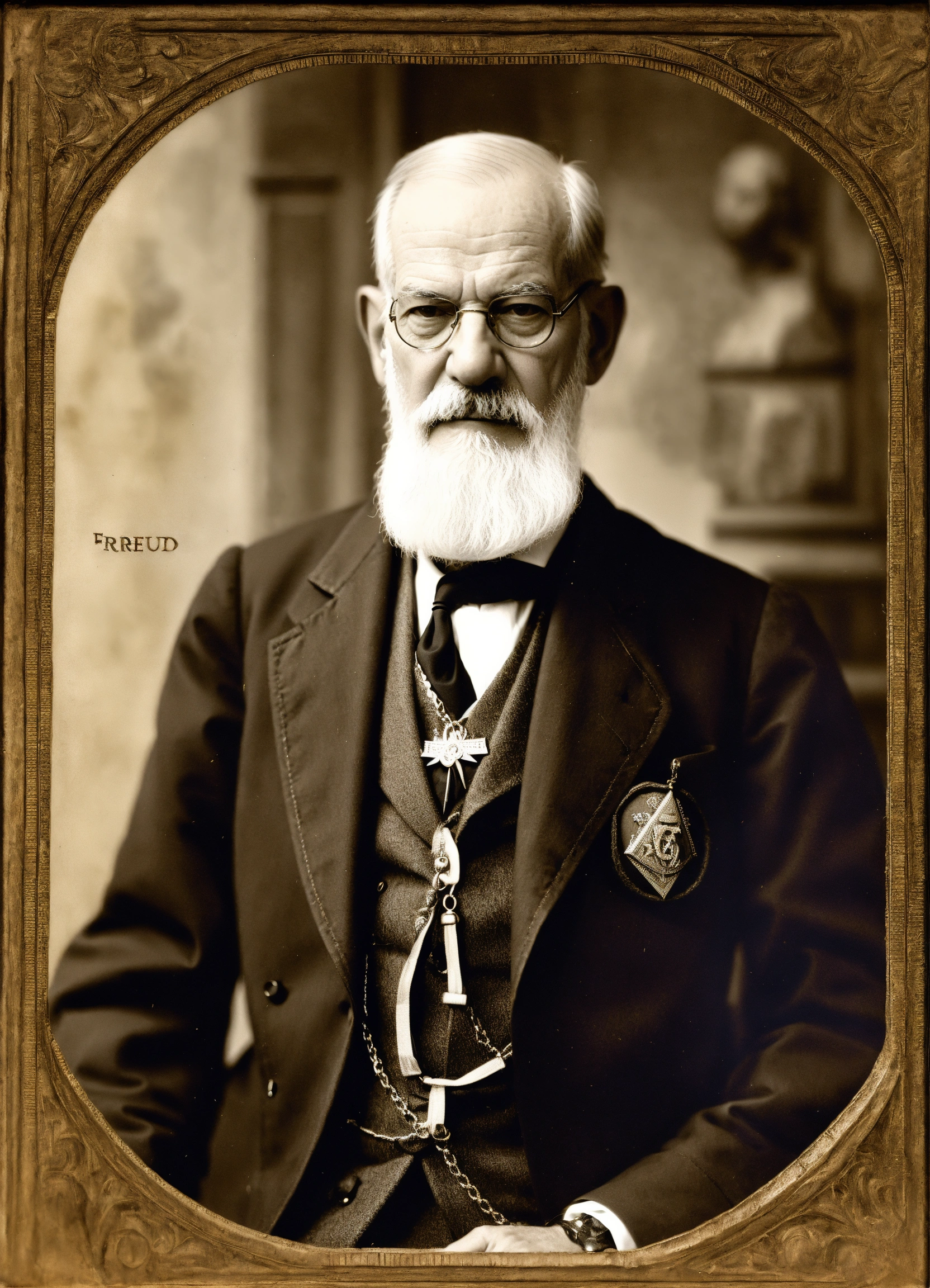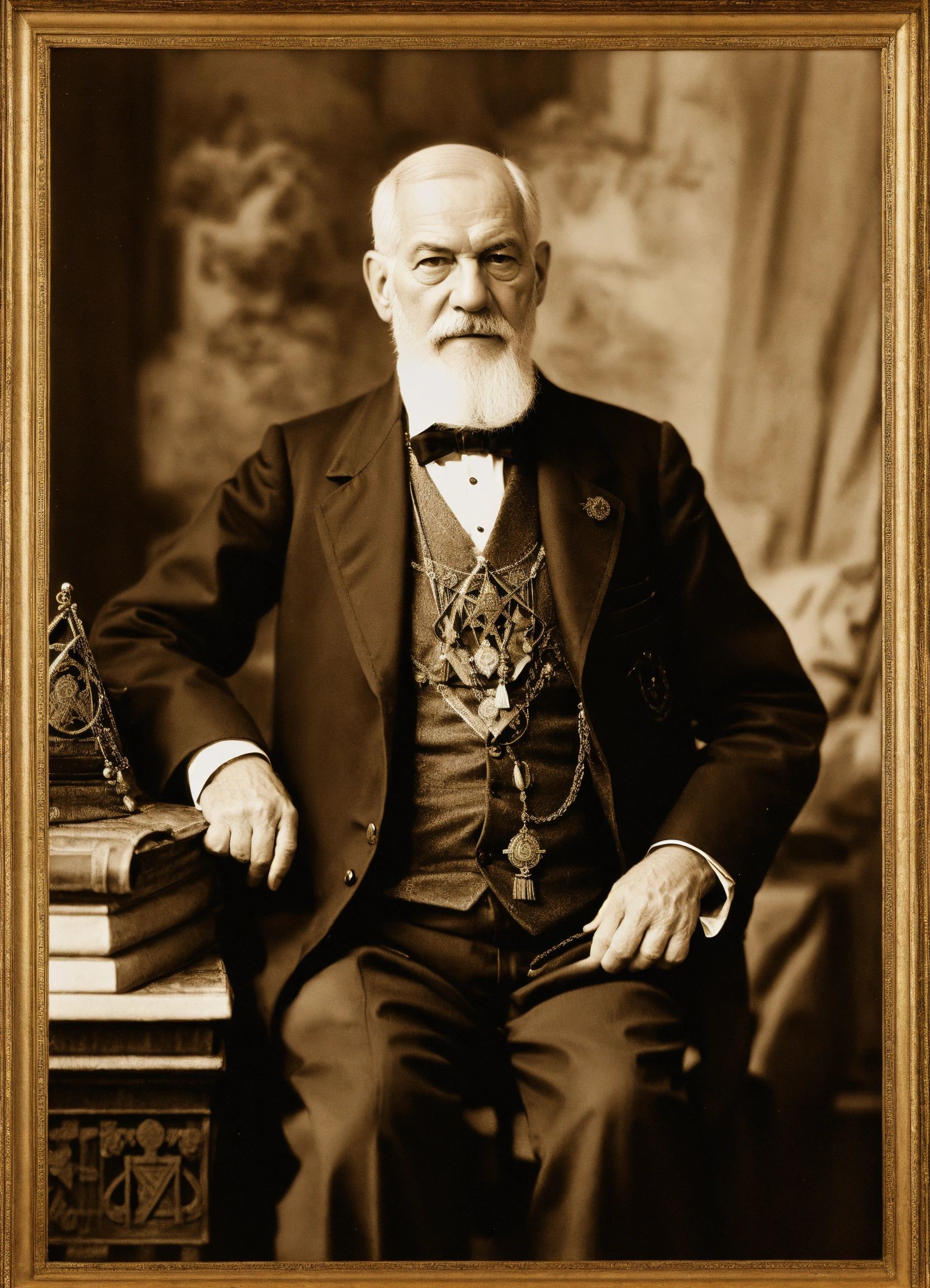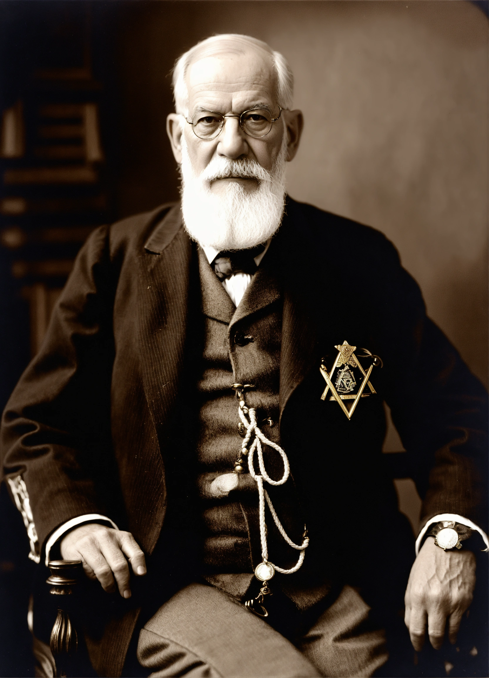 Generate a black and white photograph of sigmund freud, dressed in a masonic apron, as a master mason, in the french rite.