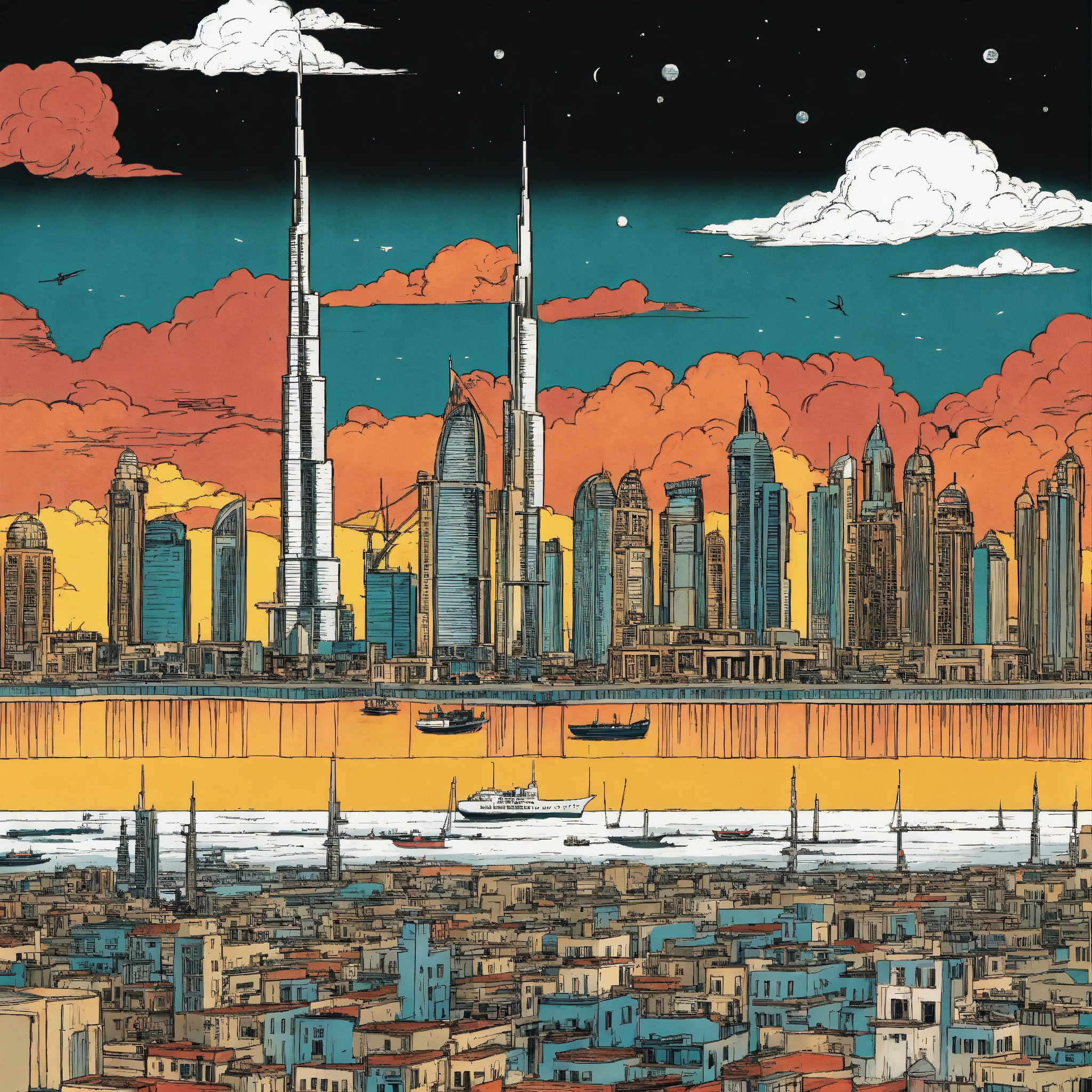 Stunning dubai skyline, illustrated by hergé, style of tin tin comics, pen and ink. vintage 90's anime style, black and white, colorful clouds, symmetric