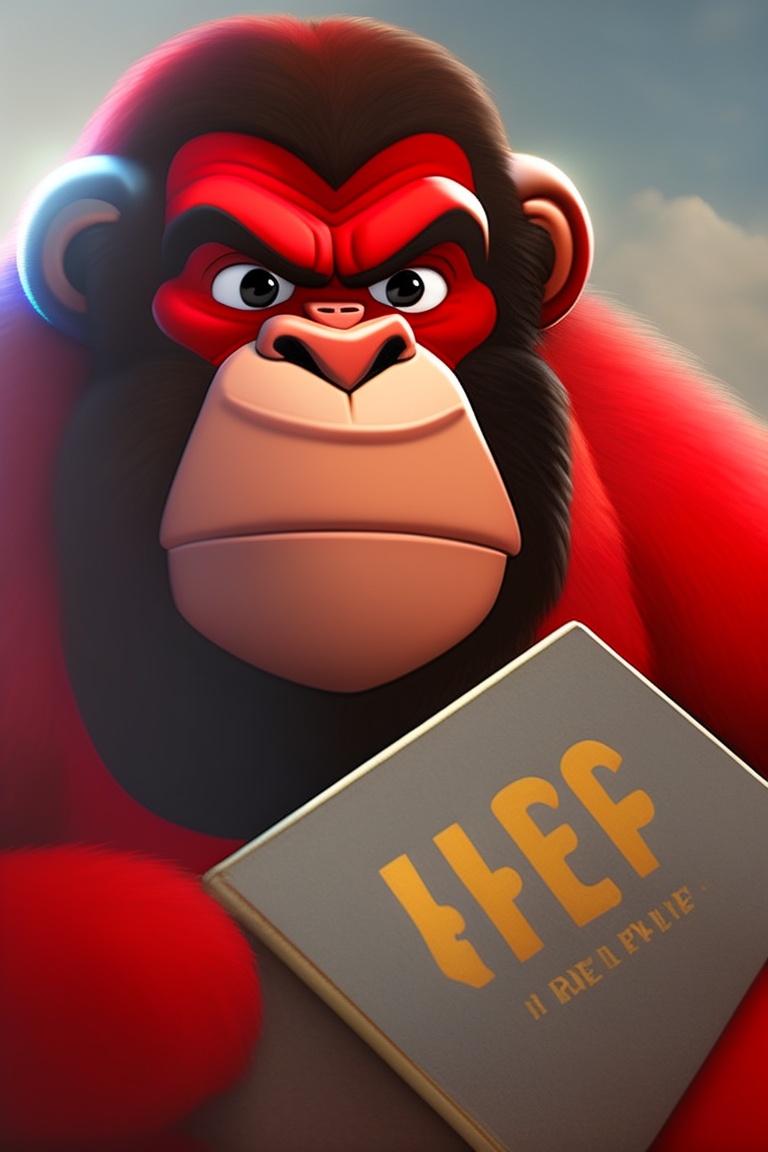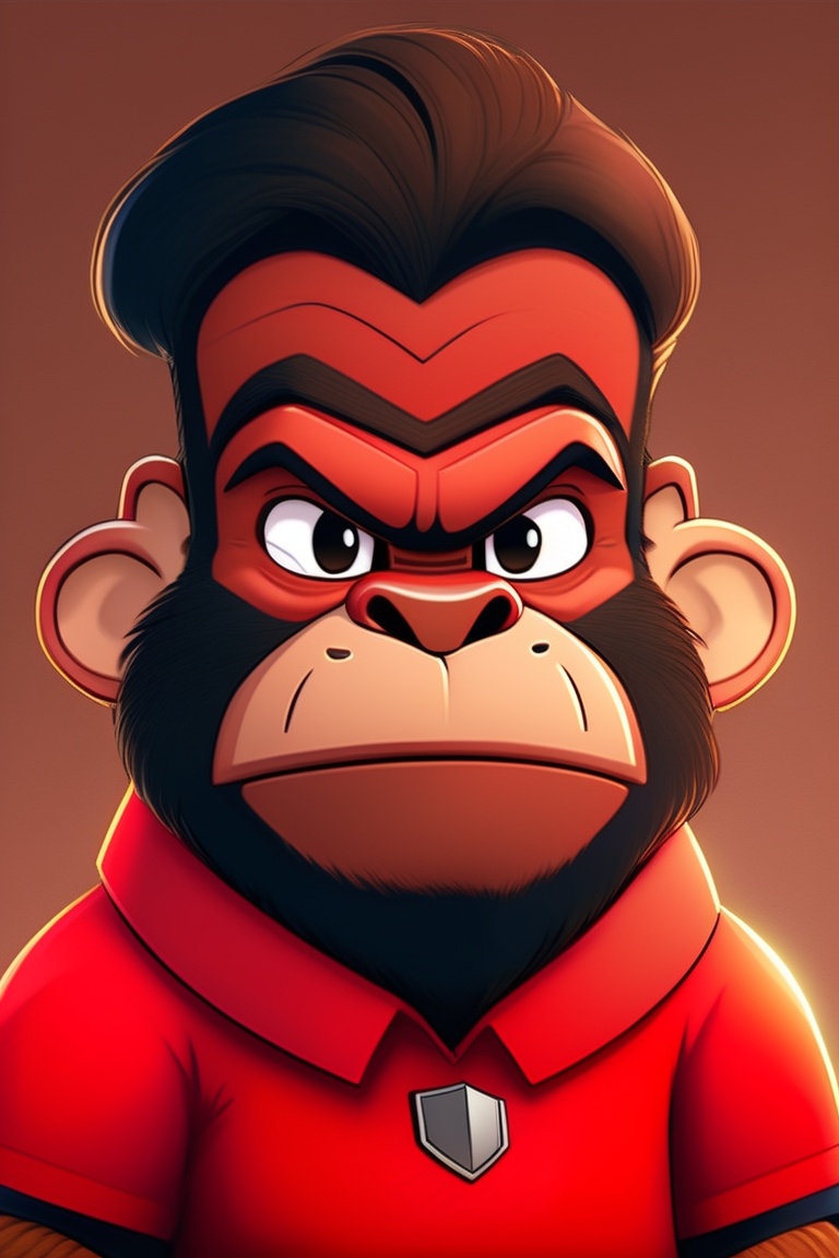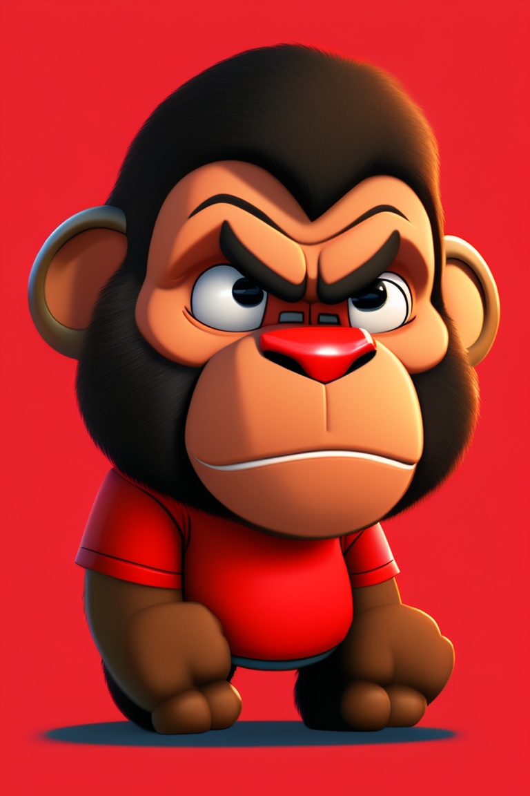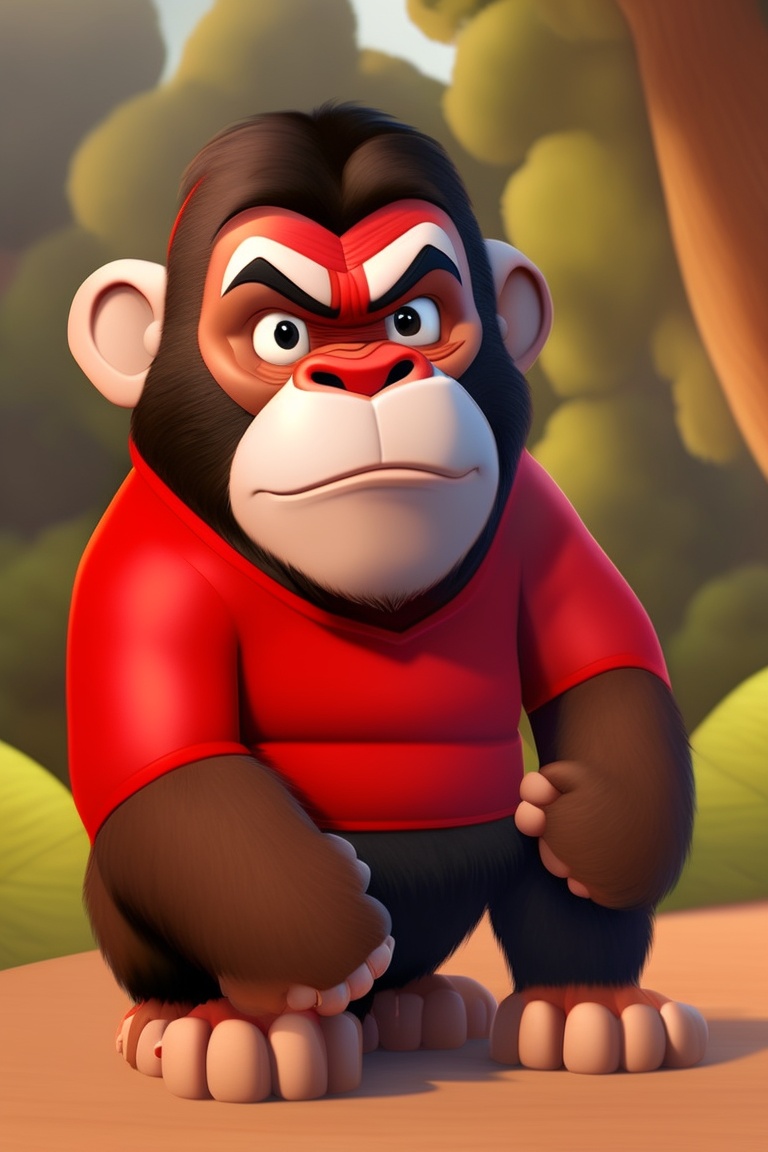 Grumpy ape buddy description: a happy bored ape with glum black hair, wearing a red t-shirt. he brings cheer to the main character, despite his grumpy appearance. background: cinematic setting with a captivating backdrop. personality: mischevious and joyous, grumpy ape buddy surprises with bursts of energy and infectious laughter. interactions: provides assistance, comic relief, and displays loyalty and friendship.