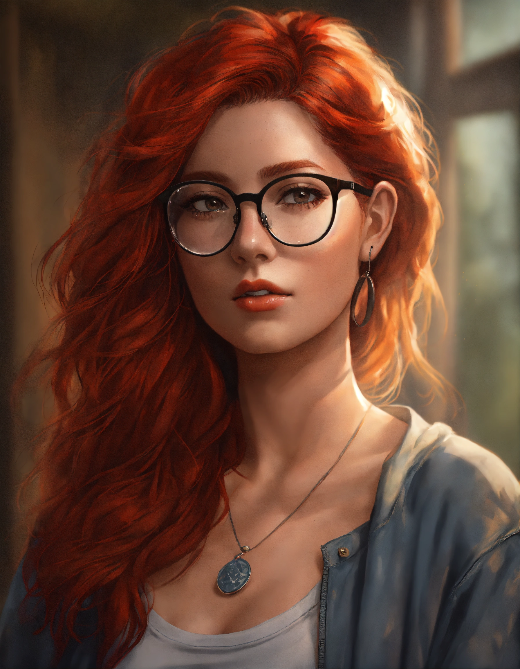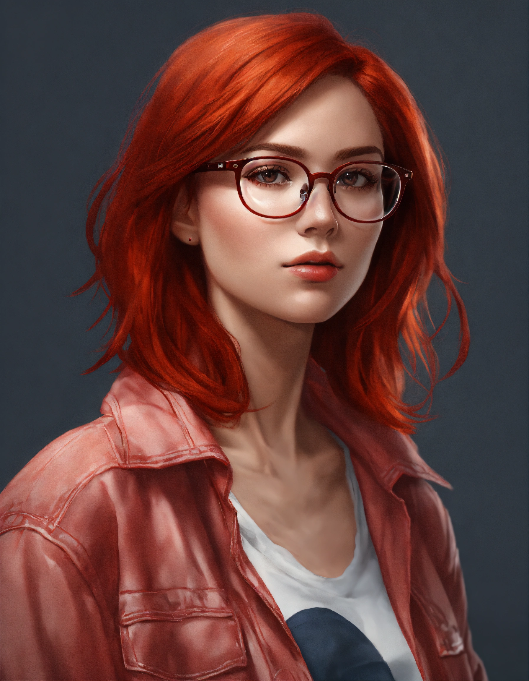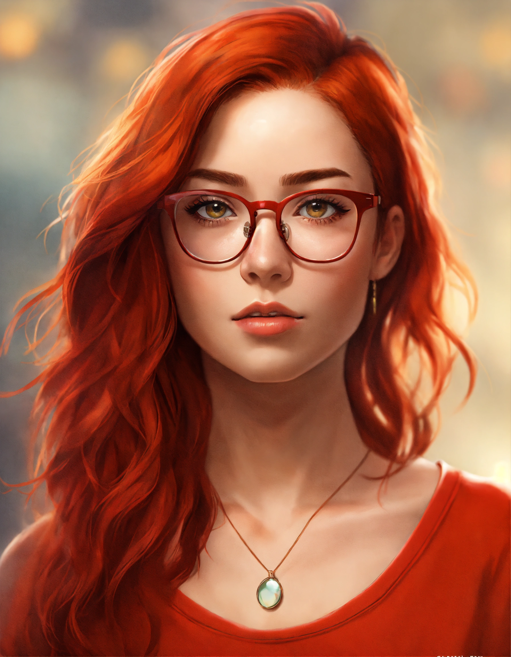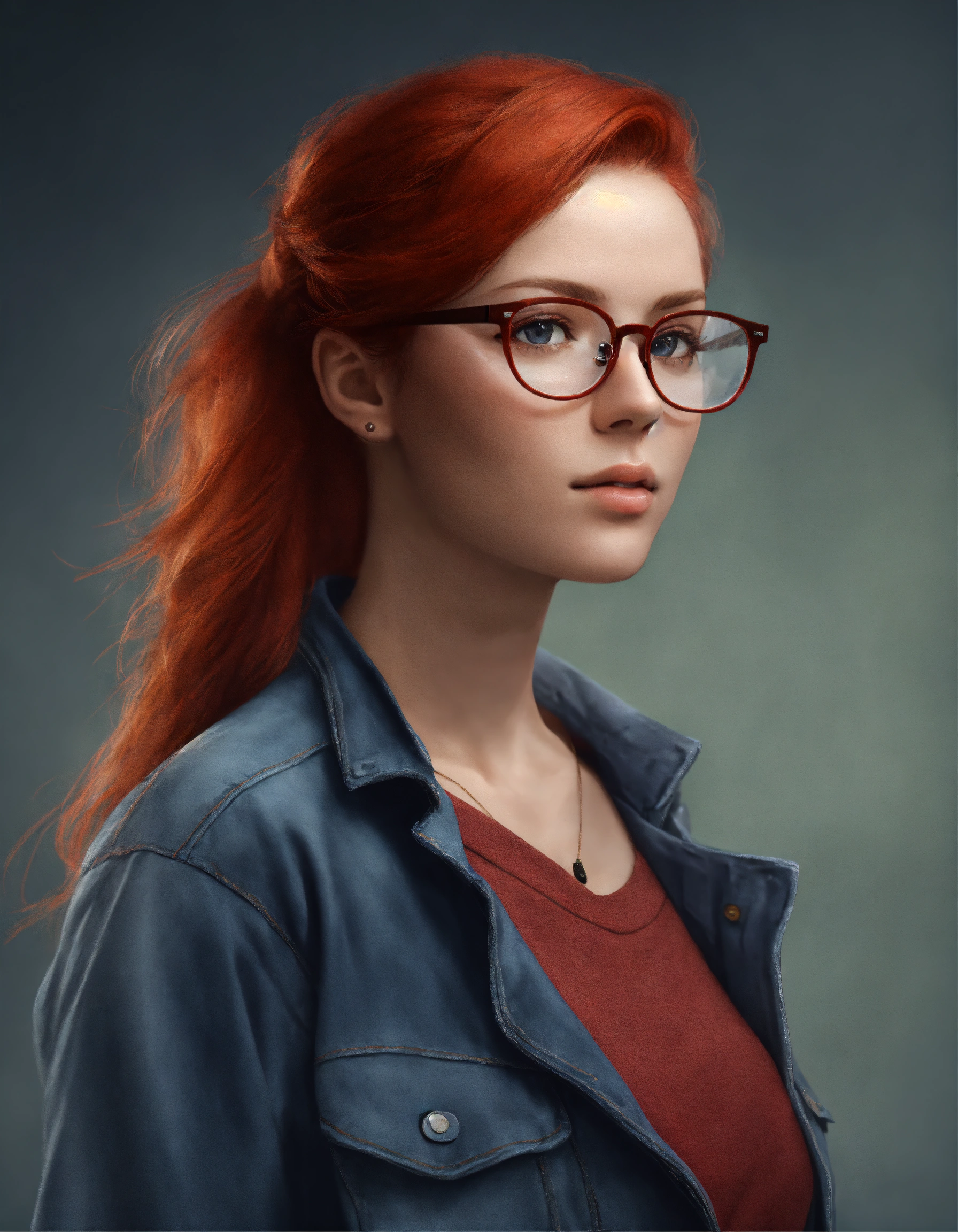 Female torso portrait avatar, with red hair wearing modern reading glasses, casual clothes, age 28, in photo realistic modern style, looking straight on
