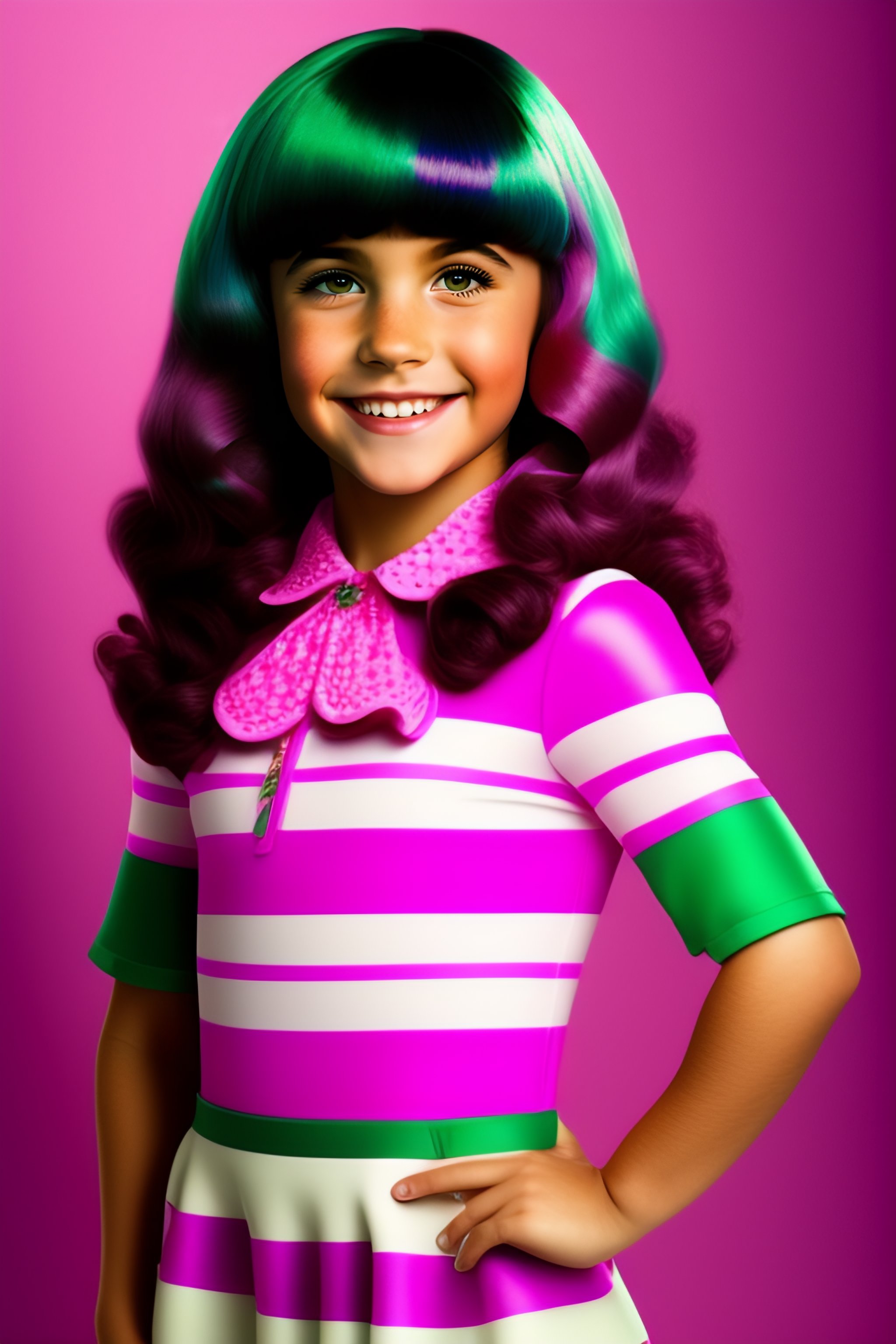 Julianna rose mauriello as stephanie from lazytown pink hair with bangs, full round face, green eyes, medium skin tone smiling softly, wearing casual pink dress with lighter pink stripes and wearing pink tights