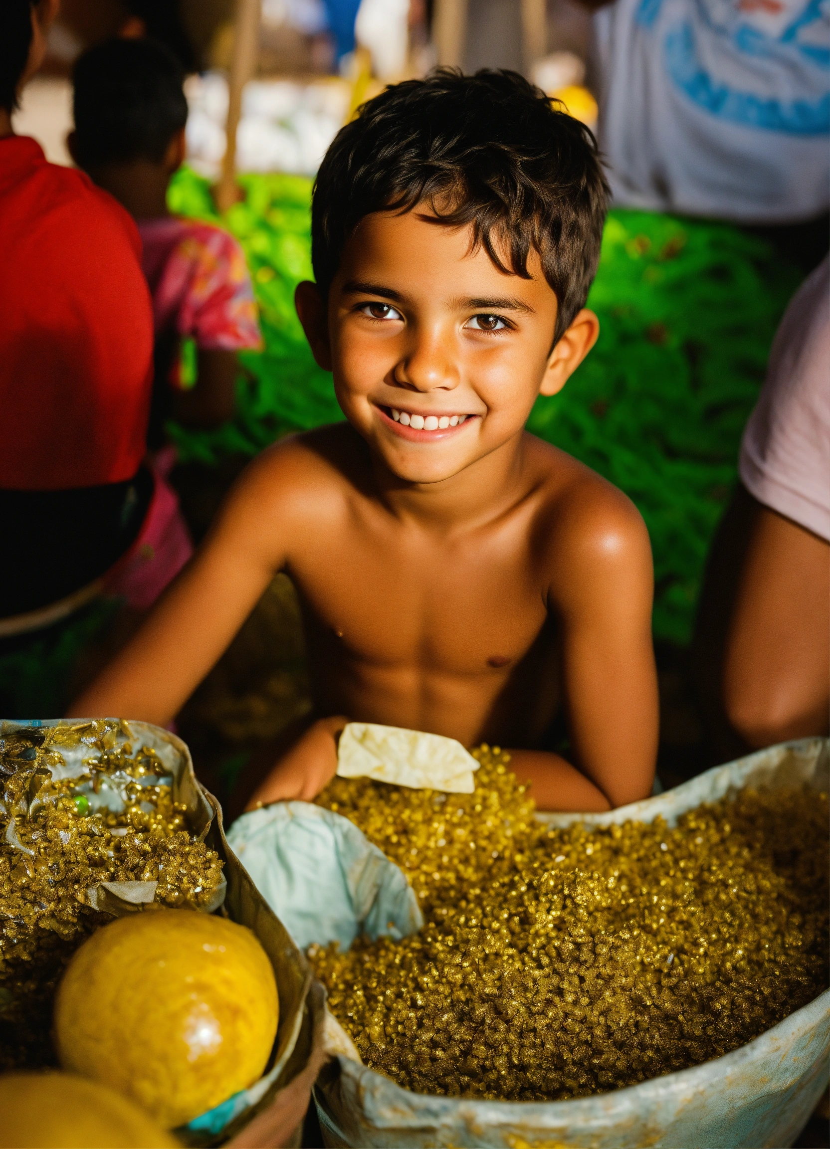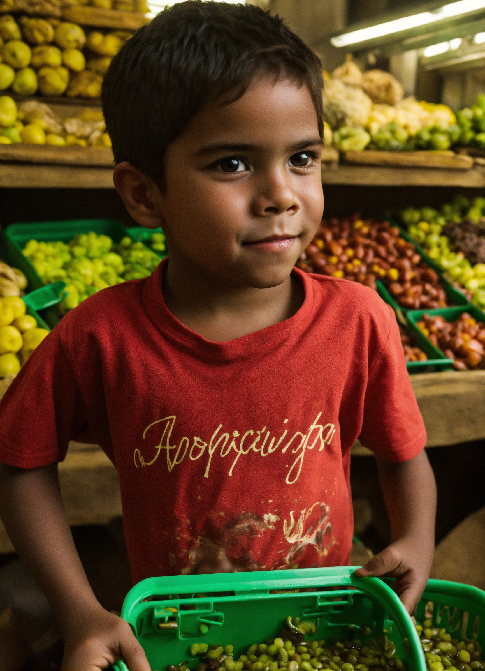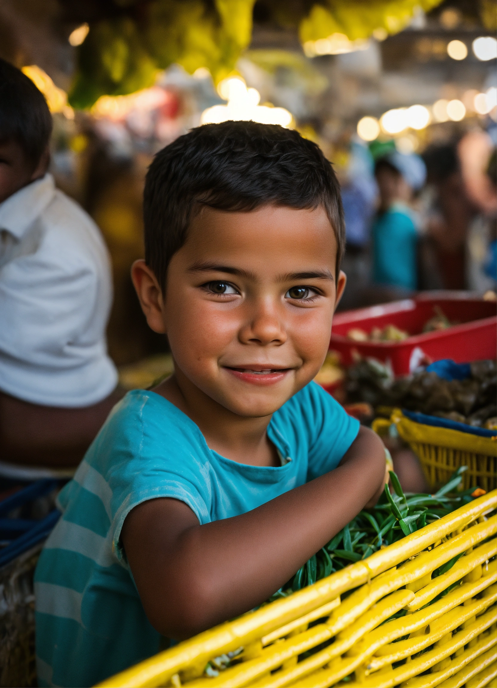 Menino de aproximadamente 8 anos, sorrindo, segurando um cofrinho tipo porquinho, de óculos, em uma mercado