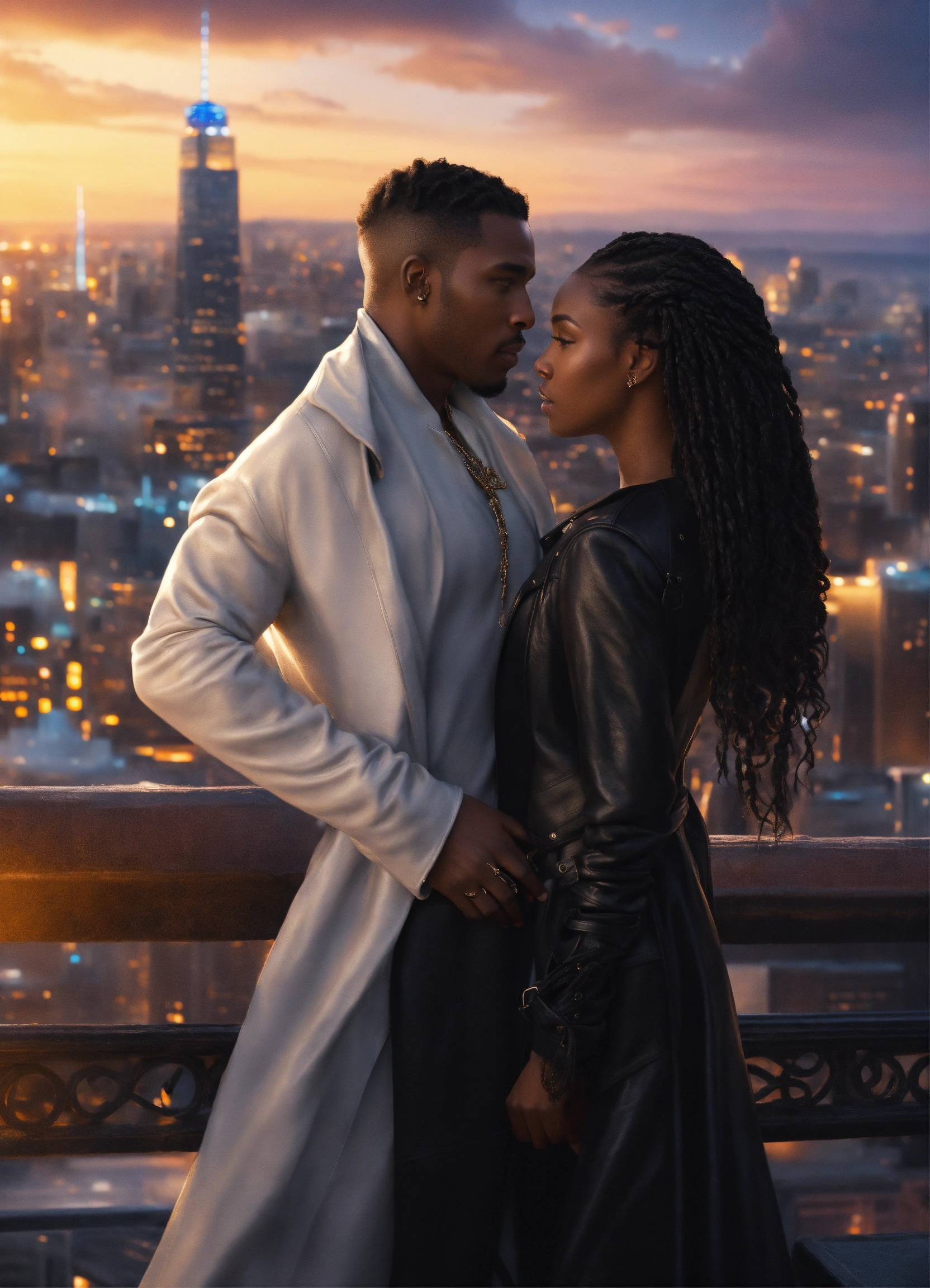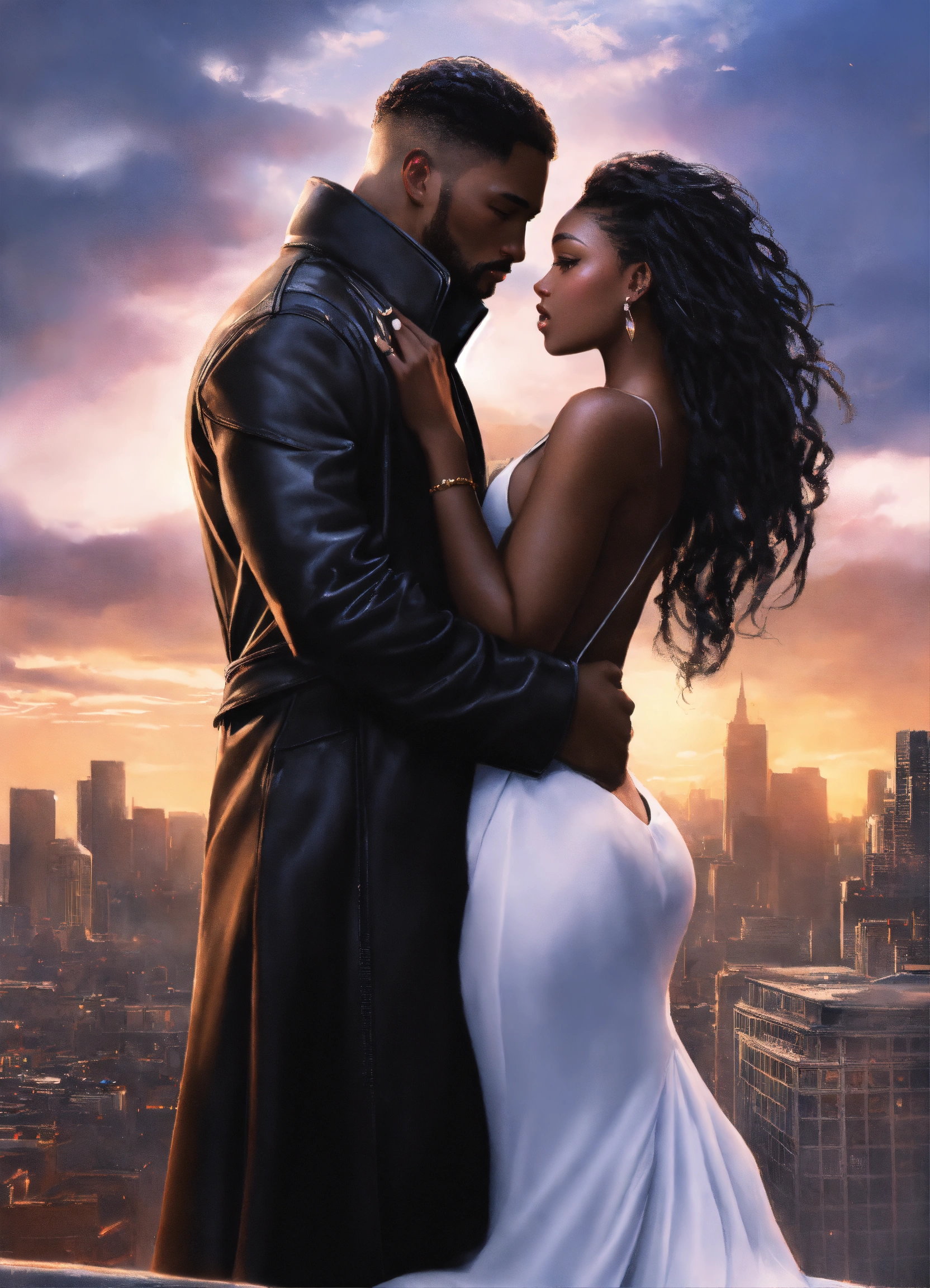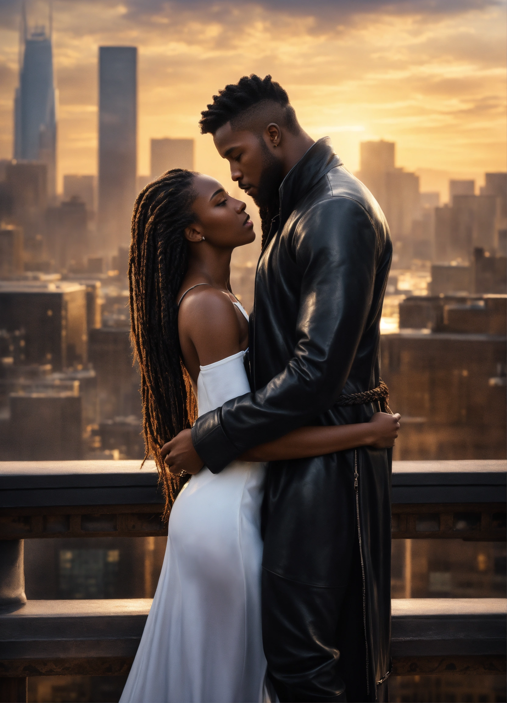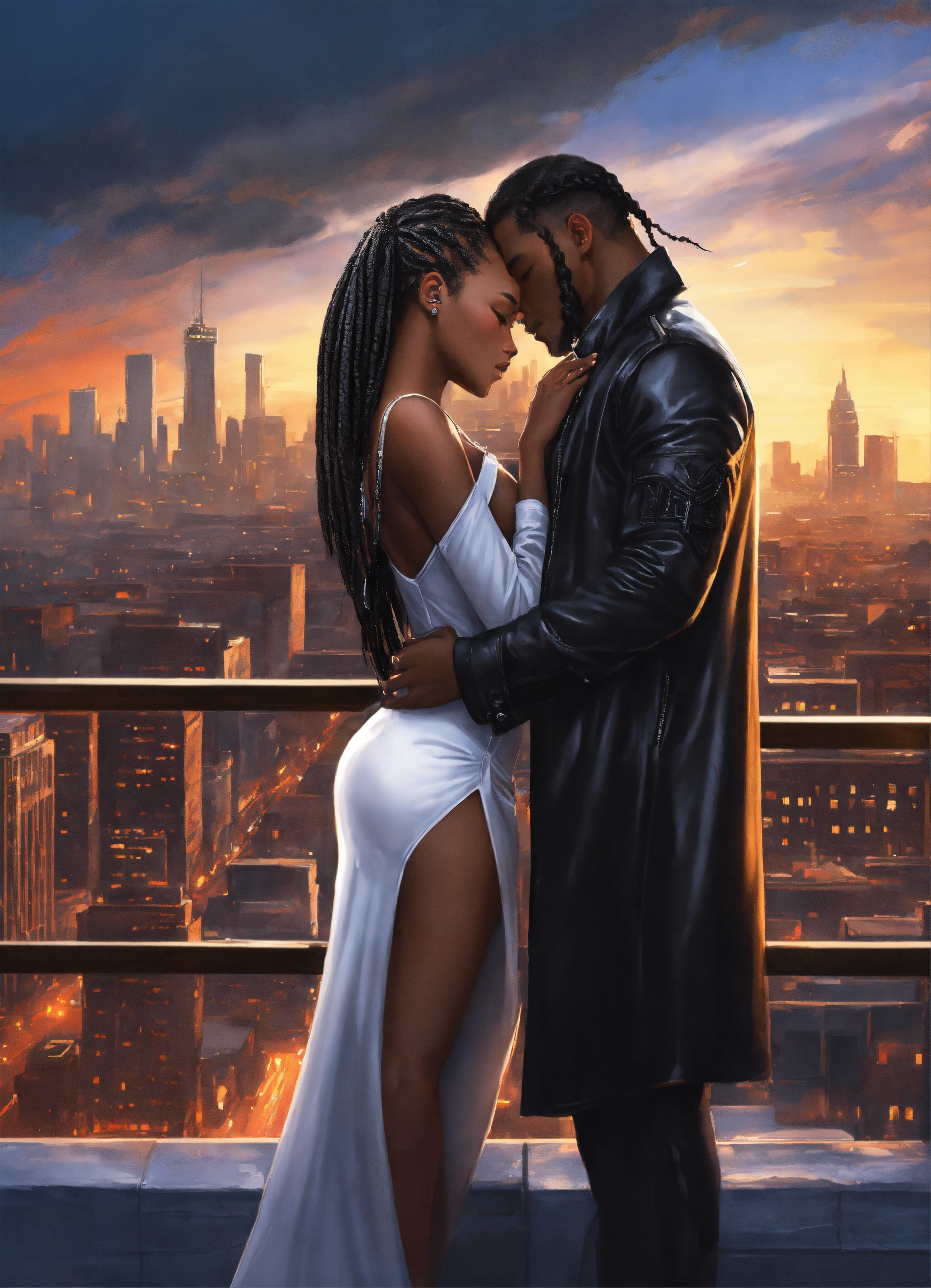A strong black man with short hair wearing a long black leather coat and all black clothes embracing a beautiful black woman with long braided flowing hair, long braided hair, flowing hair, wearing a white dress, on romantic rooftop towering above the city skyline, fantasy, high detail, realistic photo, high detail, digital painting, cinematic, stunning, hyper-realistic, sharp focus, high resolution 8k, insanely detailed