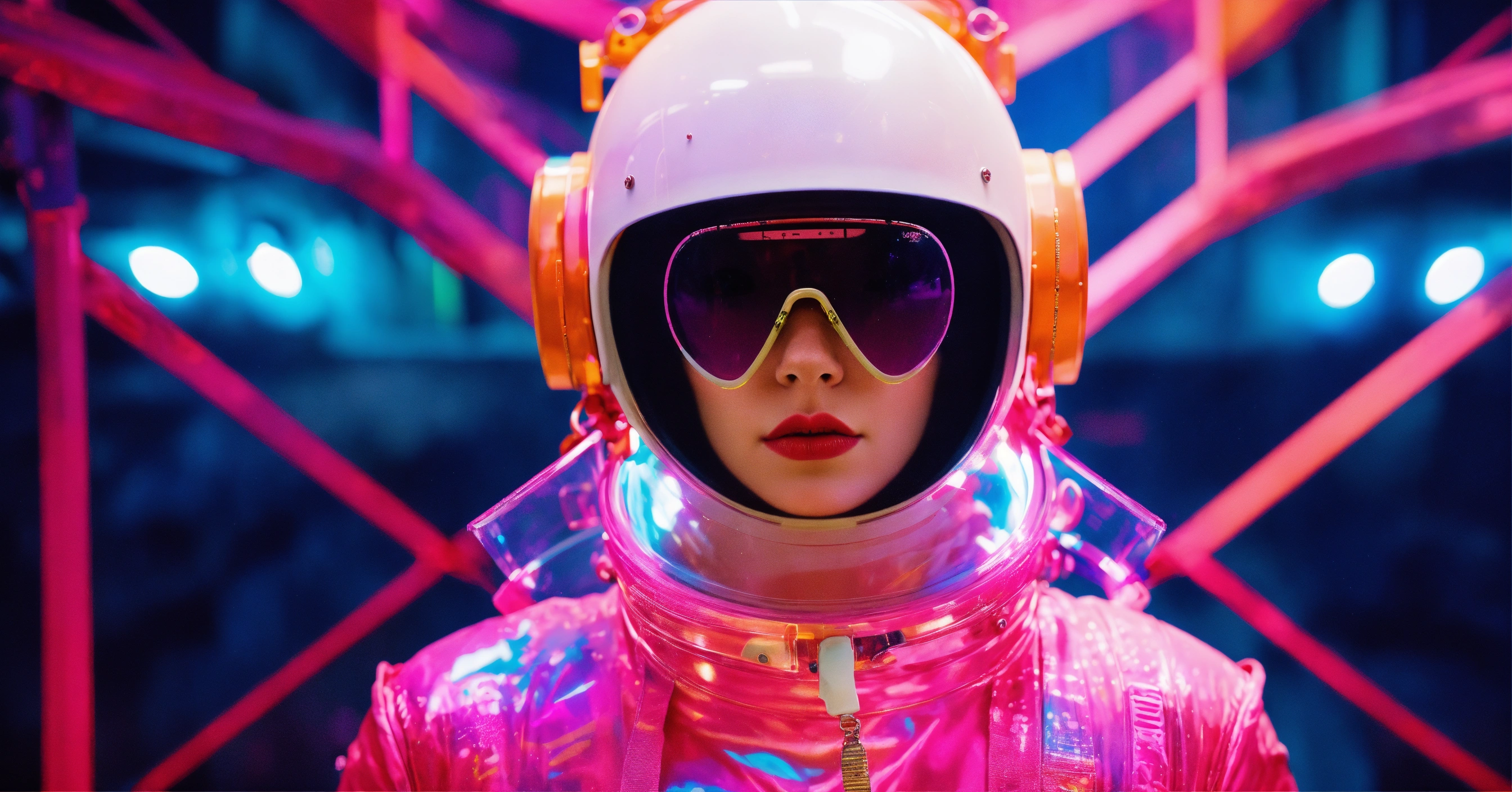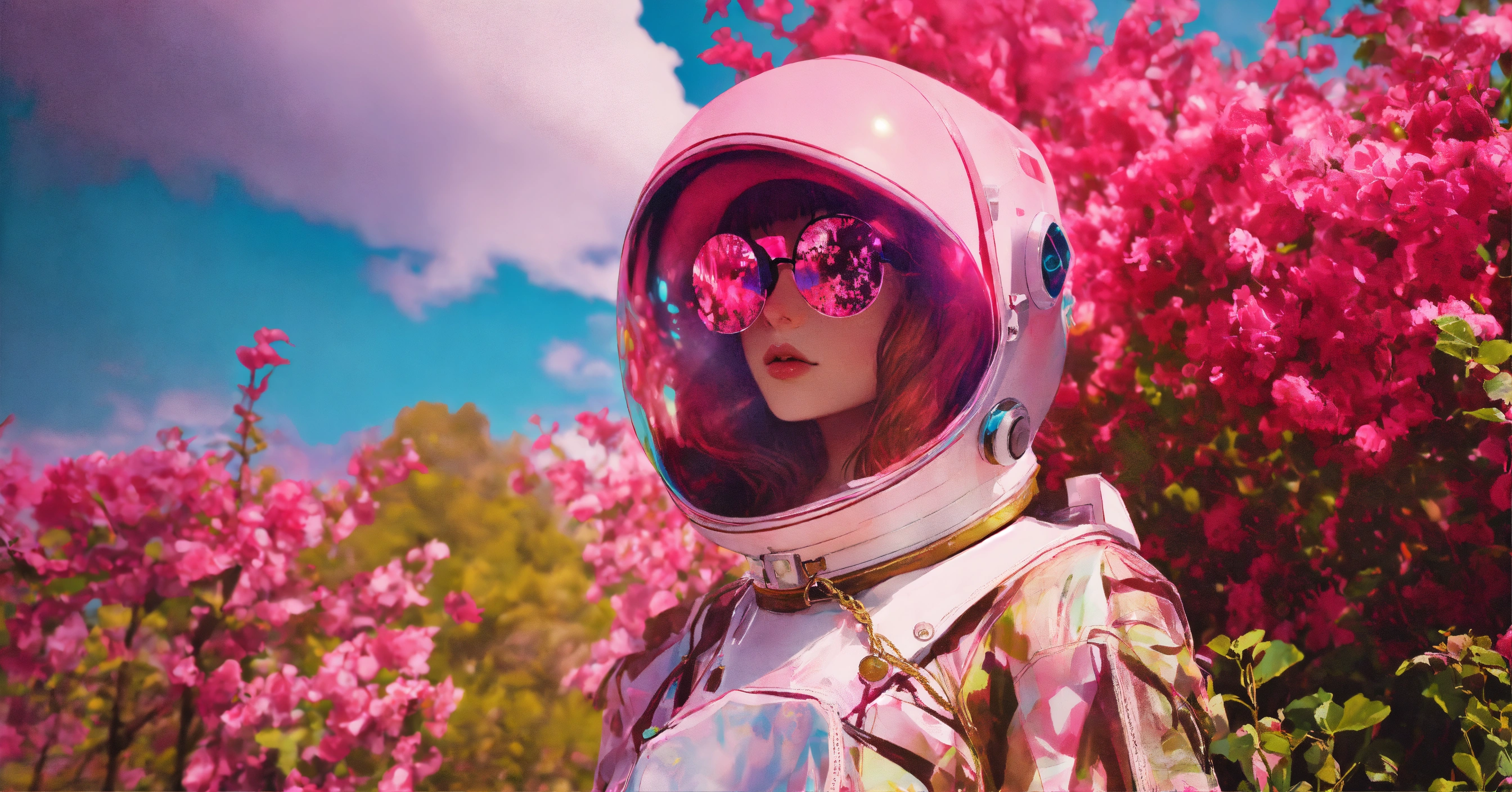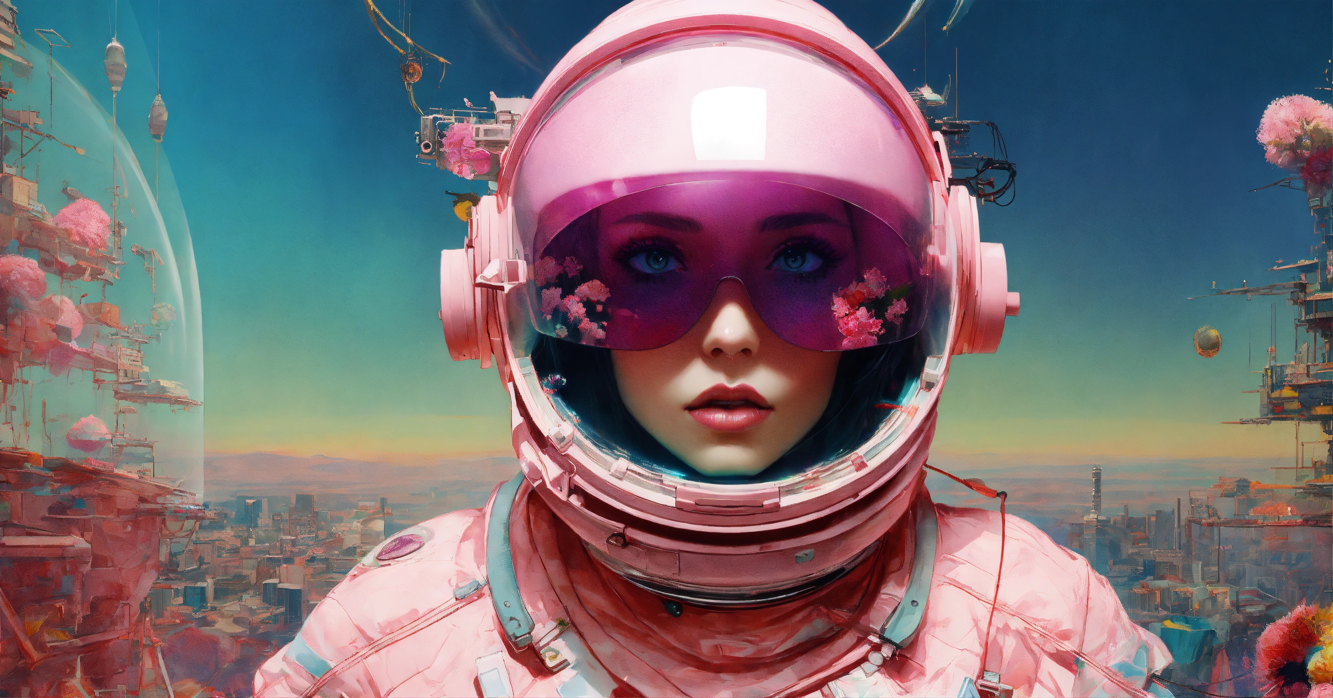 Artwork of standing in front of an irradiant structure, a cyberpunk woman in white and pink spacesuit with large plexiglass helmet and large sunglasses, art by victor moscoso and bridget riley kodak ektar 100 8k, make it magical by carne griffiths fluid art, conrad roset ilya kuvshinov, mark fielding, zwy studio high lights in eyes, salt. art by sergio lopez, natalie shau.