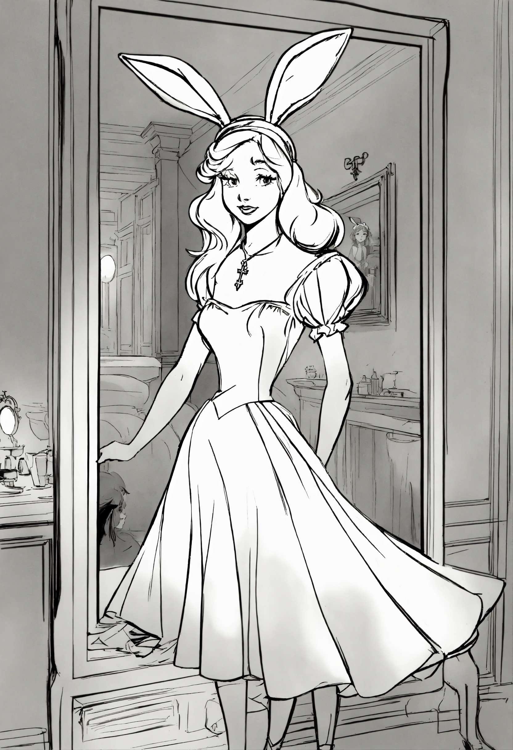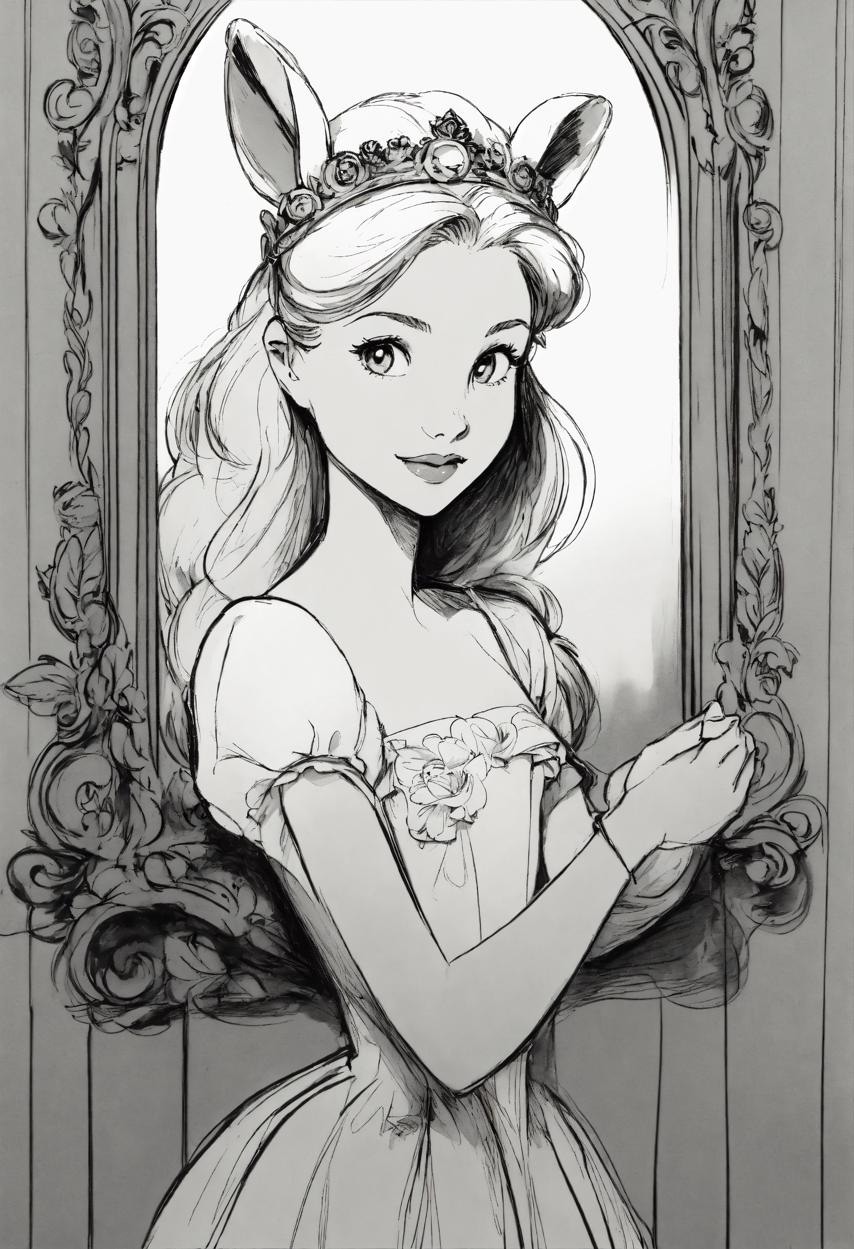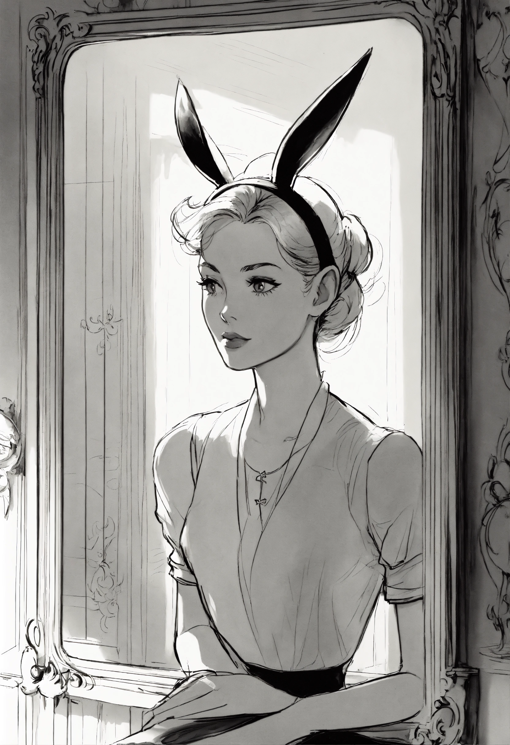 Victorian blonde with rabbit ear headband crosses her hand in front of the mirror. black and white illustration by glen keane, disney 1990