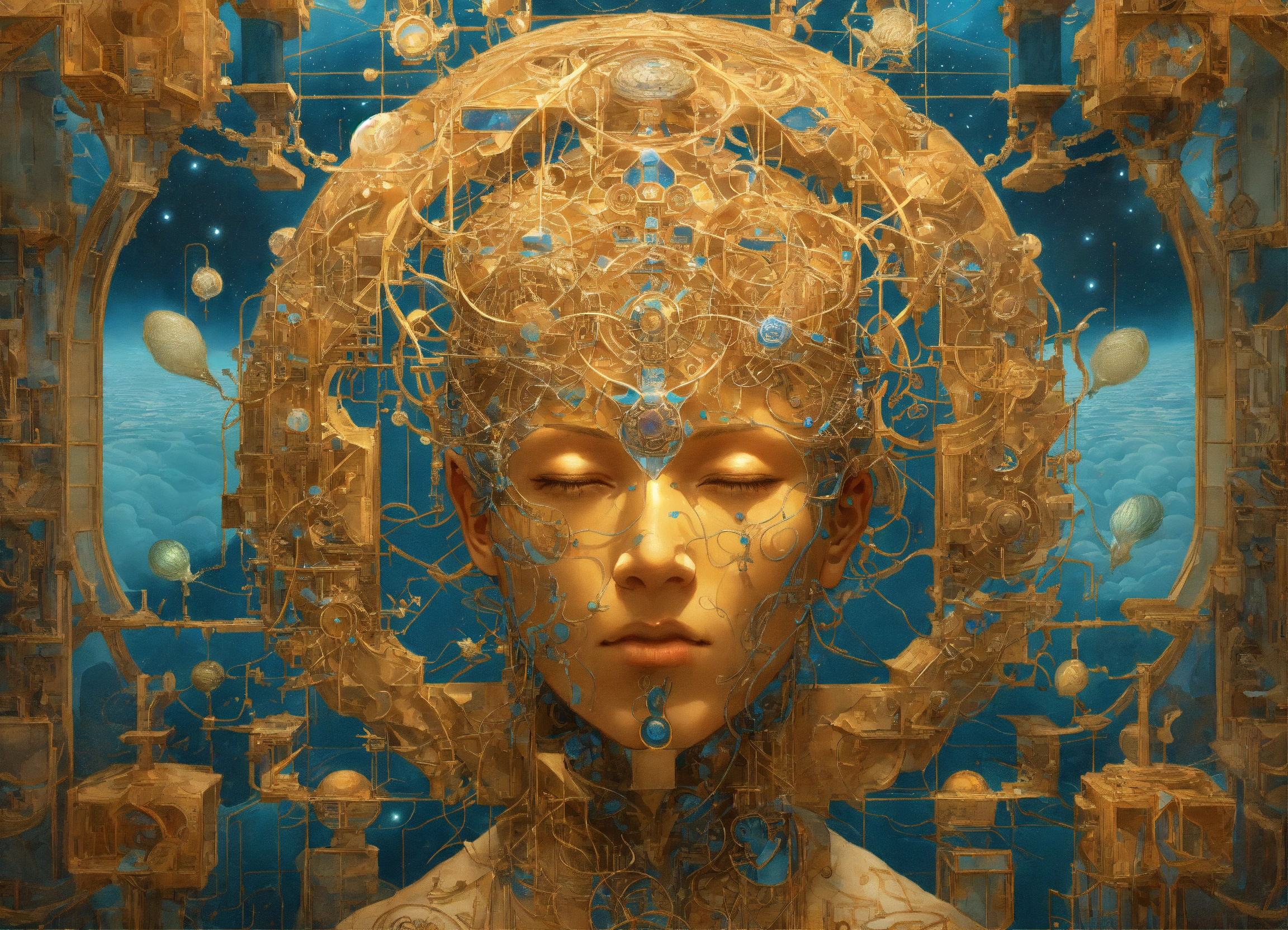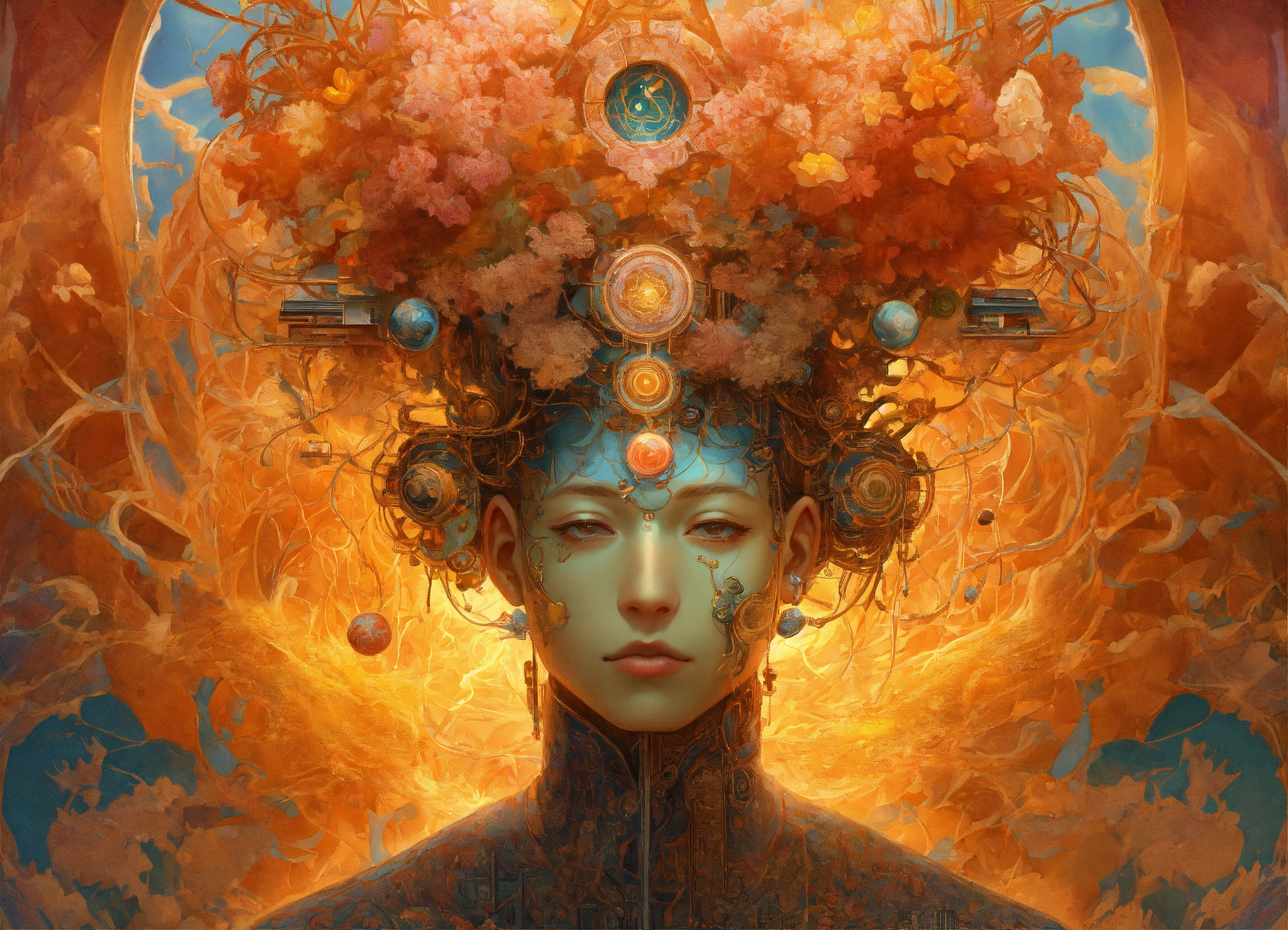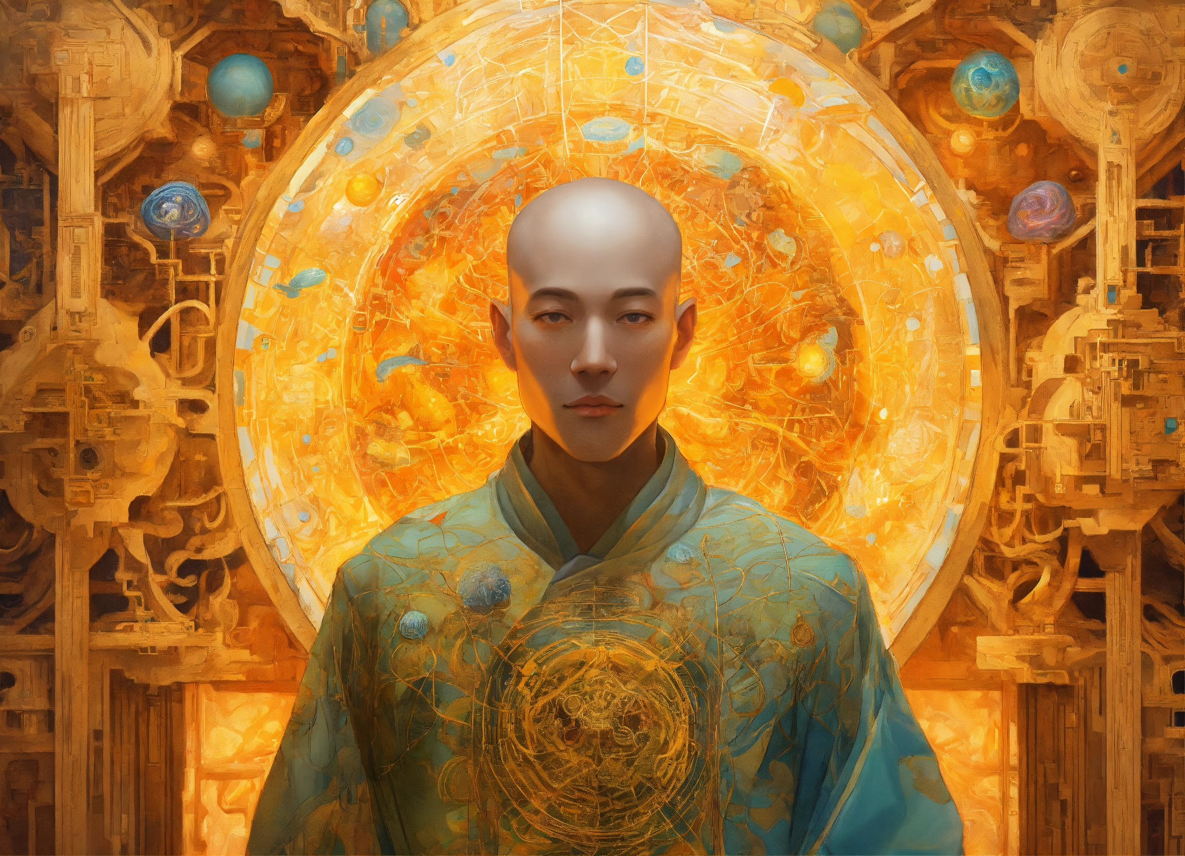 Taoist male monk tesseract body fractal three point perspective hypercube mirror zen face brain mayan mantis jellyfish face, synapses and circuits, fractalism, an ultrafine detailed painting by james jean, octopath traveler, behance contest winner, vanitas, angular, alter modern, surreal, fractalism as a metaphor referring to the constantly changing creative processes of the universe that constitute whatever exists, both mind and body, ideal and material, ...