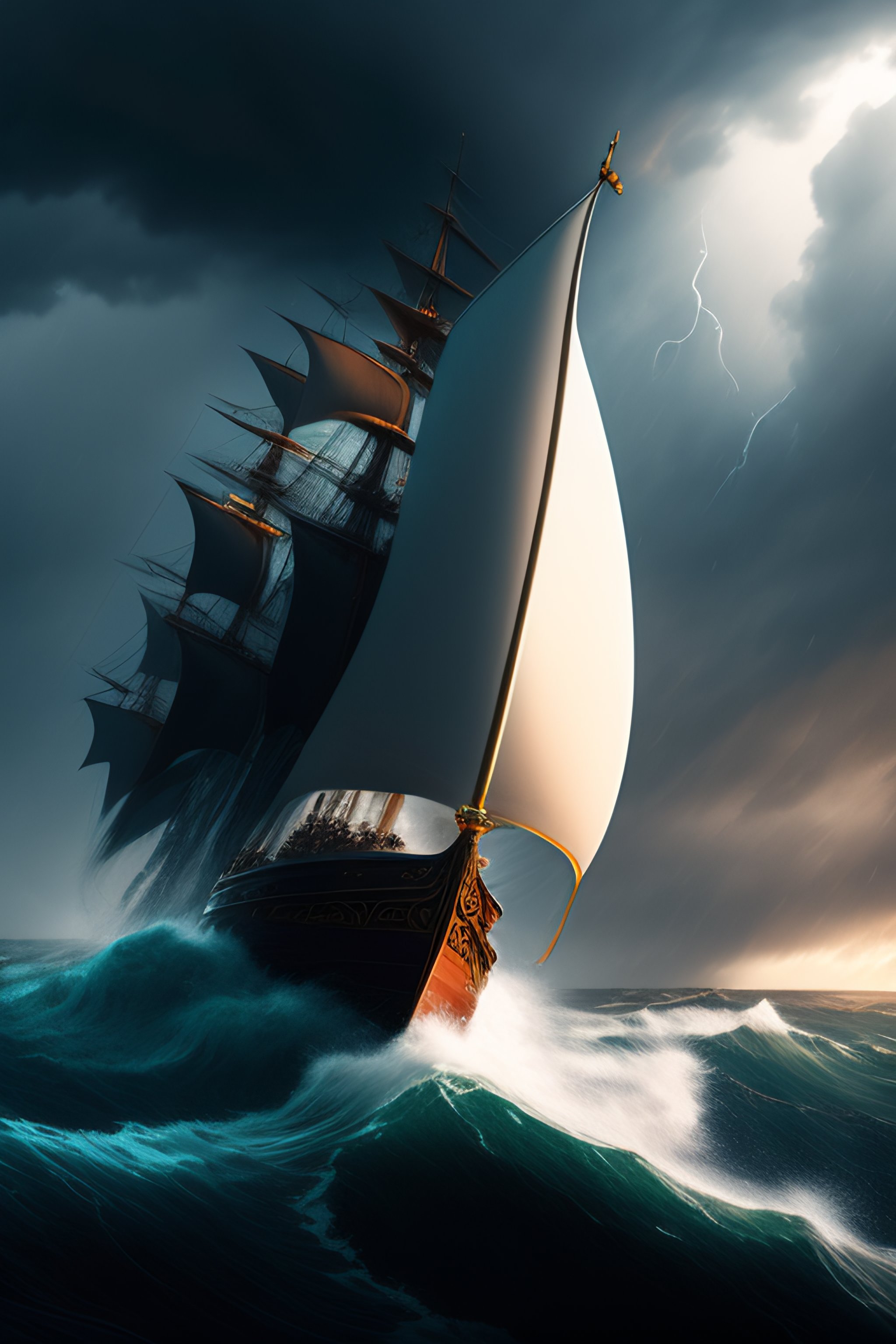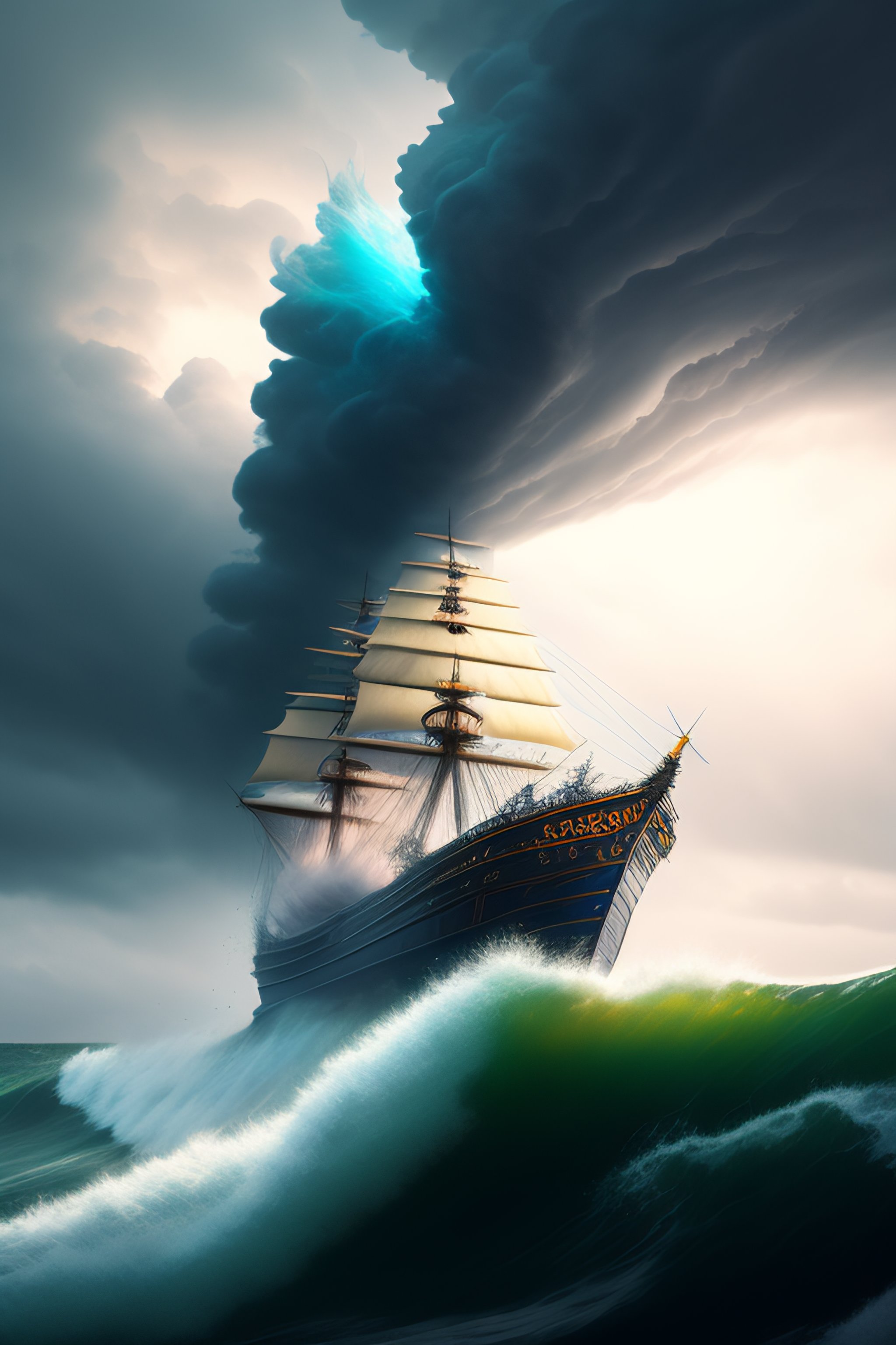 A highly detailed masterpiece of a giant sea monster attacking a ship in the stormy seas, lightening, waves, dynamic lighting, photorealistic, trending on art station, stunning visuals, creative, cinematic, ultra detailed, atmospherical, ambient lighting, scary art, by greg rutkowski, wide angle environment shot