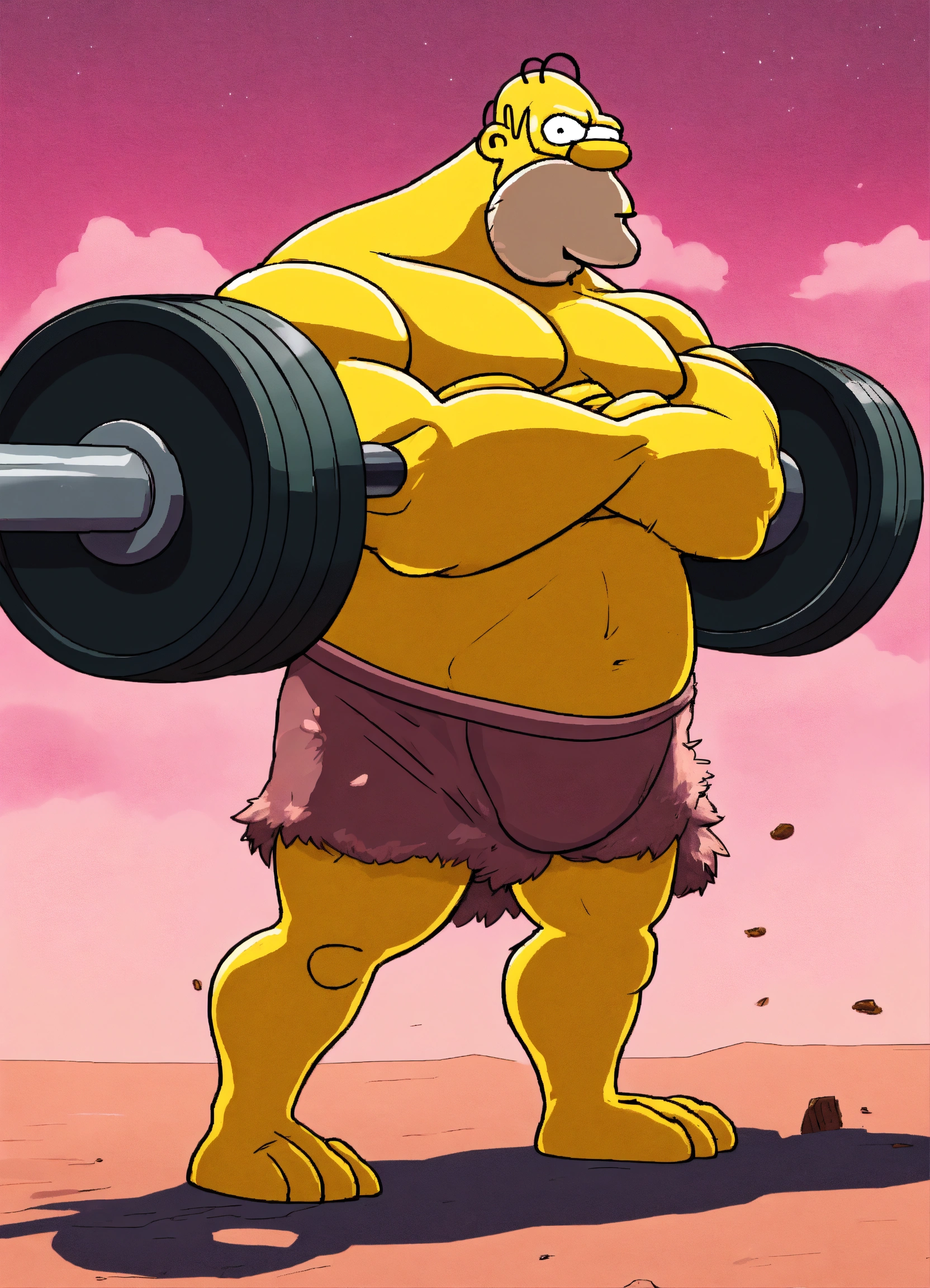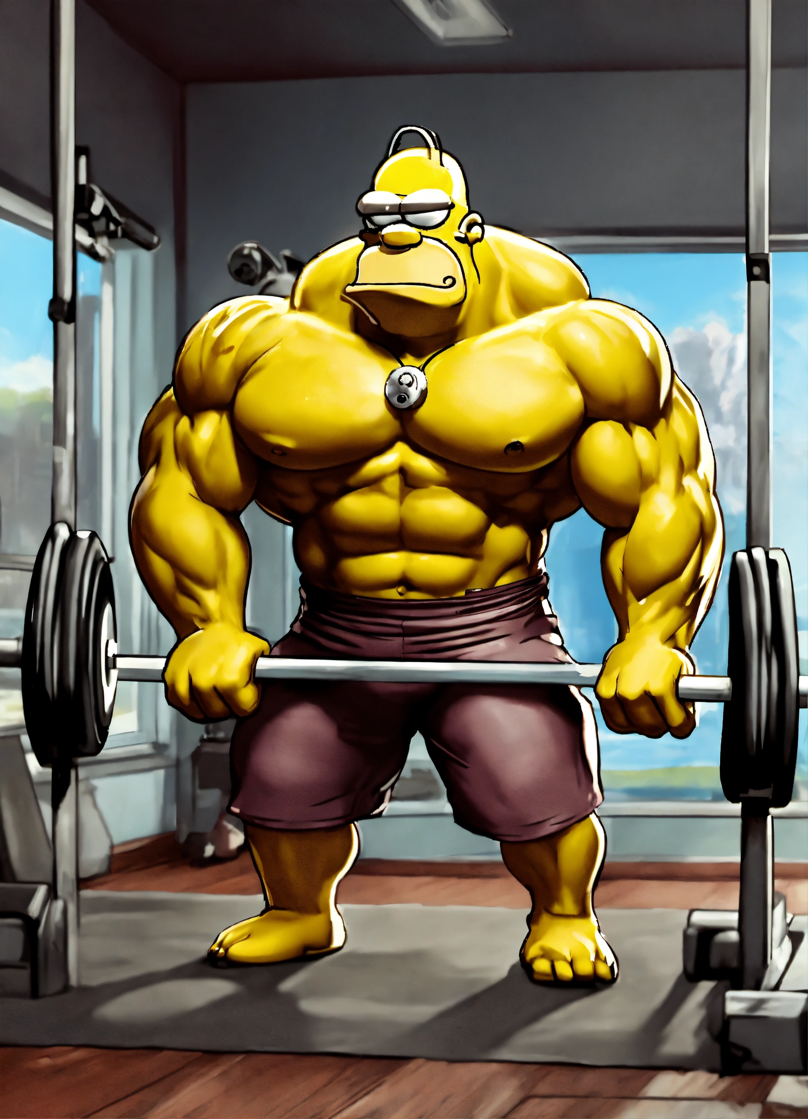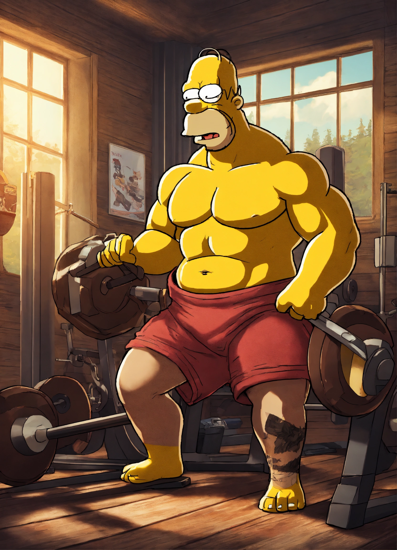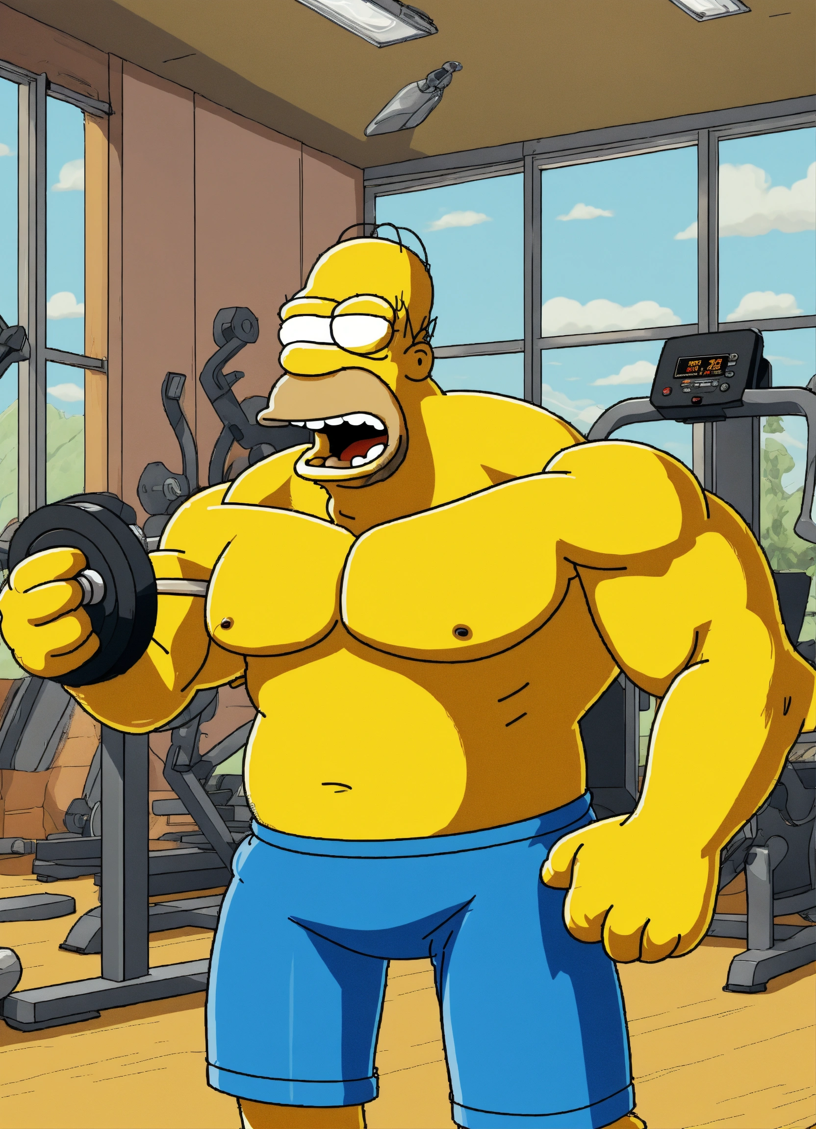 Humoristic homer simpson mixed wild boar doing bodybuilding, amazing high tech fitness room digital illustration