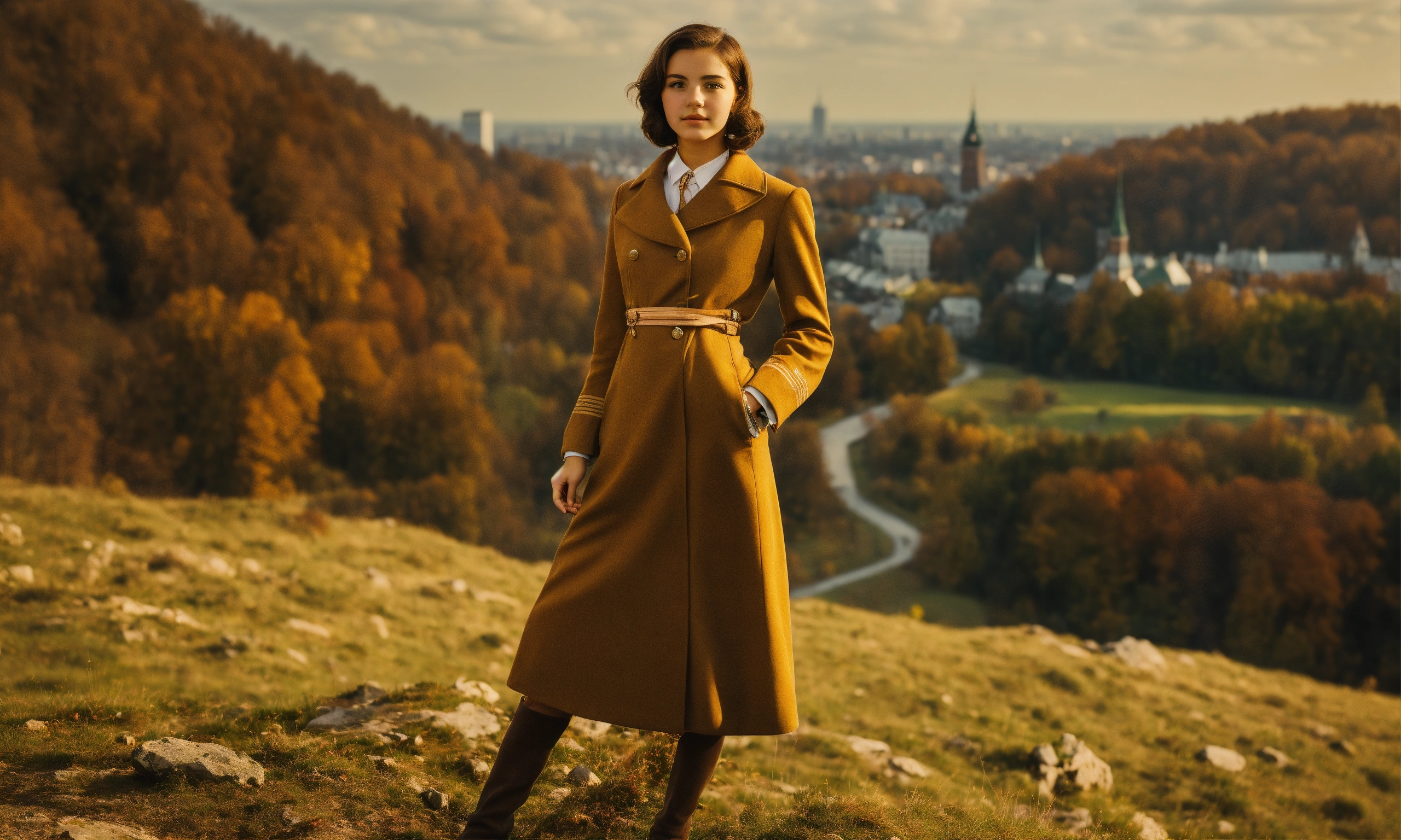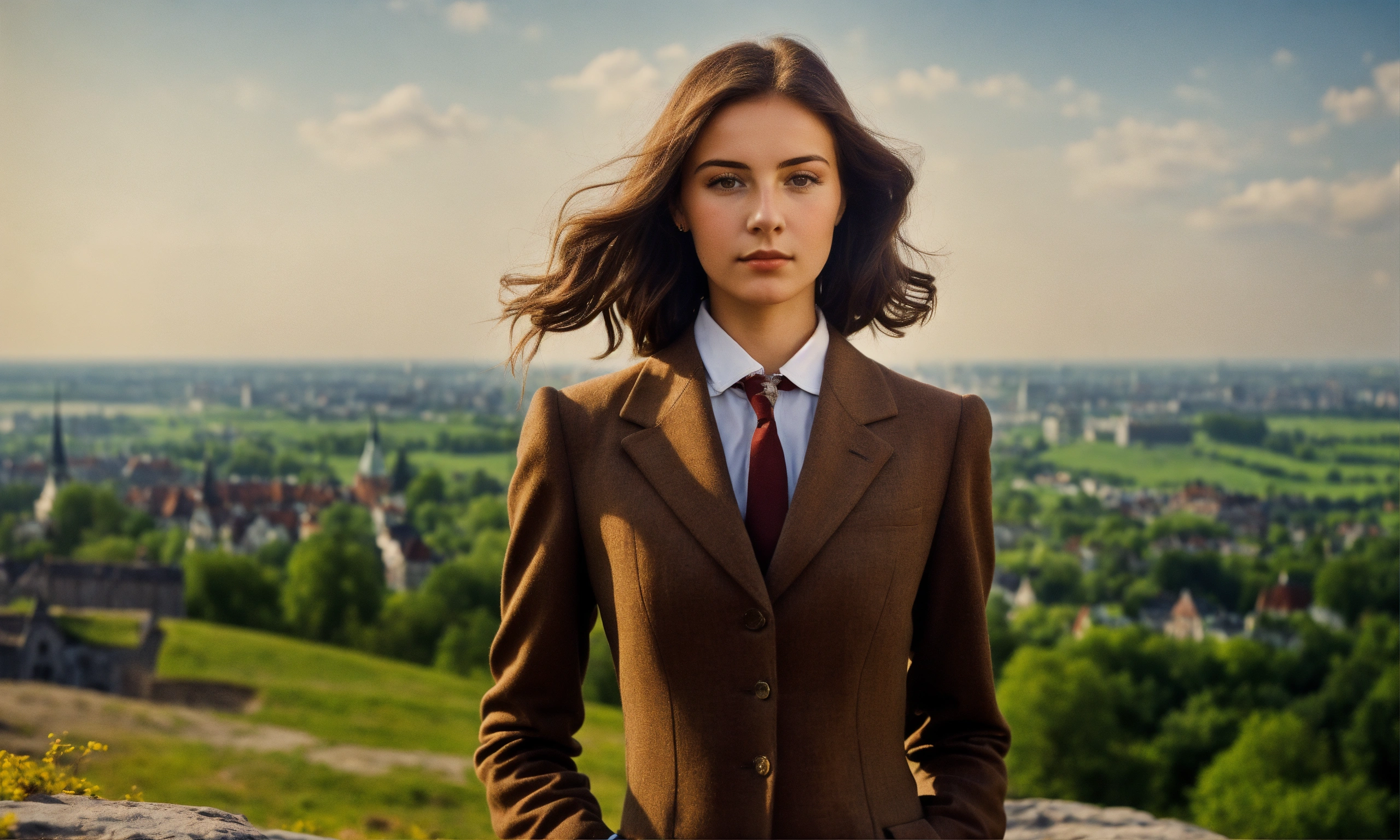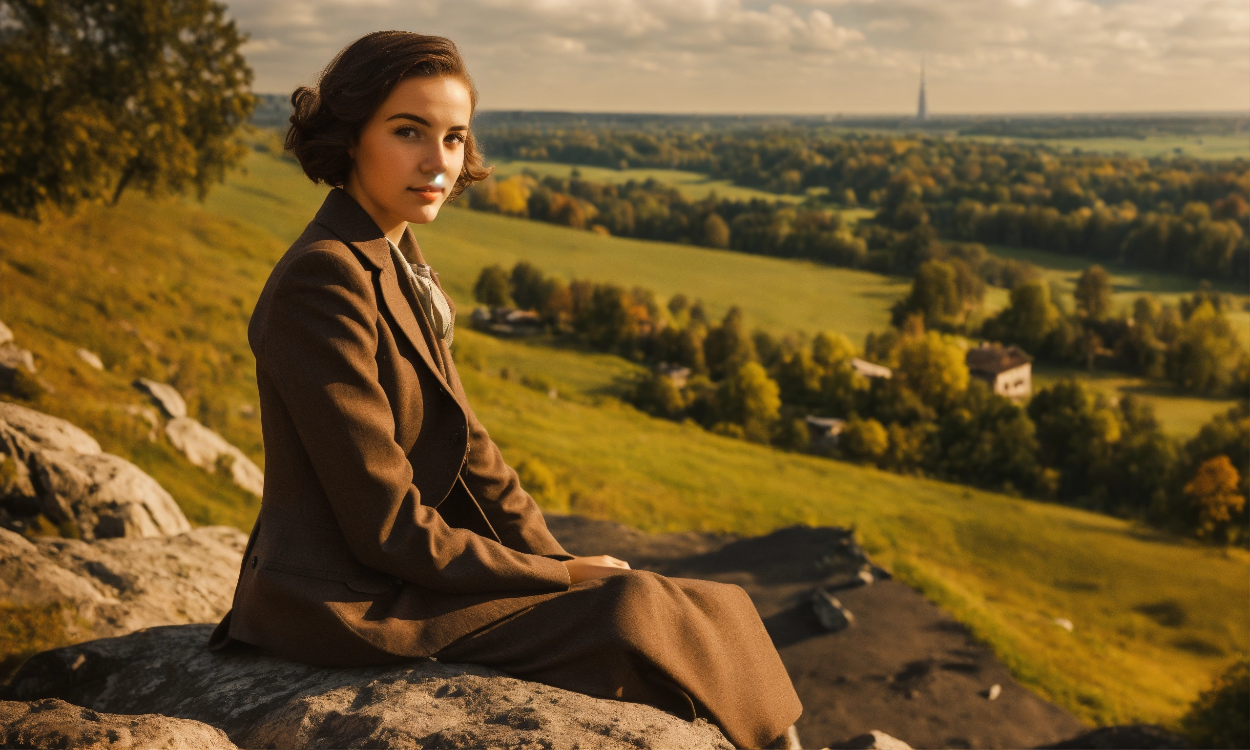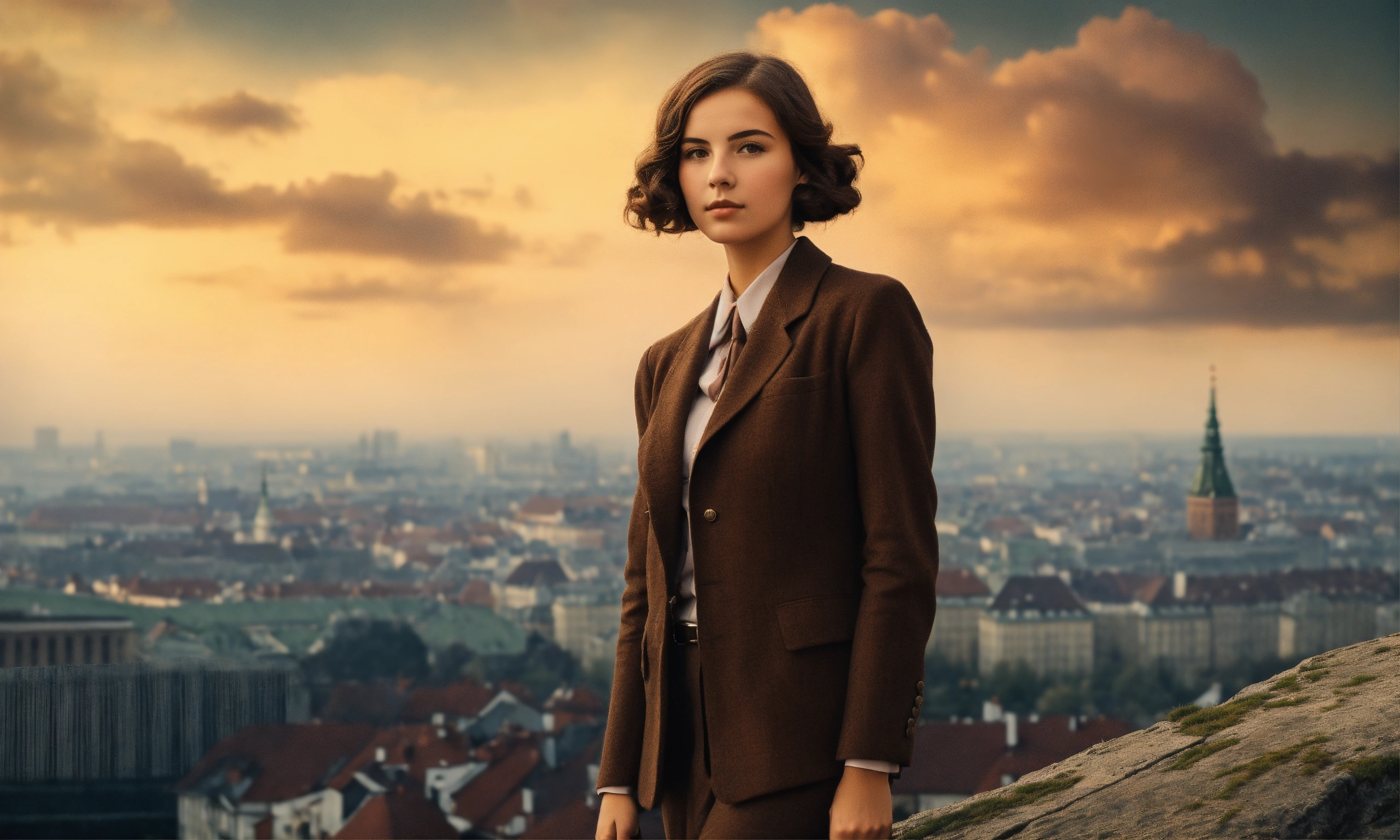 Warszawa 1920-1930, europian brunette girl age 20, on top of a mountain, looks at the camera at full height, bald, modern style suit. brown hair.