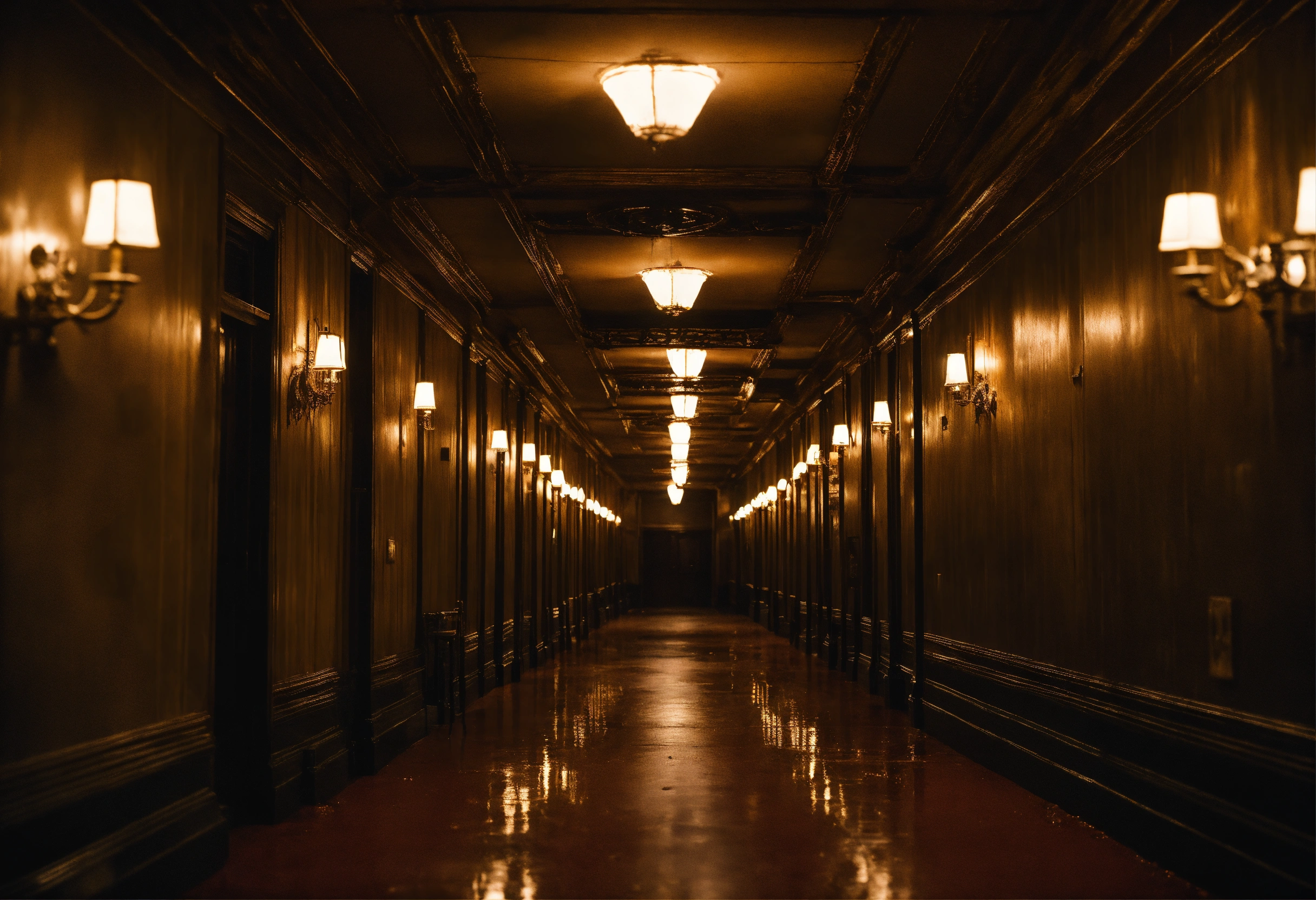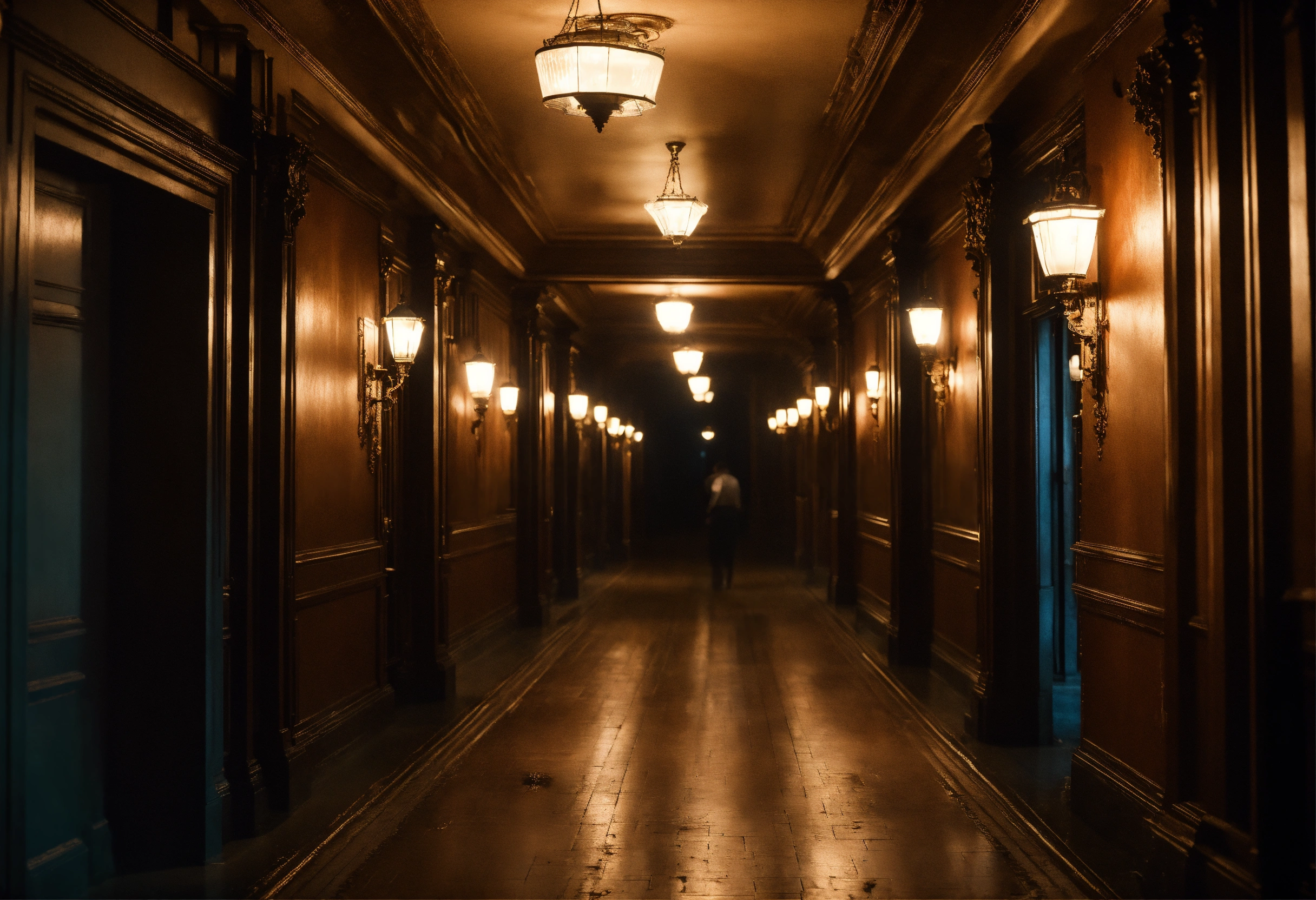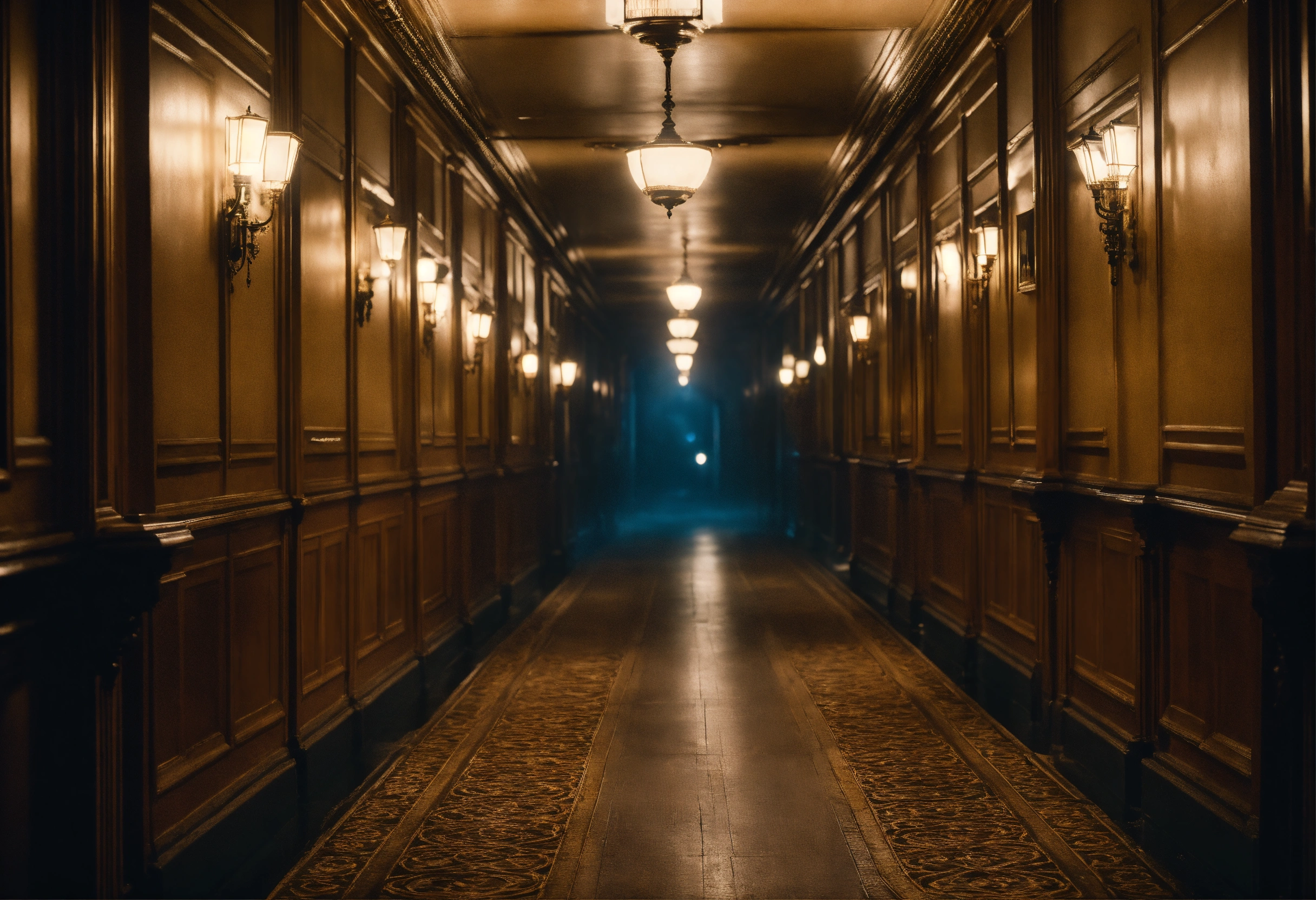 (extreme long shot), one day in the scary hallway of the titanic, damp ground. dark, dim, soft, moody lighting, cinematic photo, focus, film, professional, 4k, highly detailed, (at night)