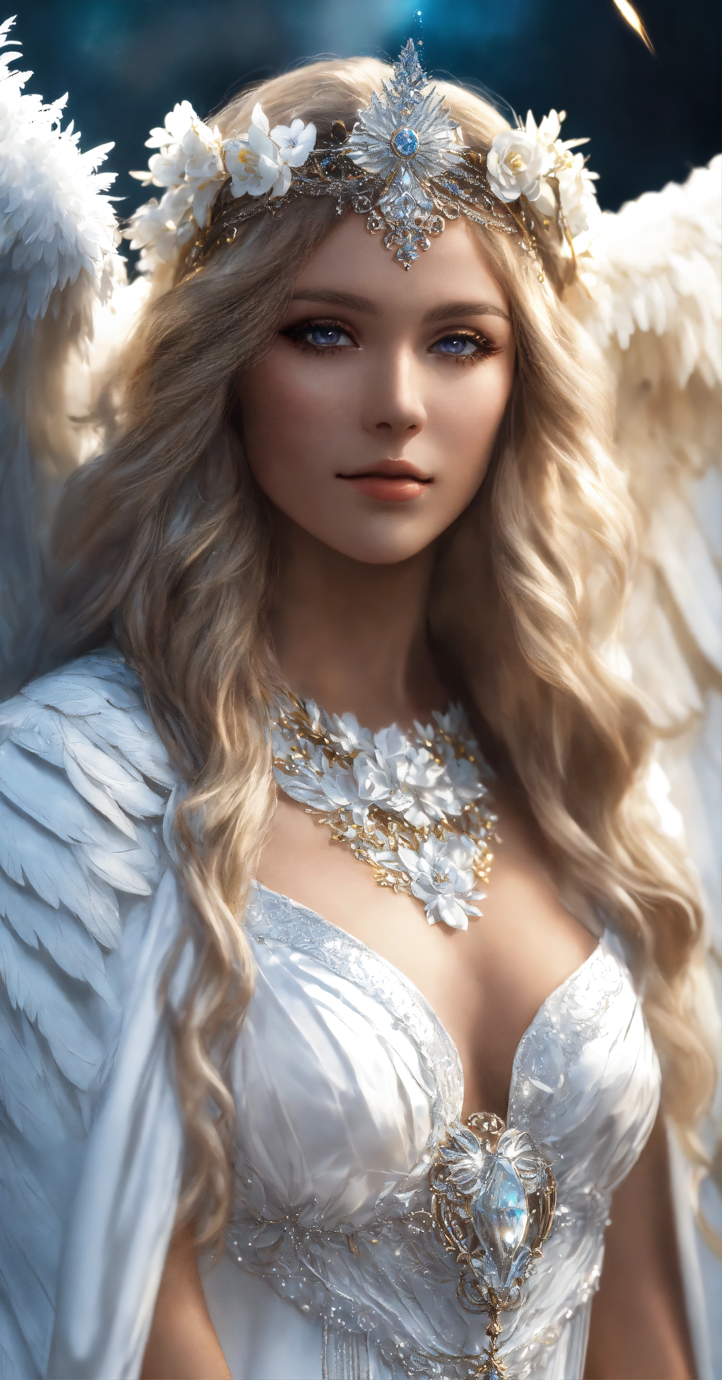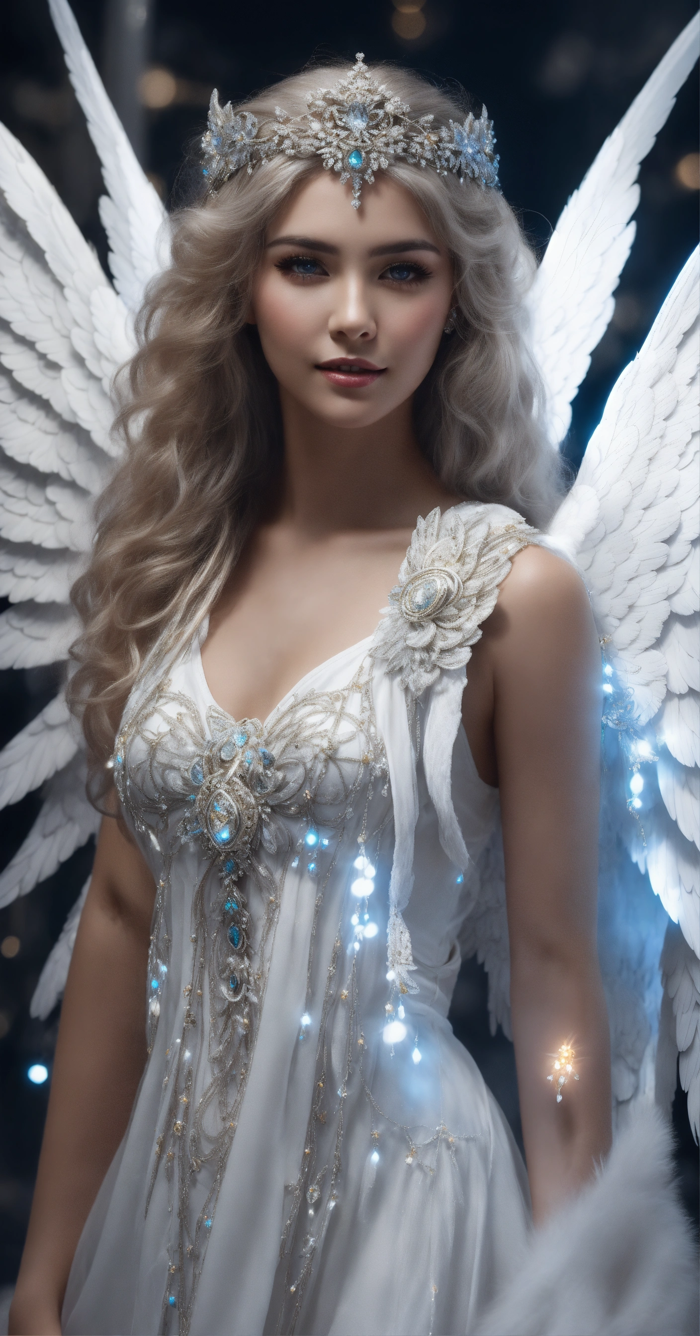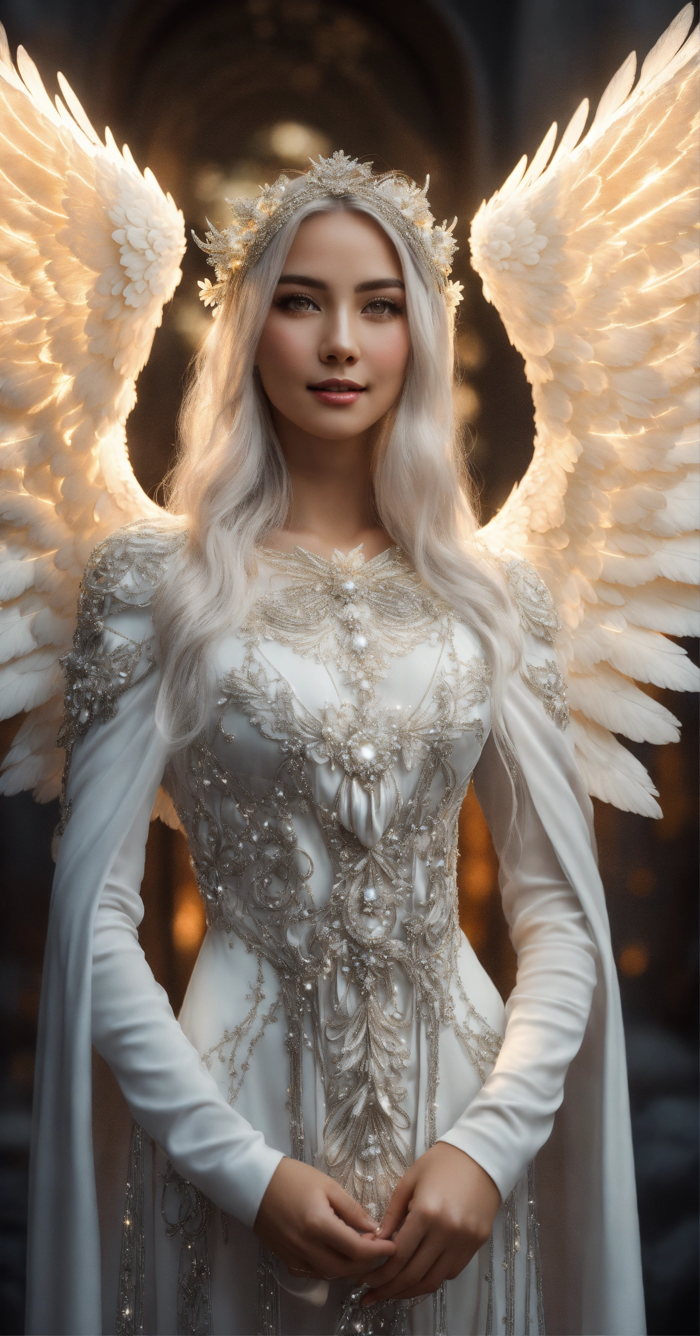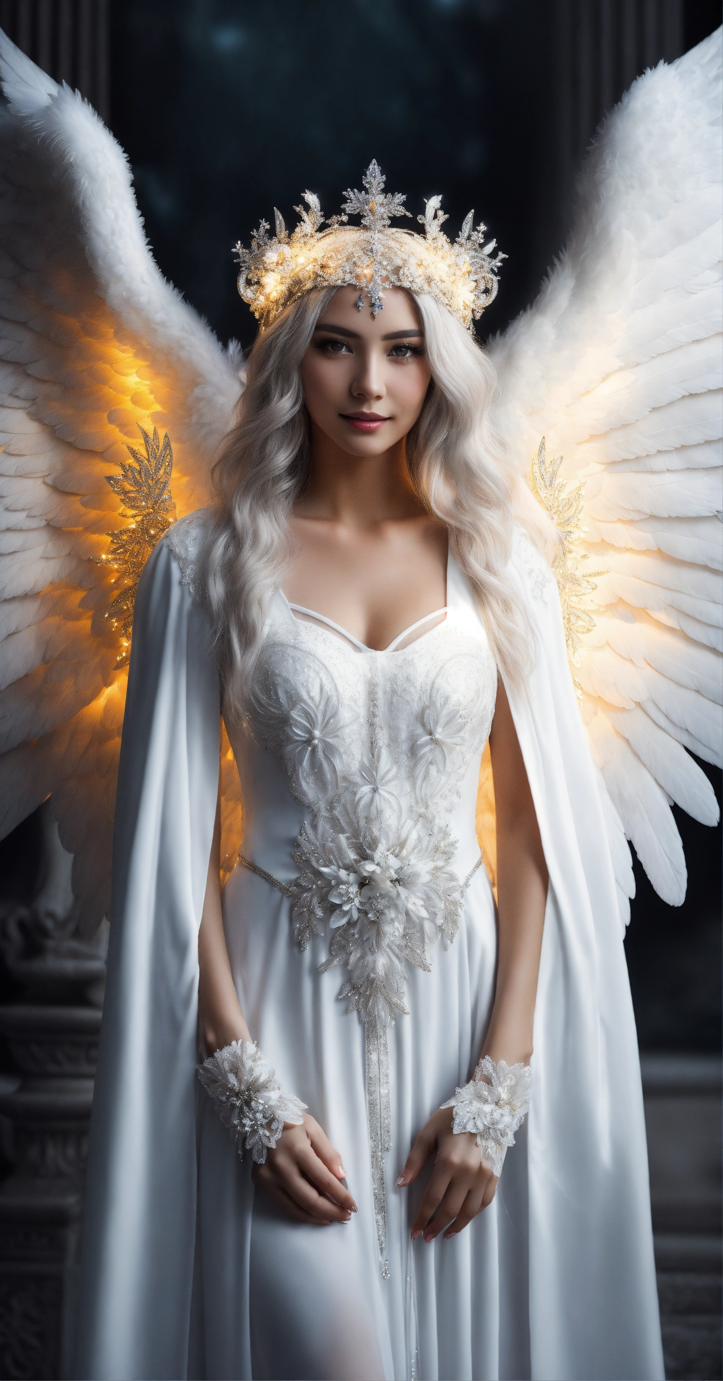 Very detailed realistic photography, hyper-detailed cinematographic photography, beautiful and perfect angel priestess woman with white angel wings and detailed and defined luminous flashes, full and large angel wings, beautiful and divine angel priestess with large and uniform wings, beautiful and detailed face, very light gray eyes with a deep and penetrating look, detailed white skin, long hair of very defined luminous neon white color and decoration in her hair with white crystals, white eyebrows and defined white eyelashes, angel with a slight smile, celestial white priestess tunic-type dress with many silver details, in her hands she has a white flower, masterpiece, realism, hd, high quality, high resolution, 8k