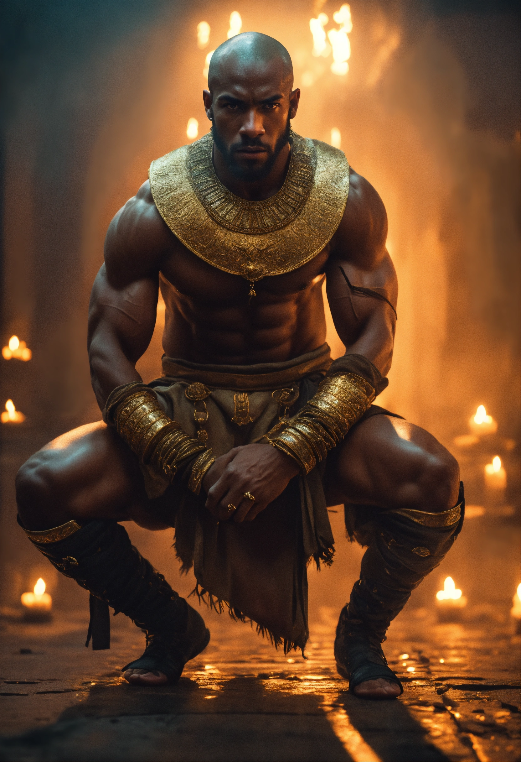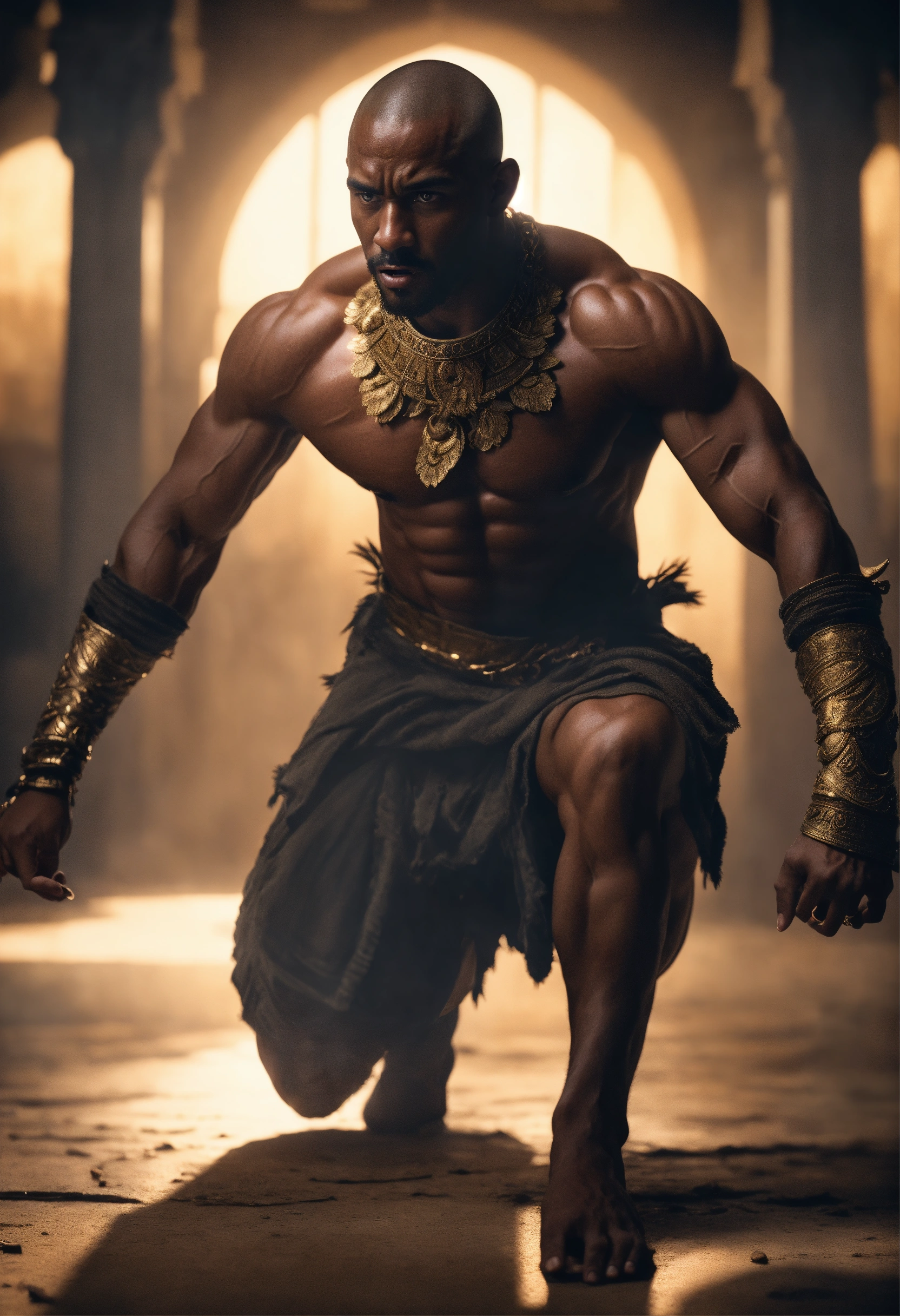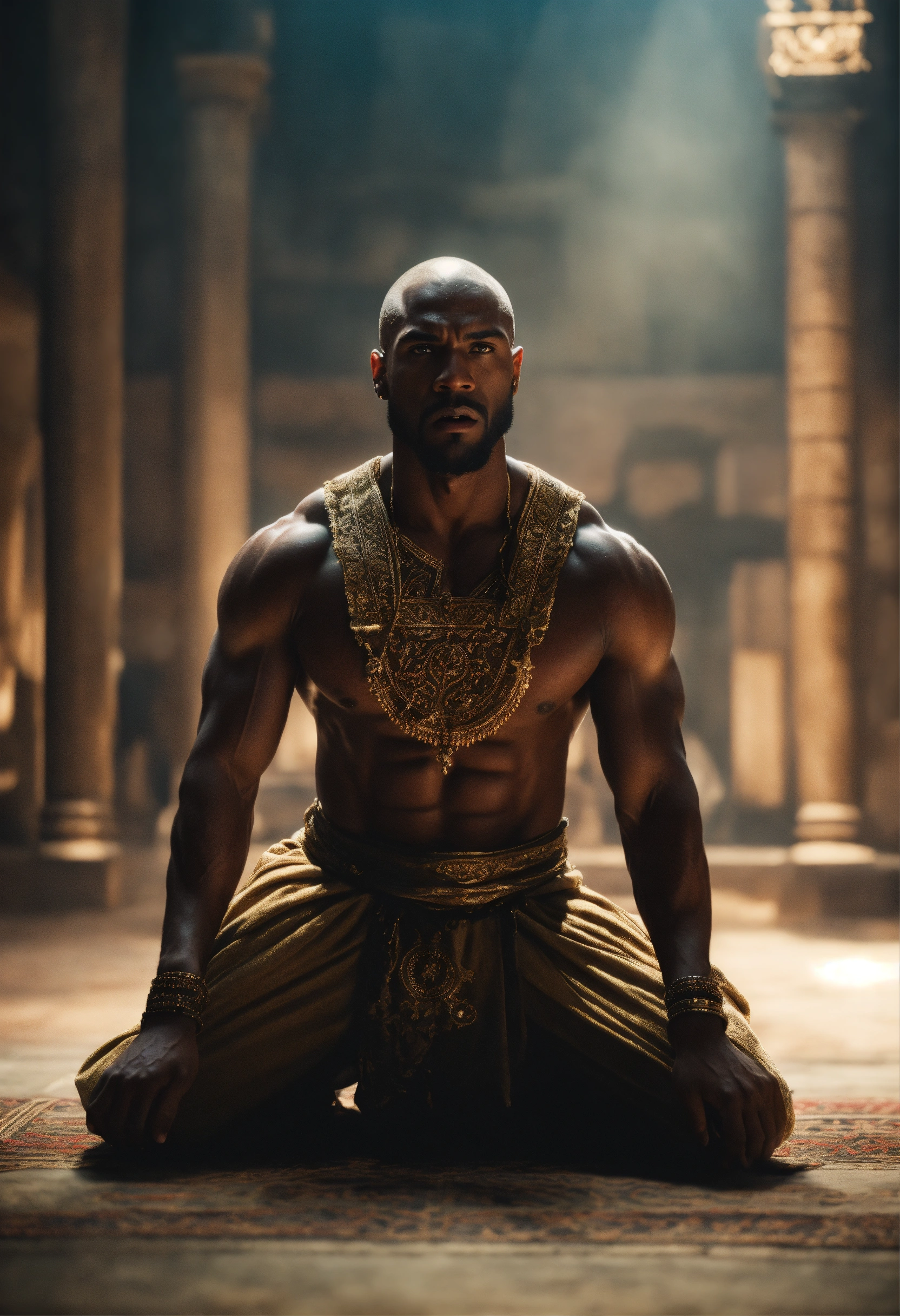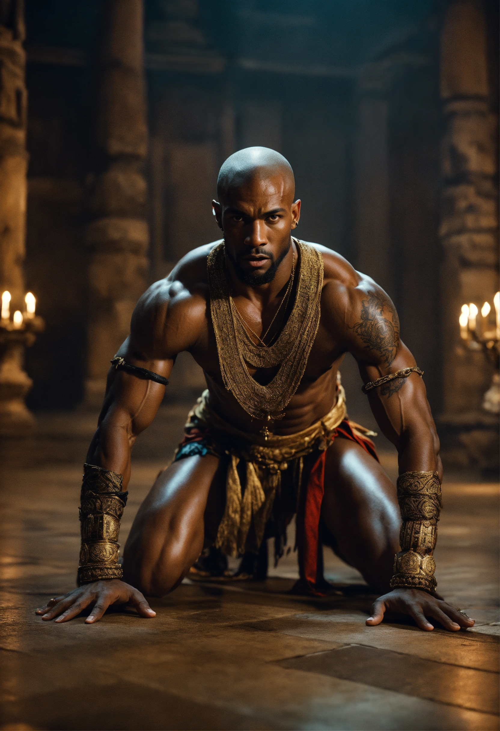 An epic fantasy scene featuring a muscular ancient nubian male with frighten look, fell on his knees on the floor, arms outstretched in fear, highly-detailed, full motion, high expression, shaved head, photo realistic, beautiful, moody lighting, best quality, realistic, close side view, intricate details, depth of field, raw photo, 8k uhd, film grain