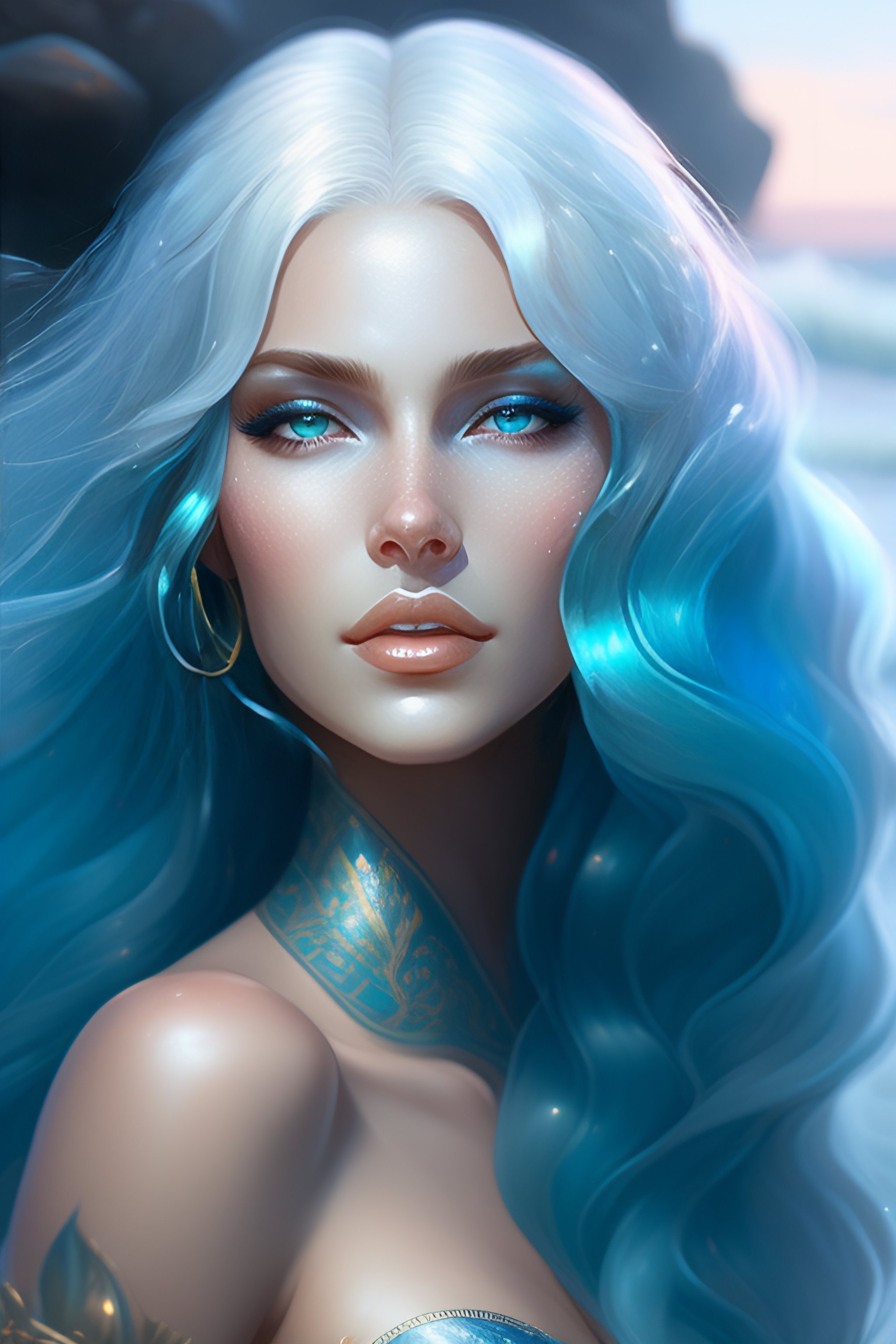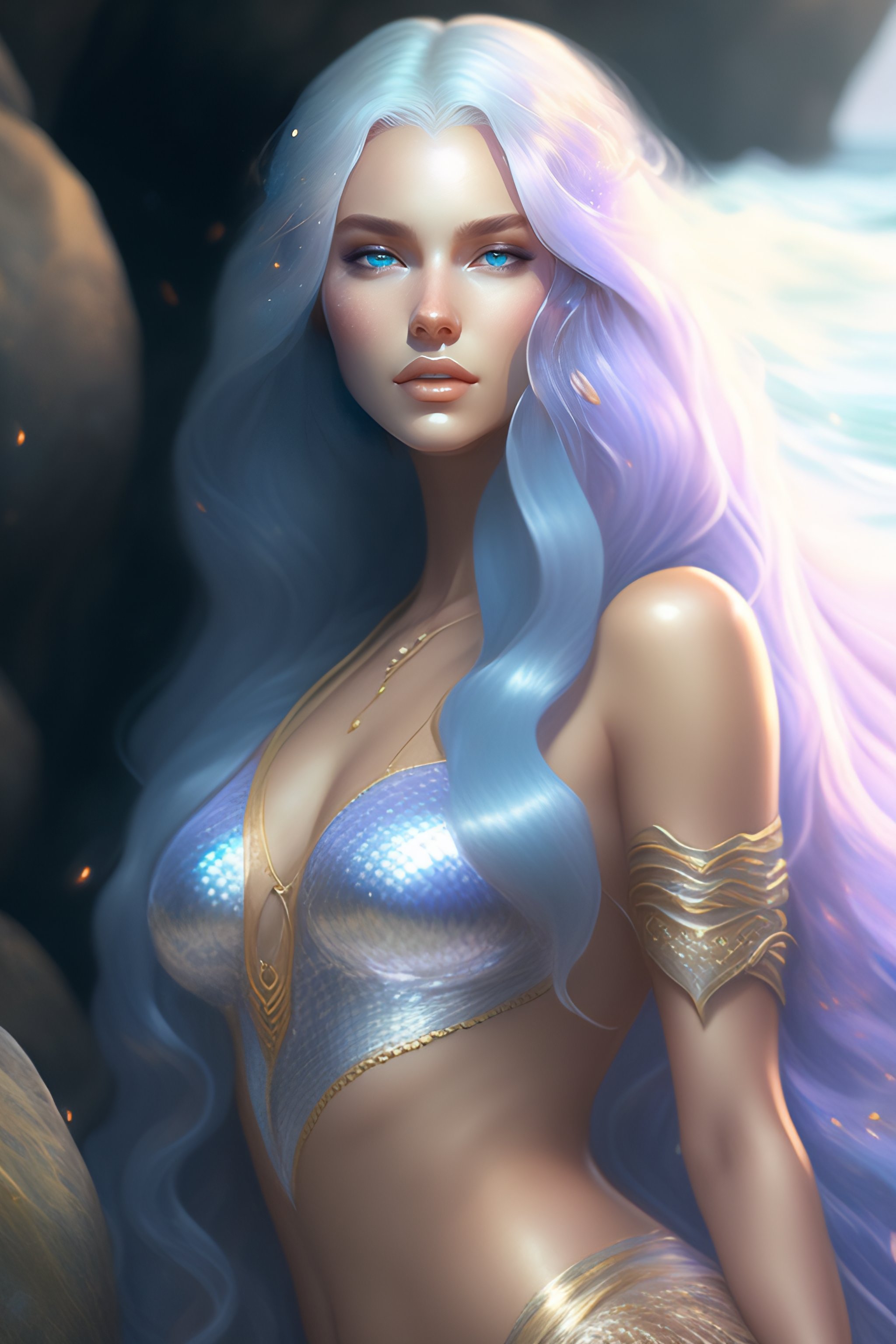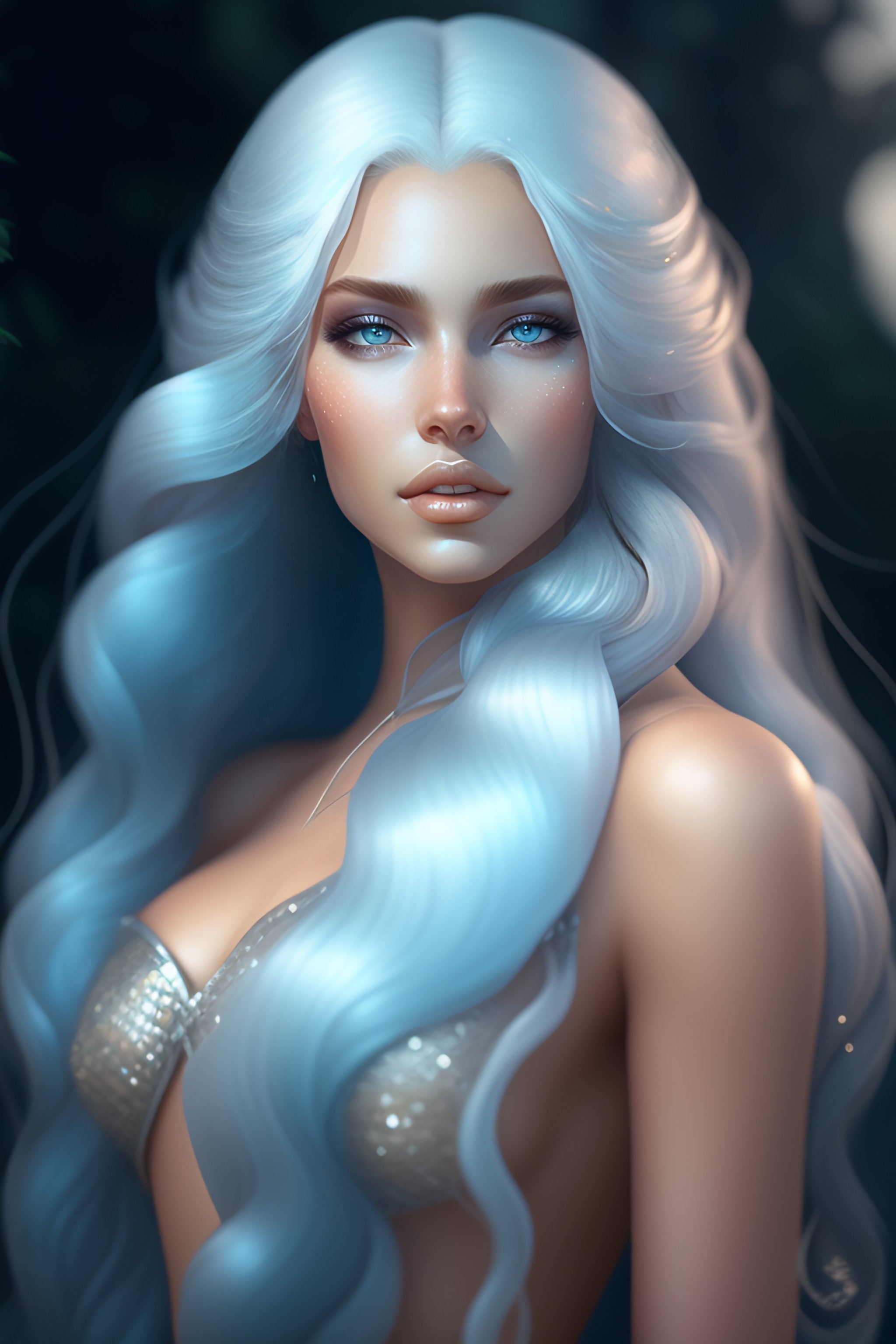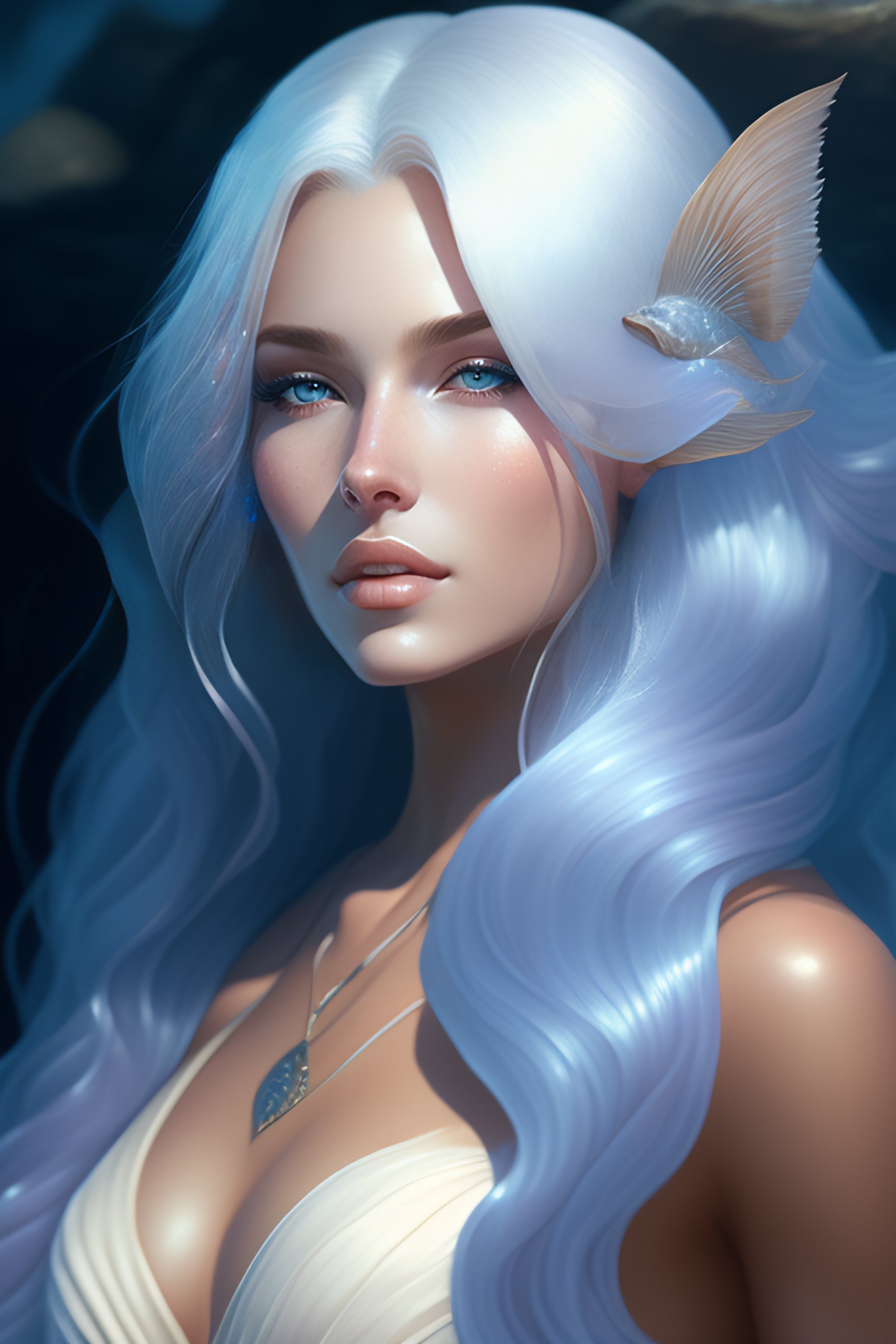 A portrait of a gorgeous mermaid with long white hair and silver blue tail, by wlop, greg rutkowski, thomas kinkade, super detailed, 3 d, 4 k wallpaper