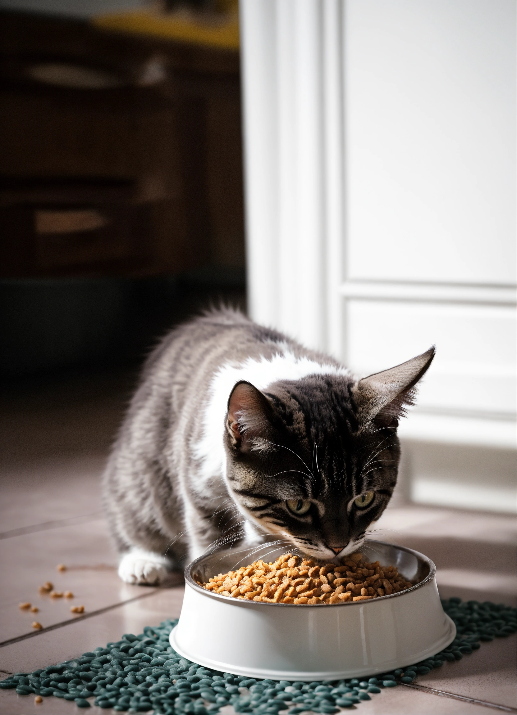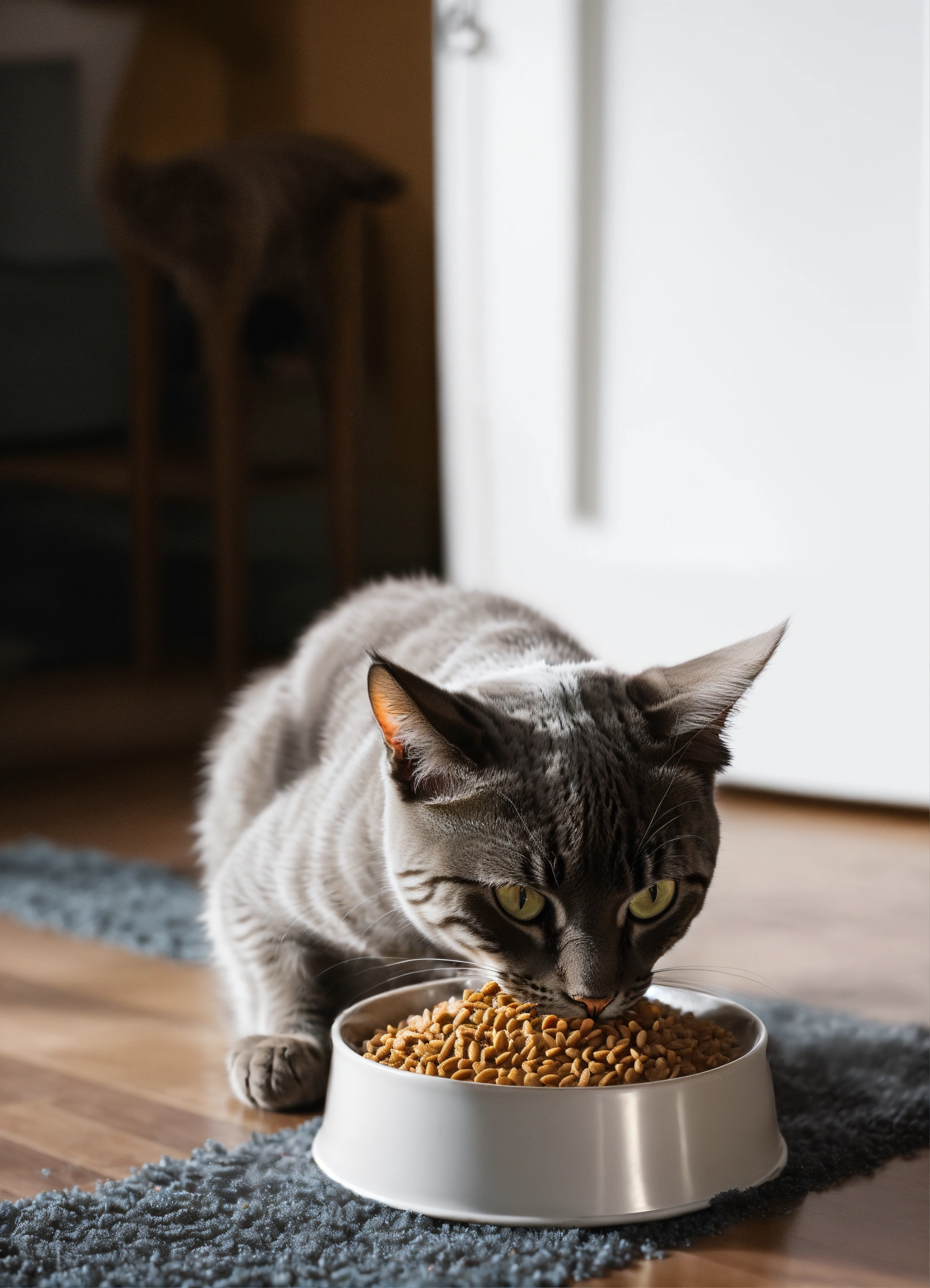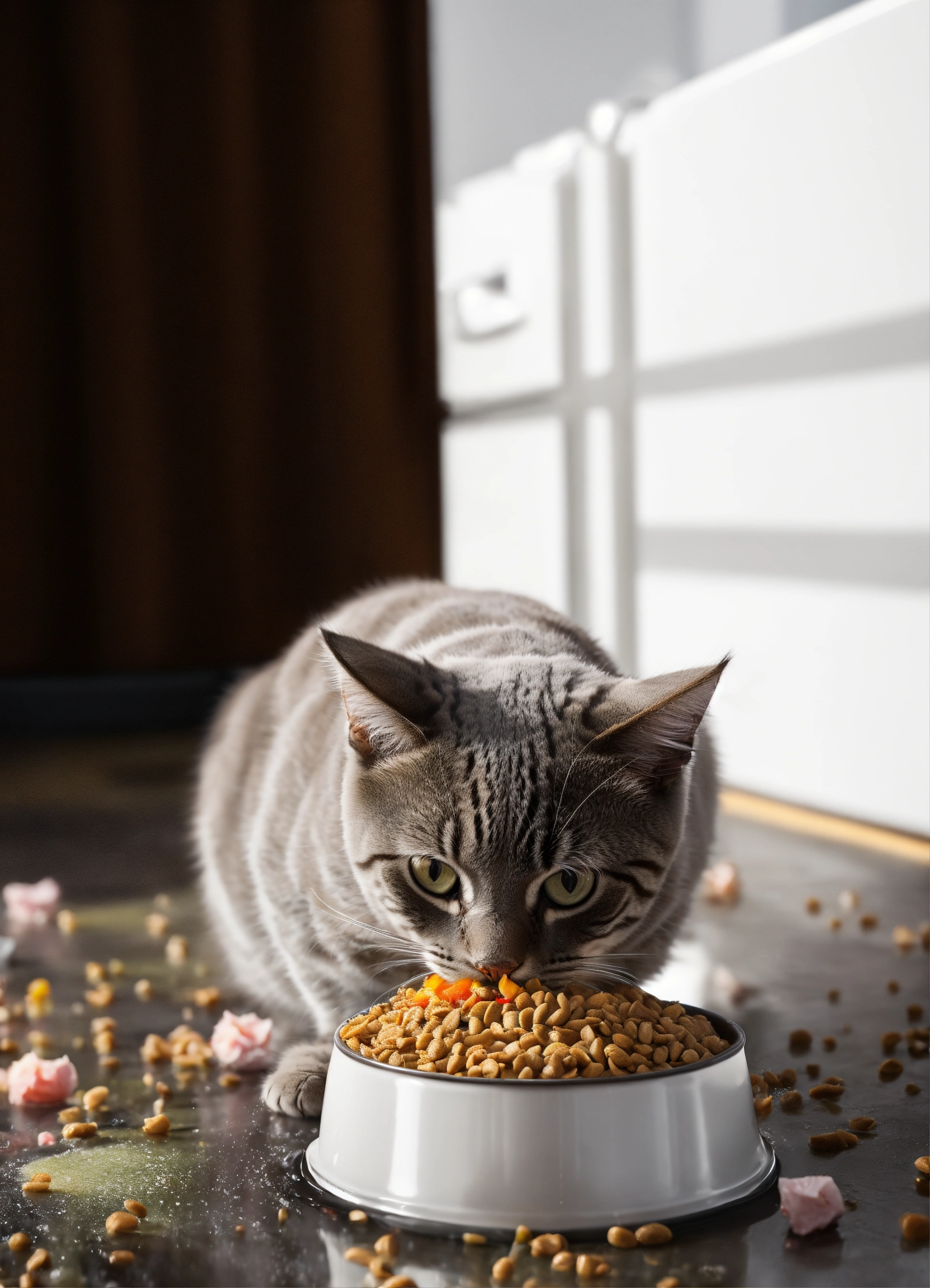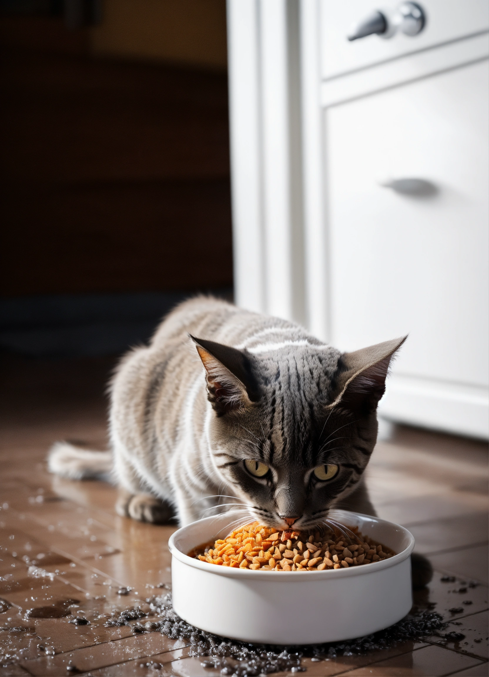 Generate a highly realistic image of a cat eating from a bowl of wet cat food, on the clean floor in the clean room