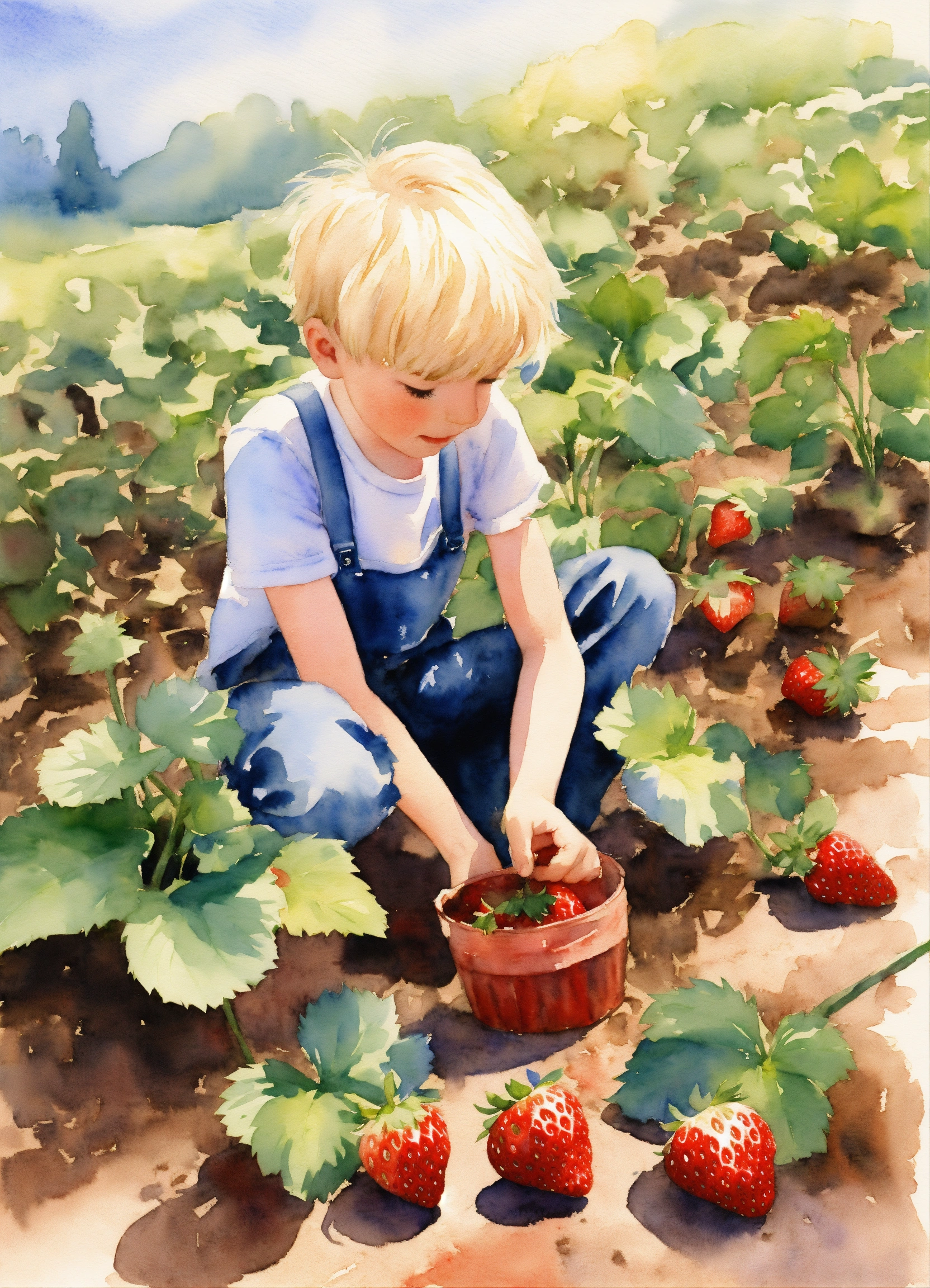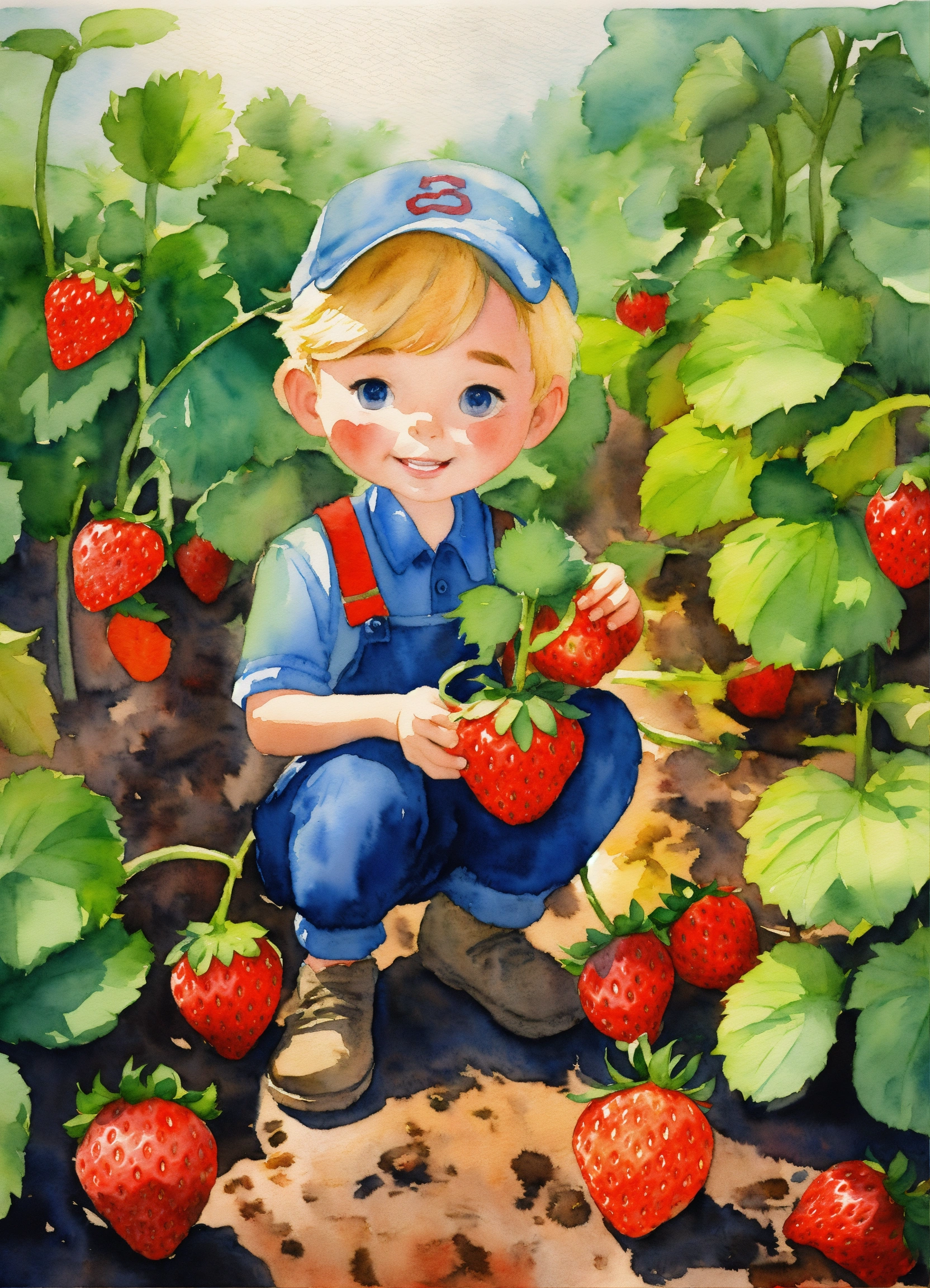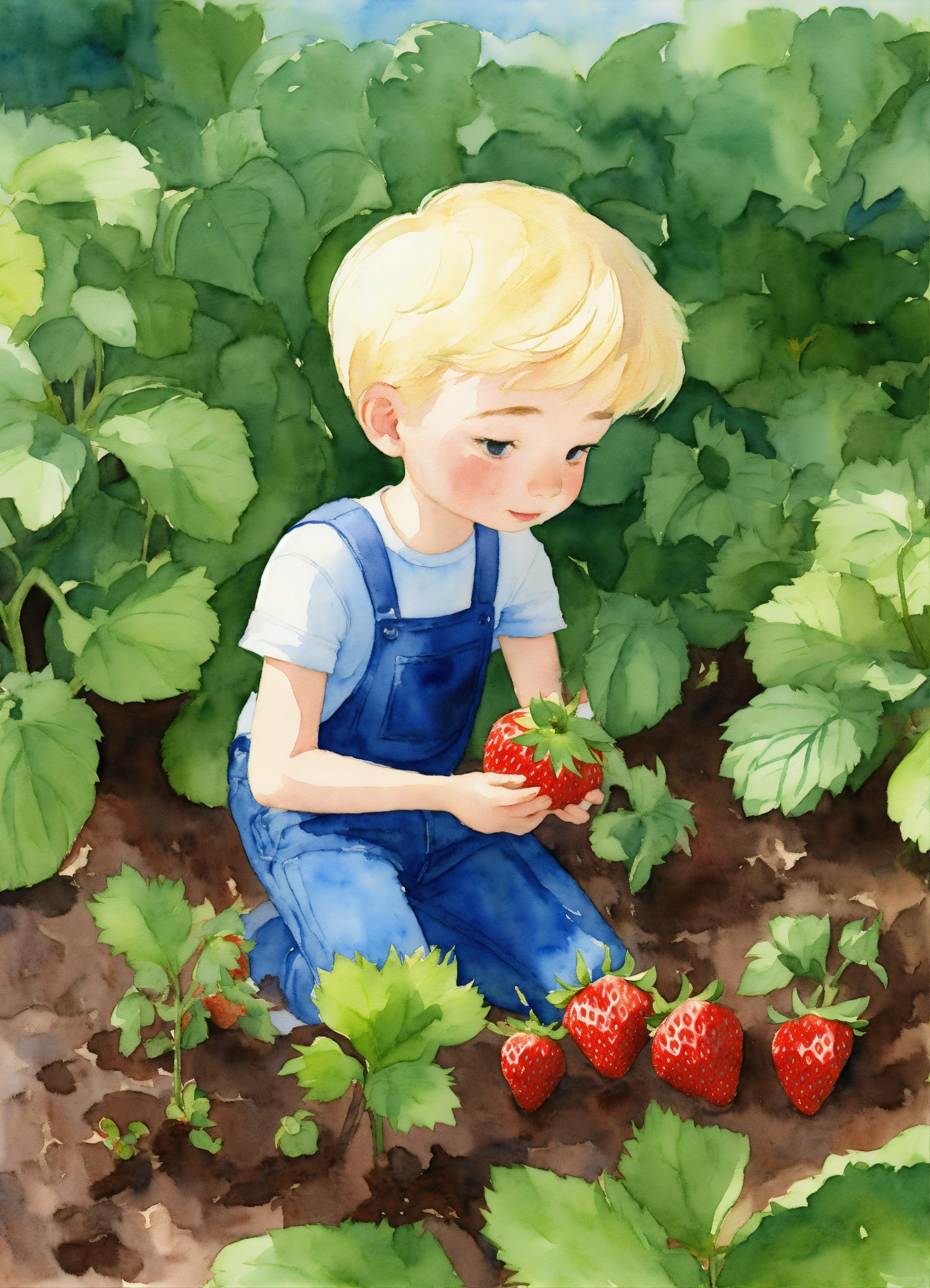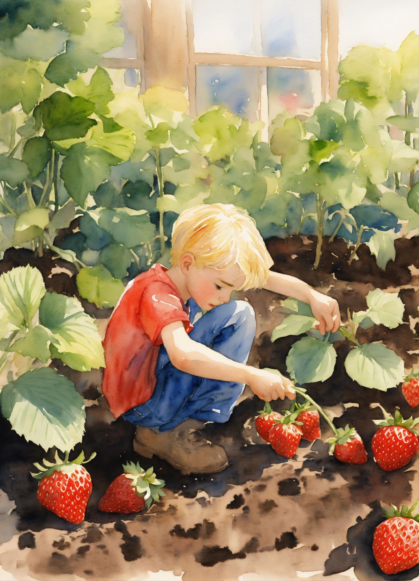 Watercolor painting of 8 year old blond chris evans tending to his strawberry patch with a few withered plants visible, watercolor pixar style cartoon
