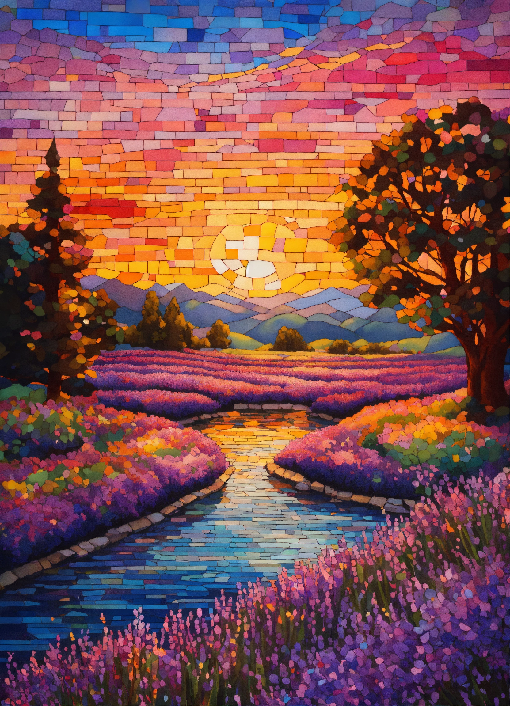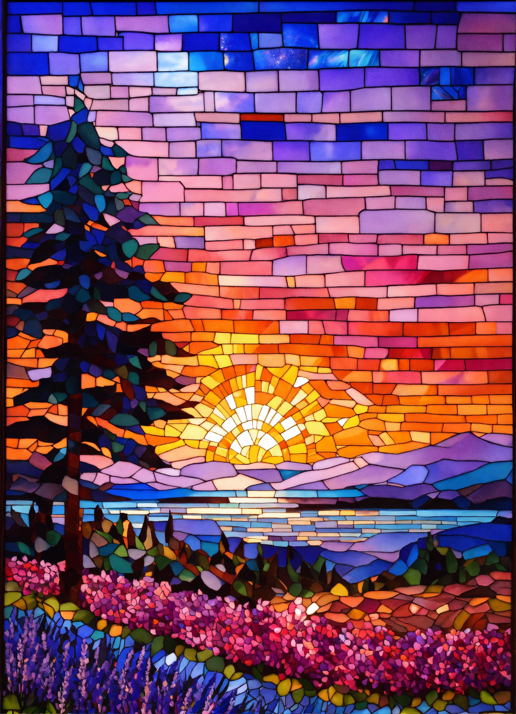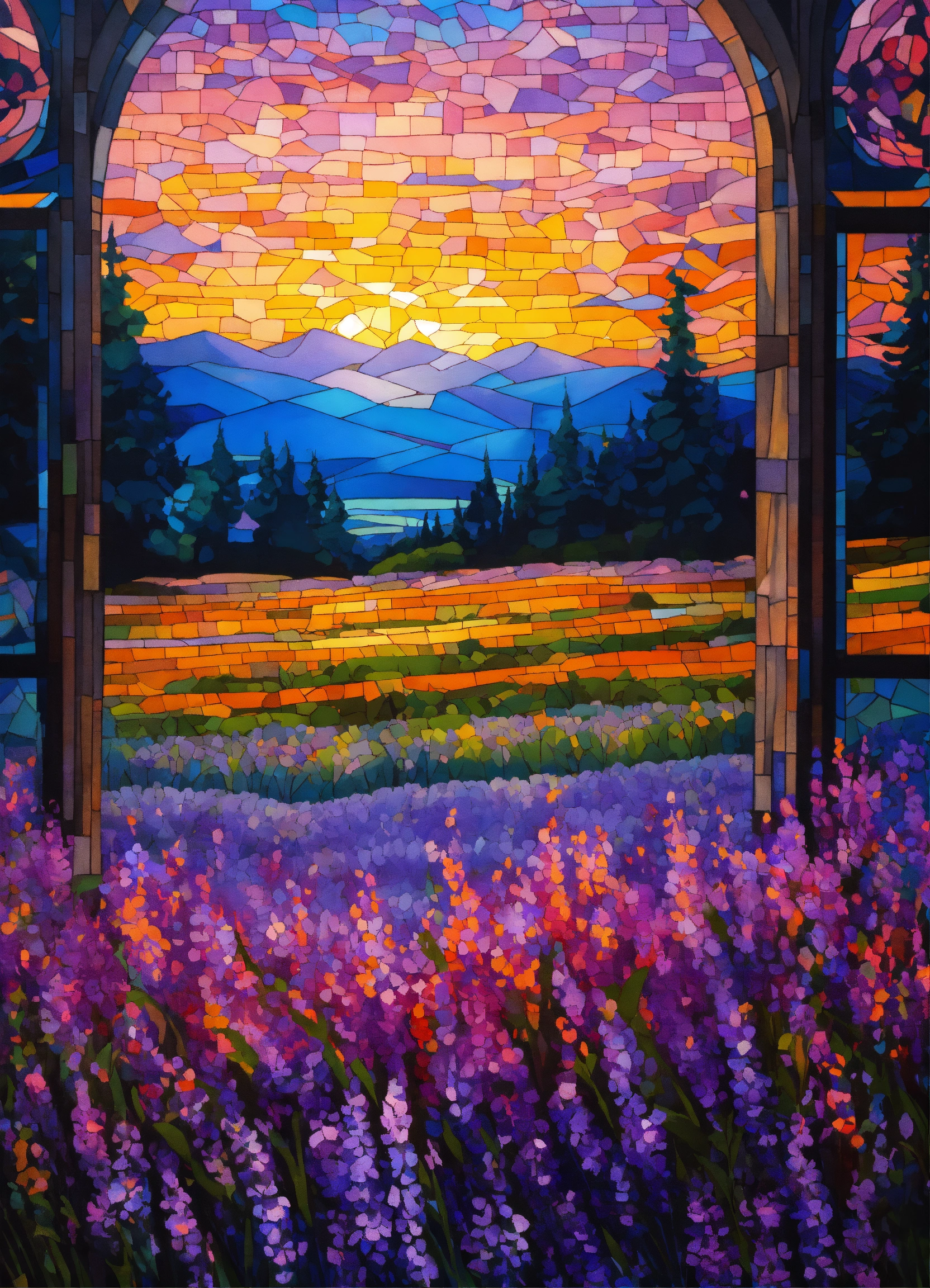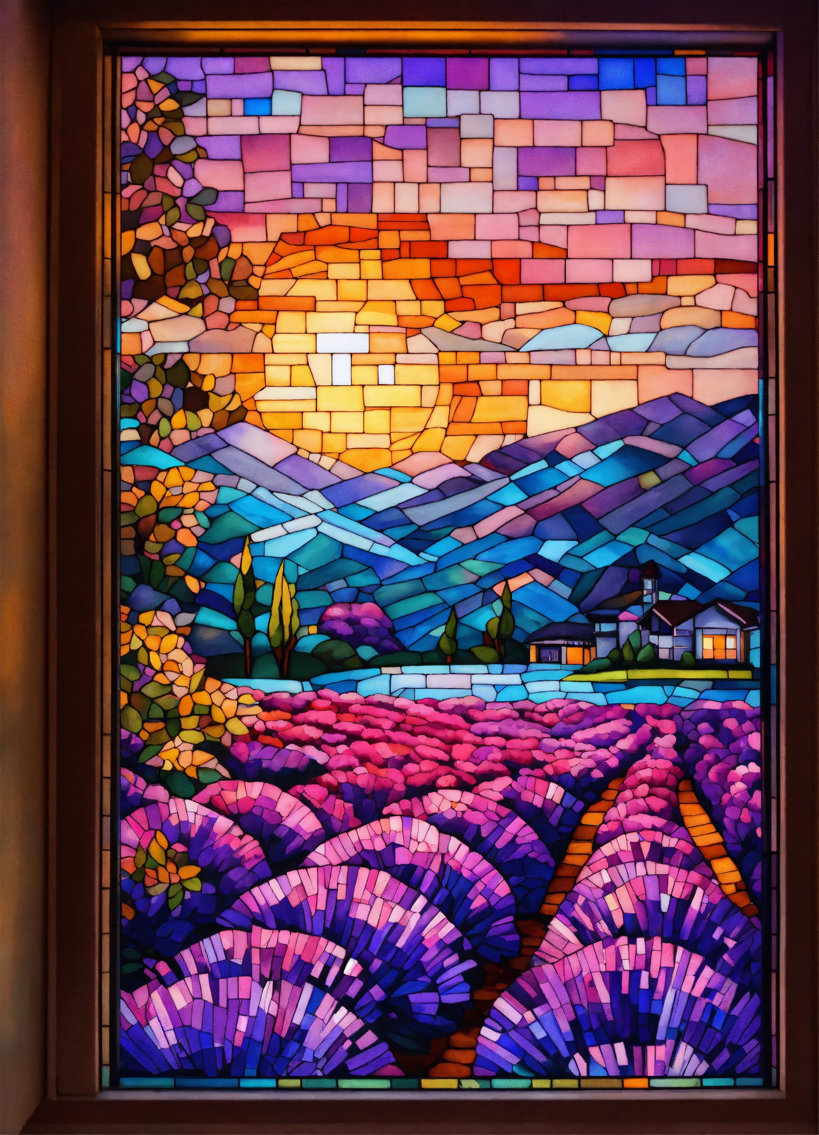 Stained glass window mosaic of field of lavender, vibrant colors, ultra sharp detail, trees, ultra blue lake, glitter, stars, stardust, hyper realistic, well rendered, detailed, electric pink, orange and yellow sunrise sky in style of thomas kinkade