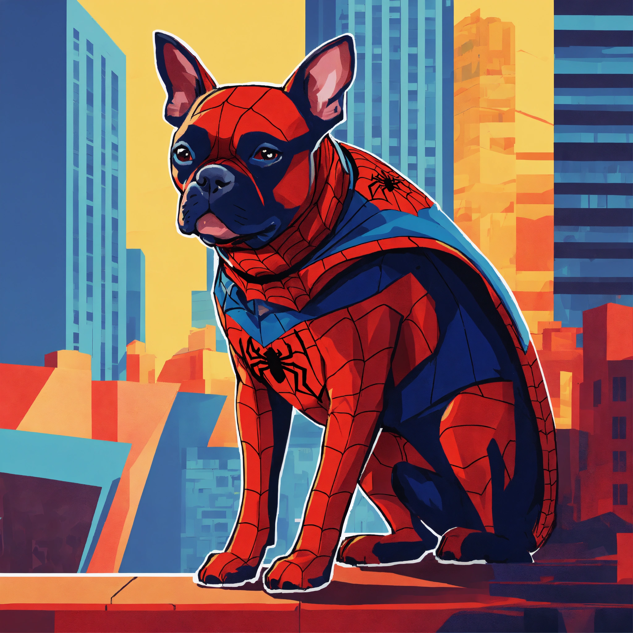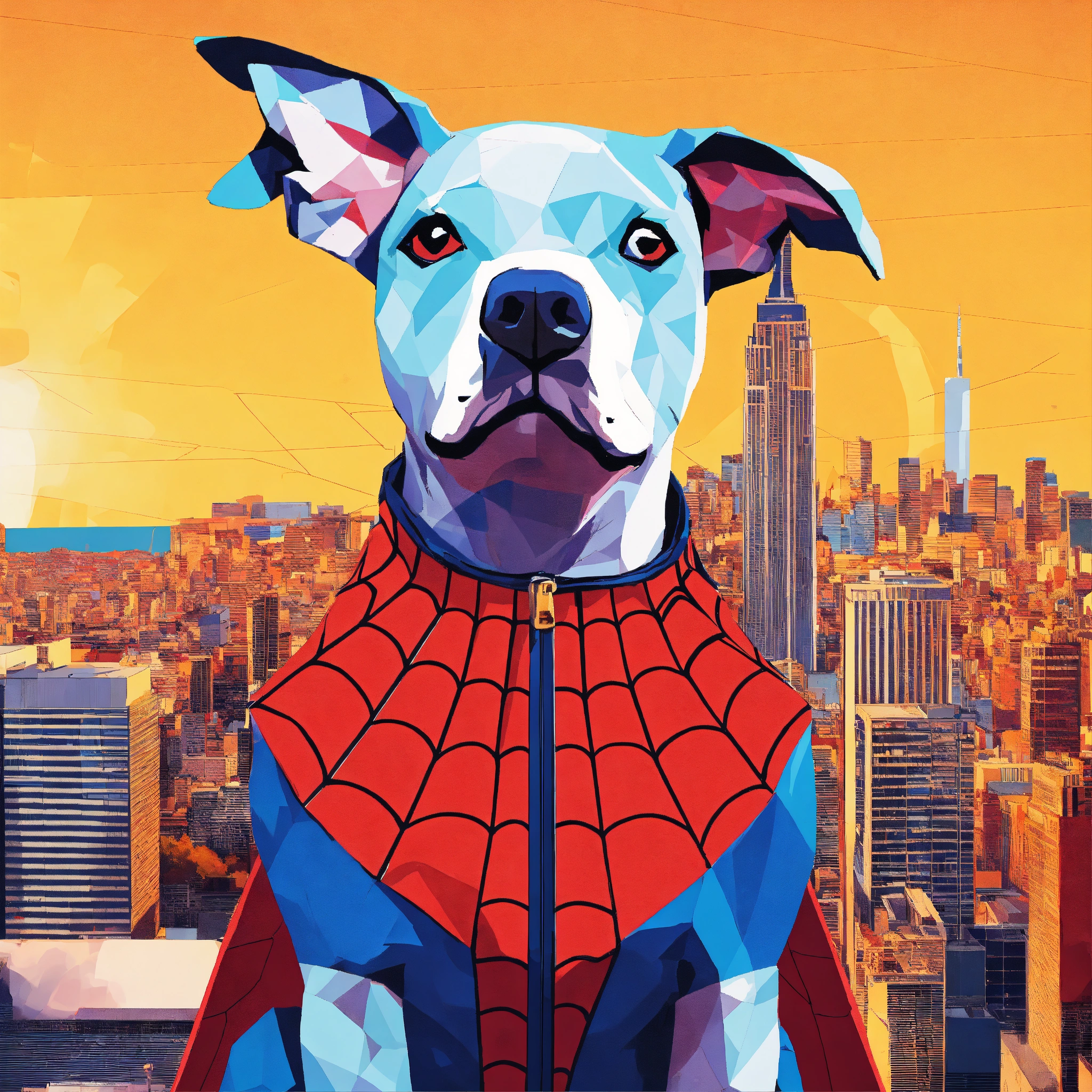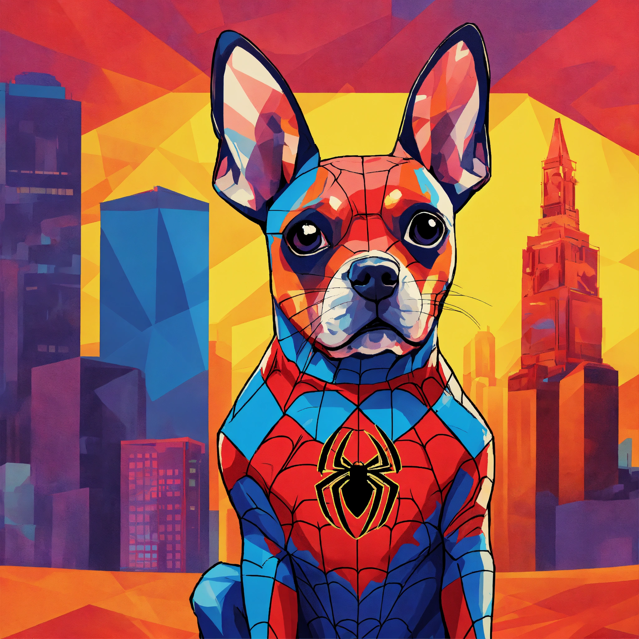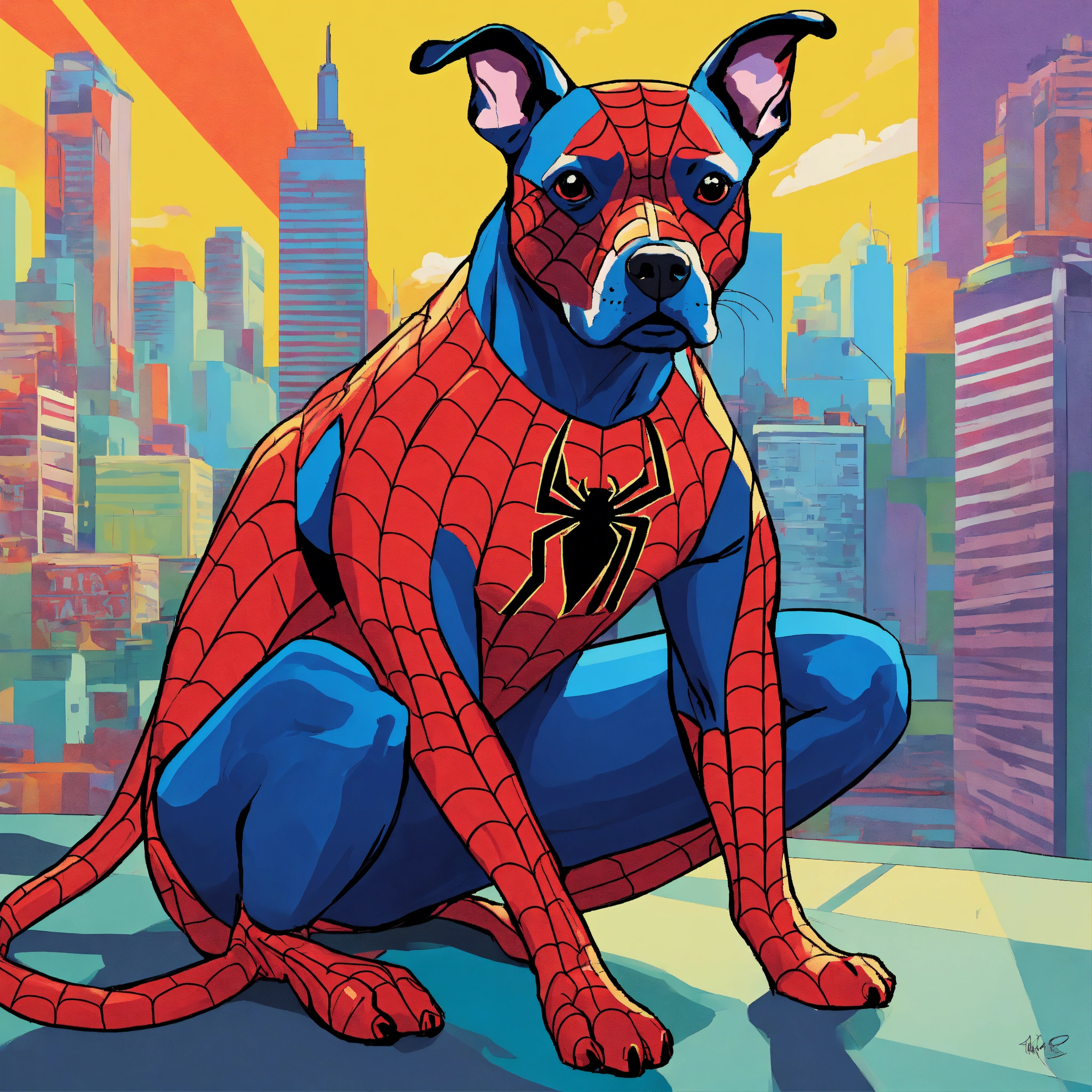 Generate a pop art masterpiece featuring a dog dressed like a spider-man like superhero figure as the central character. utilize primary colors and geometric shapes to capture the essence of the style. the character should embody a pixar like, fun persona, striking a dynamic, energetic pose. complement this with a backdrop filled with fun, city backdrop.