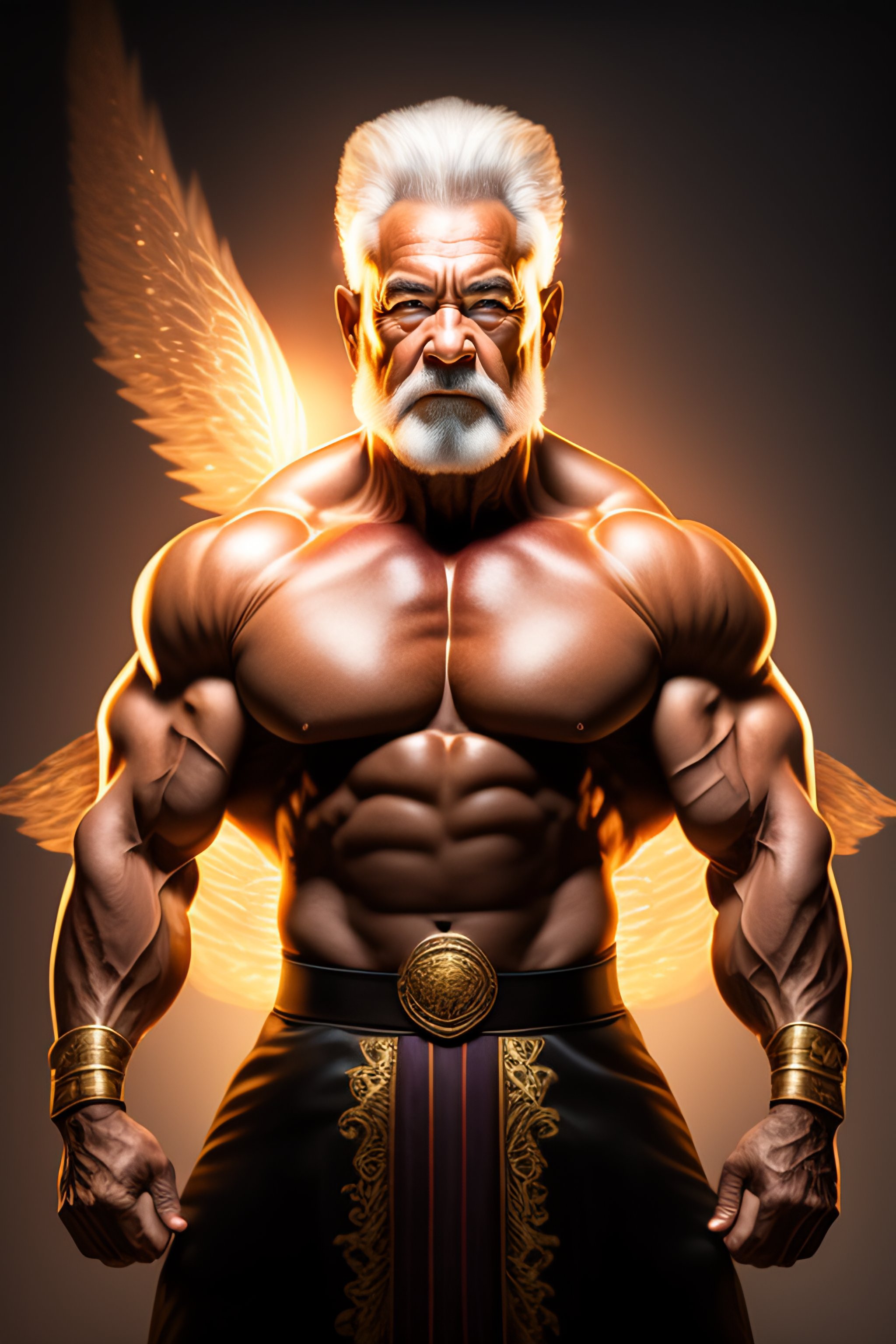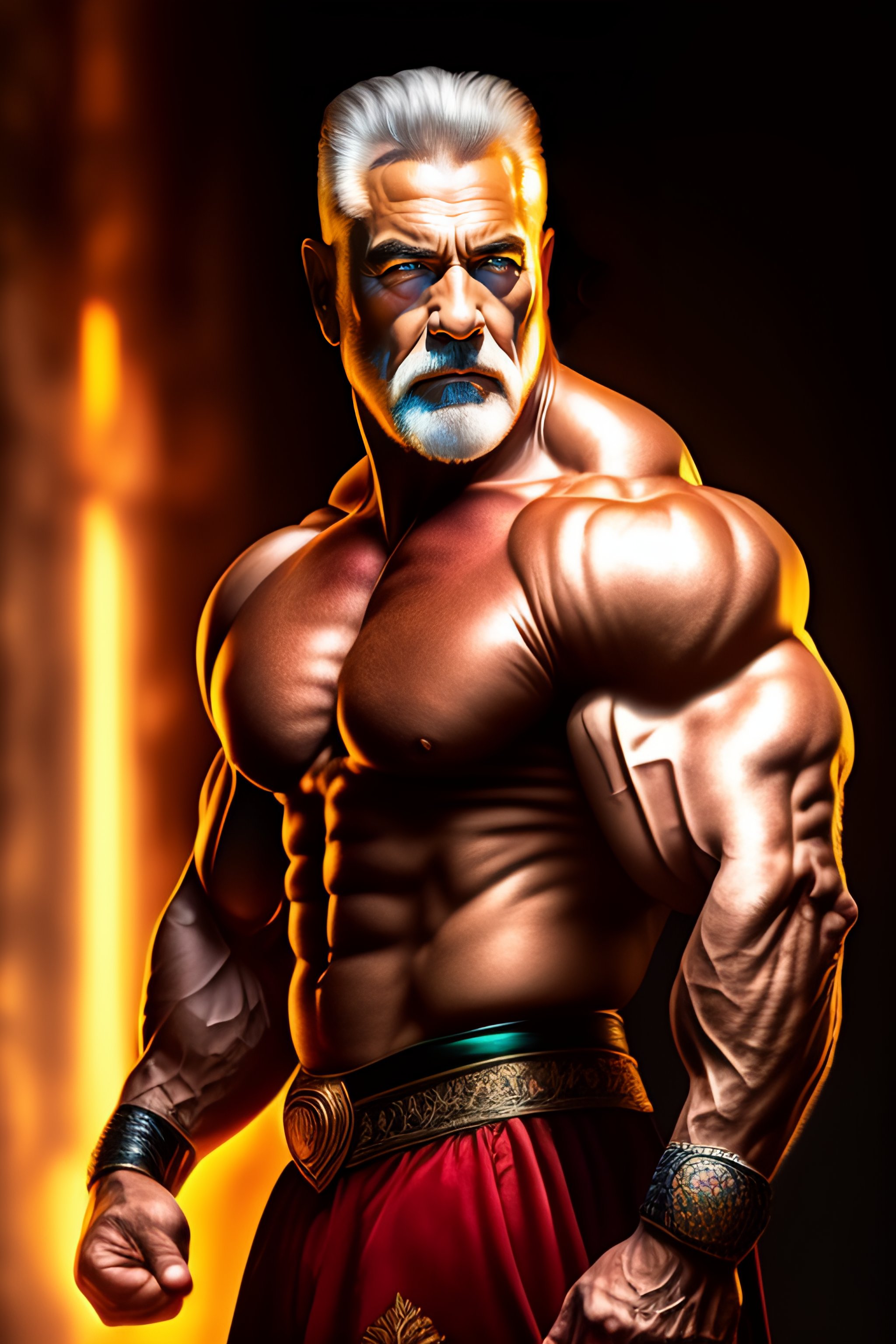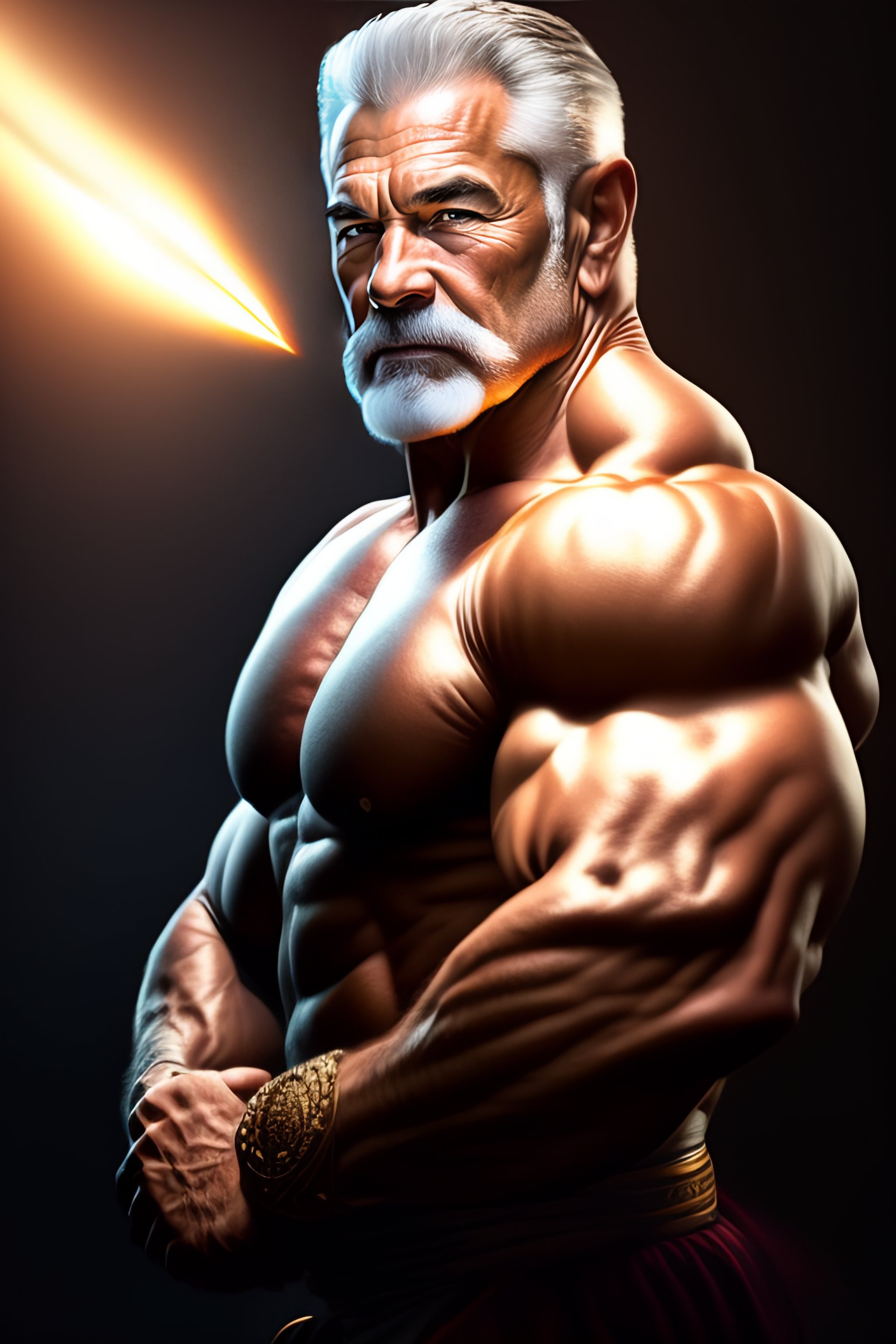 Muscular old guy warrior, bodybuilder posing, radiant light, caustics, fantasy, intricate, elegant, highly detailed, digital painting, concept art, smooth, sharp focus, realistic style