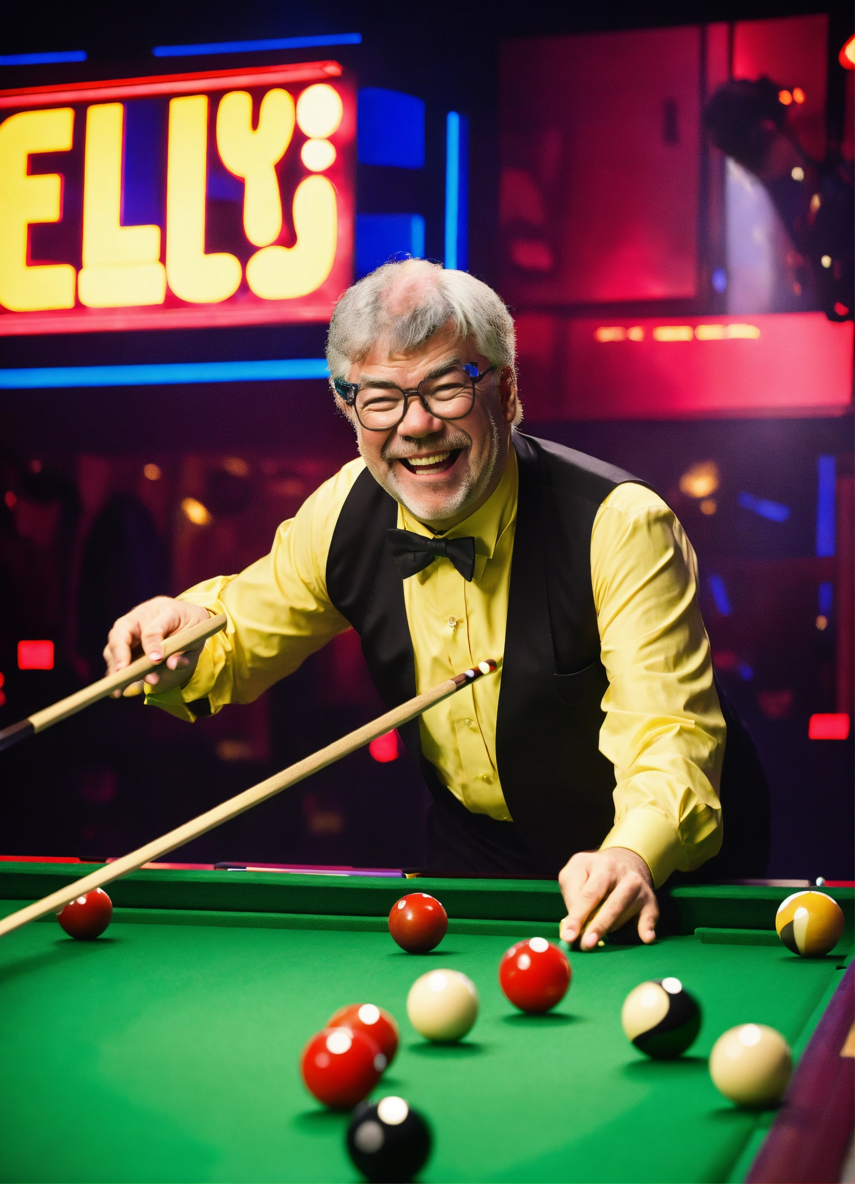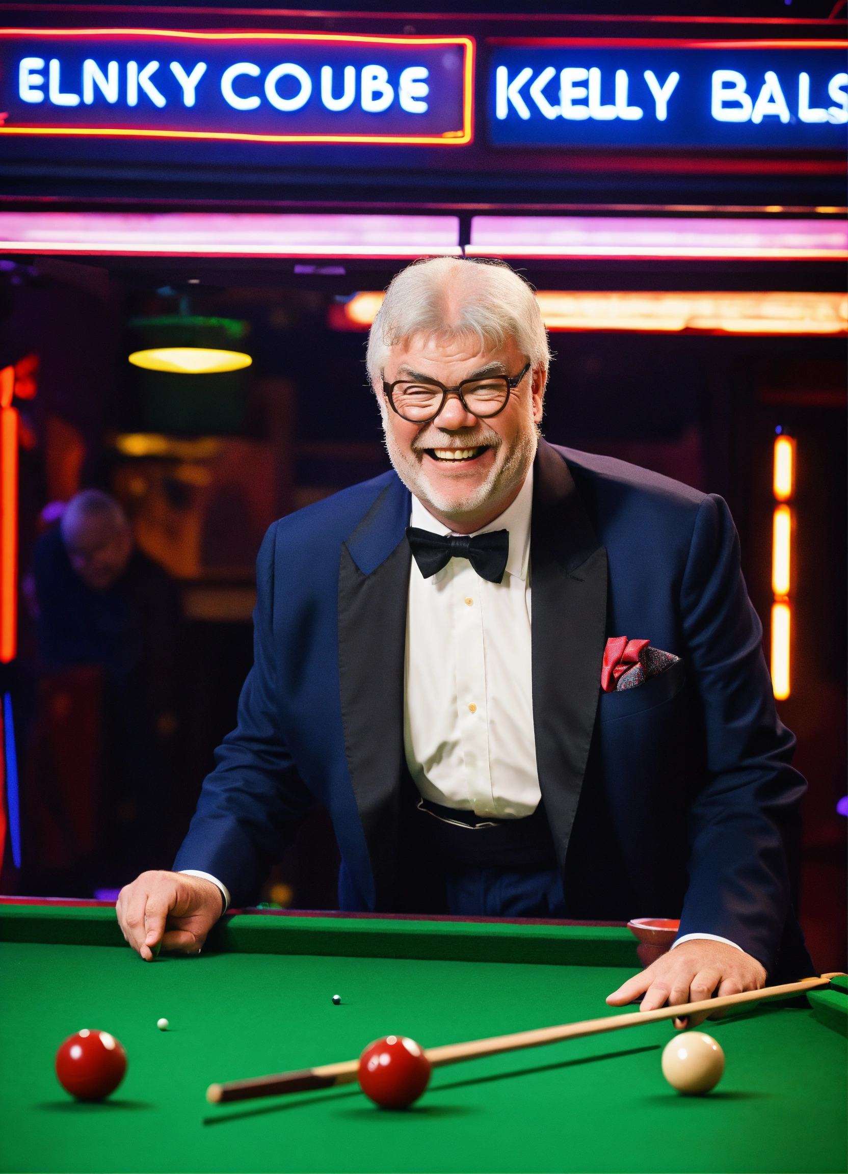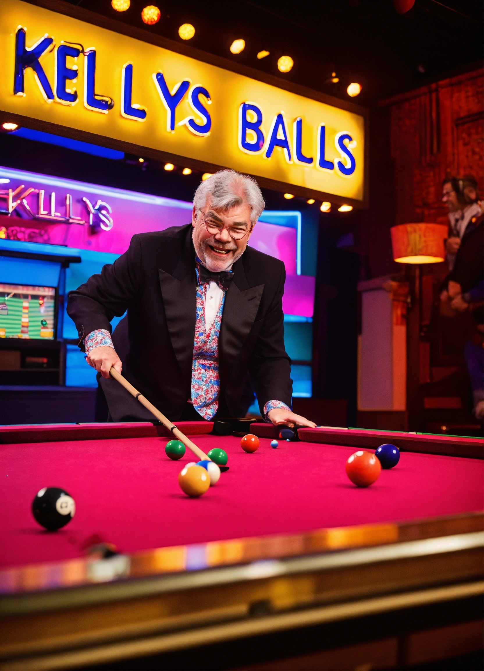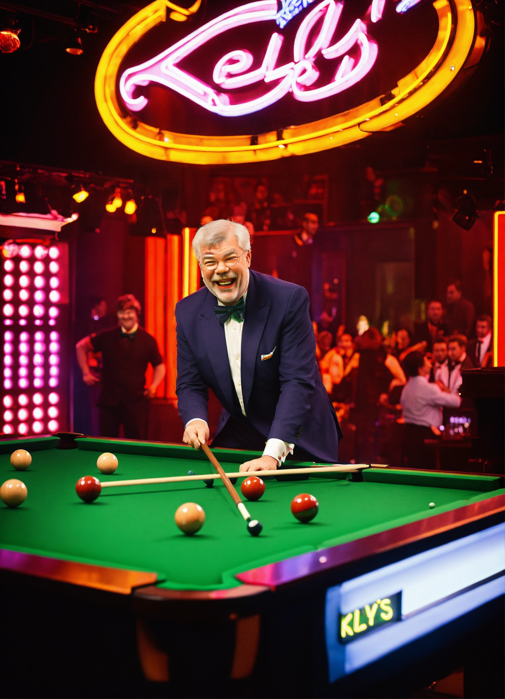 Tv gameshow being filmed in studio, matthew kelly wearing oversized upside down glasses, enormous oversized bow tie, playing snooker with a tiny short snooker cue, laughing. neon sign "kelly's balls", comedy. itv logo bottom right