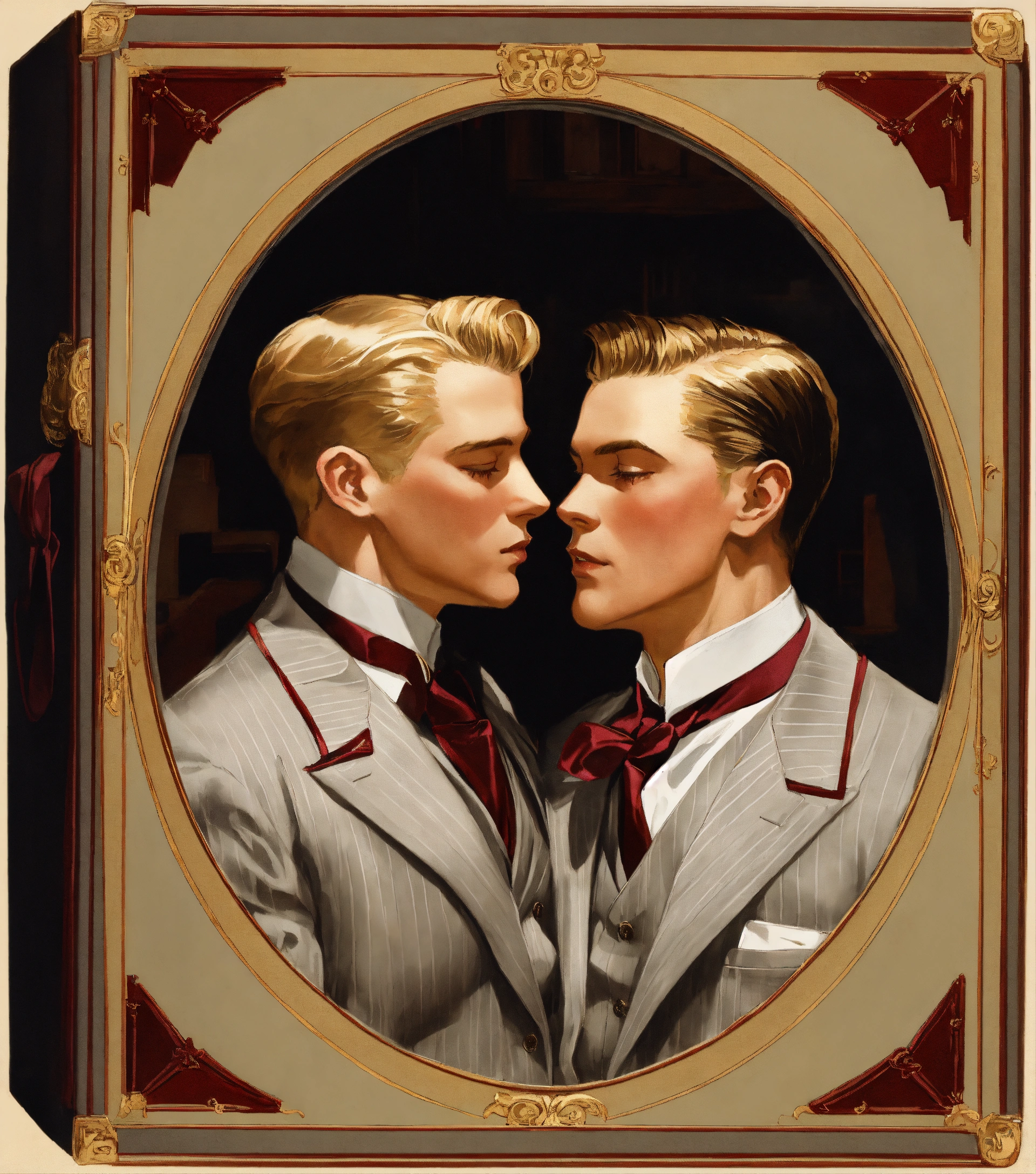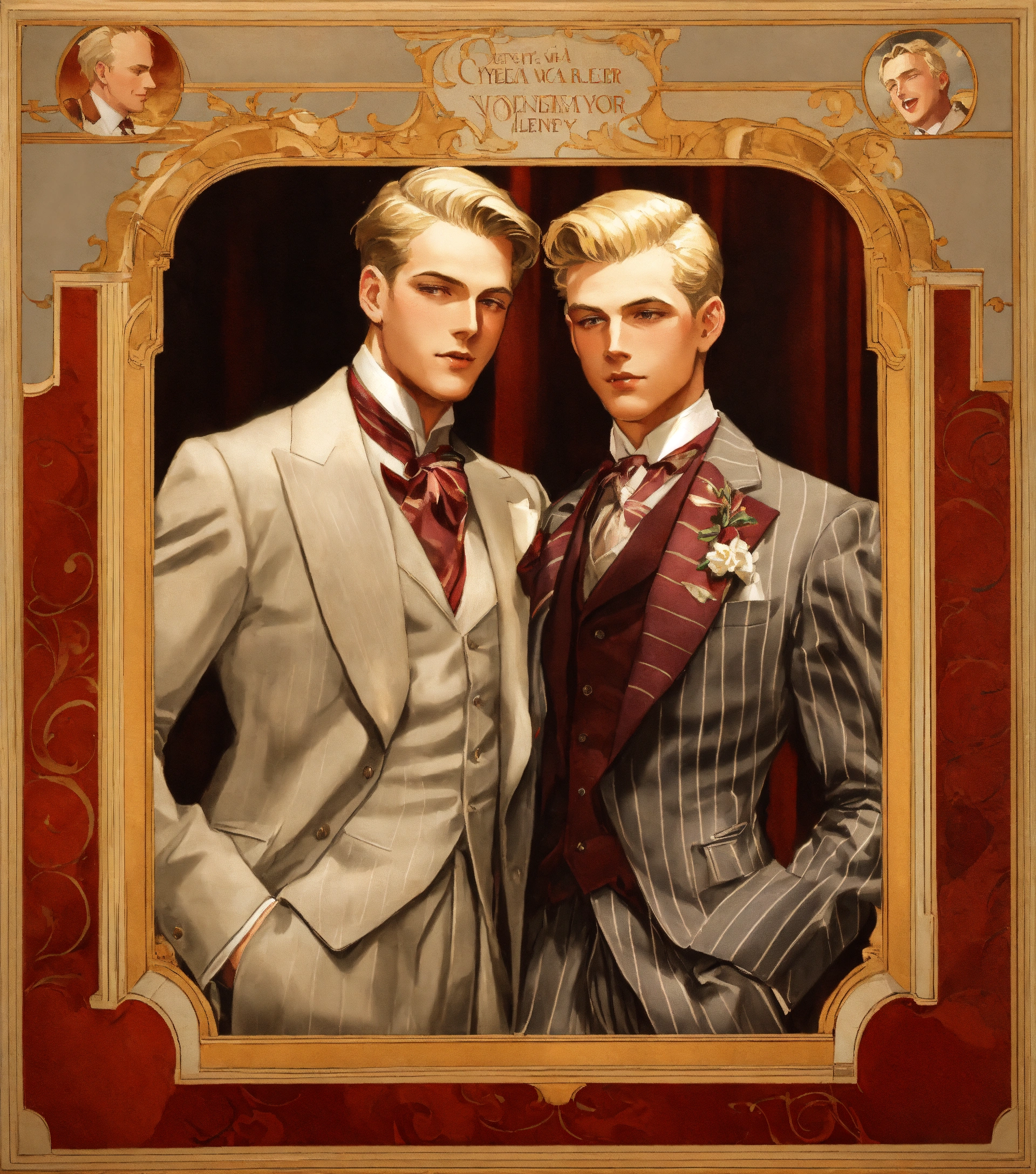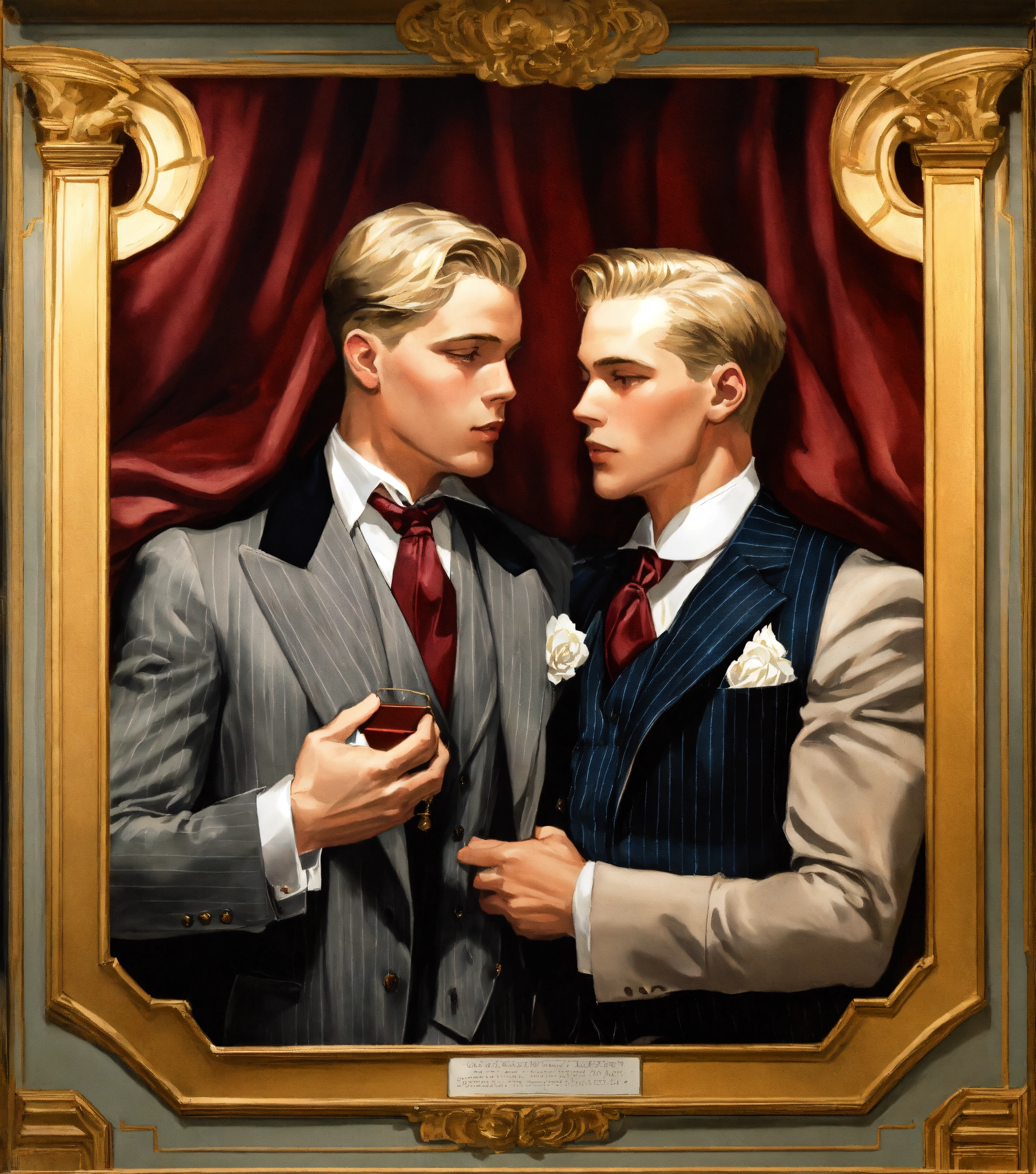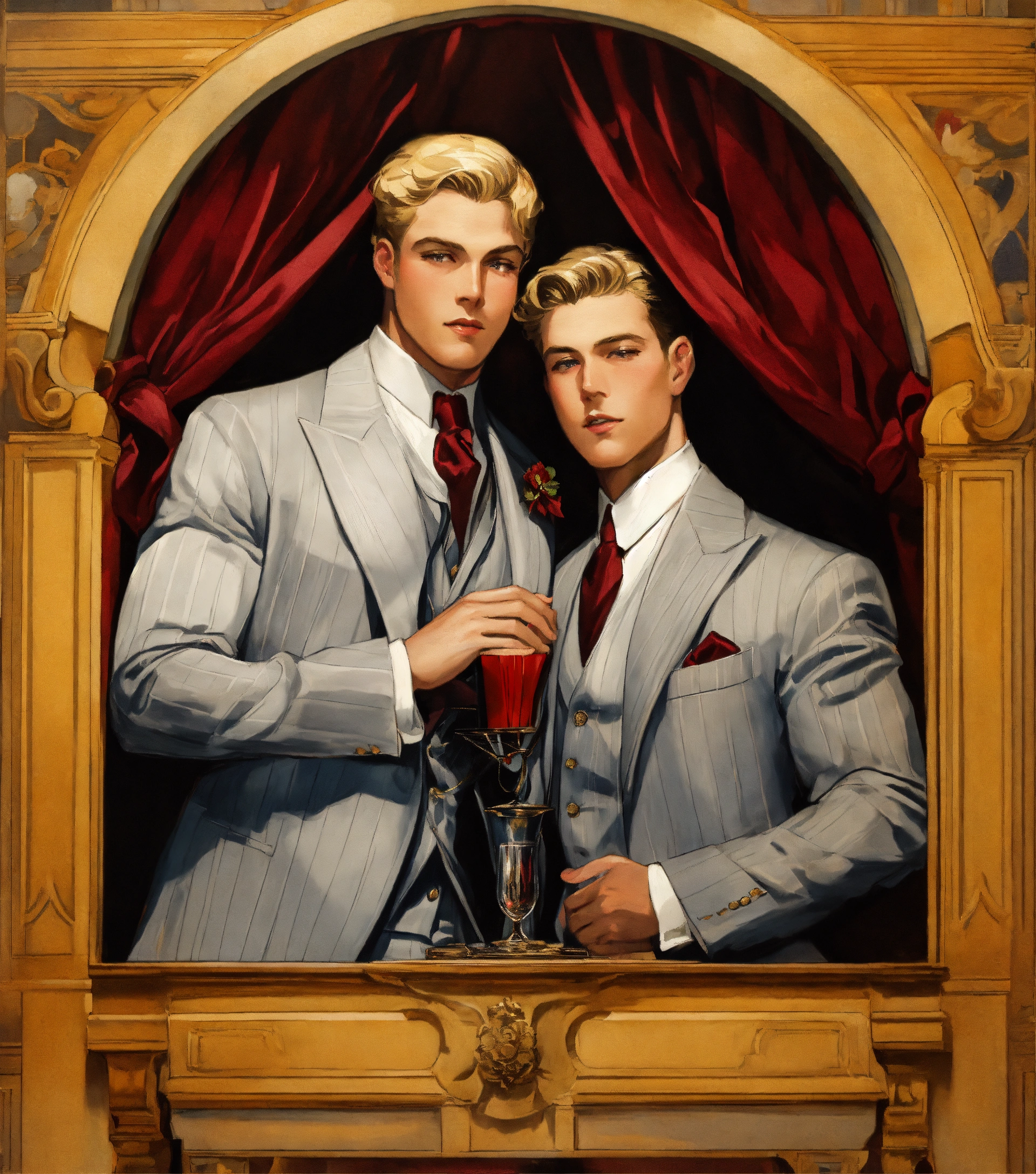 Two blonde gentlemen in light grey pinstripe vested suit and burgundy tie embracing in an opera box, leyendecker style