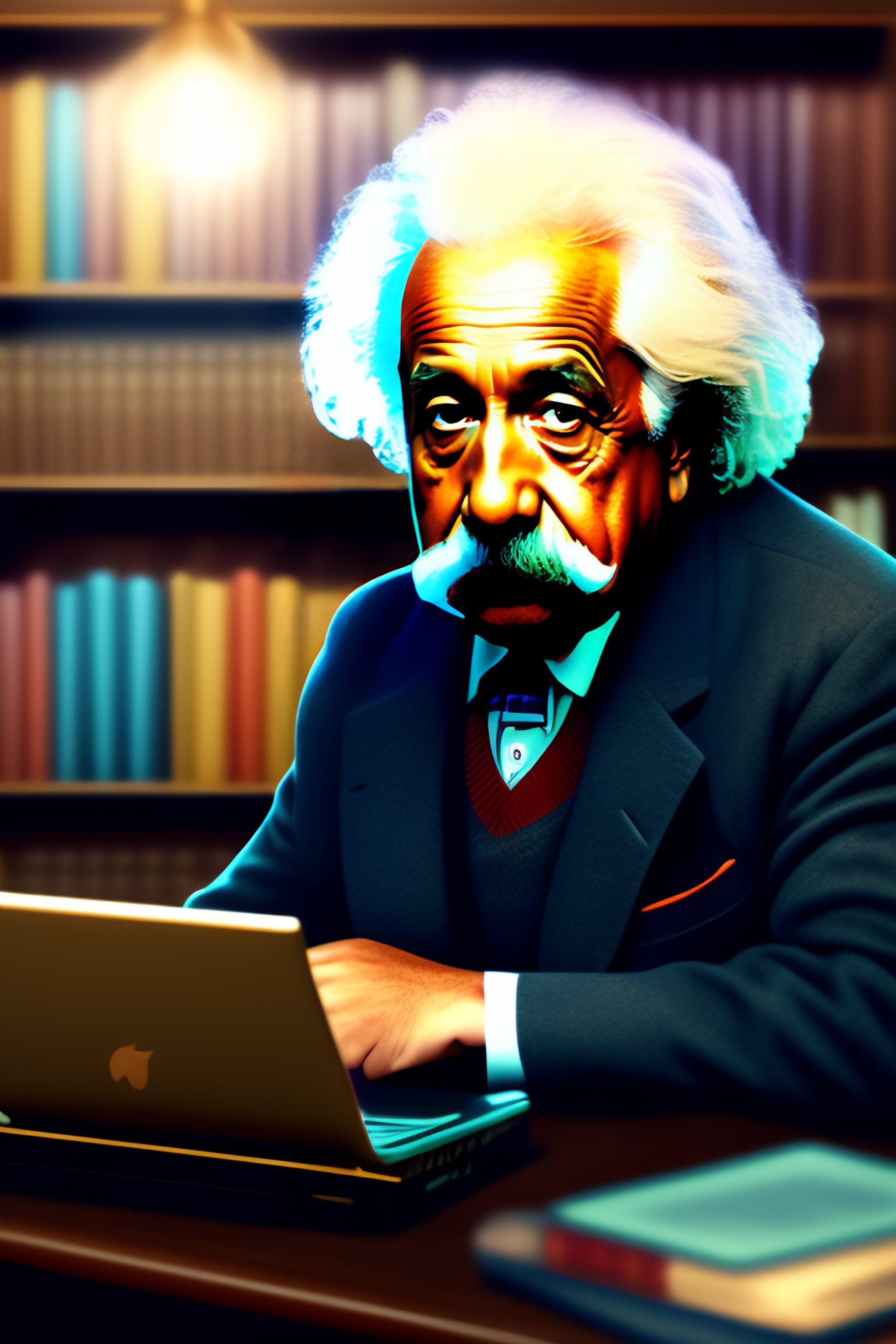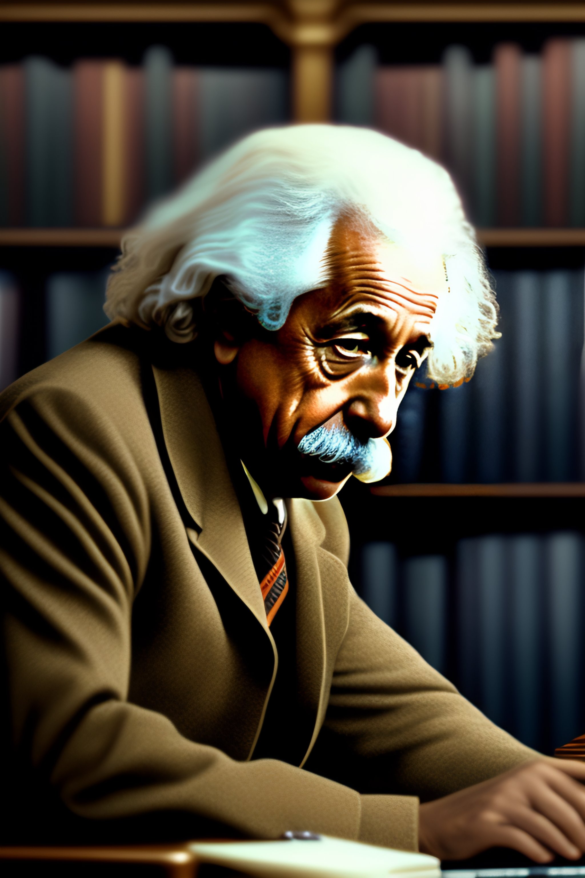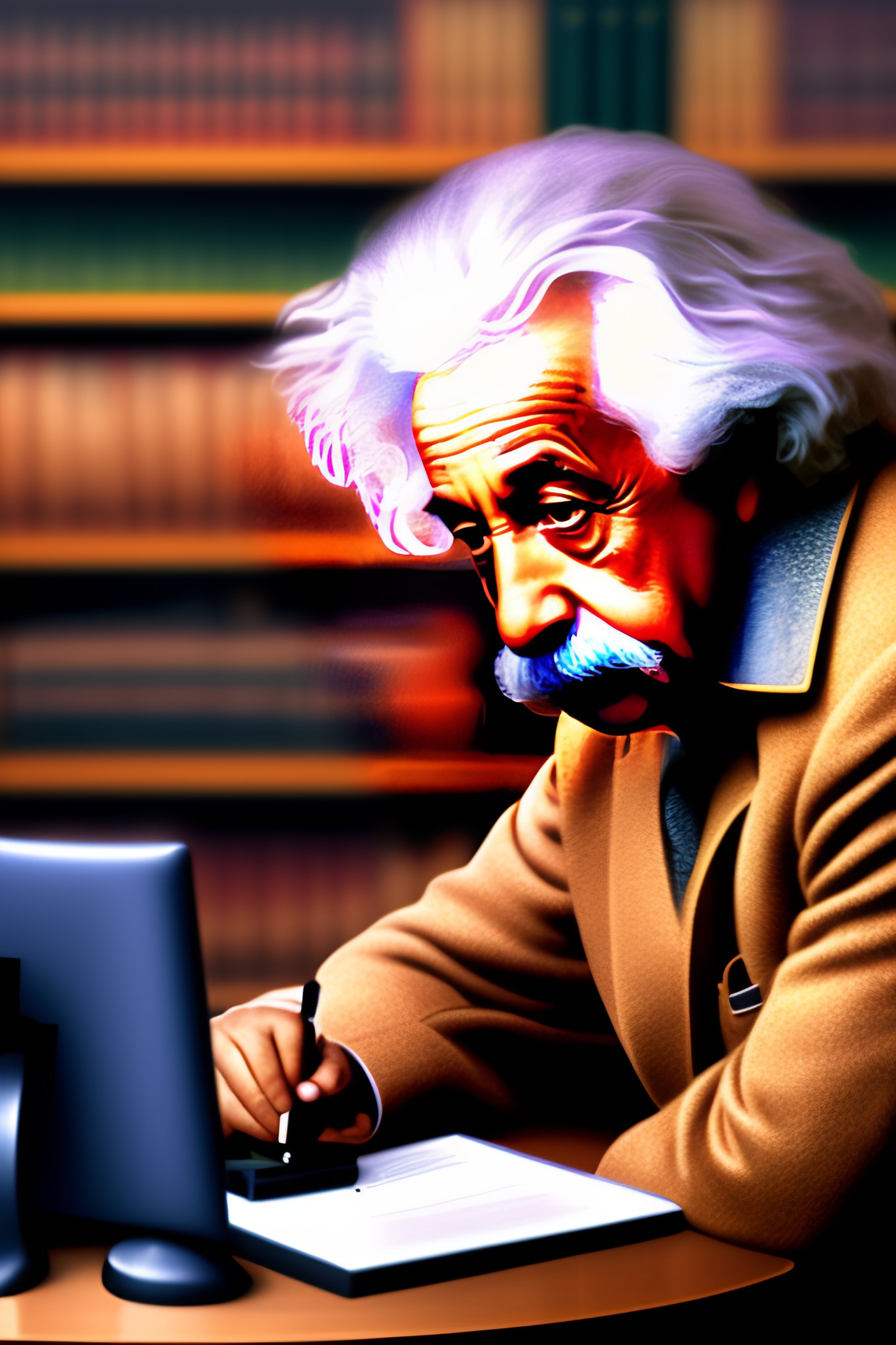Albert einstein in a library typing on a computer with octopus tentacles
