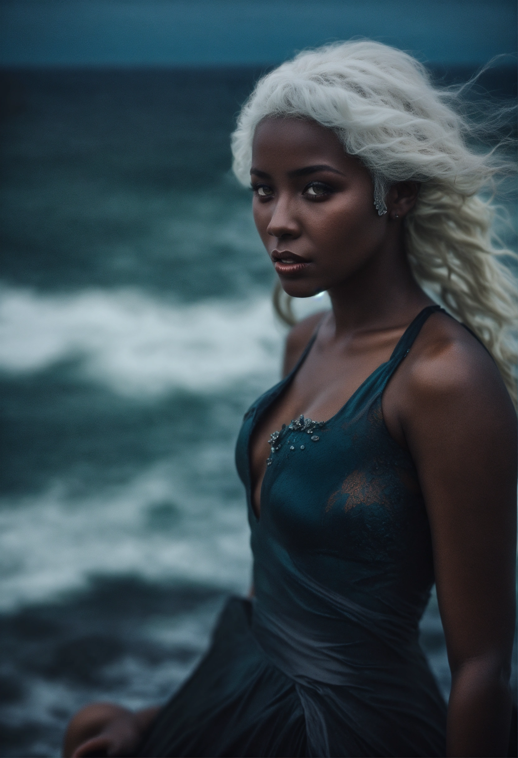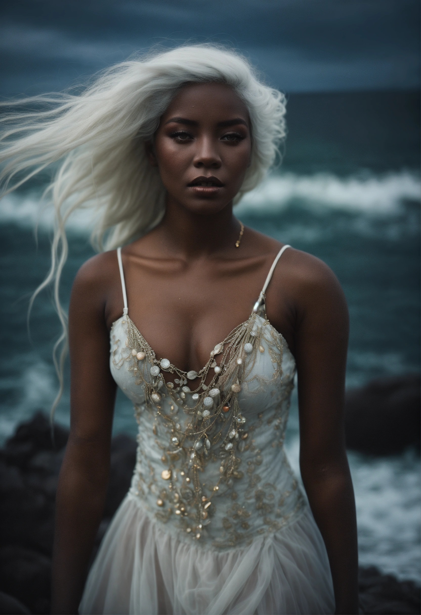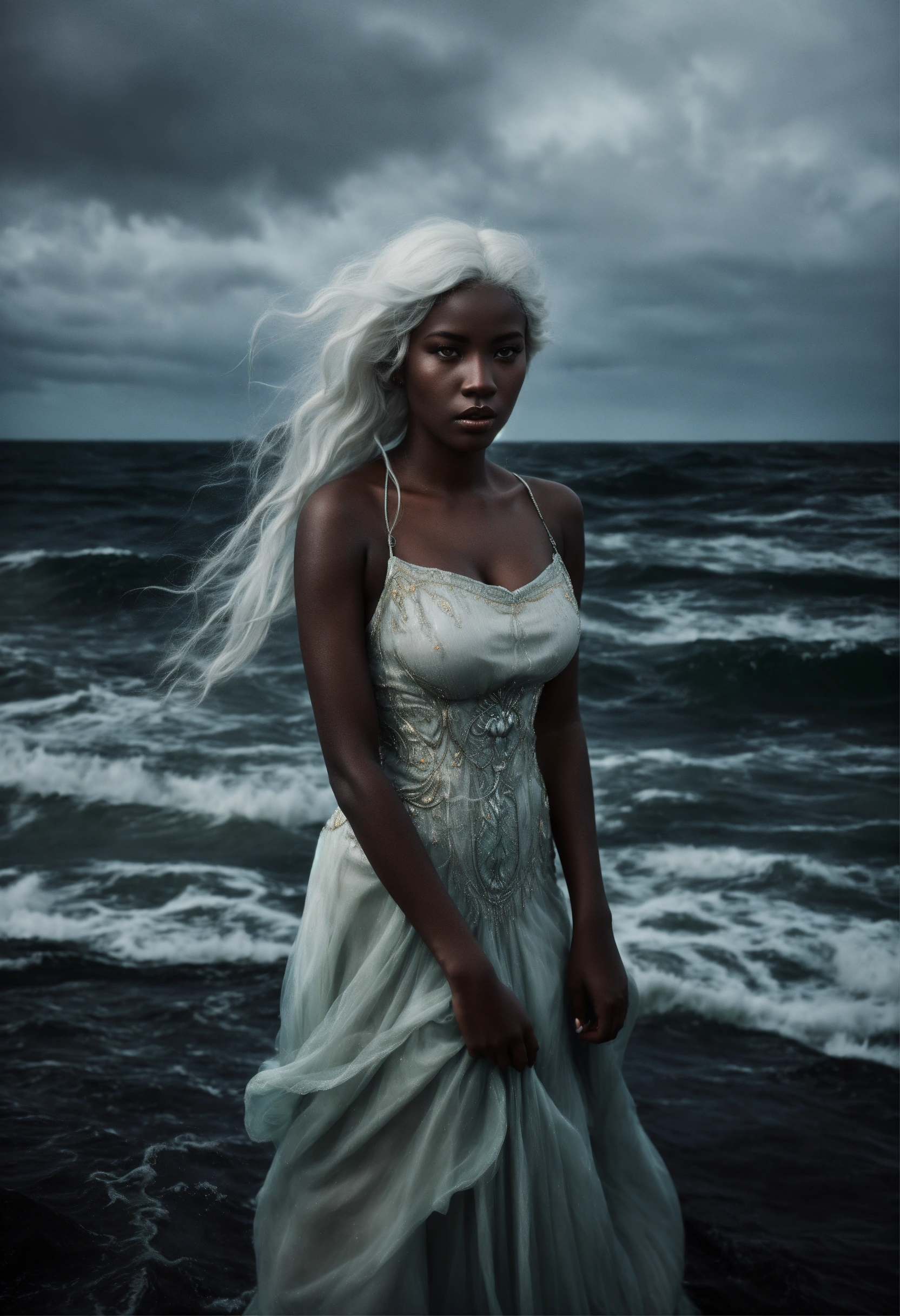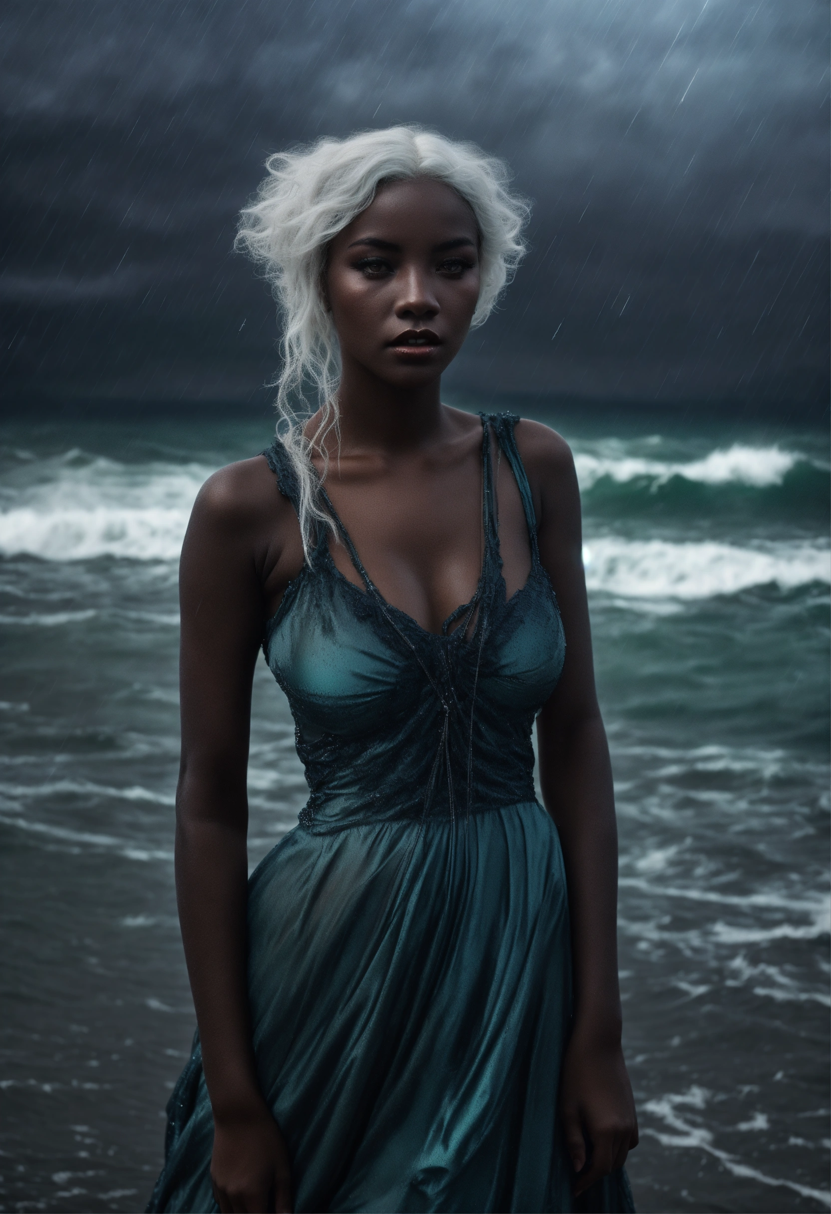 1910's 20 year old woman, white eyes, black skin, ethereal, sharp features, mermaid, scary, evil, 1910's skin tight clothes poor dress, white hair, by the dark ocean, in storm