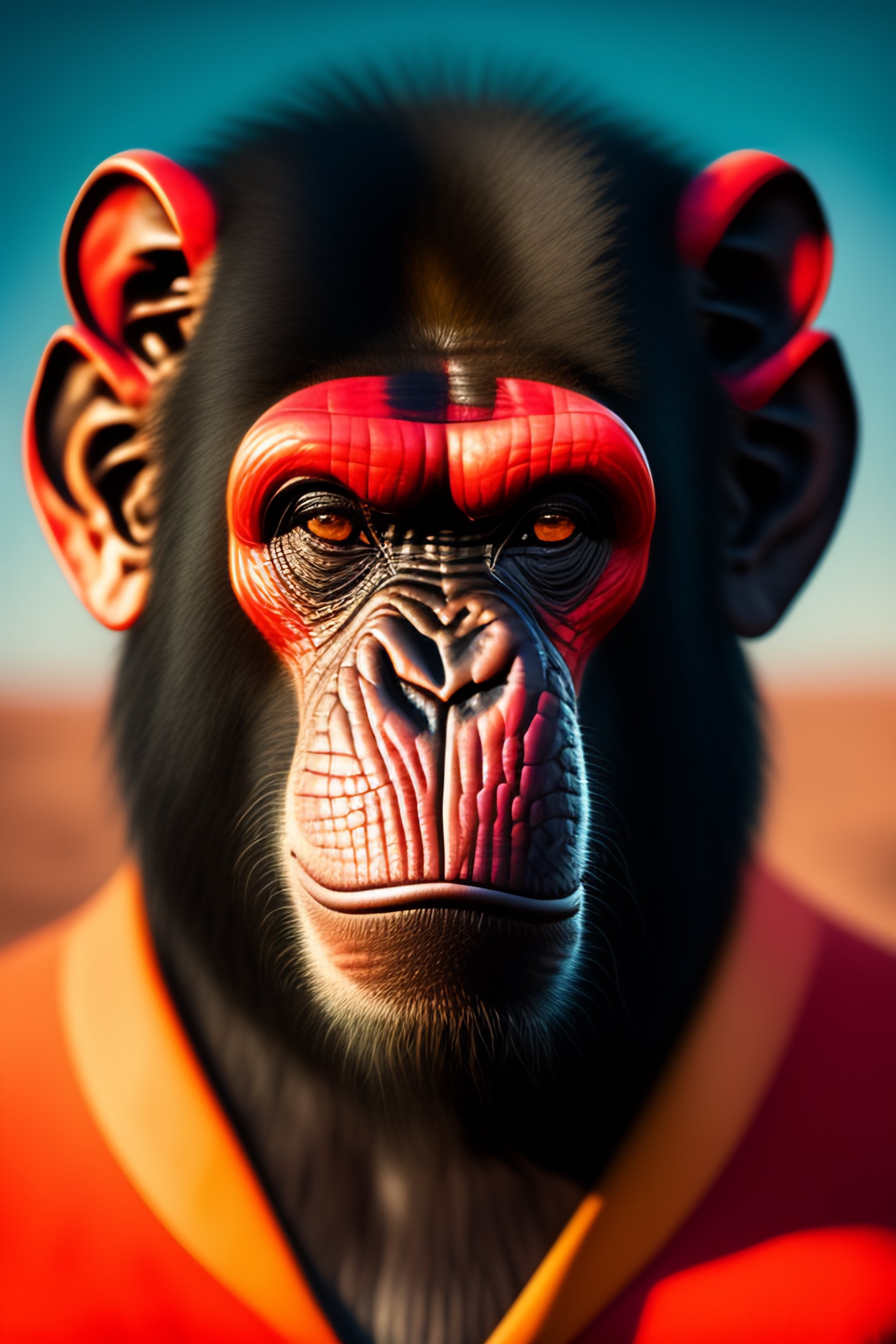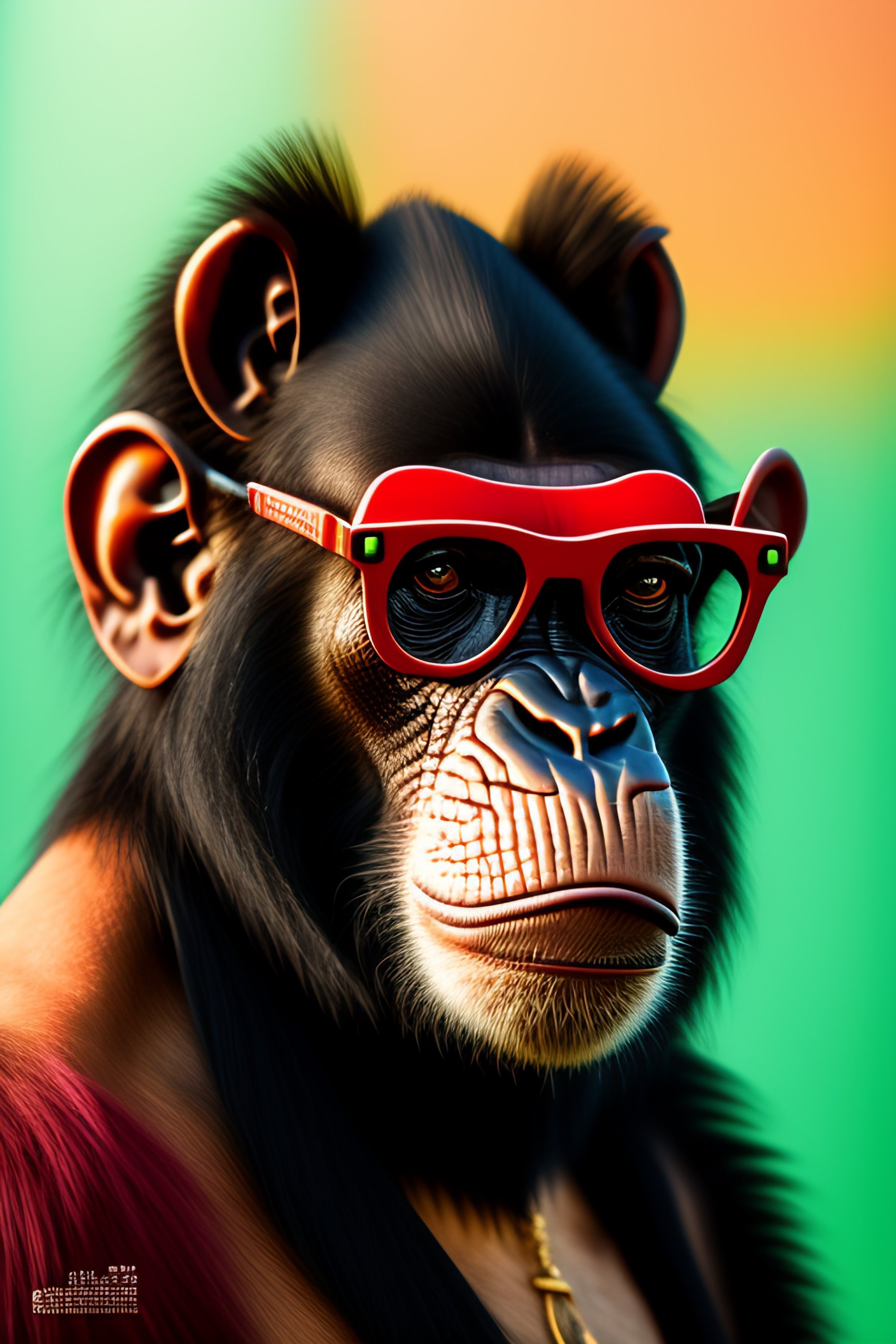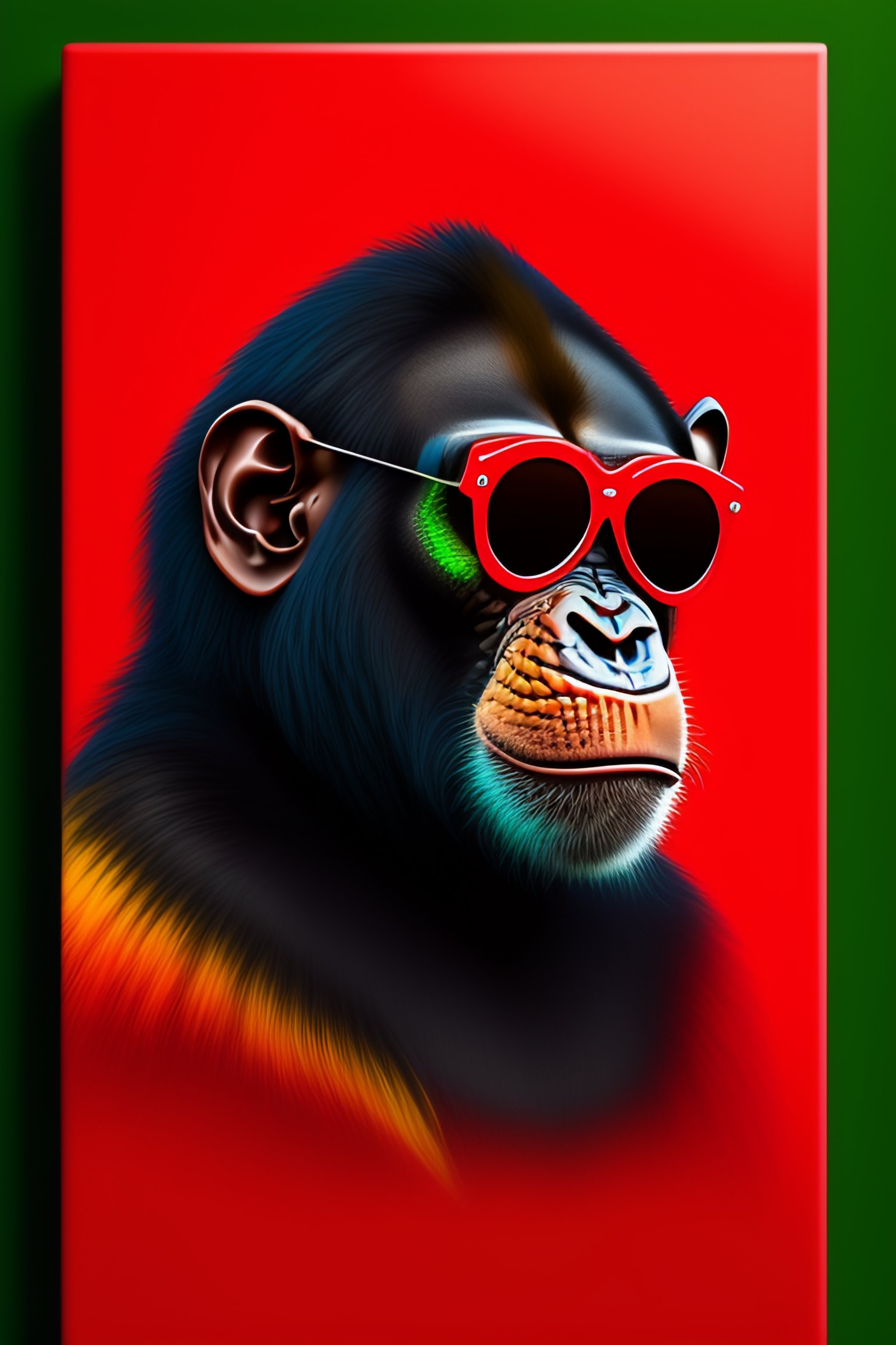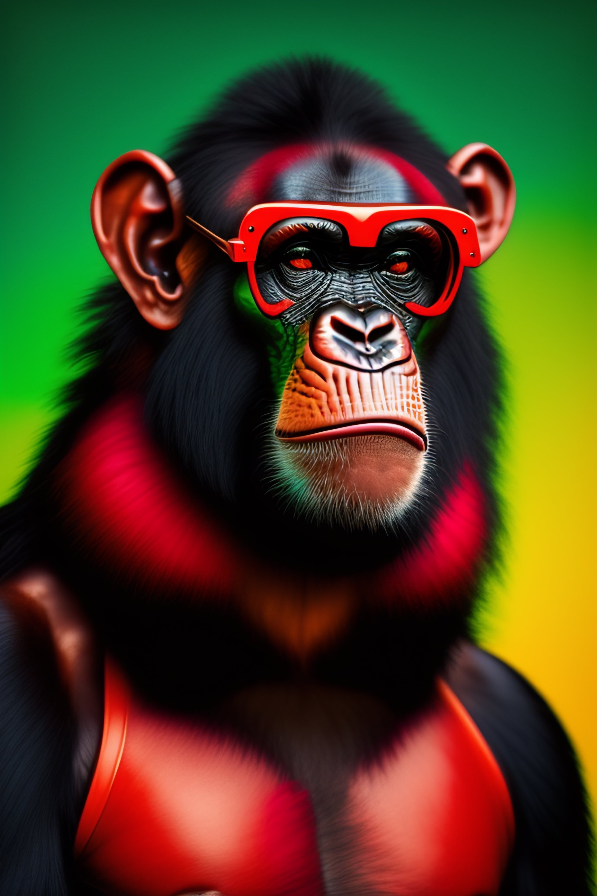 Retrato de un chimpancé payaso disfrazado de lobo con una cresta punky roja y blanca en la cabeza y con gafas de sol negras y la piel de la cara verde