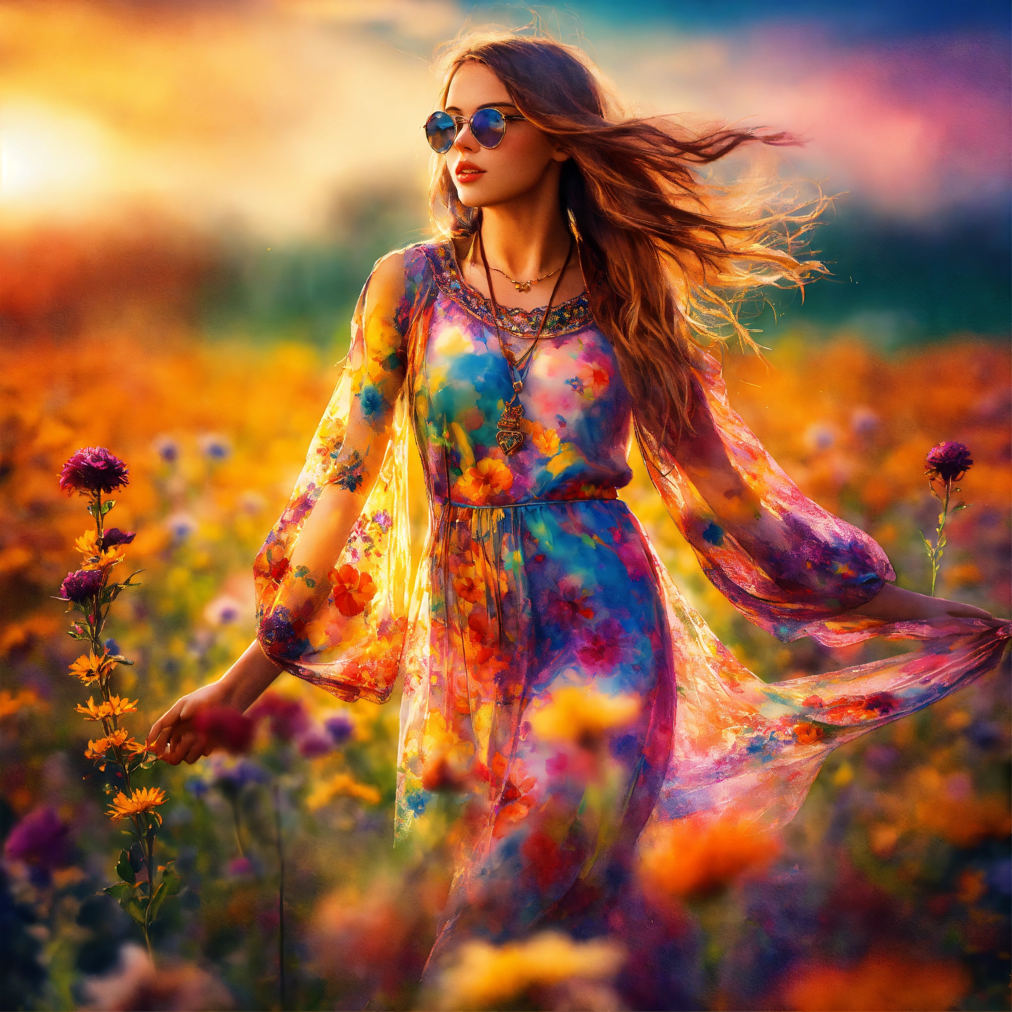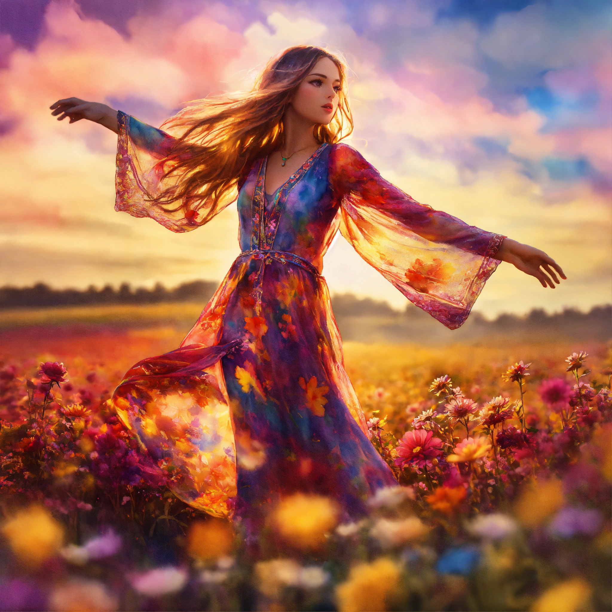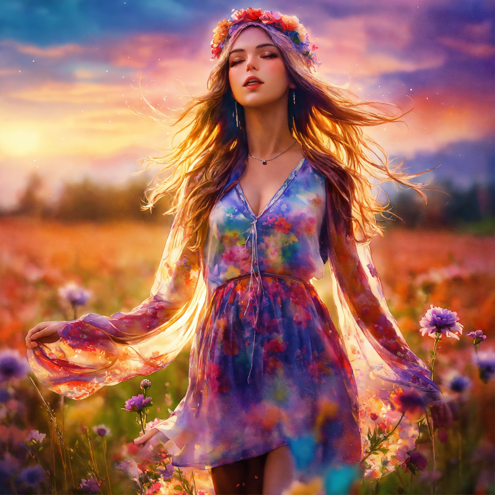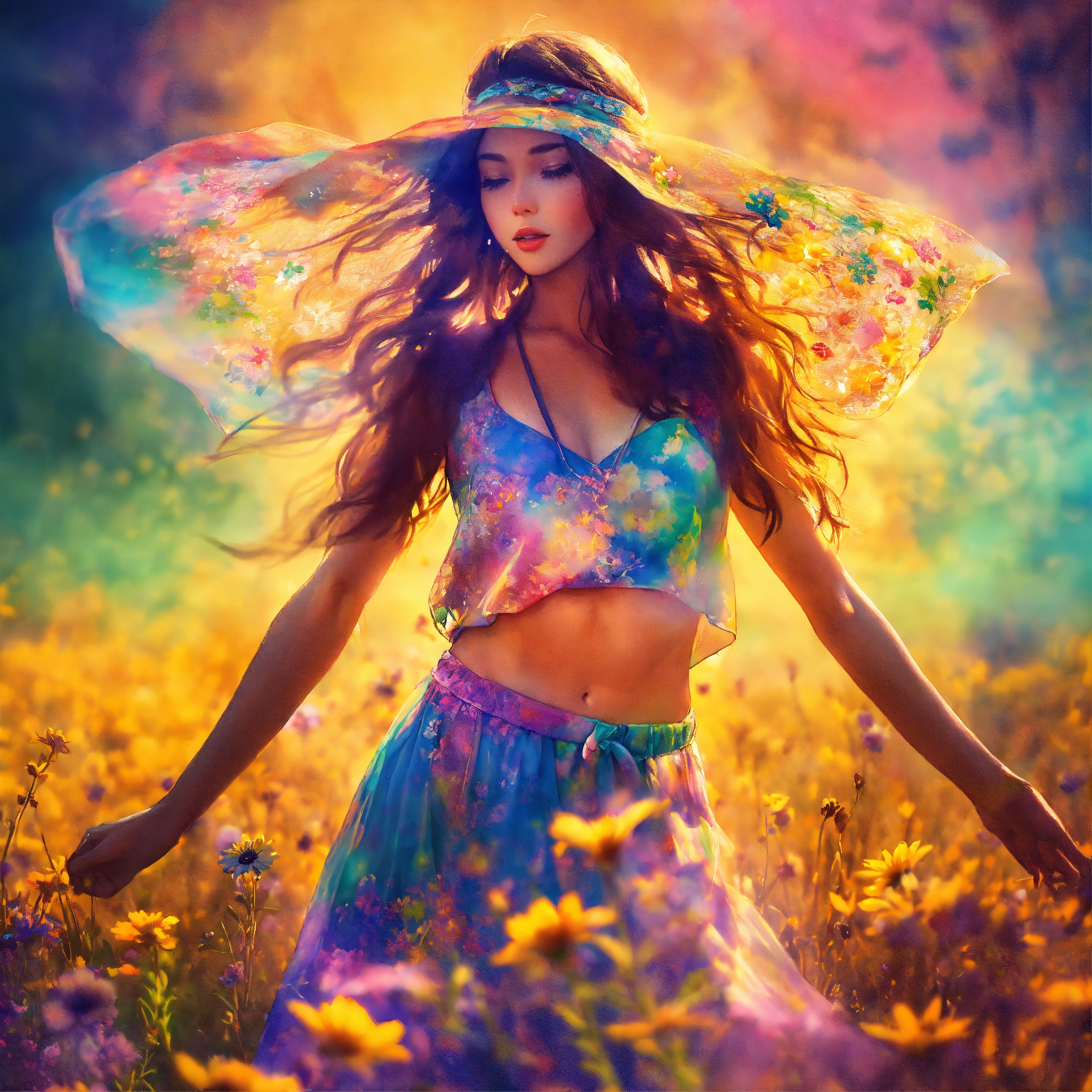 Hippie girl wearing see-through garment, flowers, dancing in the field, a watercolor painting, saturated colors, double exposure, shallow focus, radial blur, strong vignette, split lighting, highly detailed, hyper realistic footage.