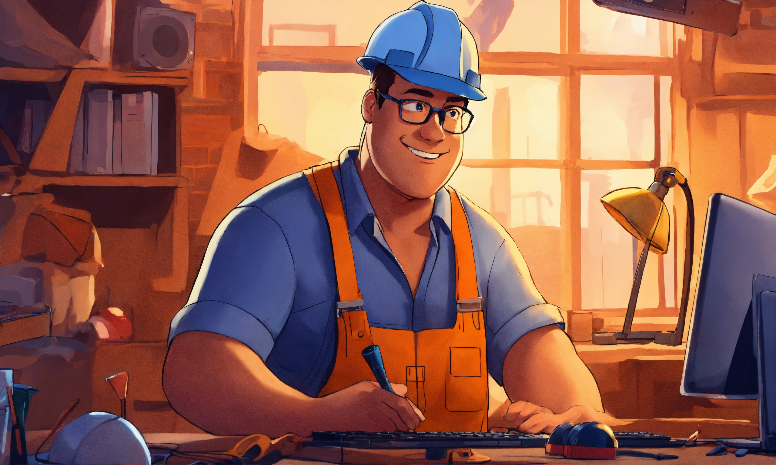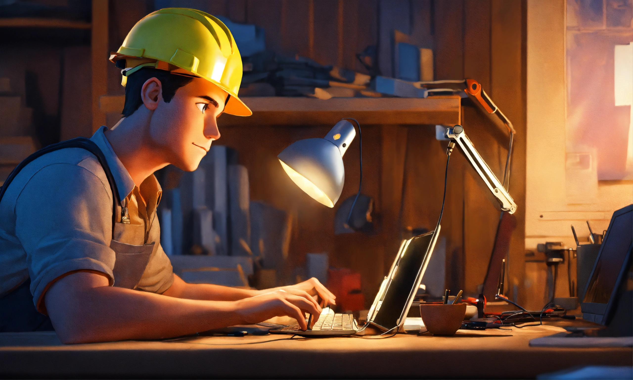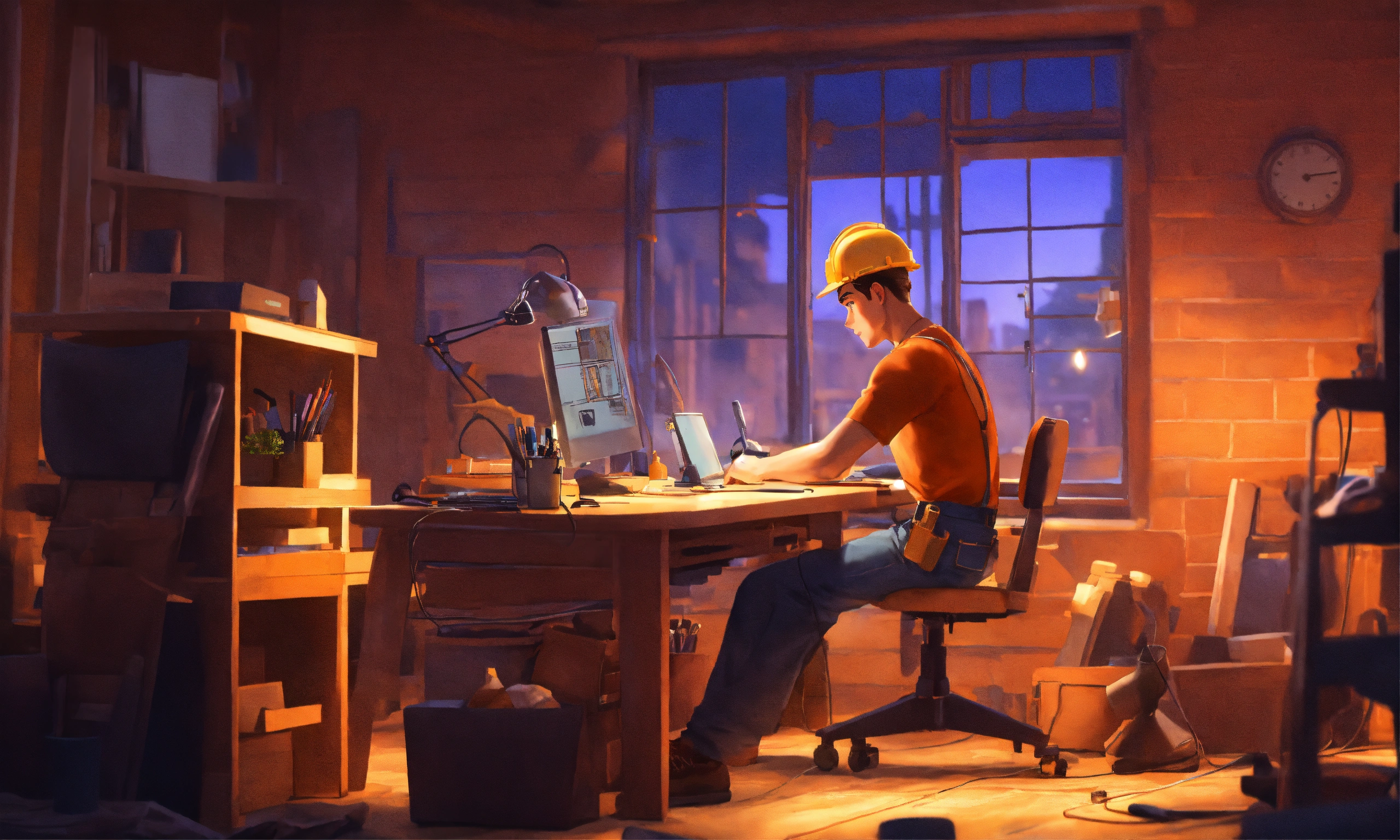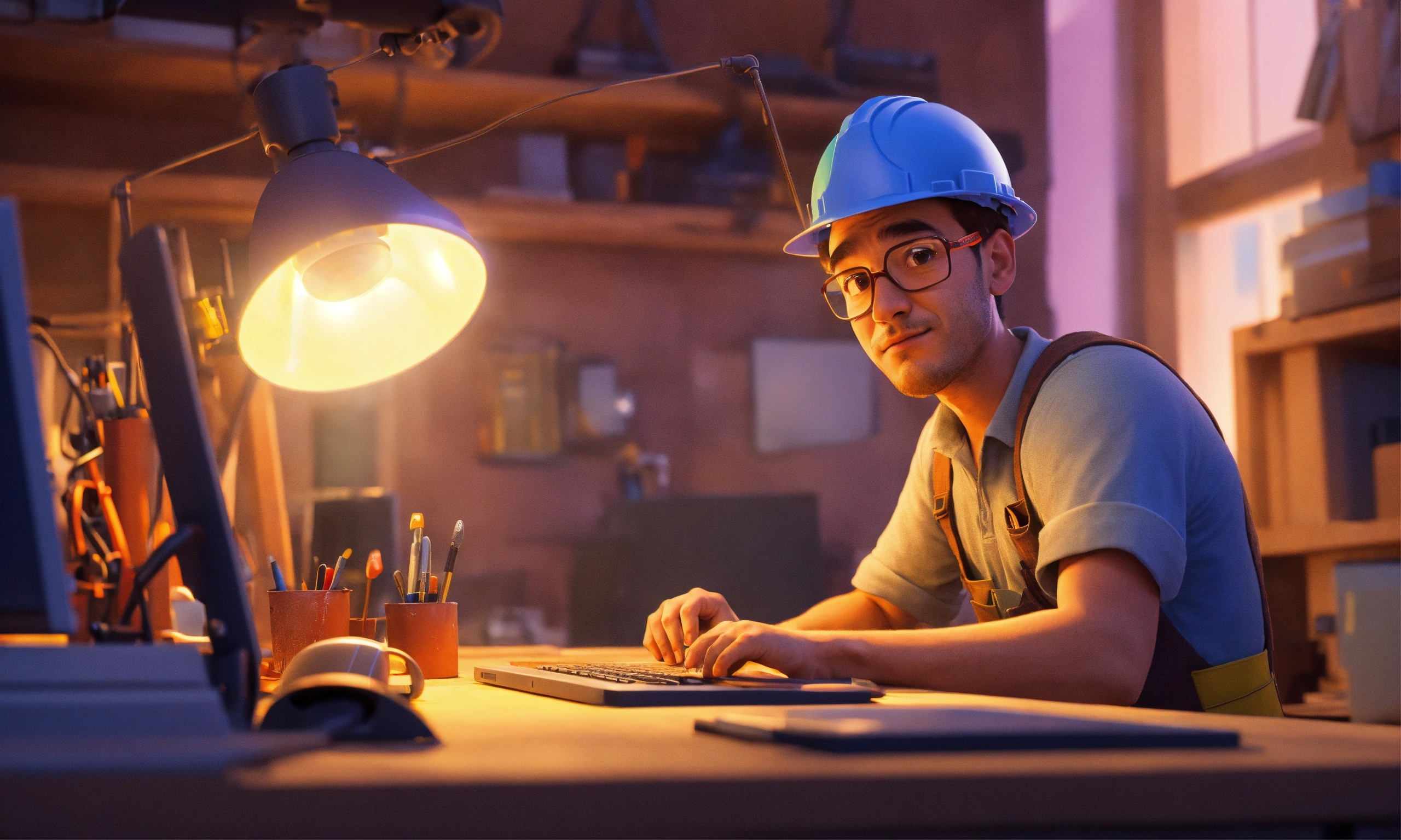 Generate a disney pixar style image, man working hard in front of his computer after a day of work, he is a construction worker
