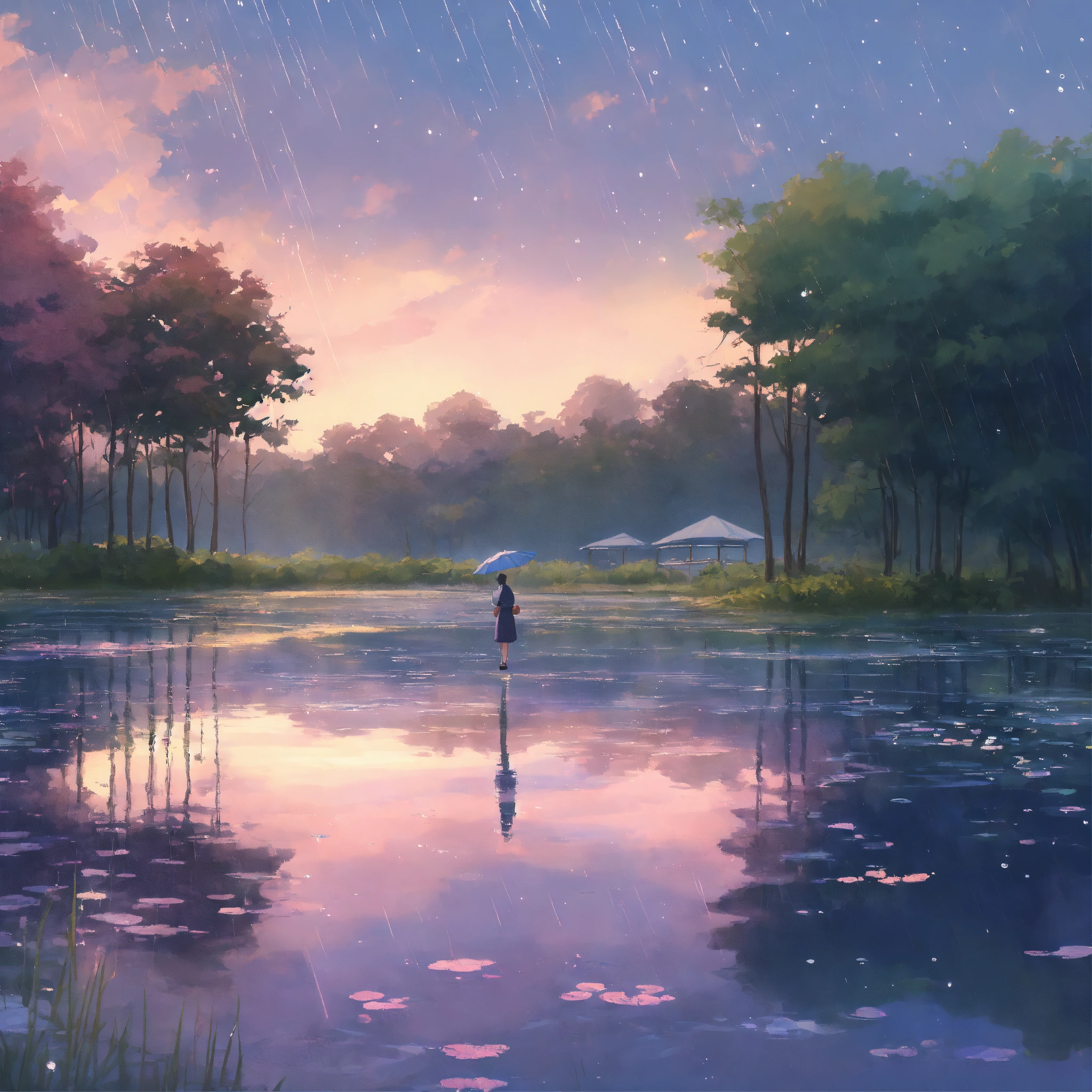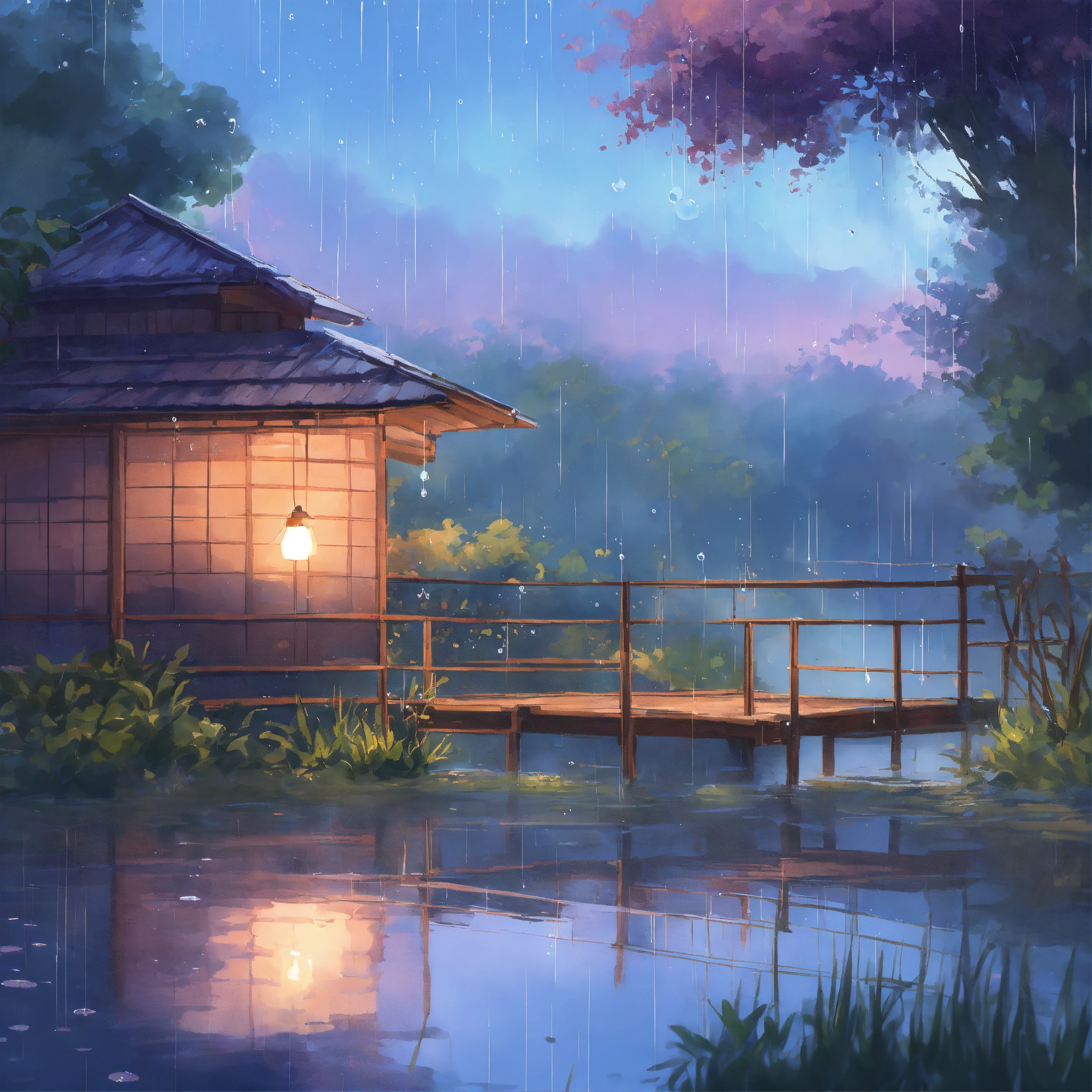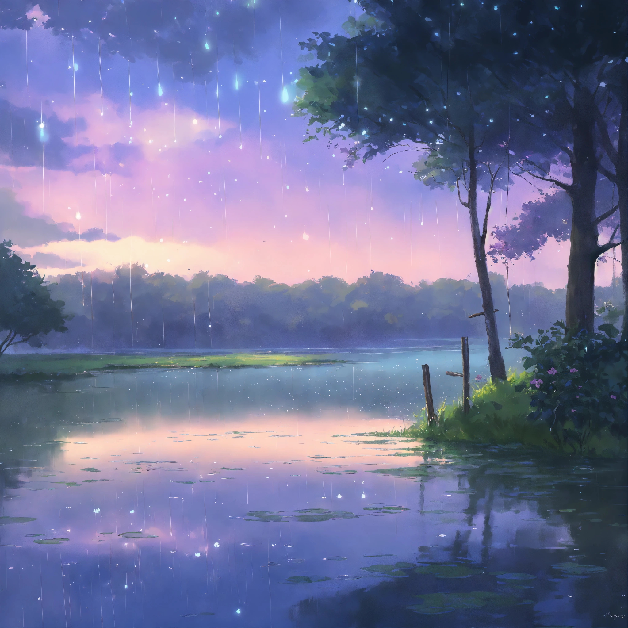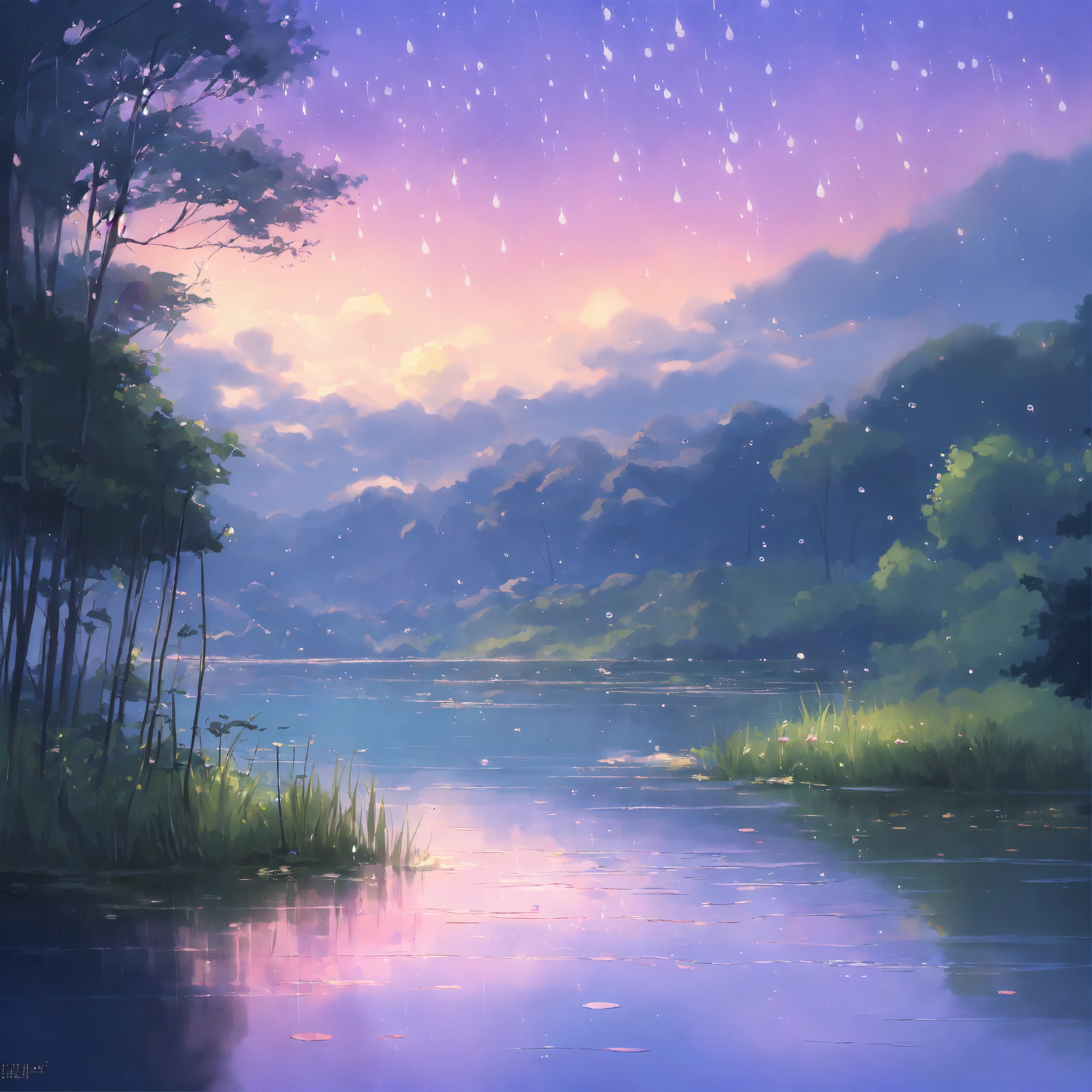 A peaceful scene of raindrops falling on a tranquil pond, creating ripples in the water, with soft, muted tones and a sense of stillness, conveying a meditative atmosphere., surrounded by a dreamy, pastel-colored backdrop. the scene exudes a sense of peace and contentment despite the rain. digital art painting by makoto shinkai and ghibli studio, diffuse lighting, cinematic, lighting, highly detailed, incredible quality gazing up at a starry night sky. soft hues of blues and purples dominate the color palette, creating a dreamy atmosphere.