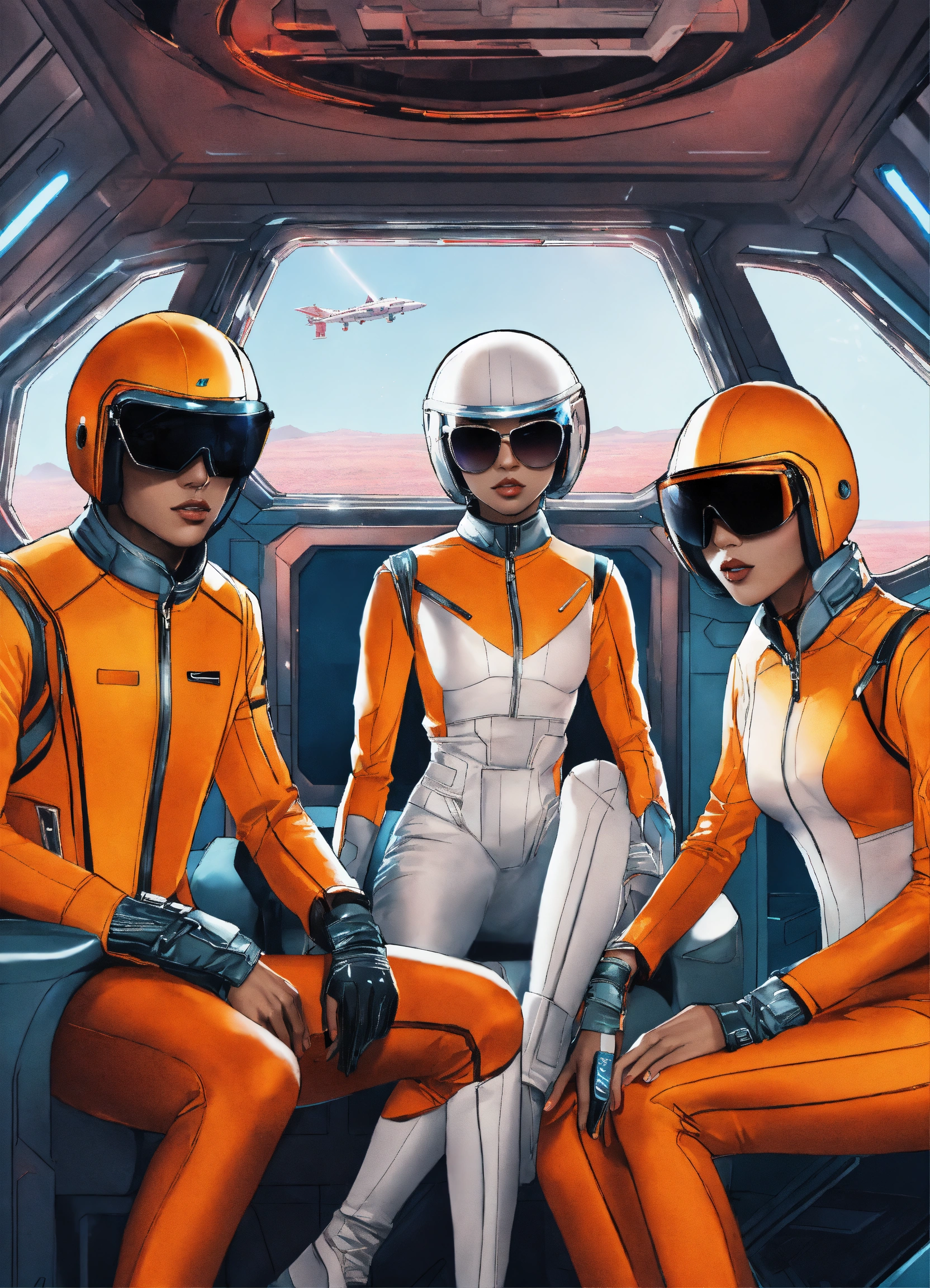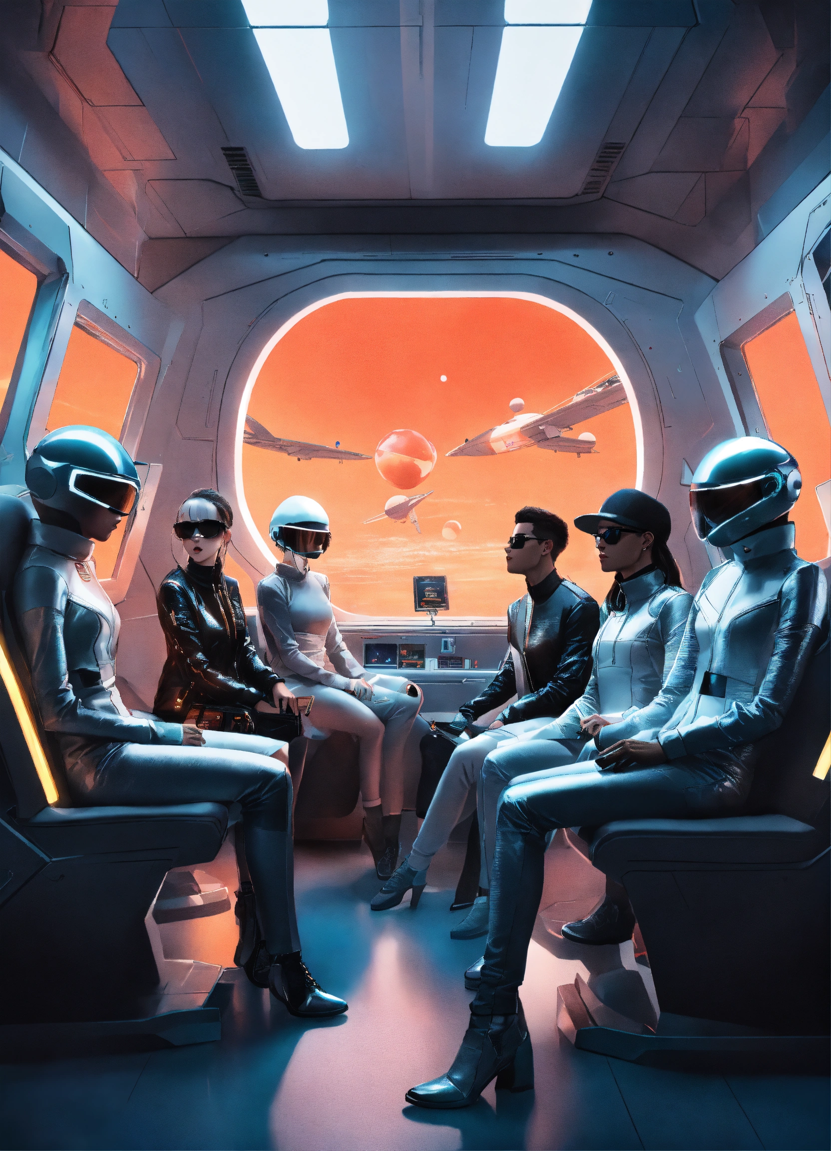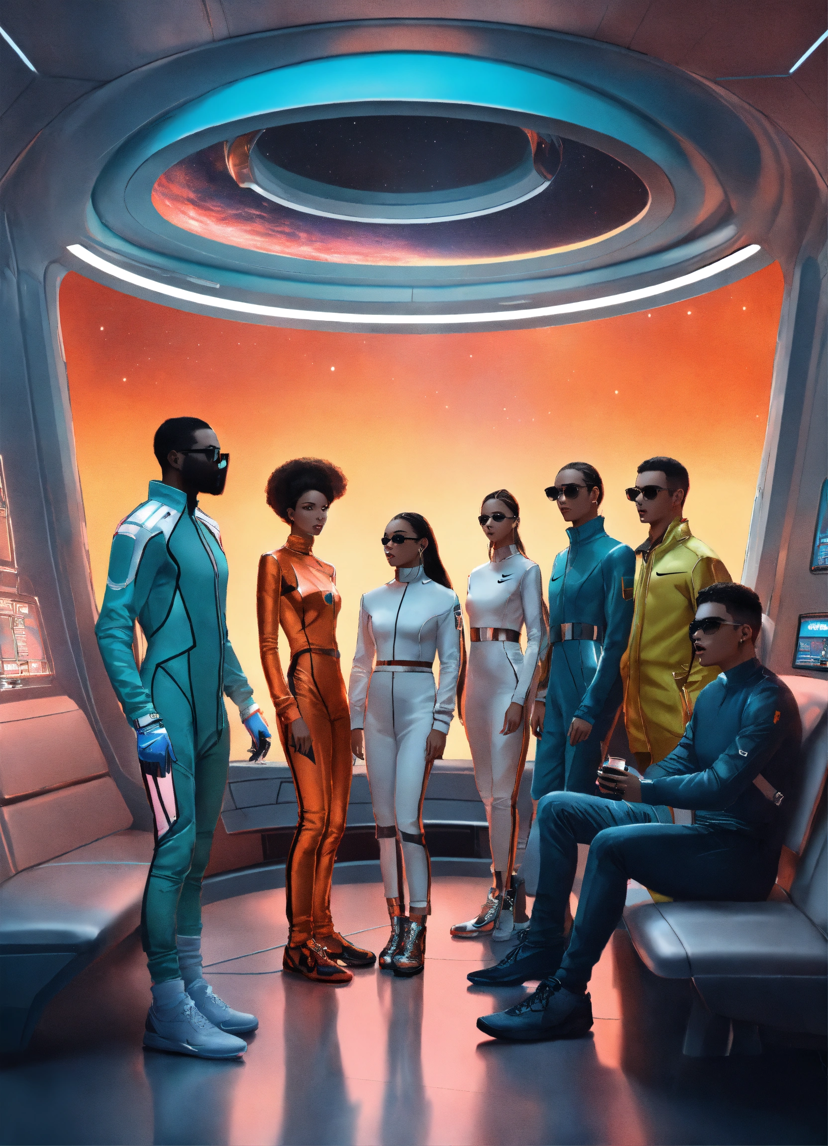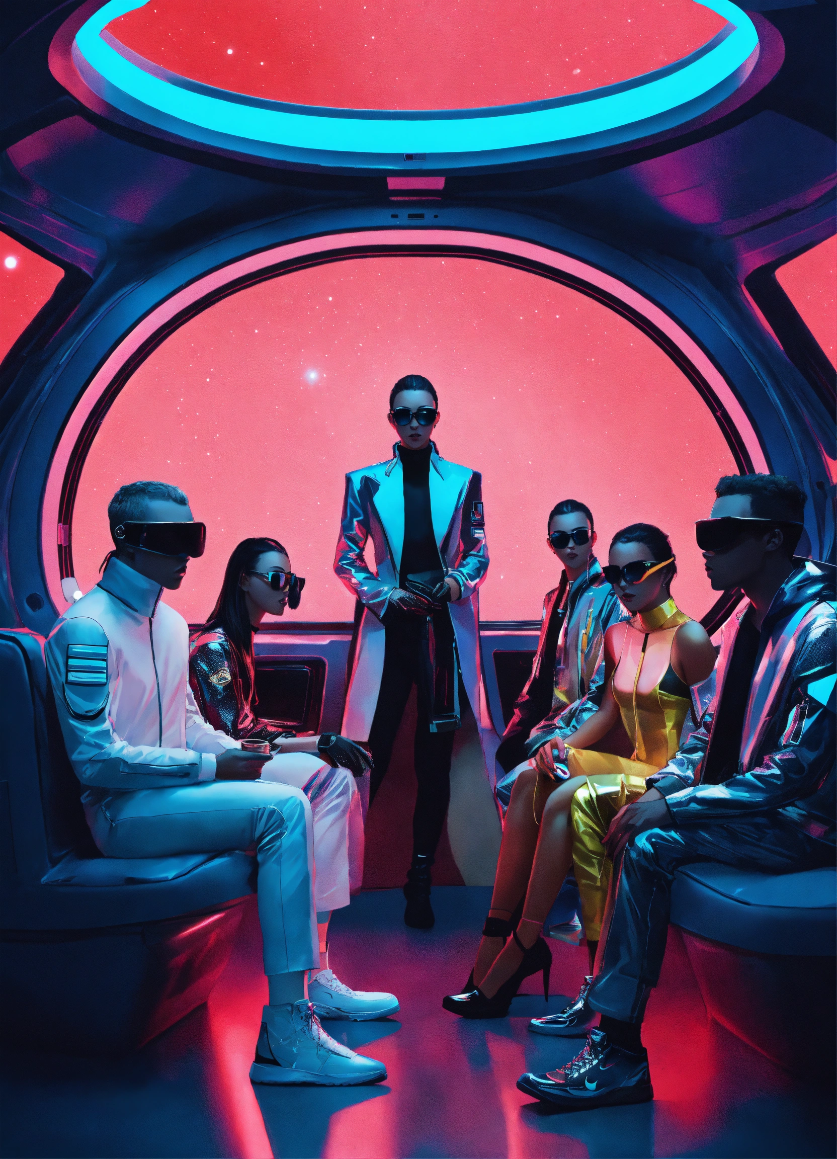 Five men and women passengers on a space ship with a window into space, dressed in different futuristic, minimal fashion outfits - based on mugler, dion lee, and nike streetwear, colors are greys, blacks, whites, and metallics, some are wearing sunglasses, background of a spaceship, drinking and partying, hyperrealistic