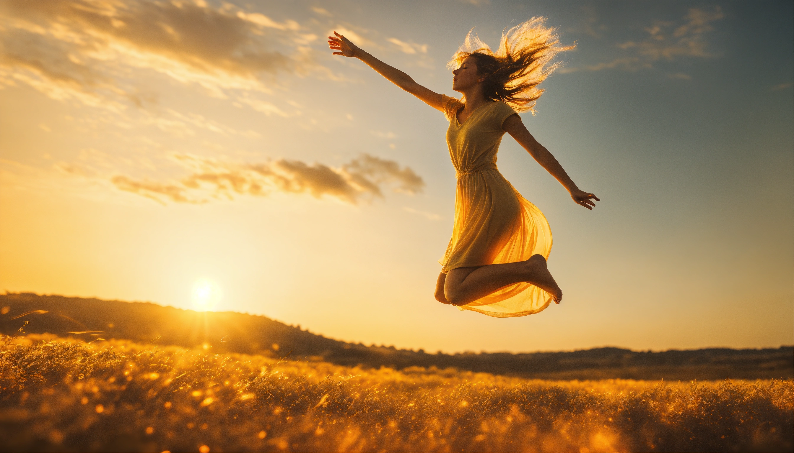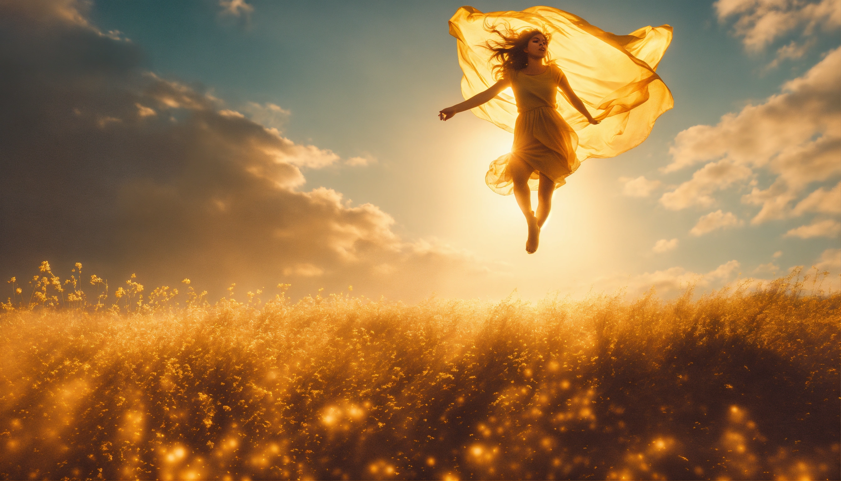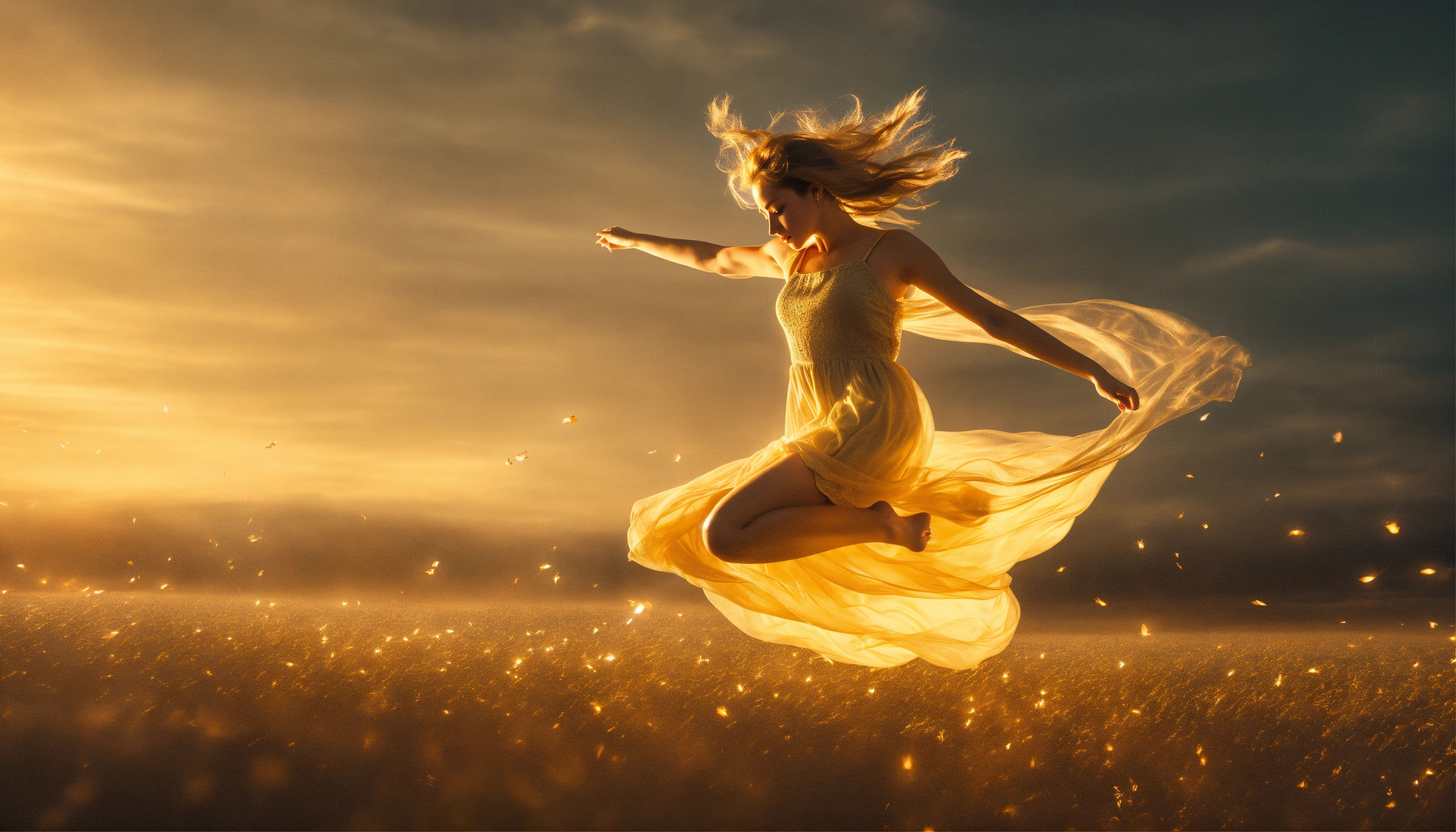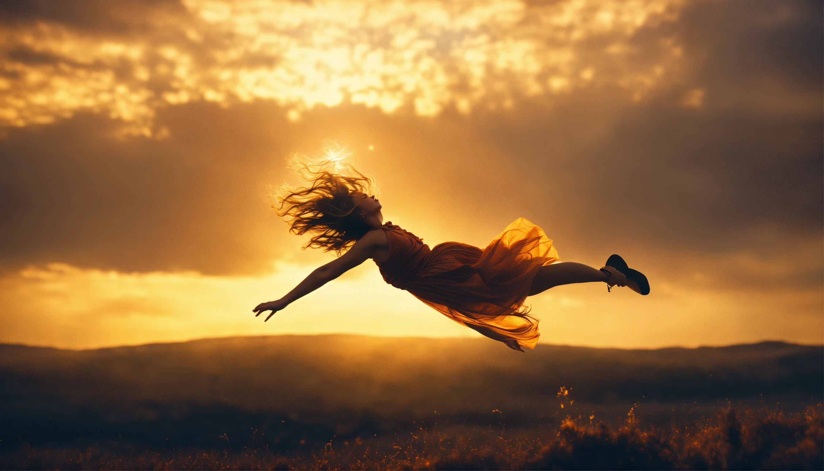 3d realistic surreal conceptual full body photo of glowing girl free falling down from the sky exposure solography, strong intentional camera movement, backlit, low contrast, soft golden light