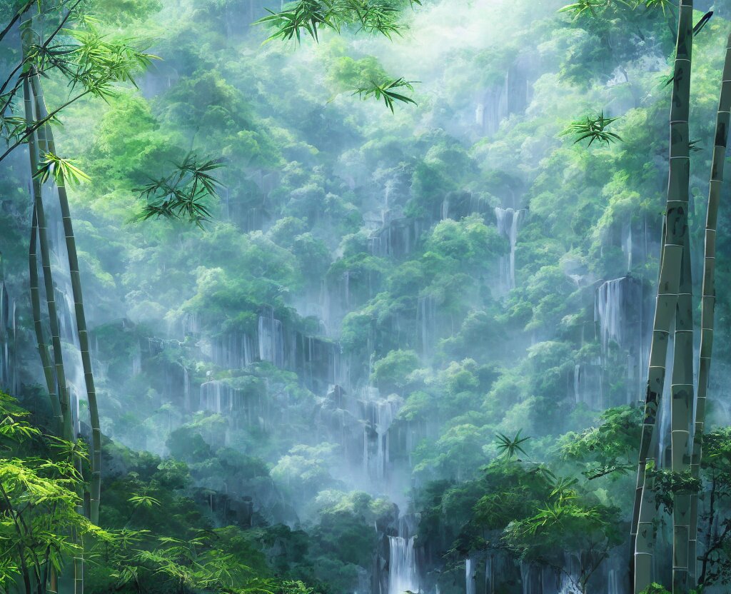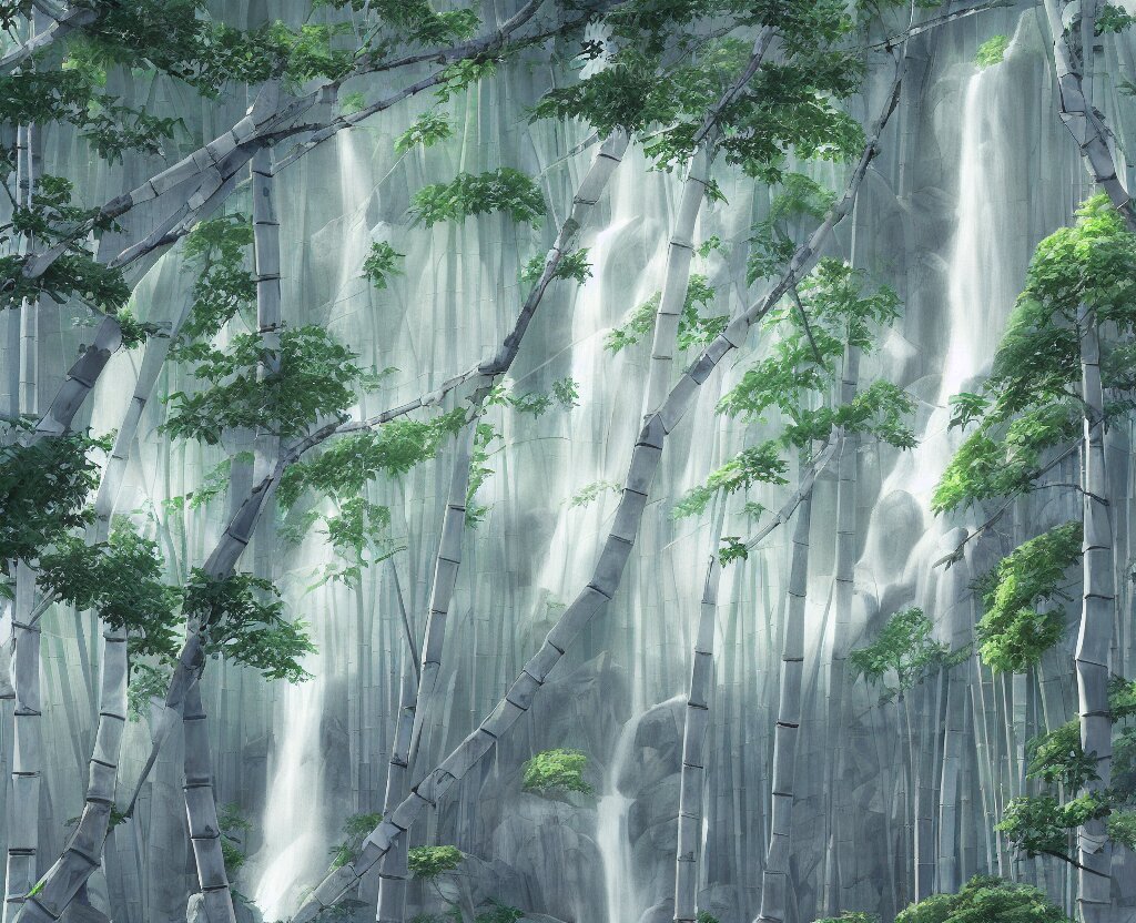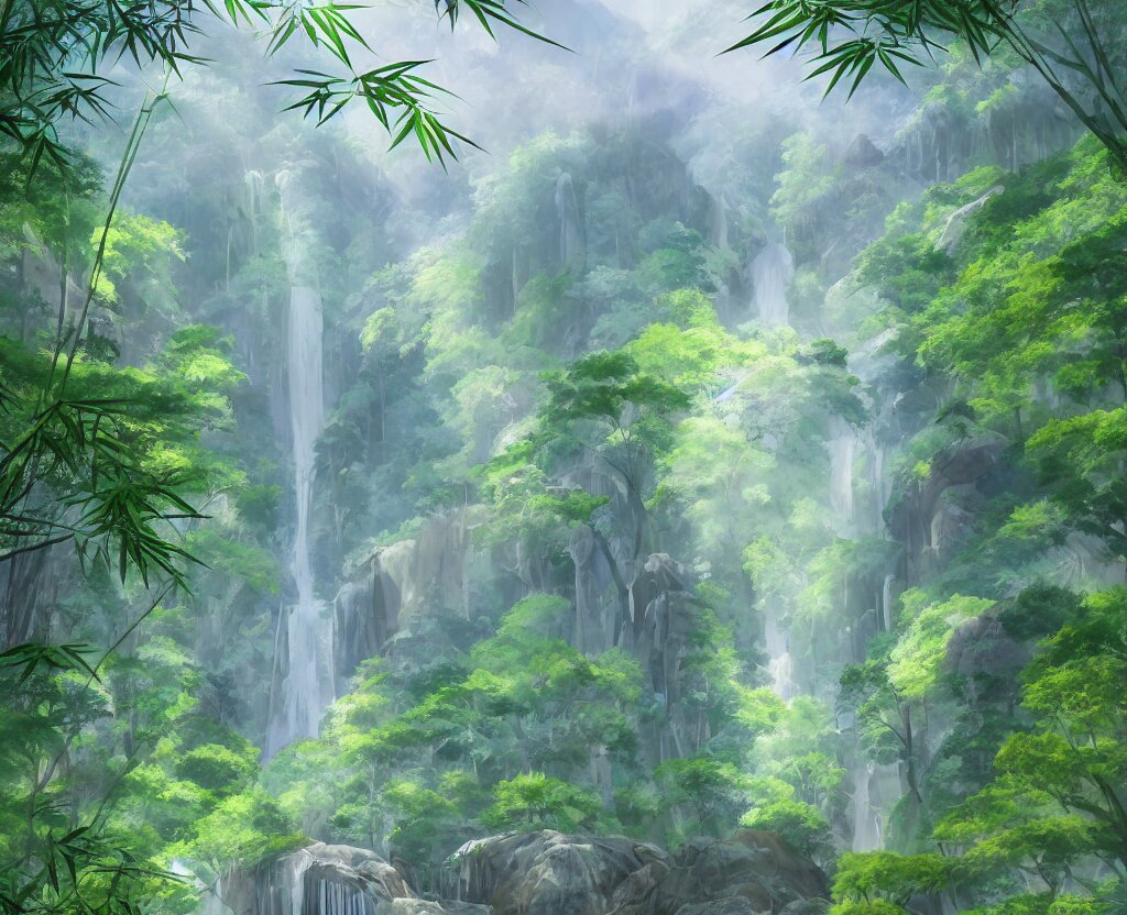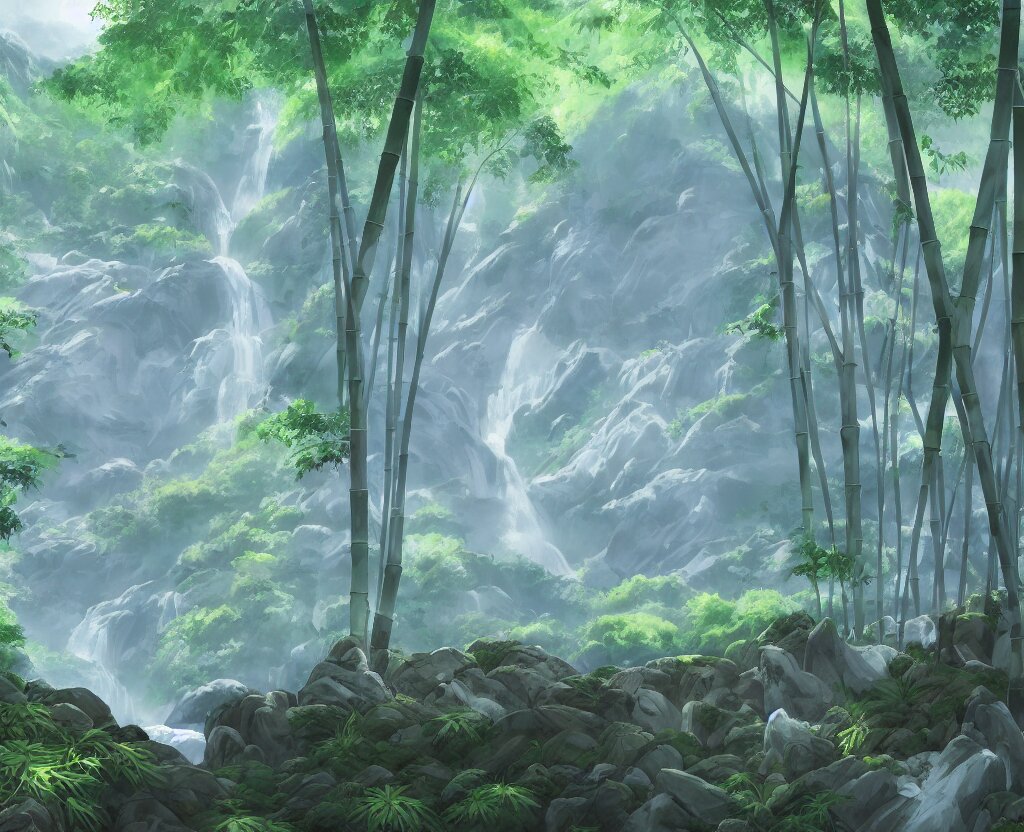 Misty japanese bamboo forest, cell shaded, huge waterfall, large rocky mountain, drawing, stylized anime, sun rays, soft, by hayao miyazaki, ghibli studio, makoto shinkai, toei animation, studio trigger, trending on artstation, 4 k, hd