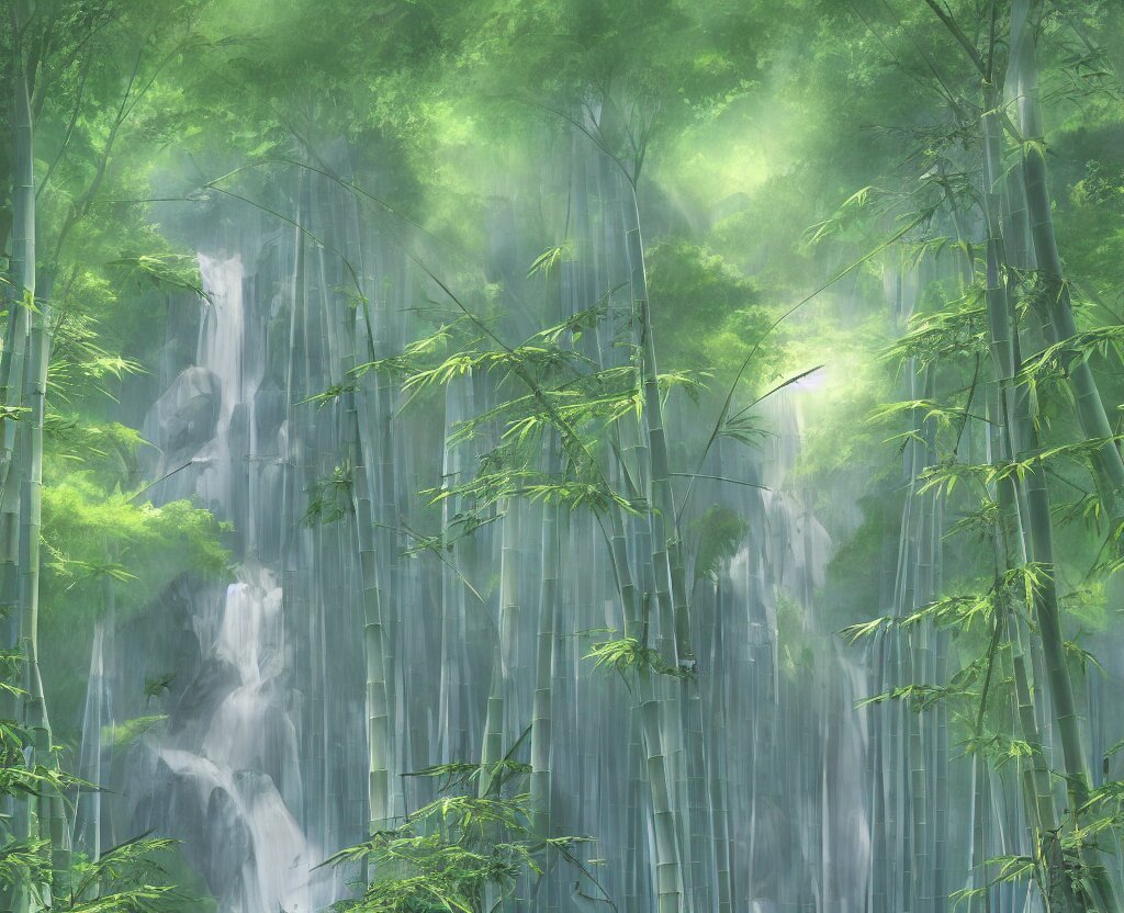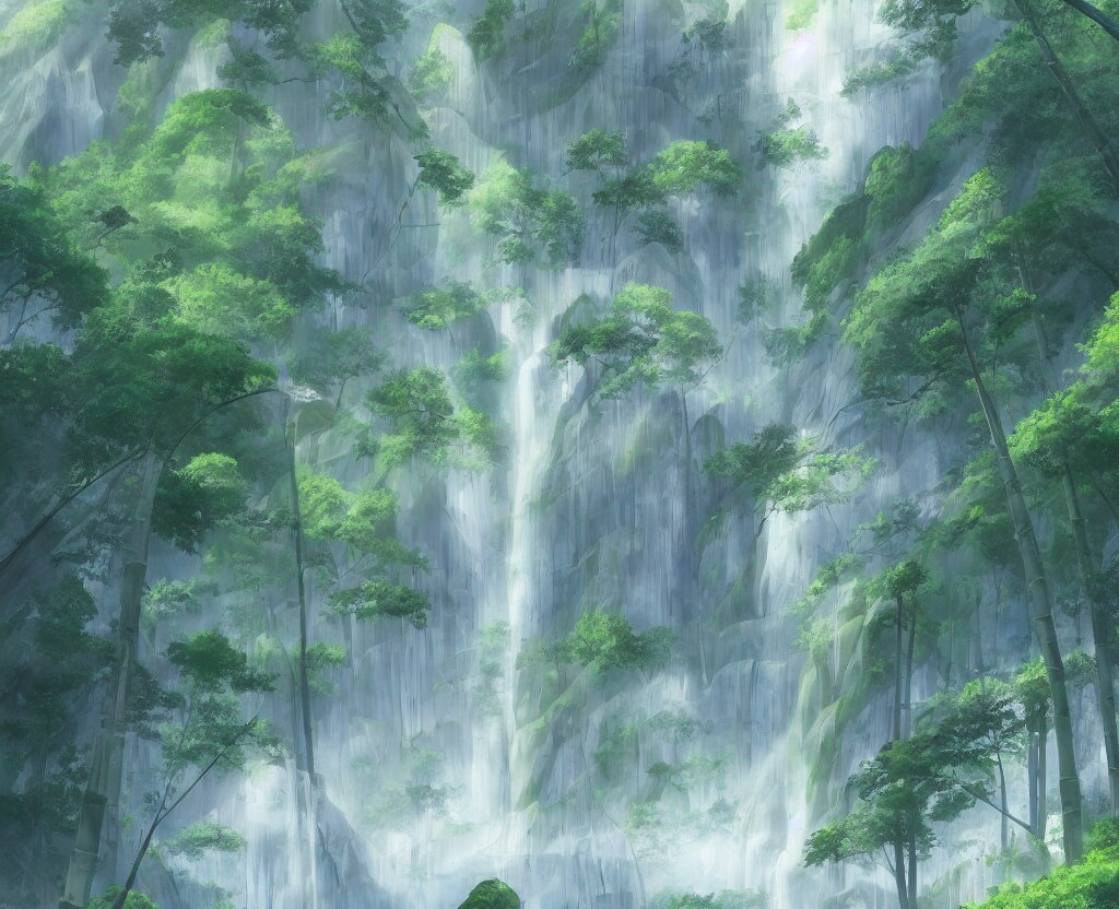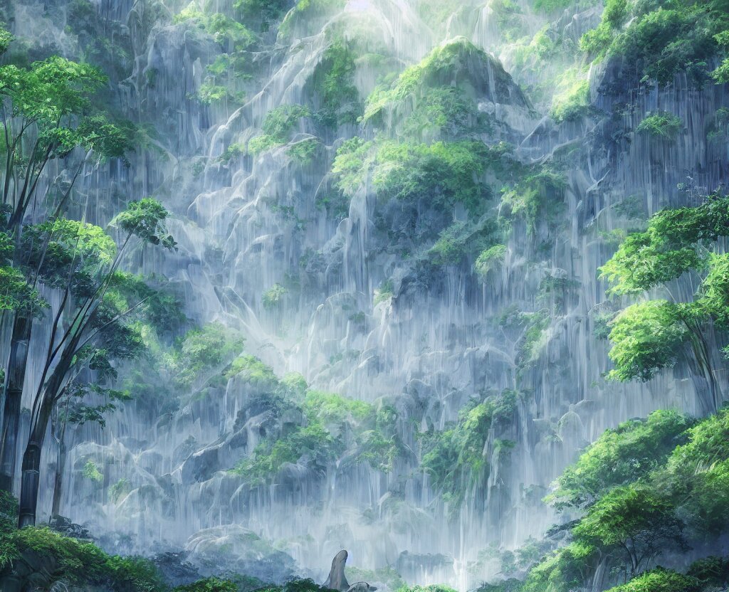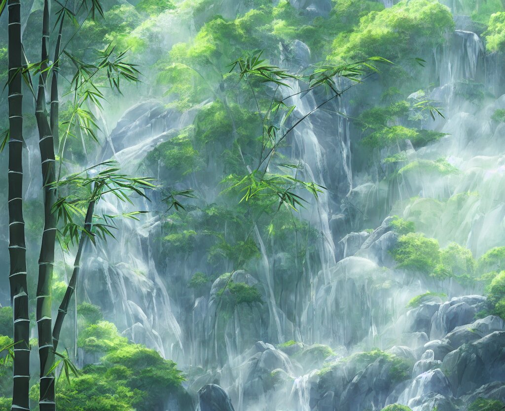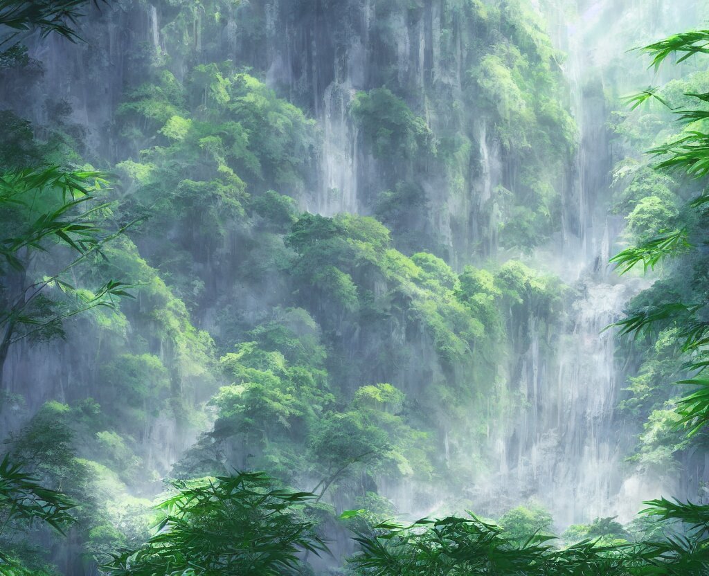 Misty japanese bamboo forest, cell shaded, huge waterfall, large rocky mountain, drawing, stylized anime, sun rays, soft, by hayao miyazaki, ghibli studio, makoto shinkai, toei animation, studio trigger, trending on artstation, 4 k, hd
