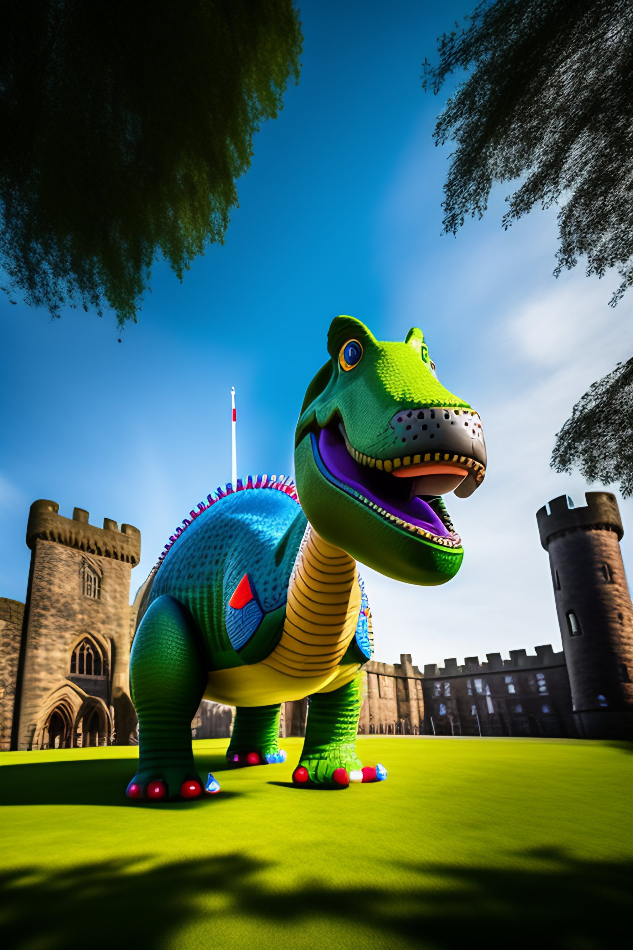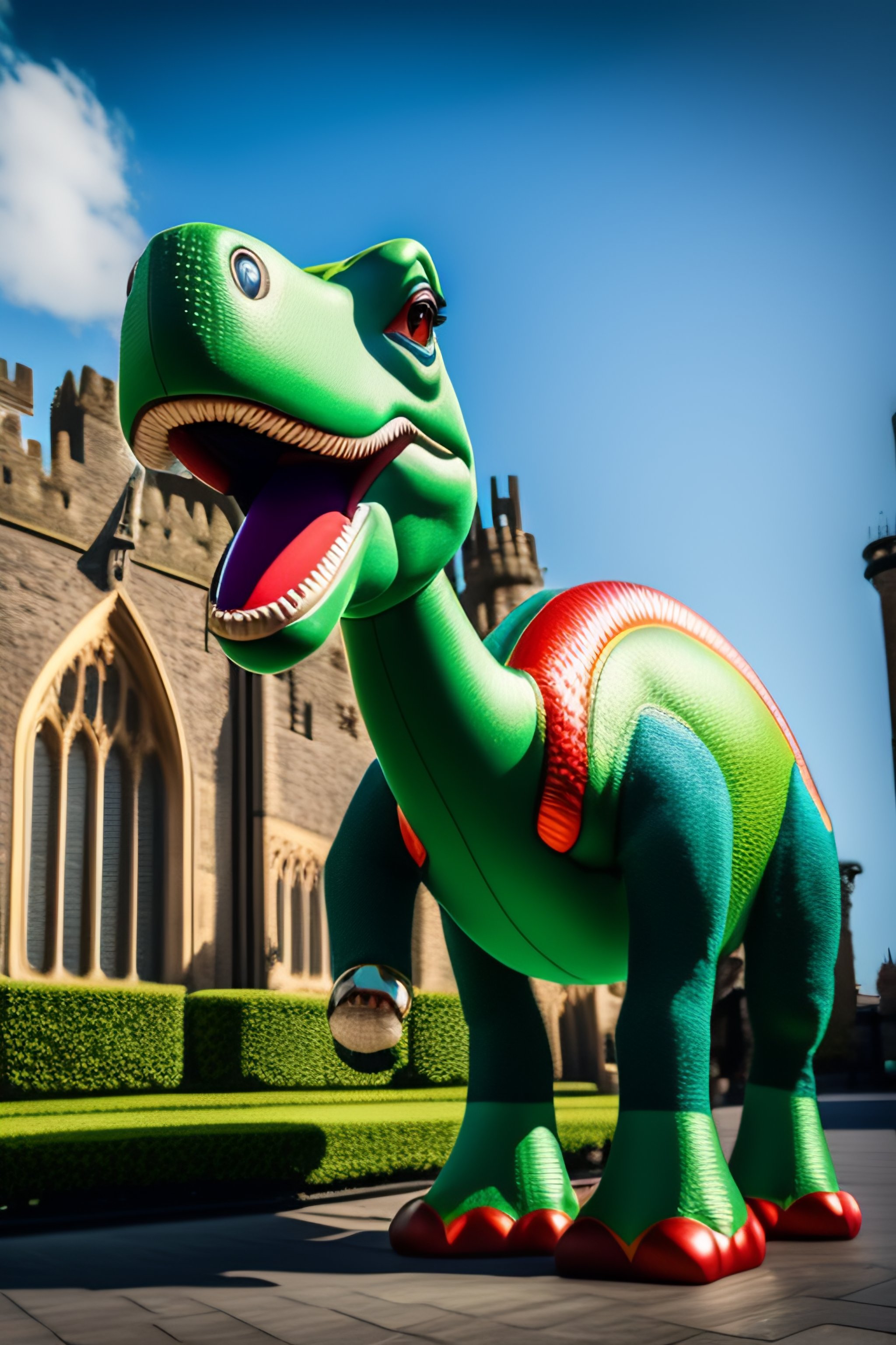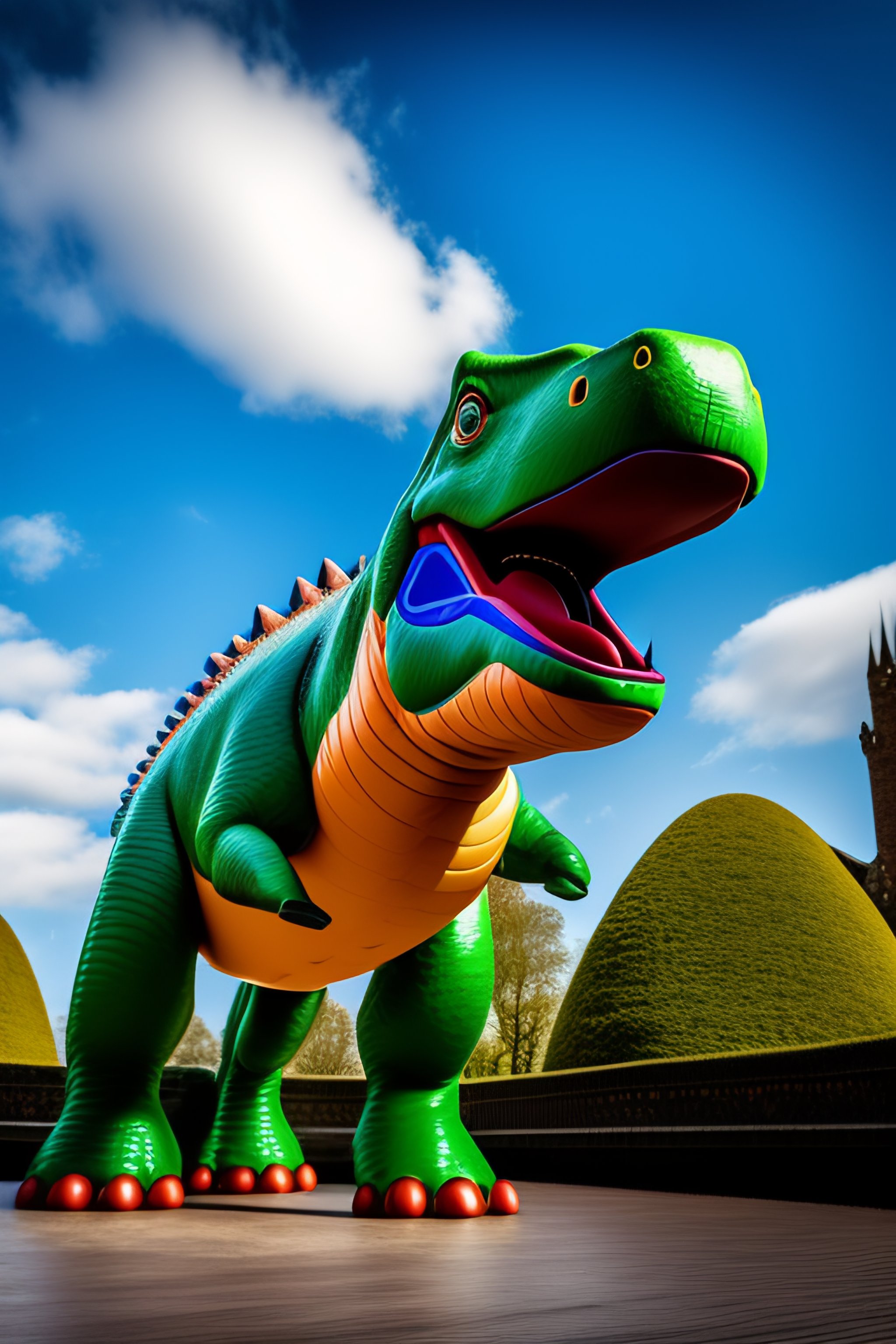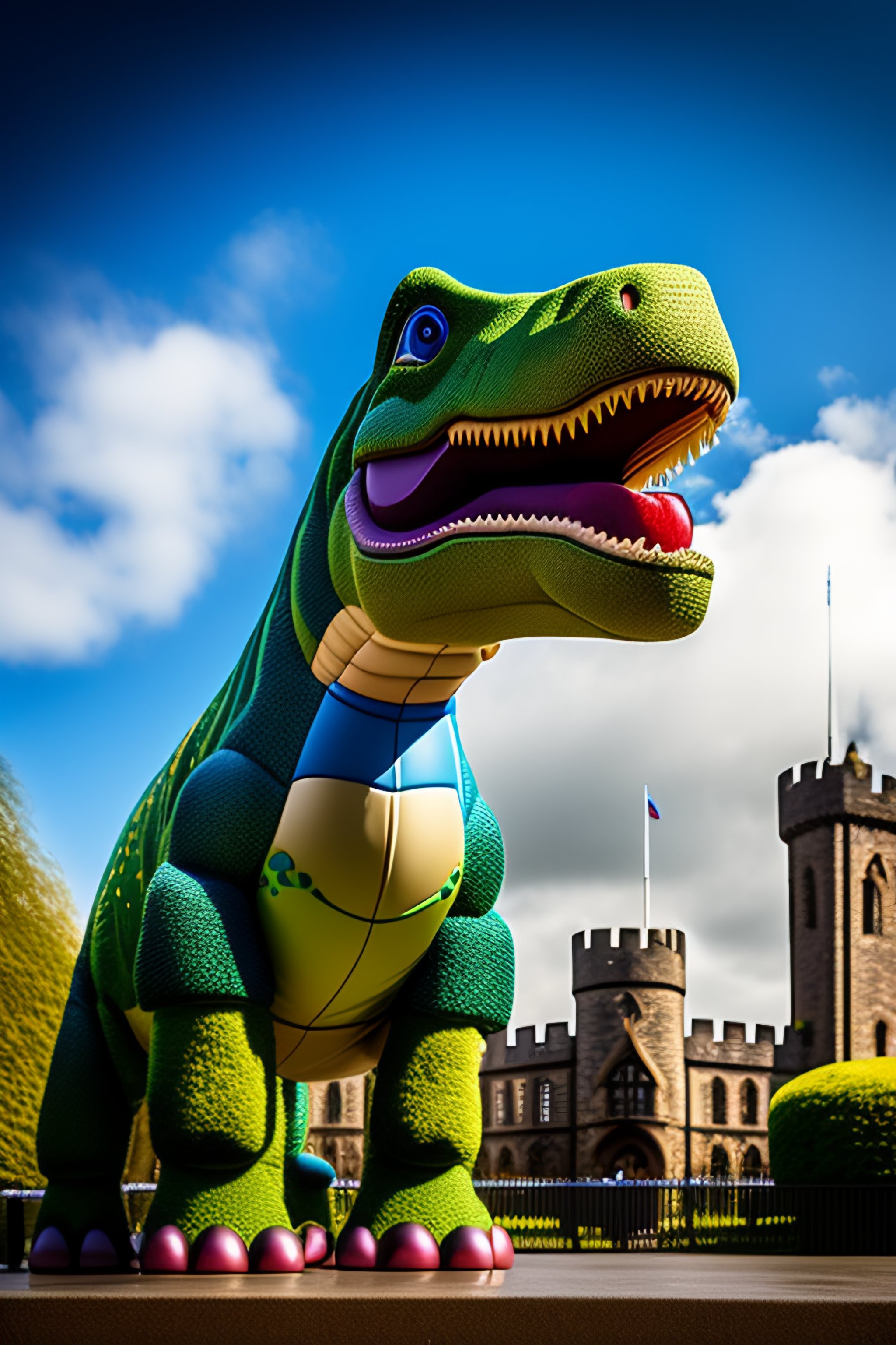 Hi res portrait of toy story dinosaur outside cardiff castle focus on rex