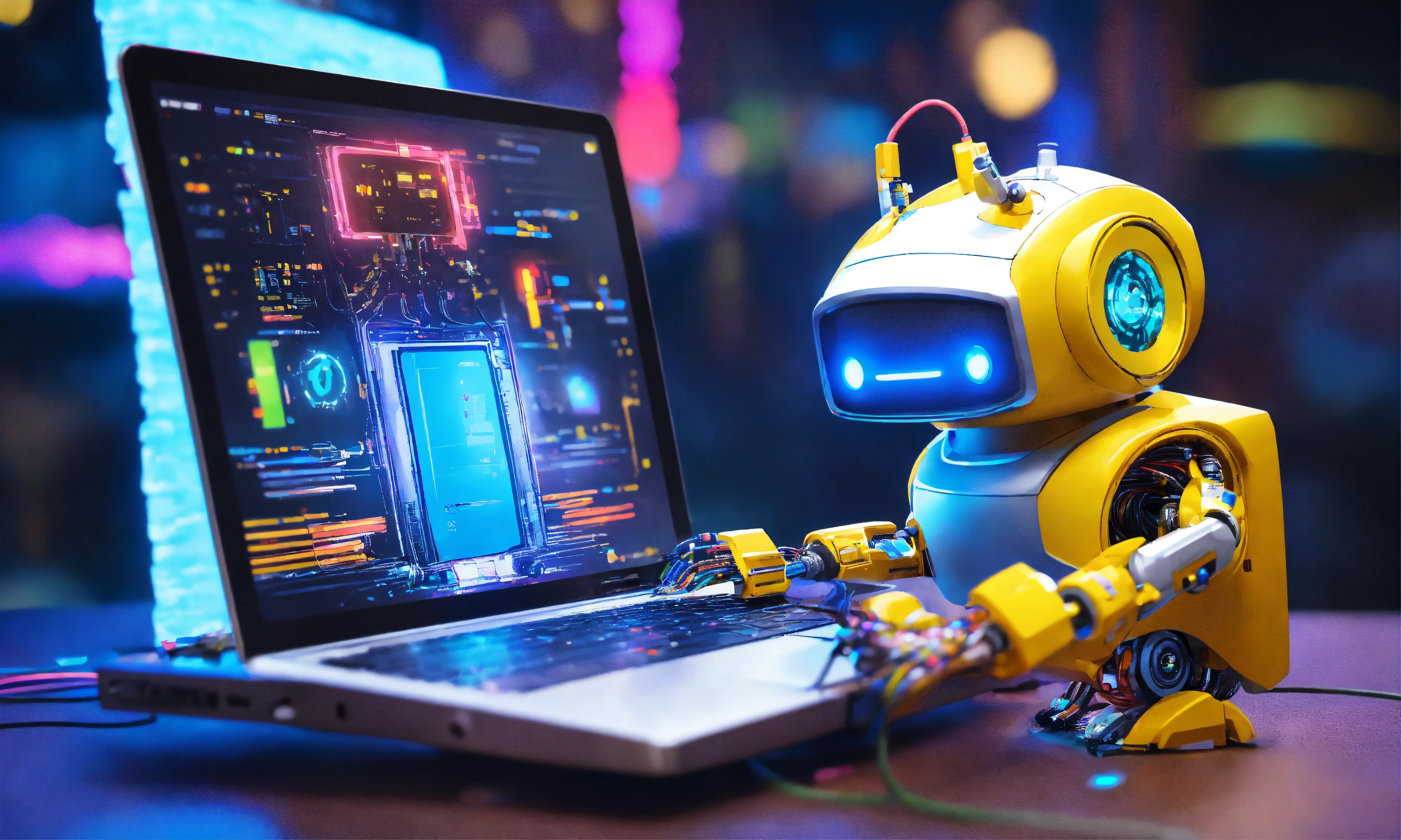 Cute robot creature typing on a laptop, 4 cables connected to 4 computers, 8k, unty engine, perfect, bright colors, funny, safe, secure