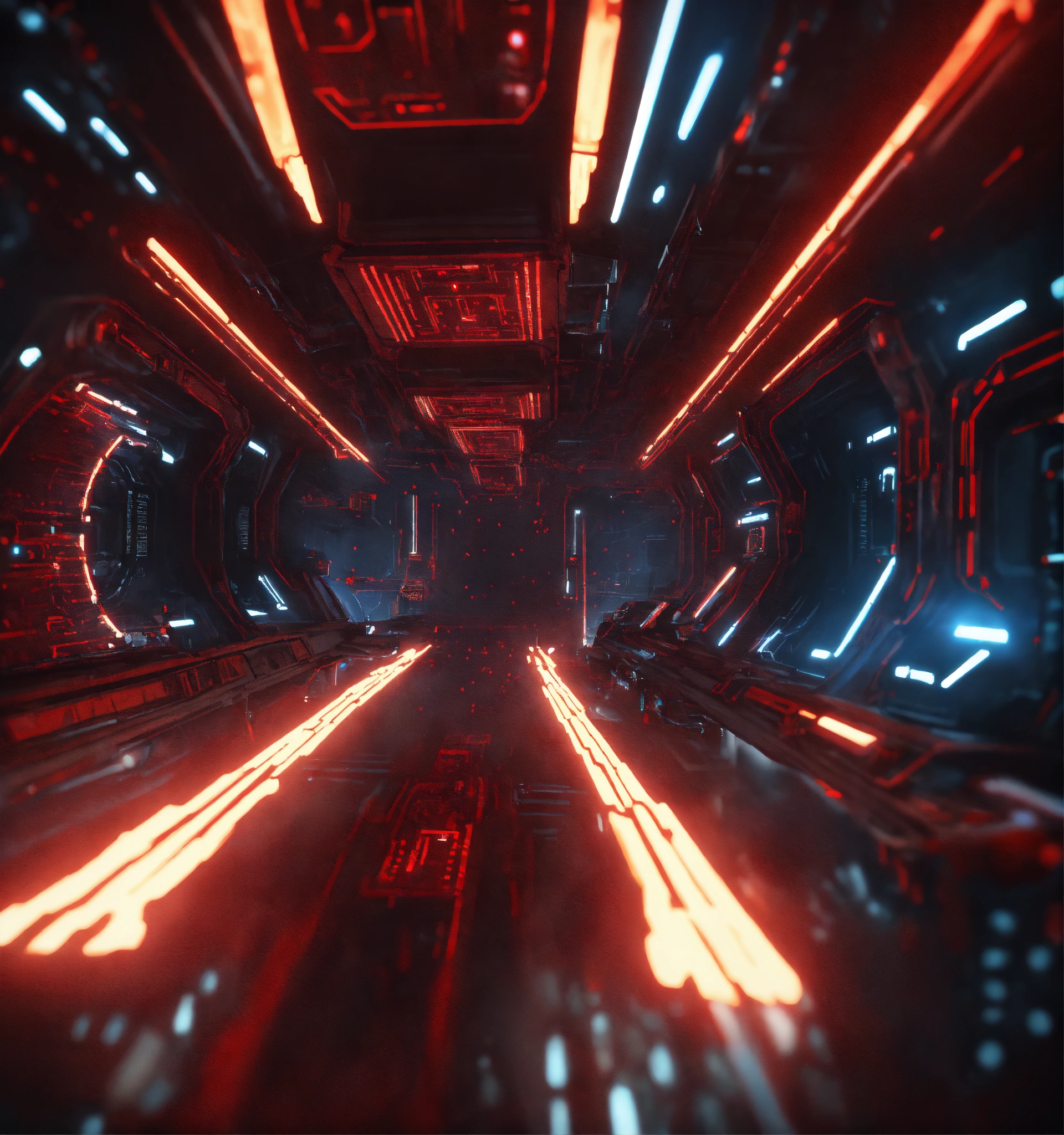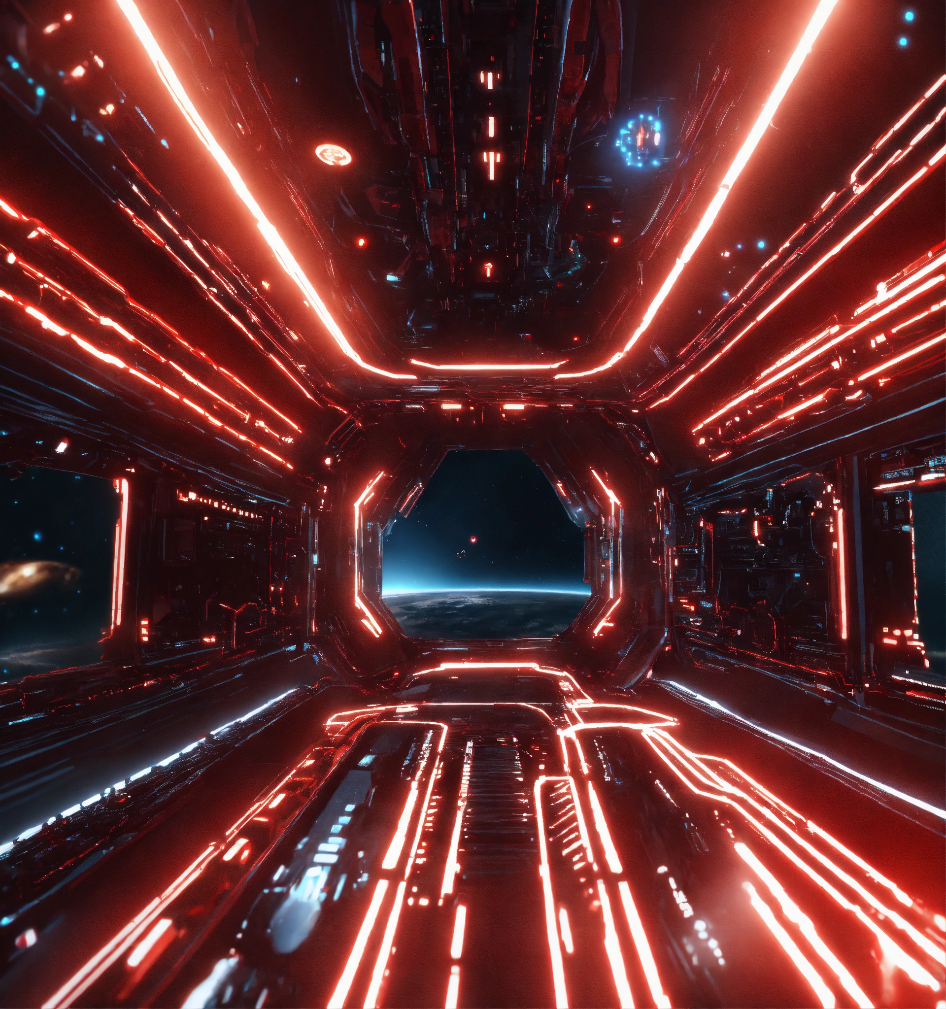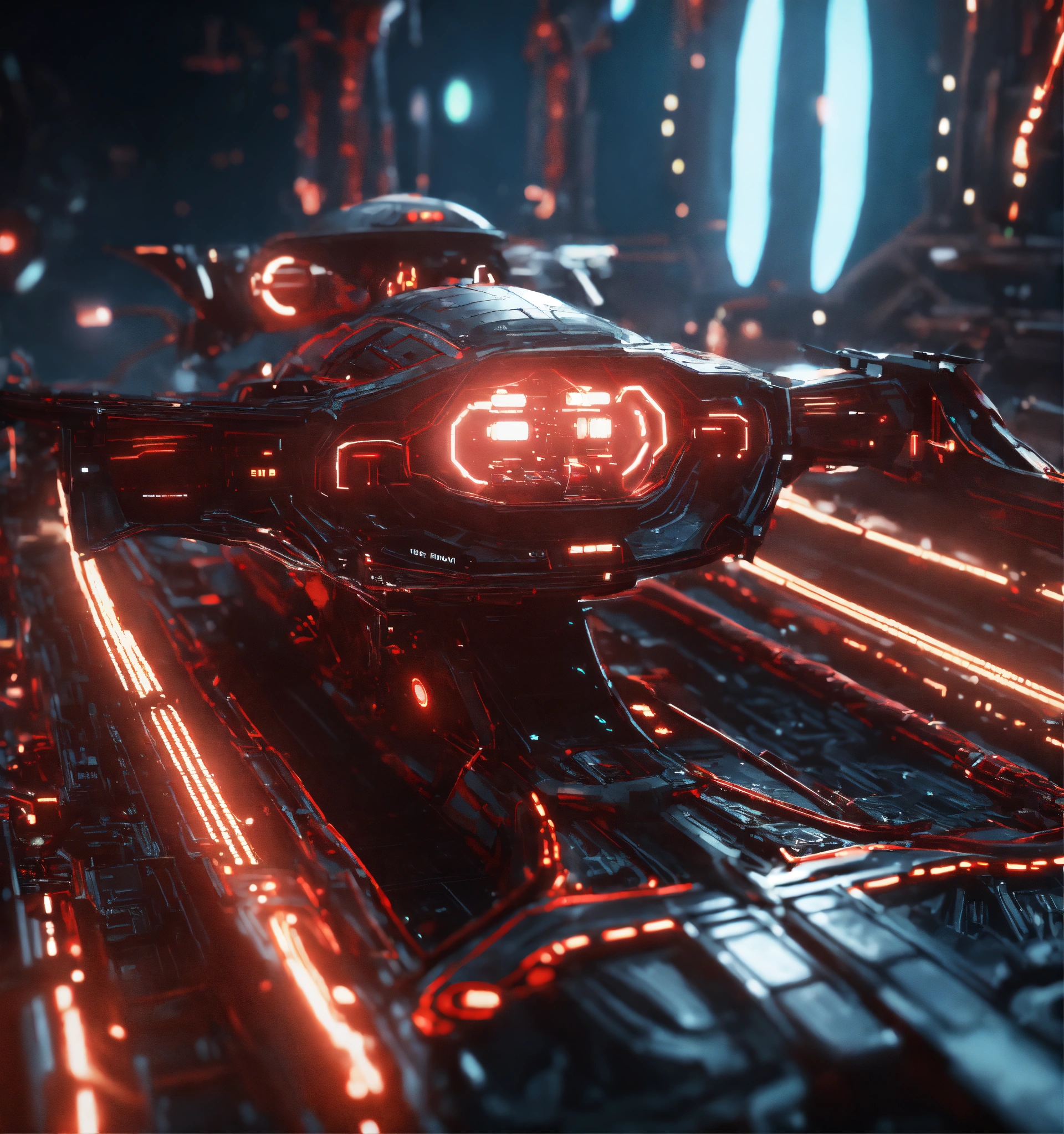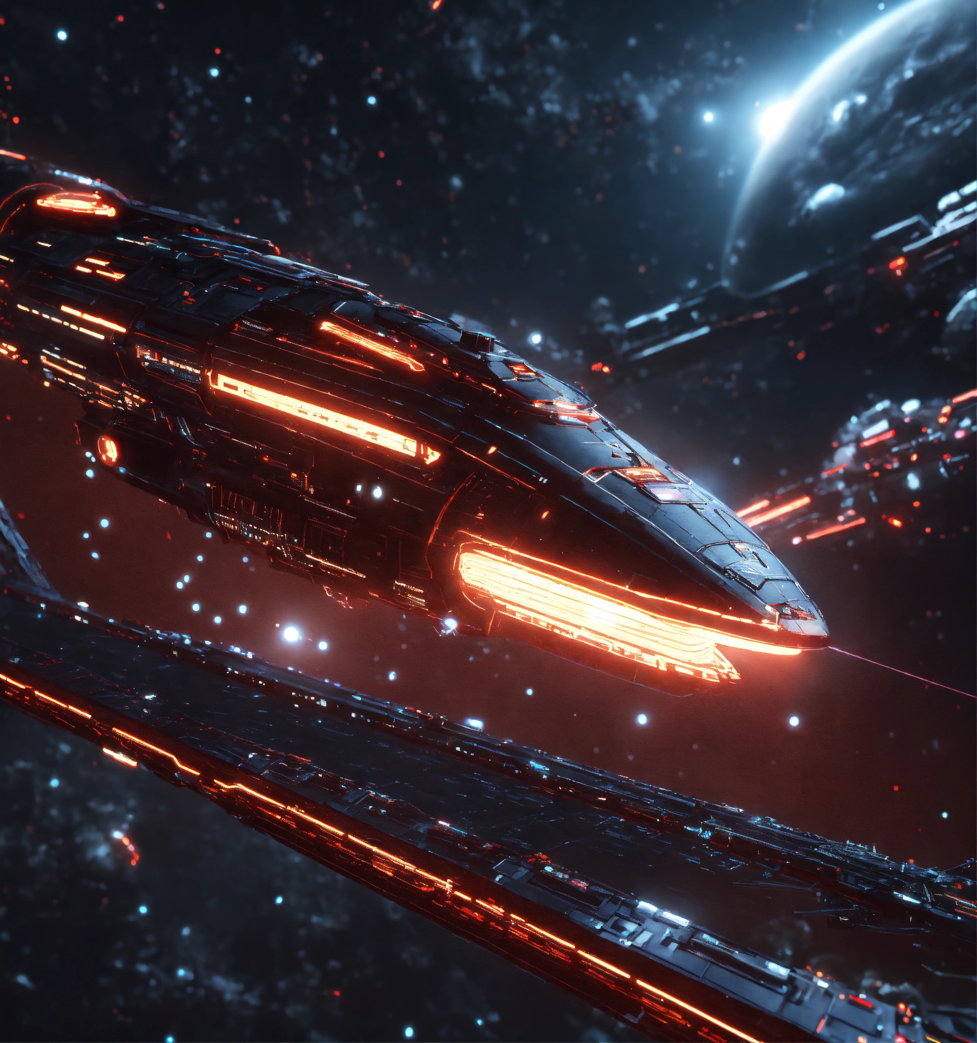 Zoom out on a long black organic worm like space ships with glowing red circuitry and markings, appear in deep space from hyperspace, realistic, 8k, tron, unreal engine