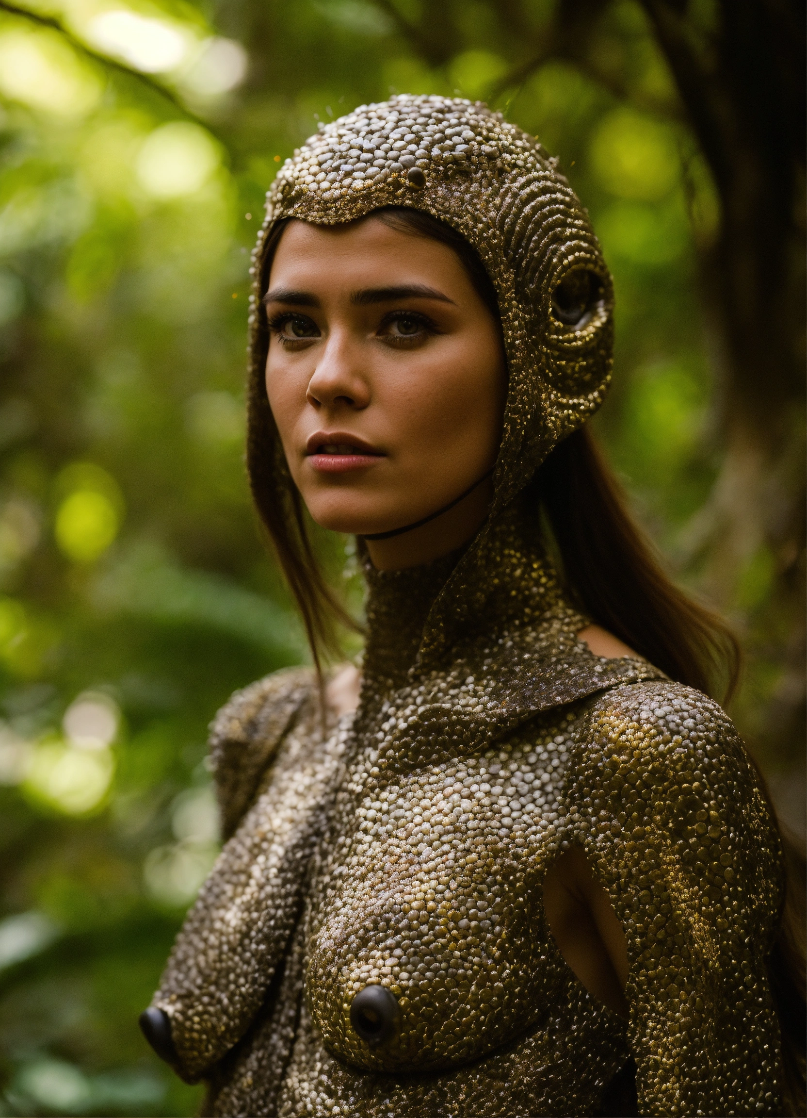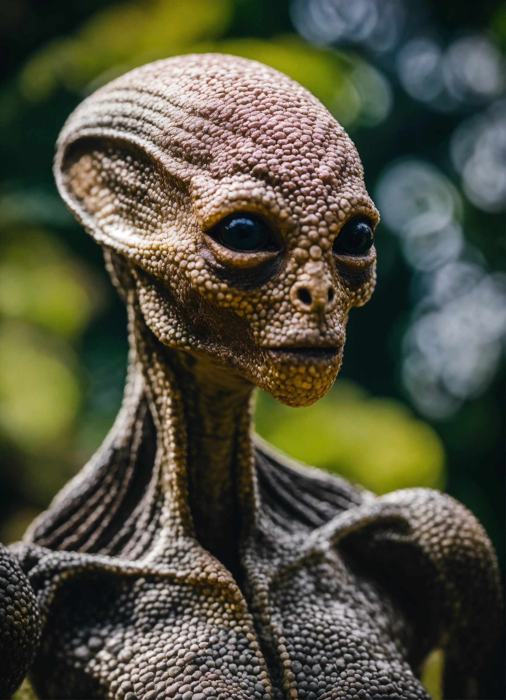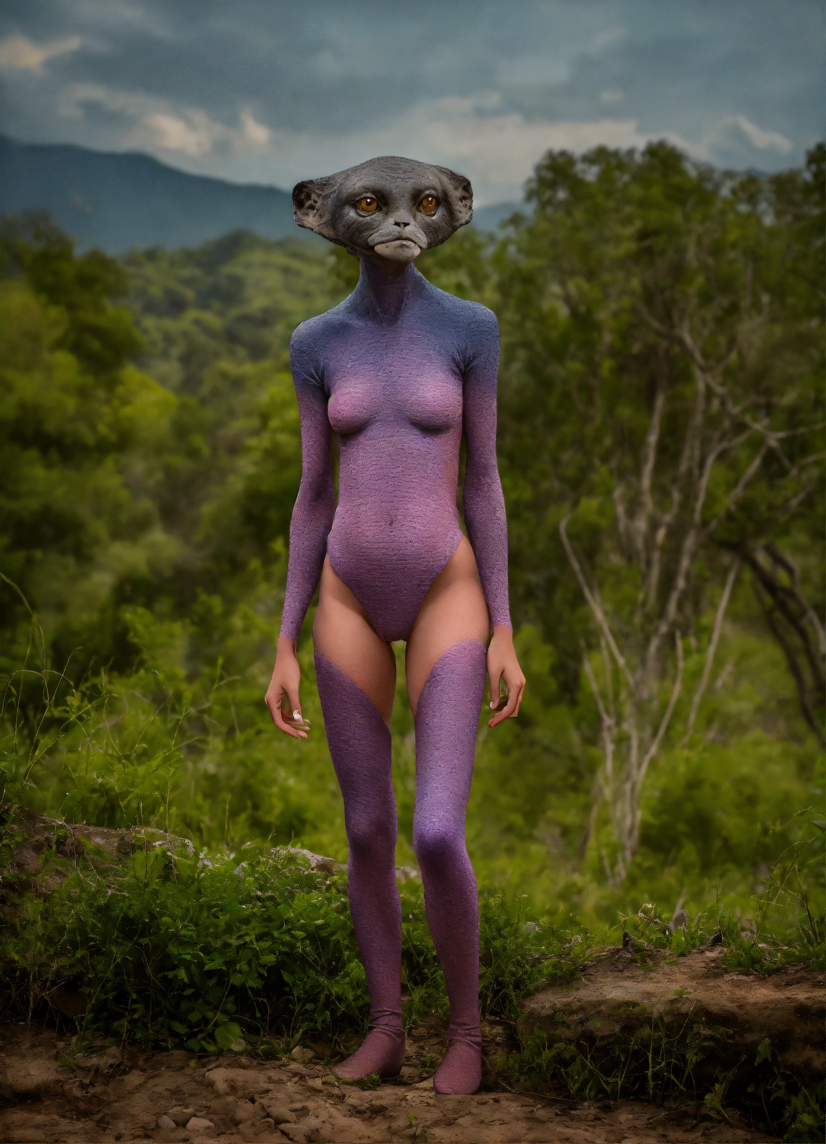 Fotografia de cuerpo entero humanoide extraterrestre evolucionado rasgos etiópes femeninos con piel de escamas grises de 21 años, muy alta y delgada sin rasurar en la jungla, detalles fotográficos hiperrealistas, plano general, f2.8, enfoque en los ojos, 1/250, iso 3200, nikon z9, angulo de cámara de 120 grados