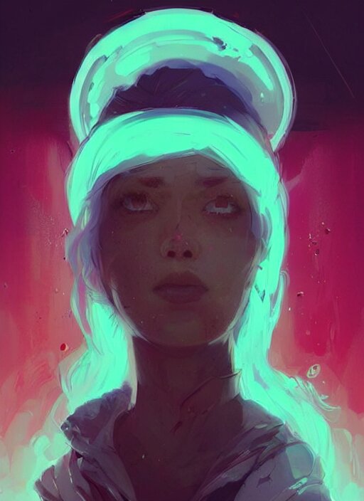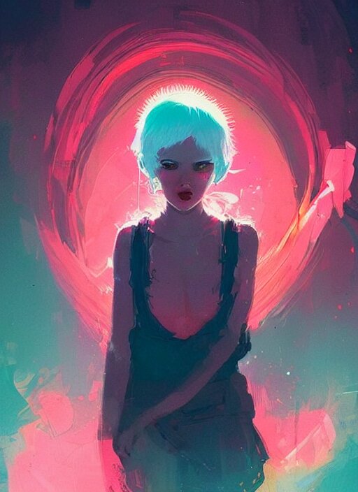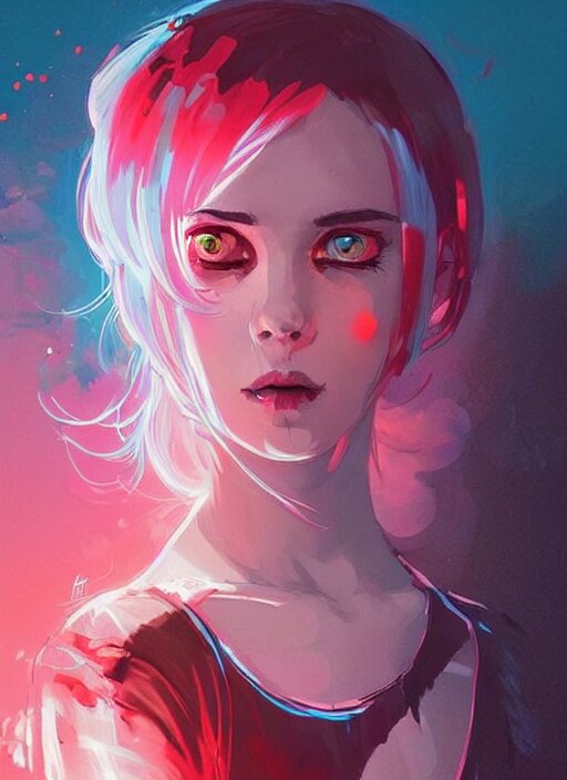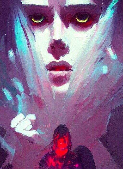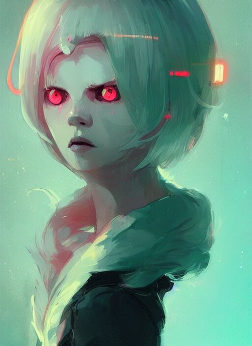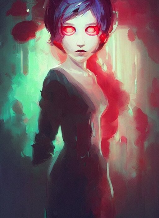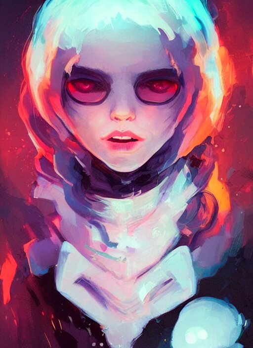 Highly detailed portrait of a ghost likely girl with neon red eyes, short white hair by atey ghailan, by greg rutkowski, by greg tocchini, by james gilleard, by joe fenton, by kaethe butcher, totally colorful, rainbow, neon coloring, dramatic lighting, chromatic, high contrast, trending in pinterest, award winning details