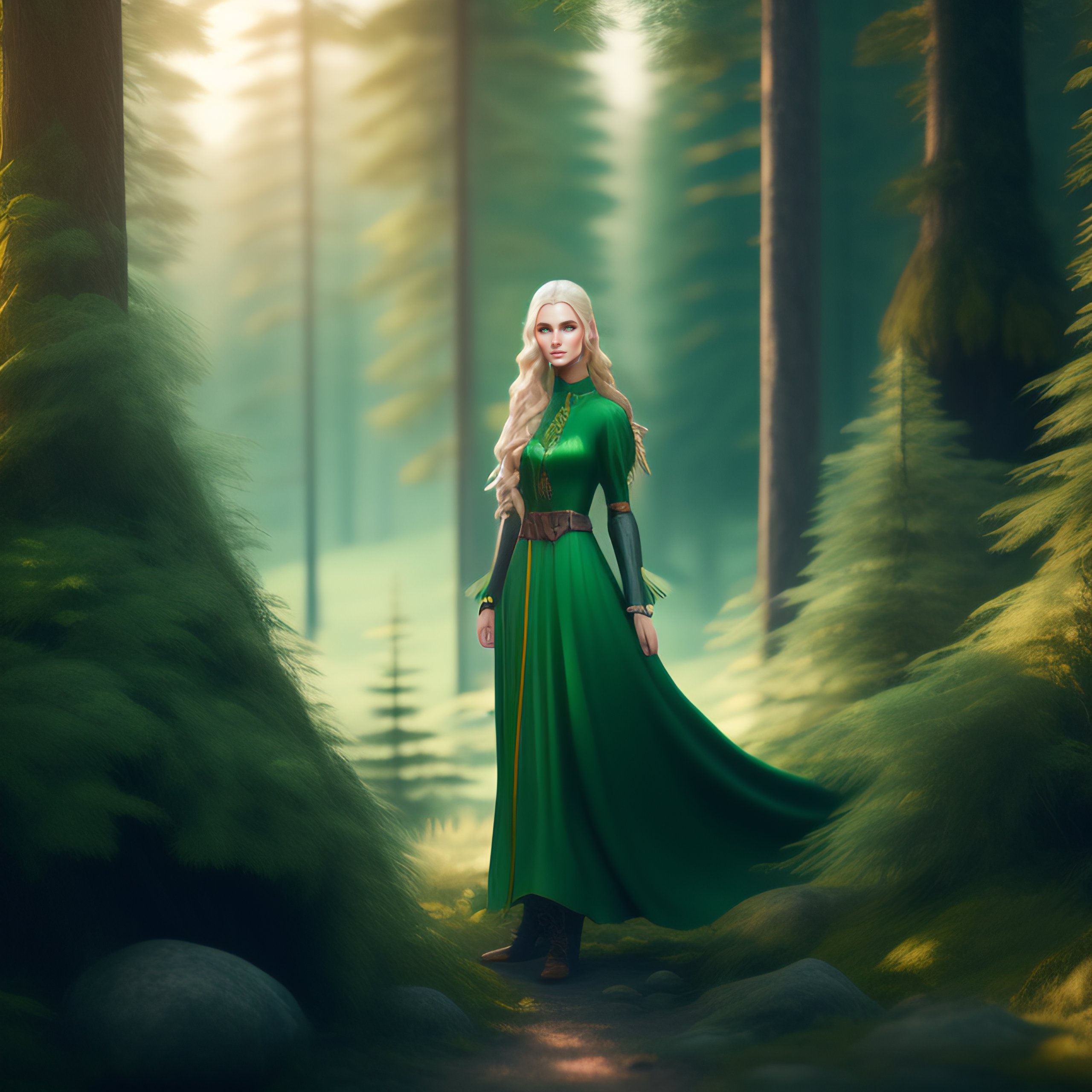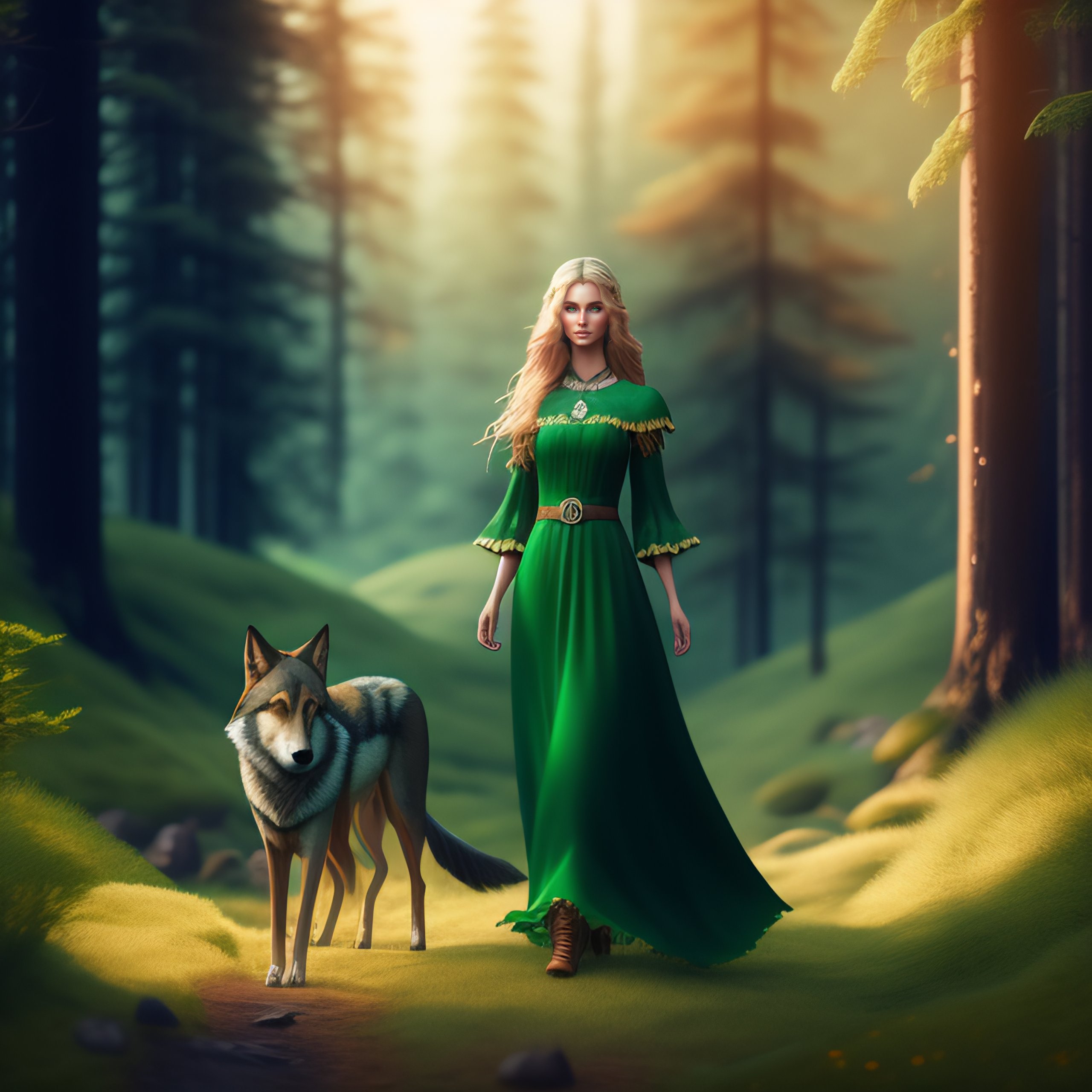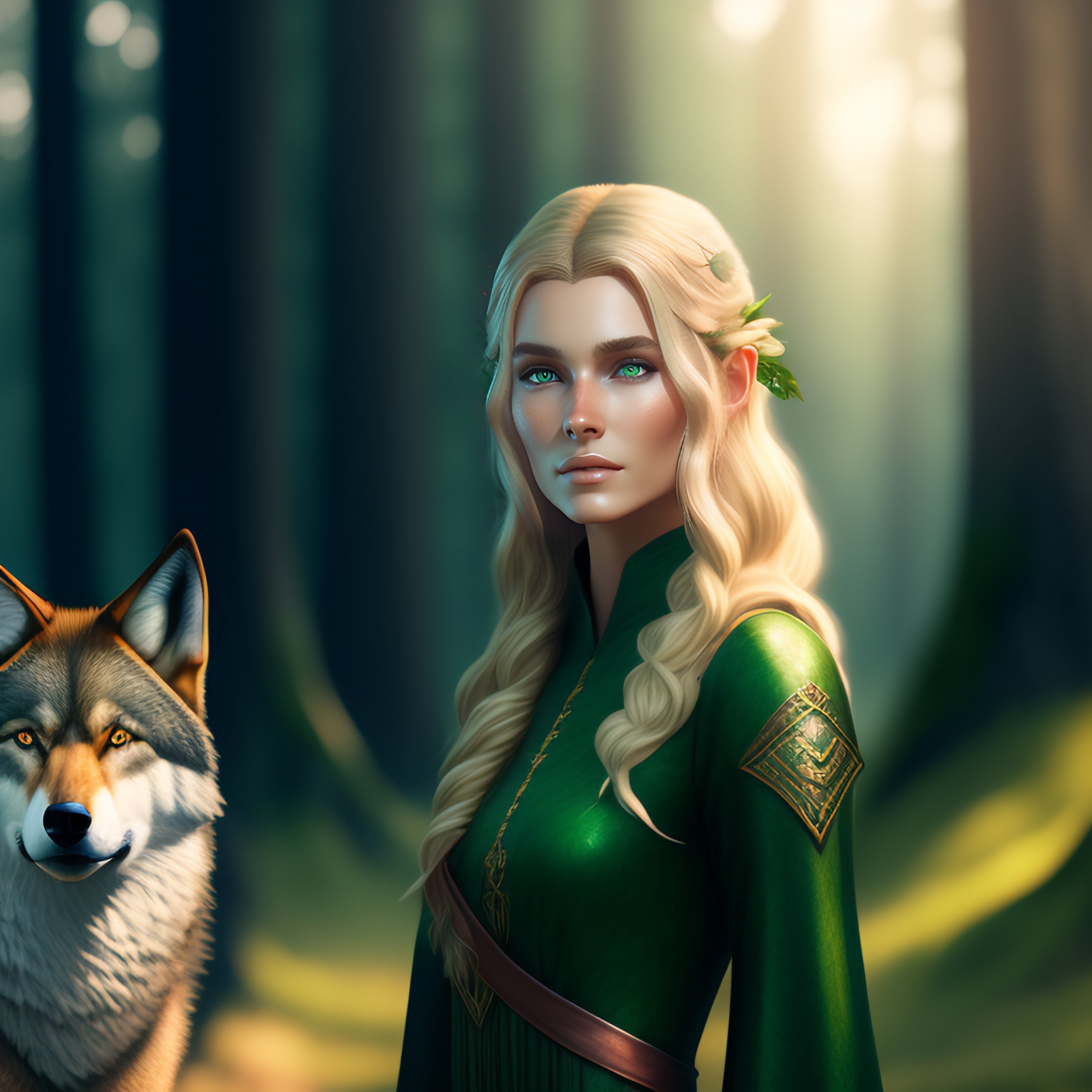 Elf girl and wolves, blond wavy hair, green eyes, long dress, full length character, northern forest on the background, digital painting, octane render, unreal engine, studio lighting
